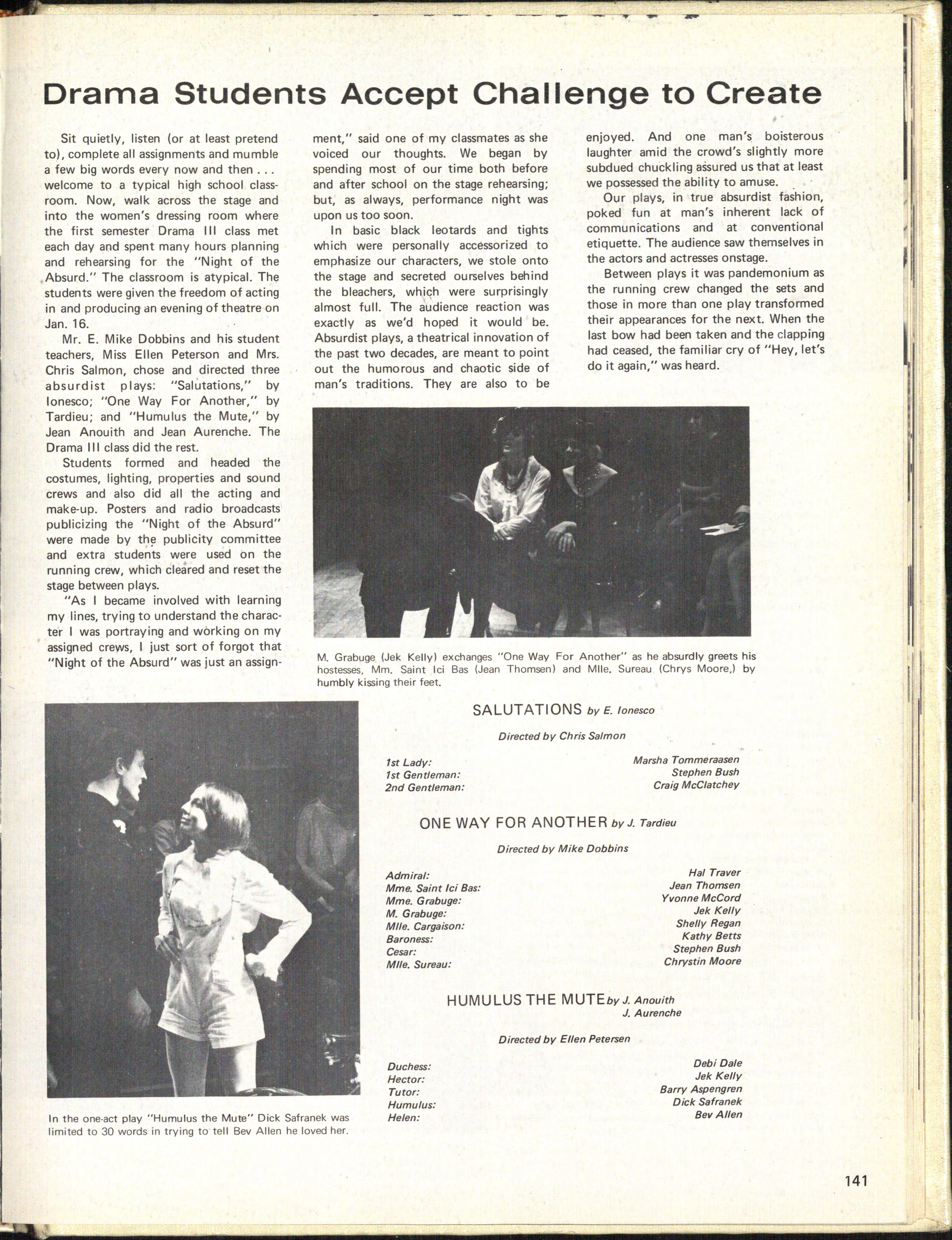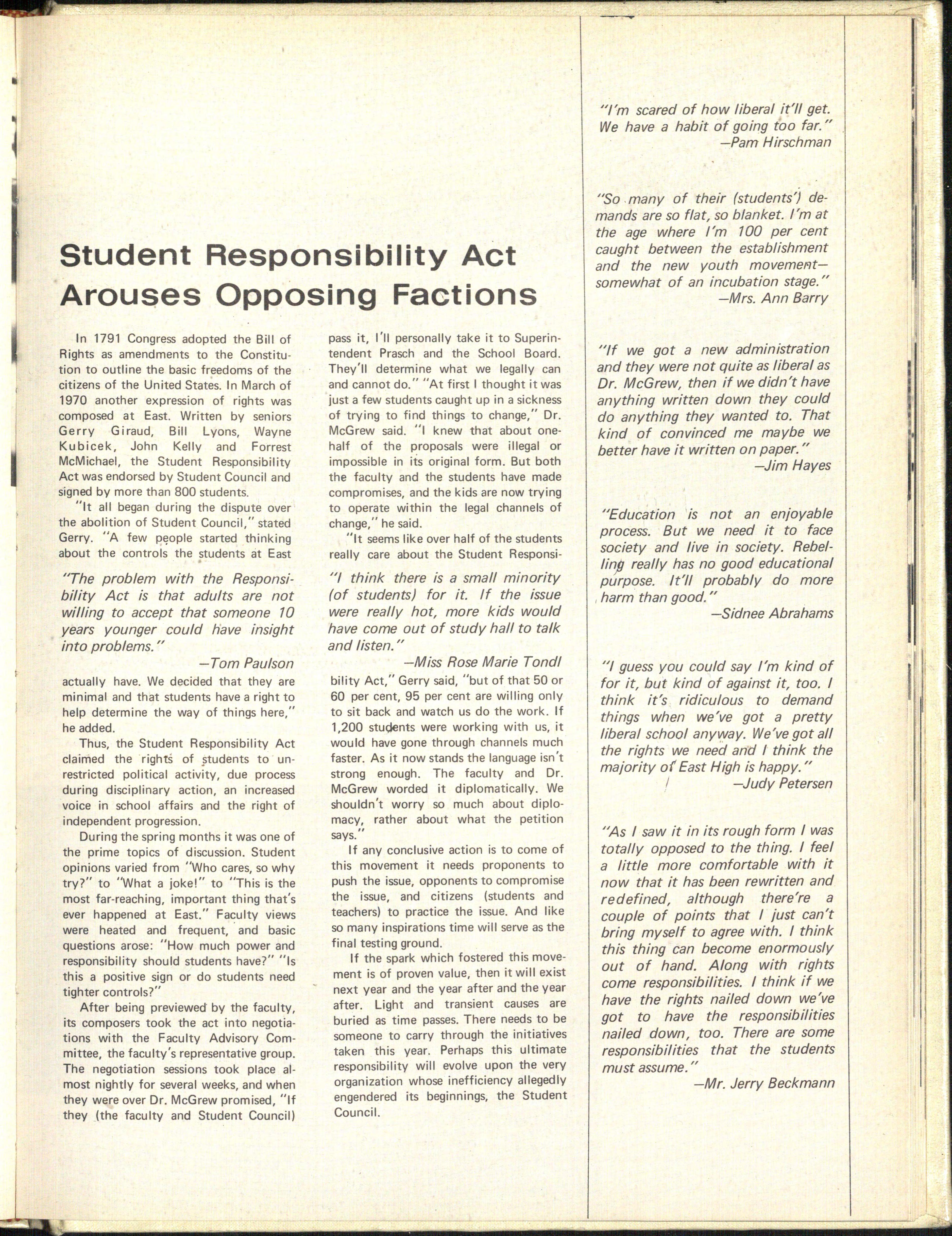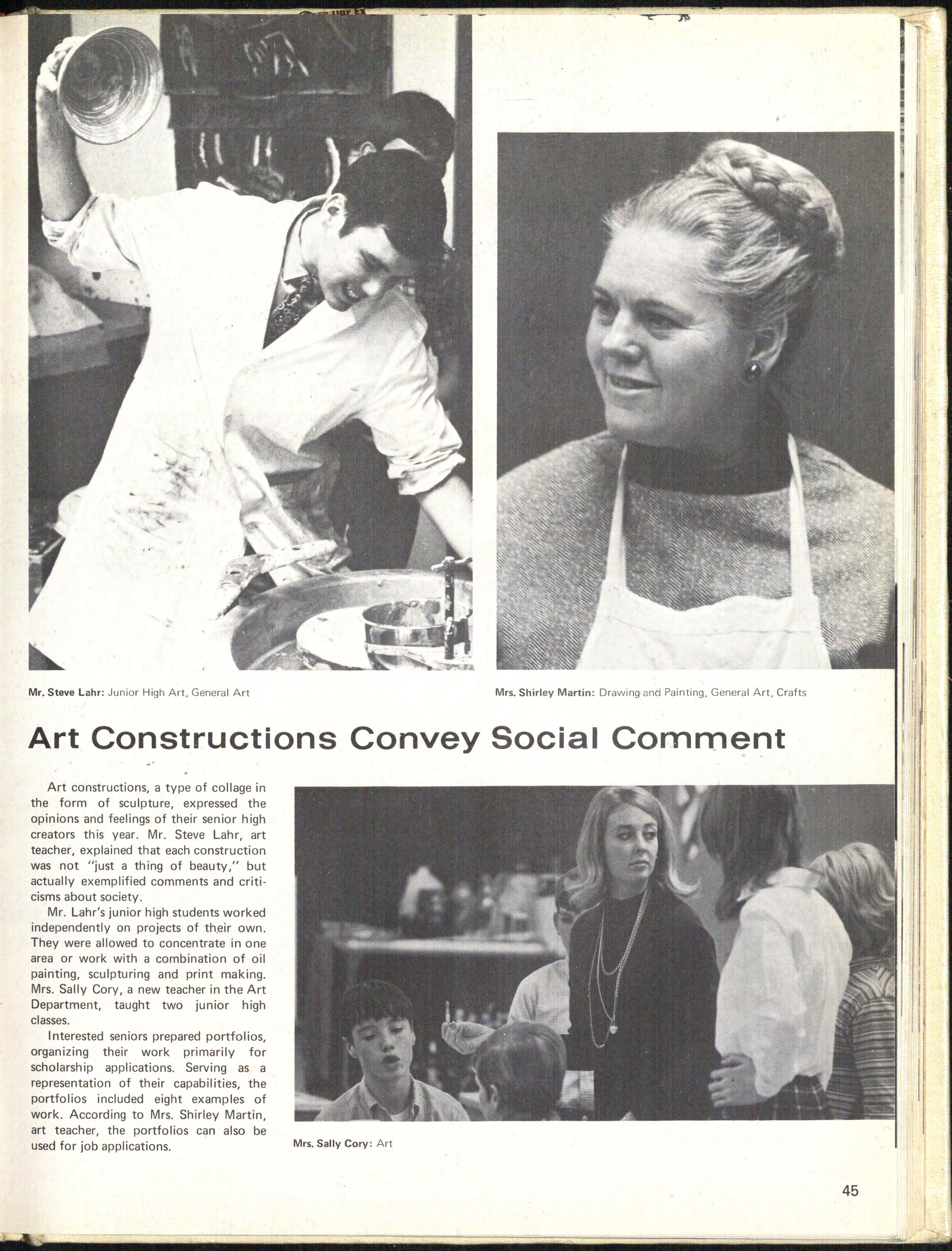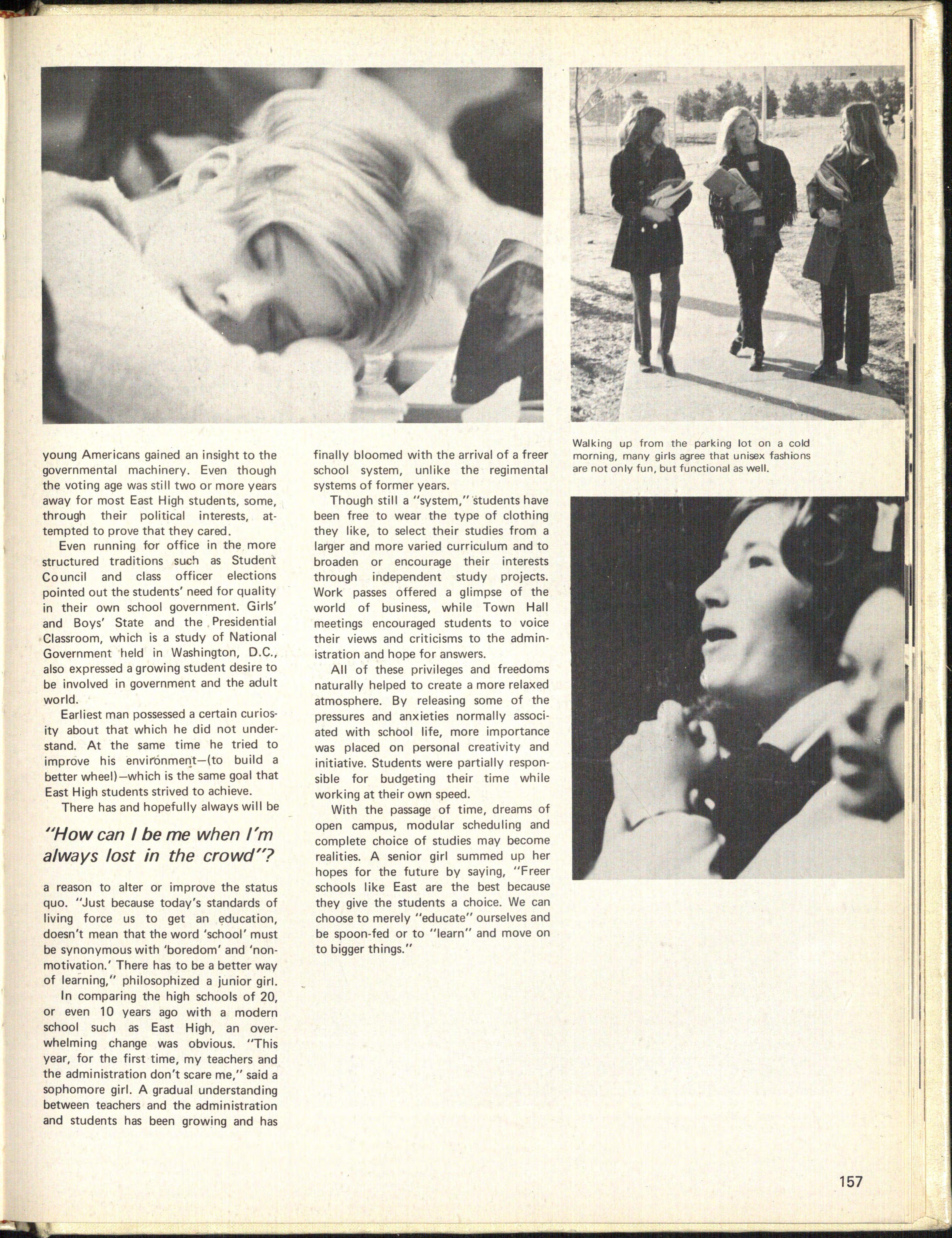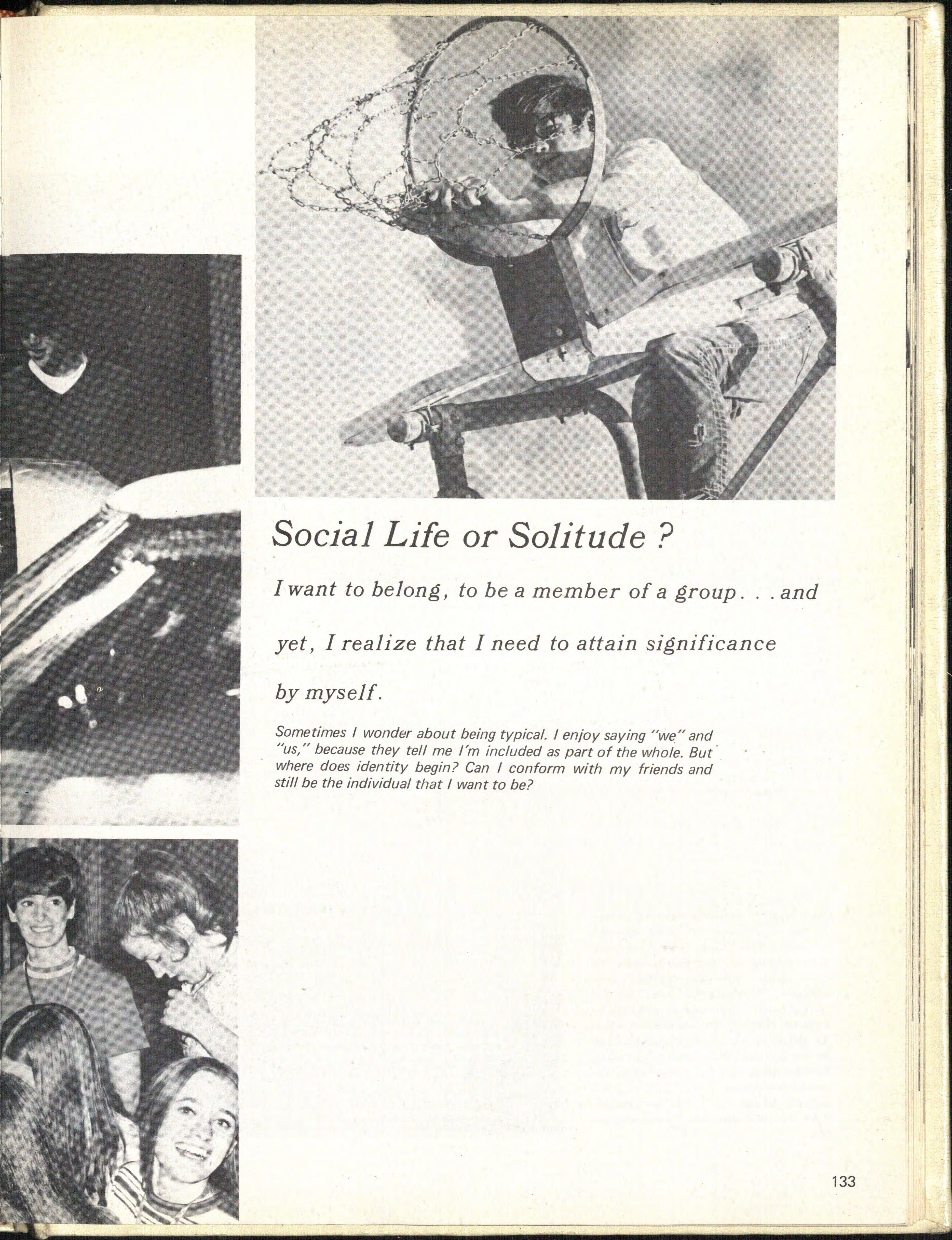 end of the day, others looked forward to a class. "In Philosophy-you talk about problems relevant to us right now; the teacher is well-read, humorous, talks on our level, understands our problems and keeps the class' attention," a senior said. Class discussions replaced lectures more and more. Performance classes and other methods were put into effect to create "a change of pace."