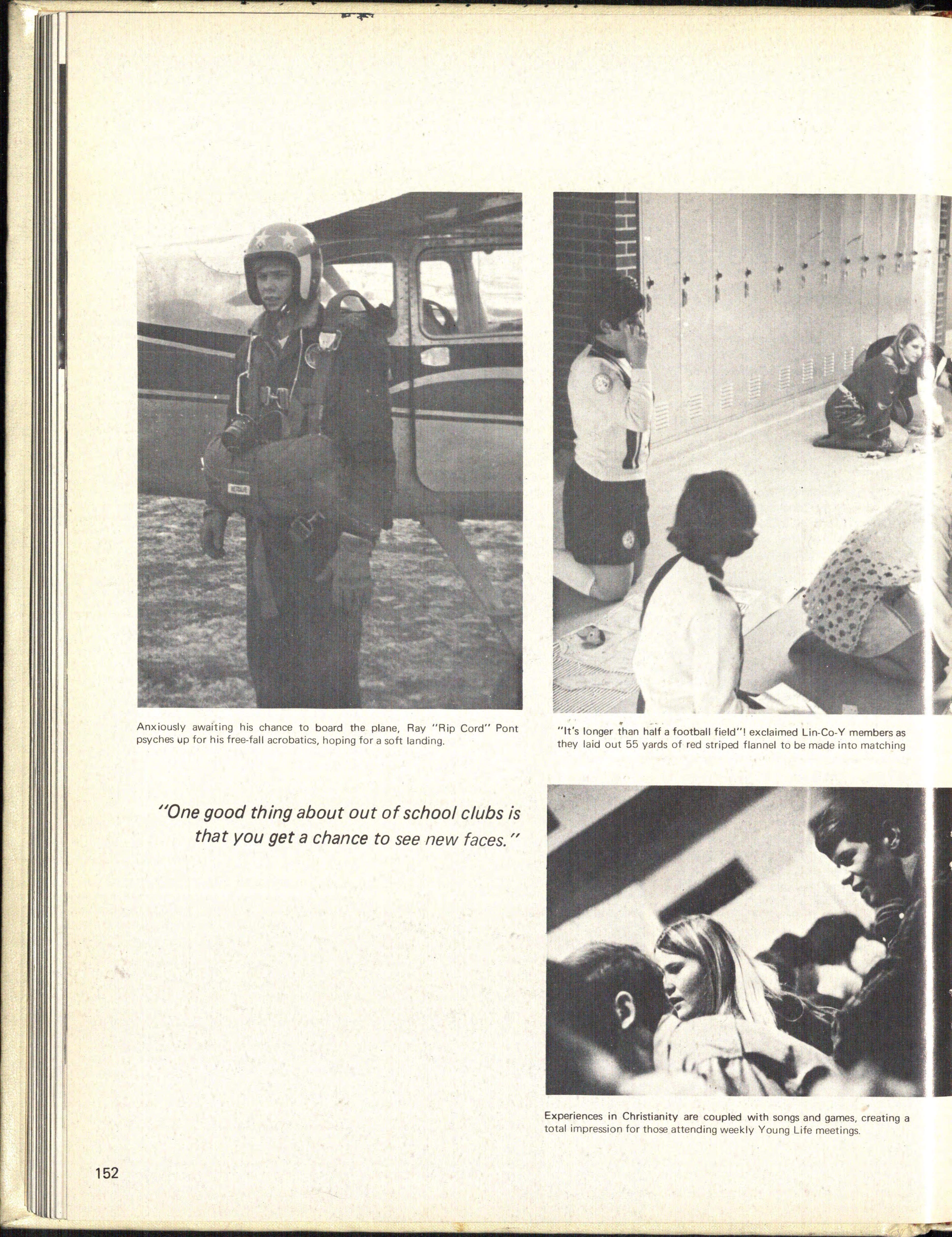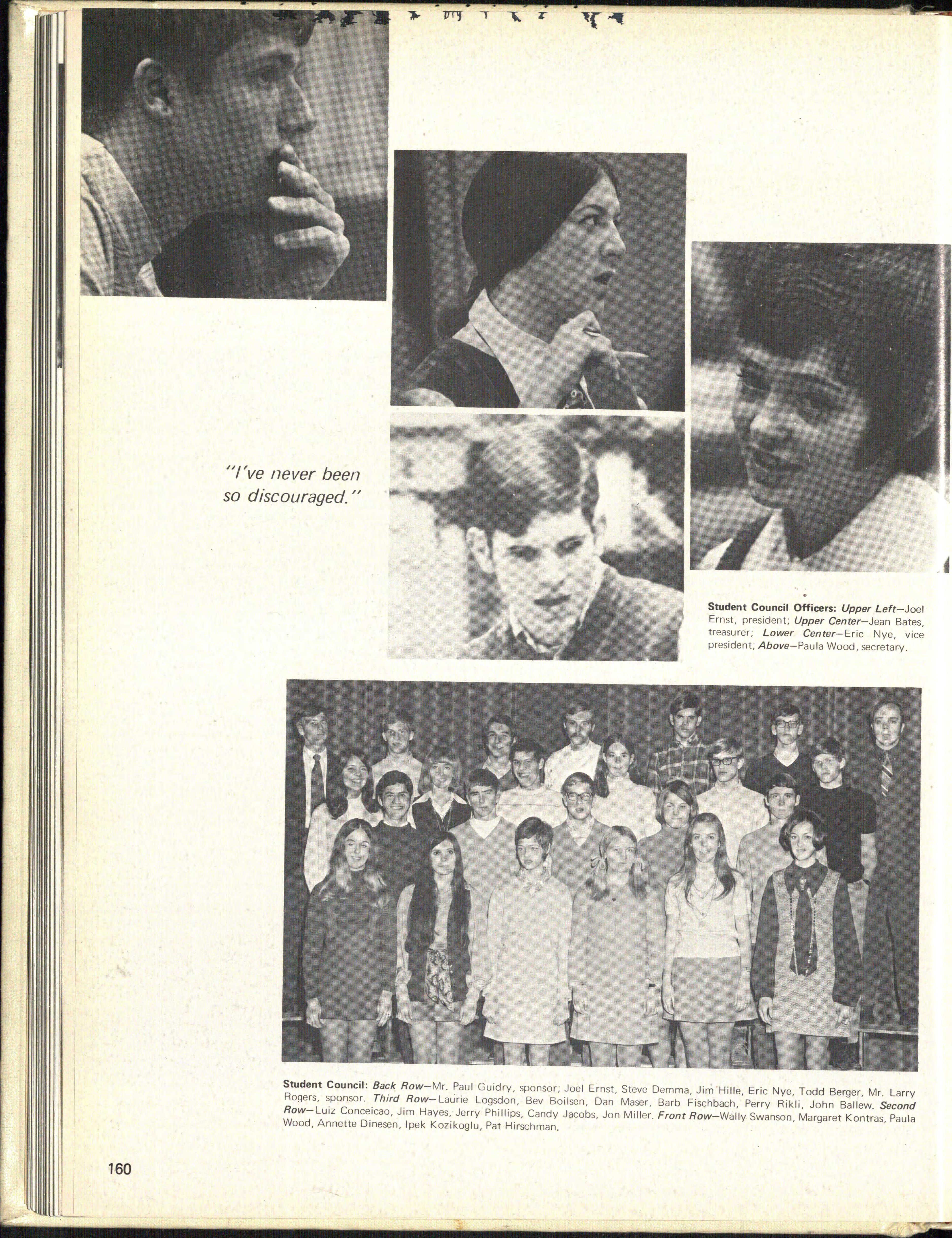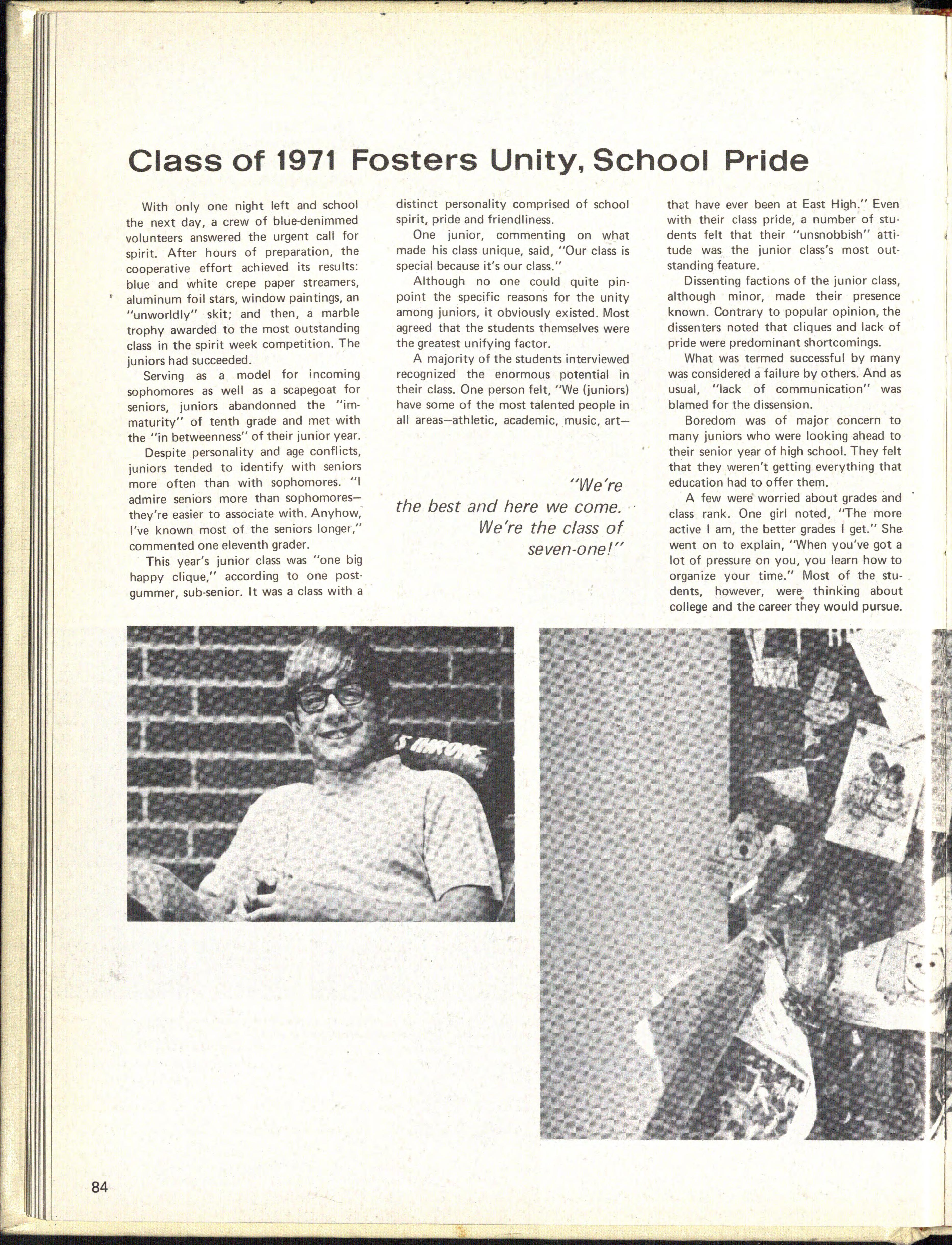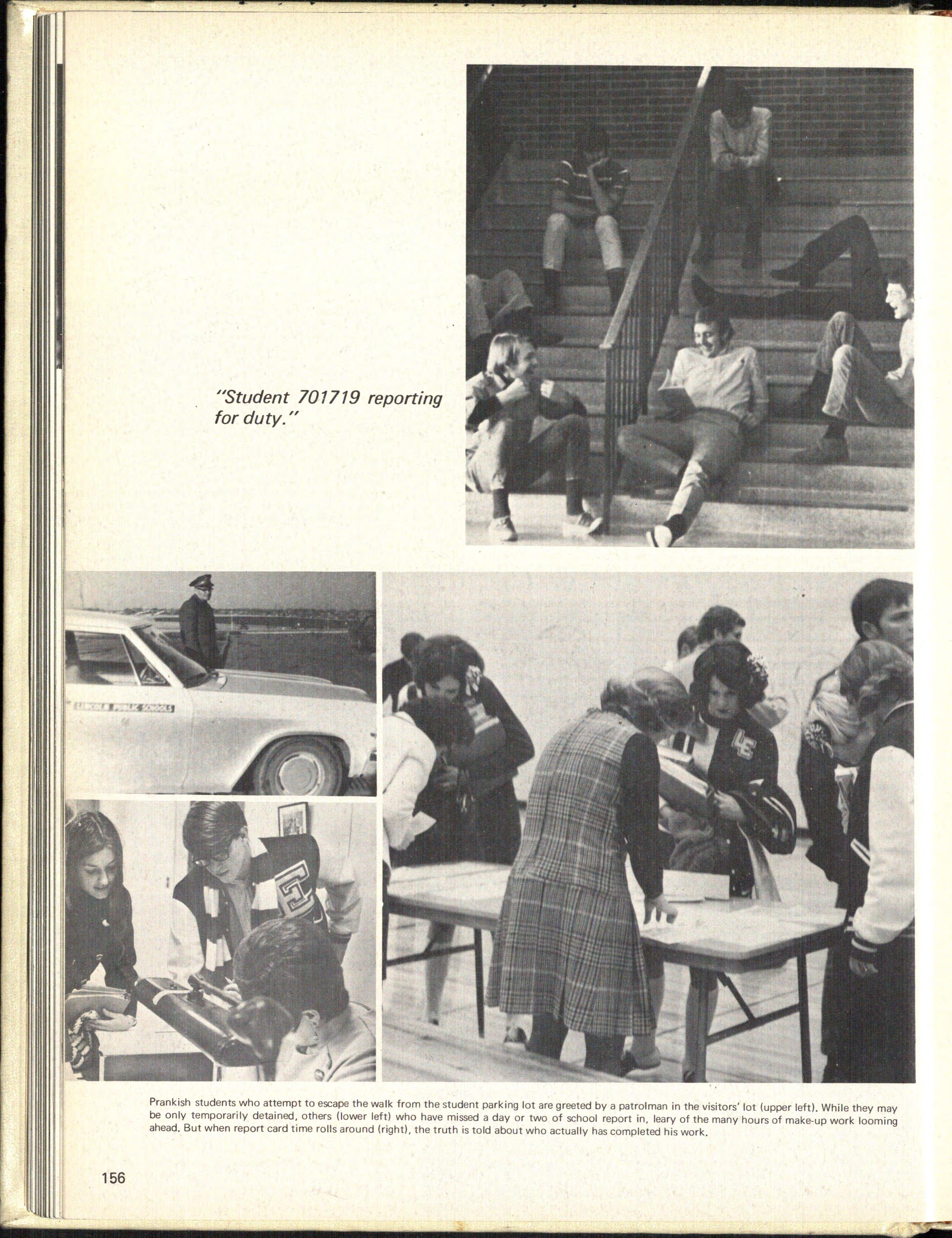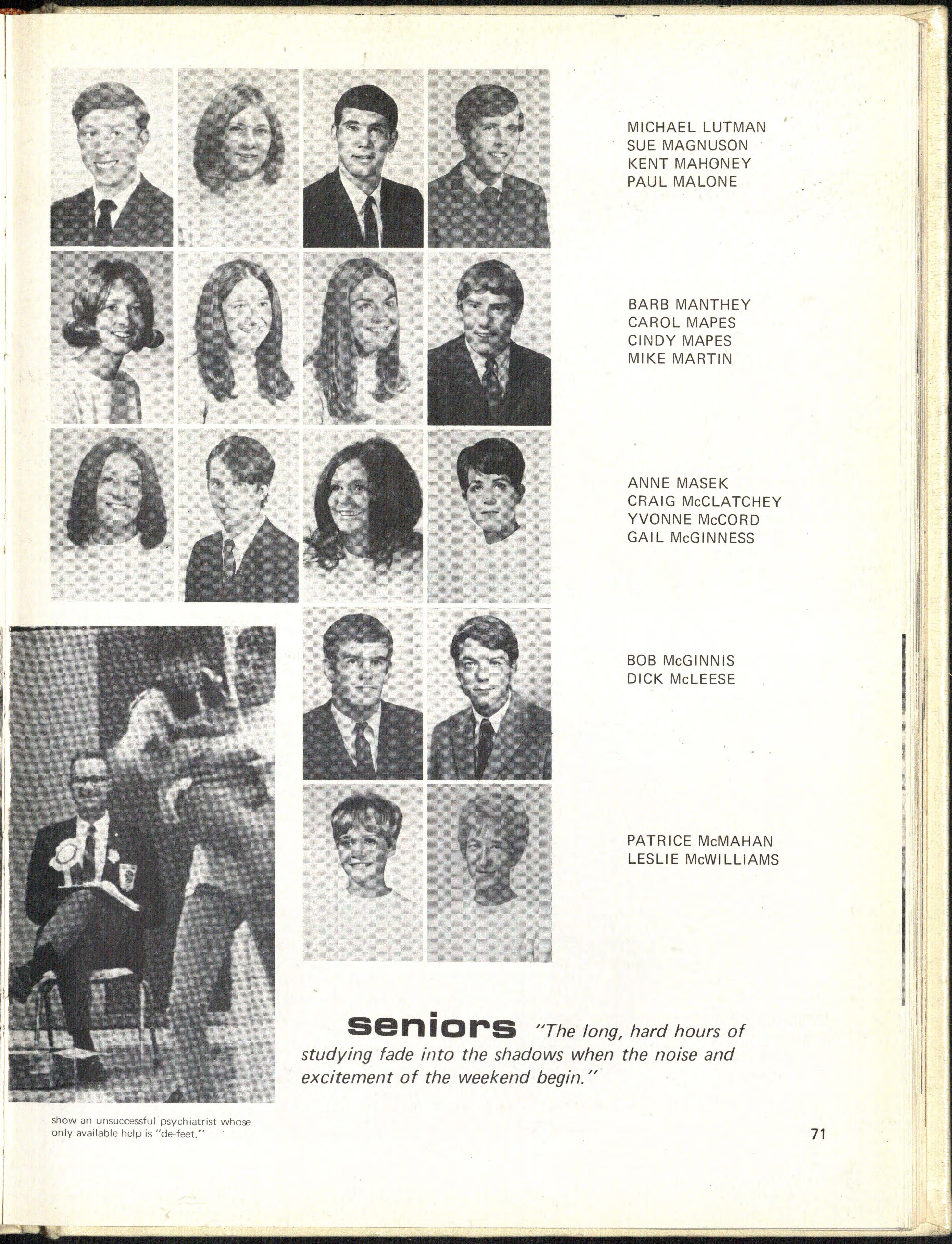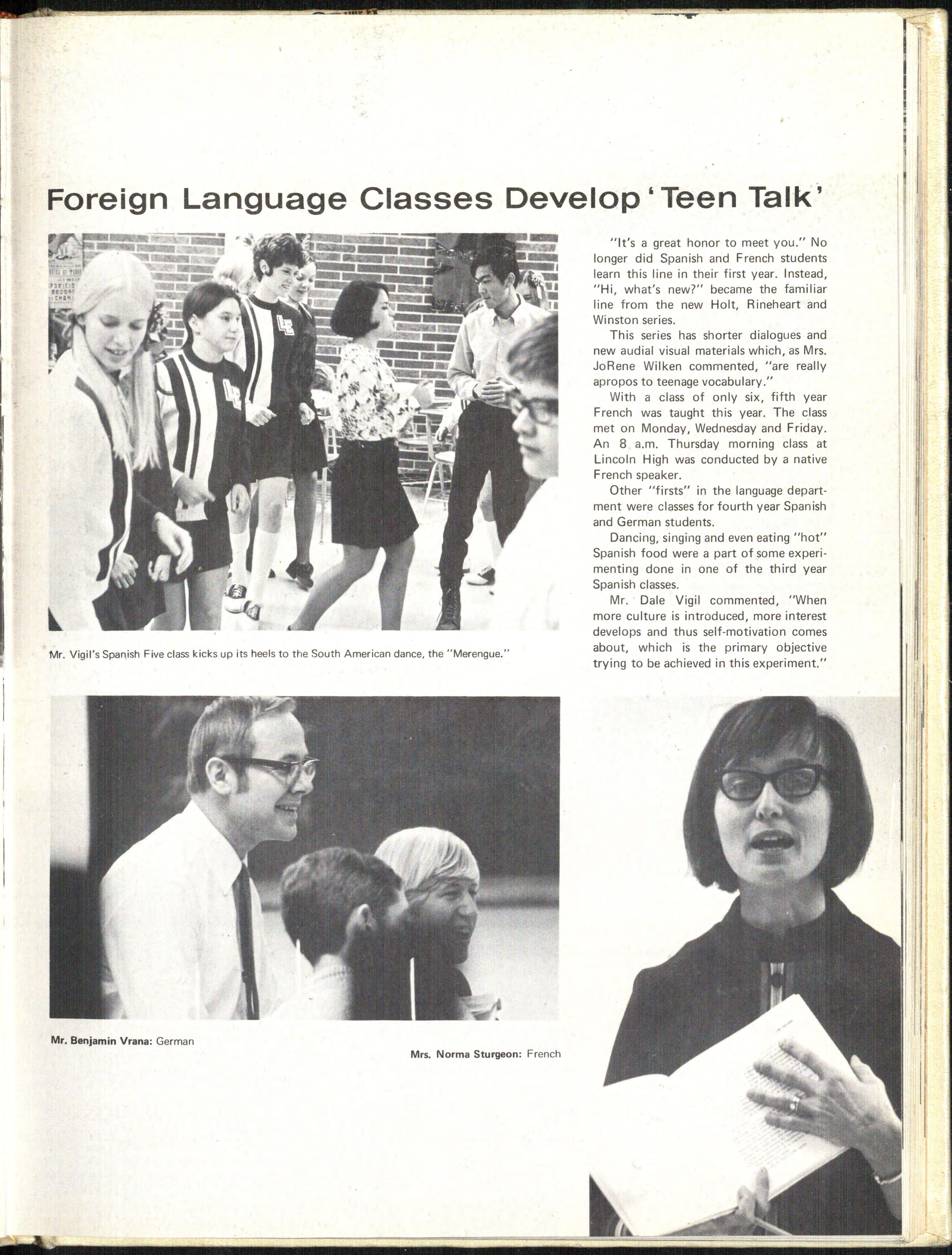 end of the day, others looked forward to a class. "In Philosophy-you talk about problems relevant to us right now; the teacher is well-read, humorous, talks on our level, understands our problems and keeps the class' attention," a senior said. Class discussions replaced lectures more and more. Performance classes and other methods were put into effect to create "a change of pace."