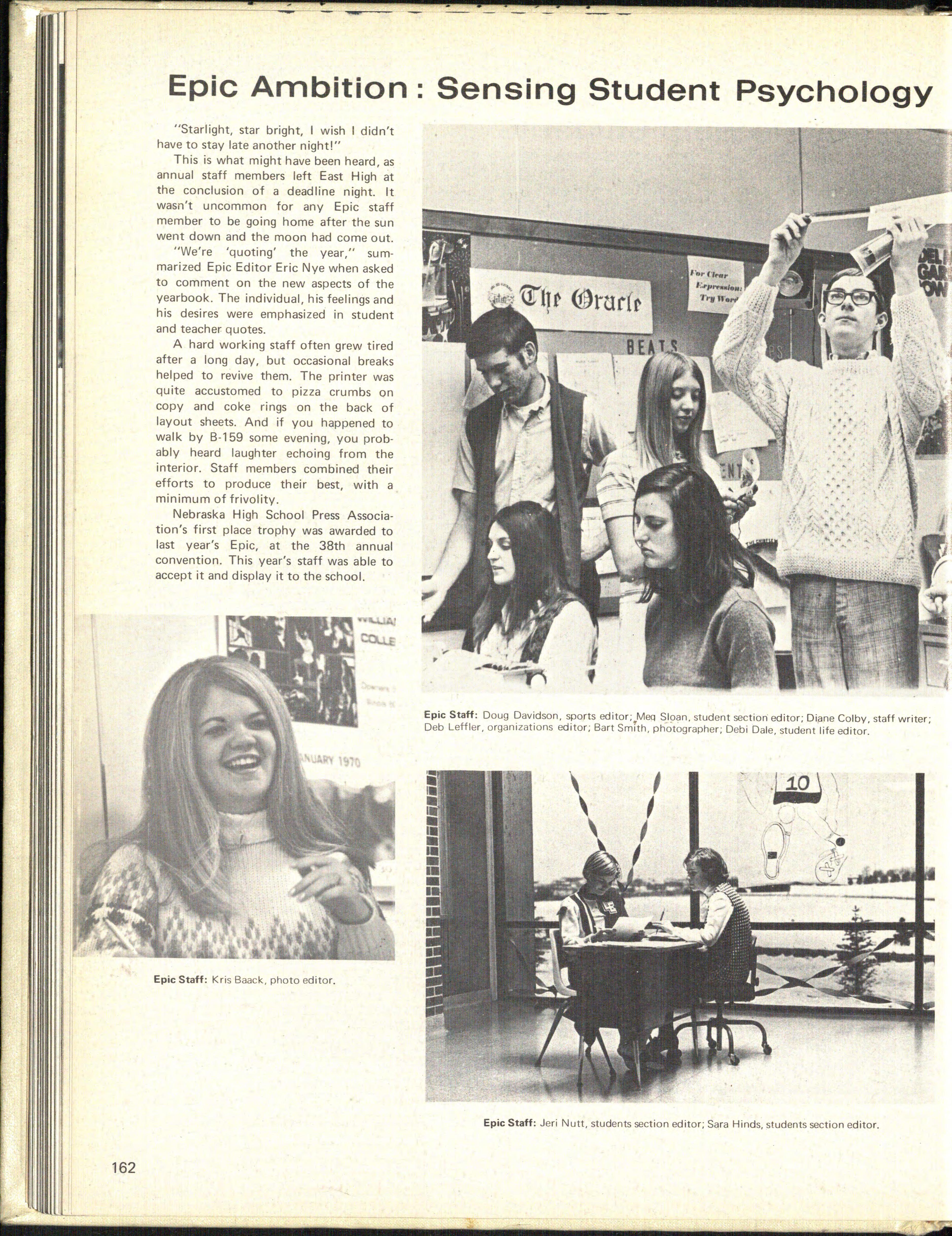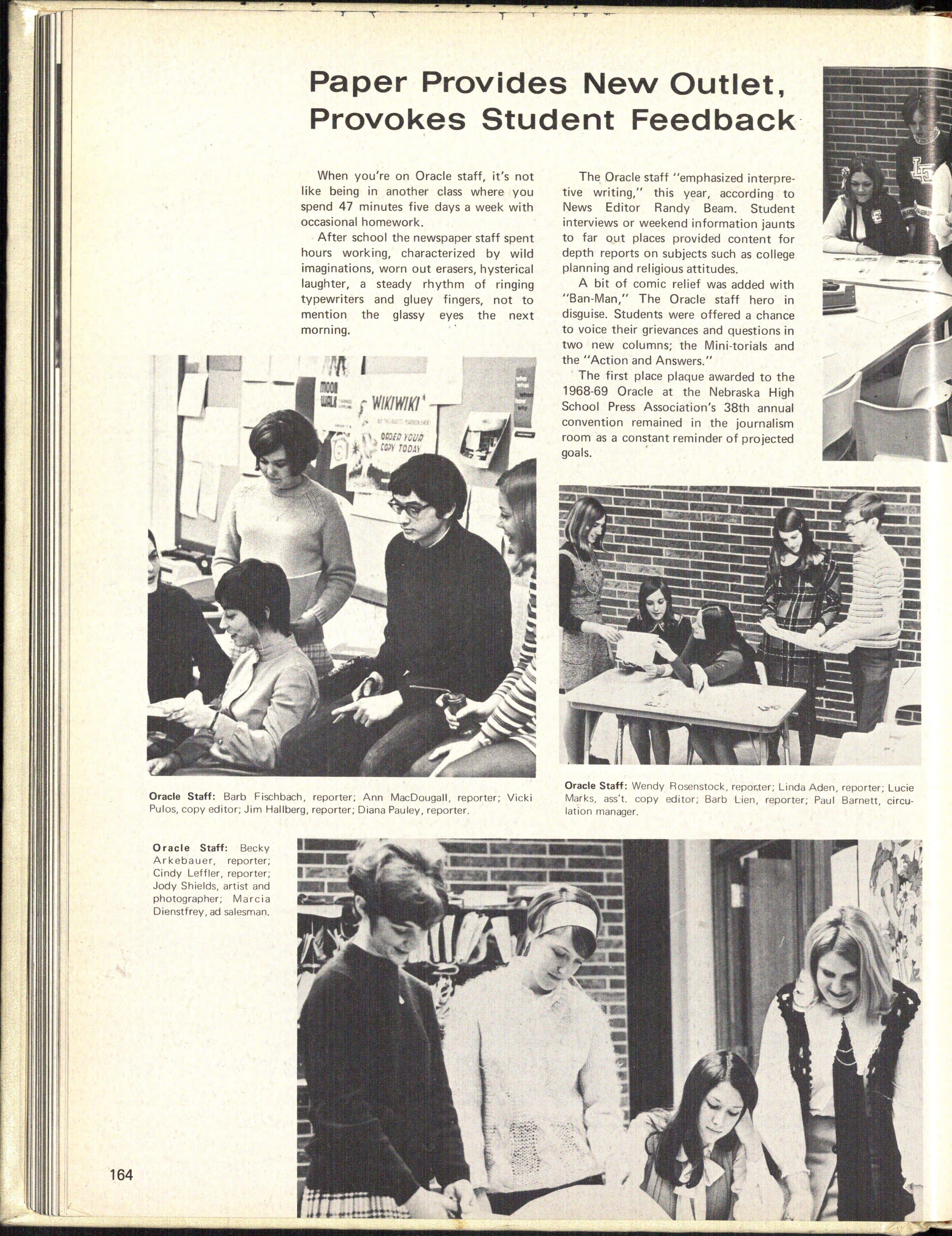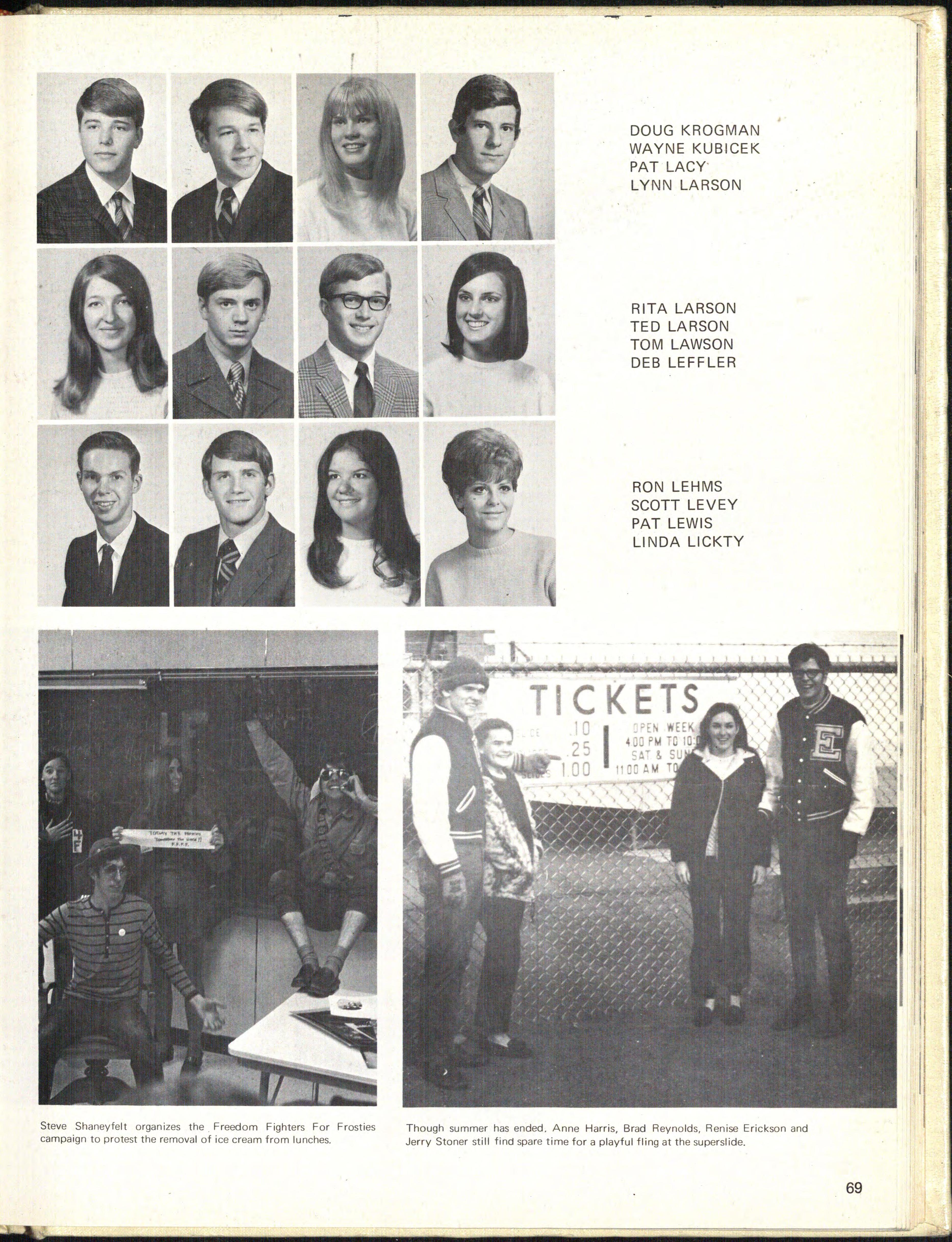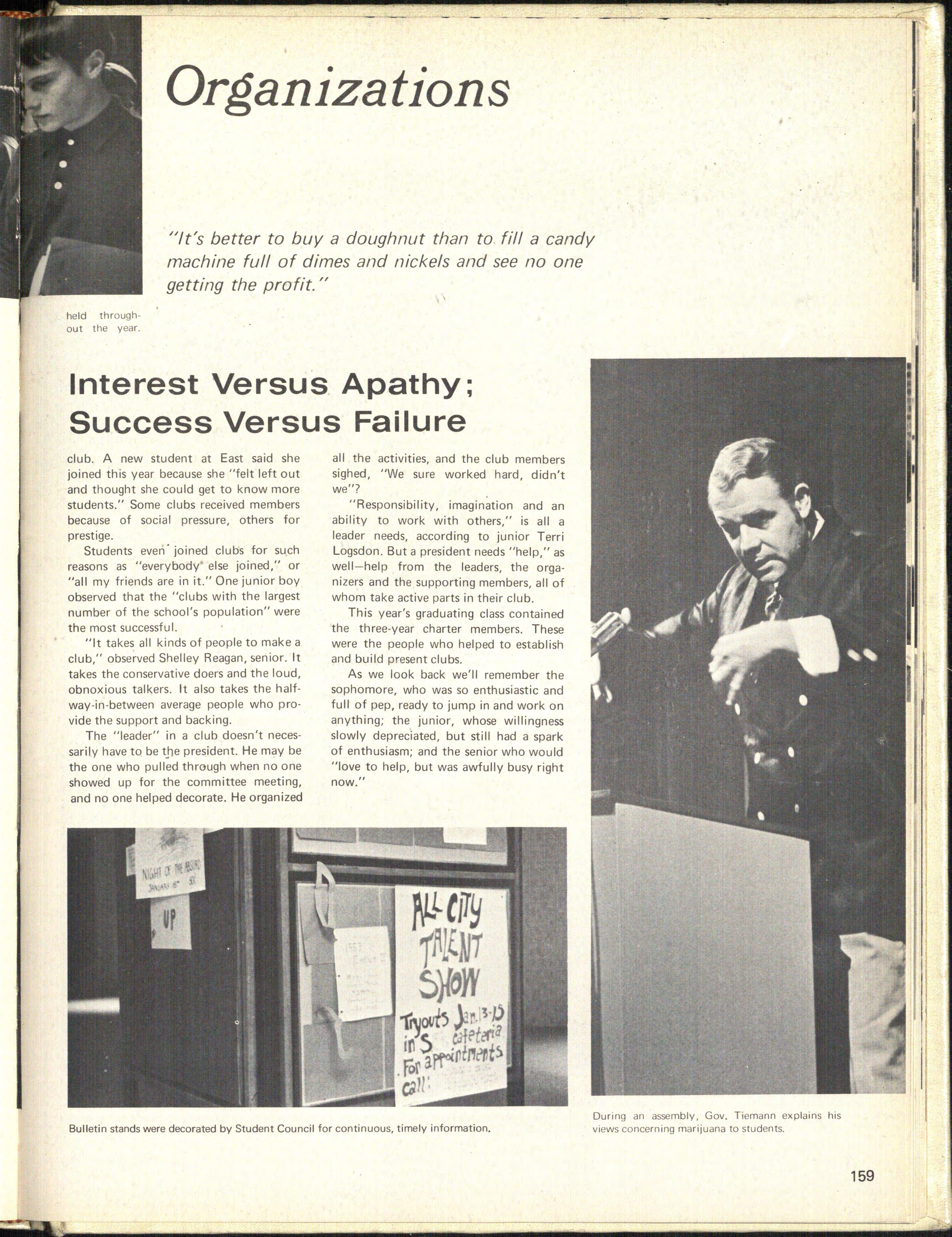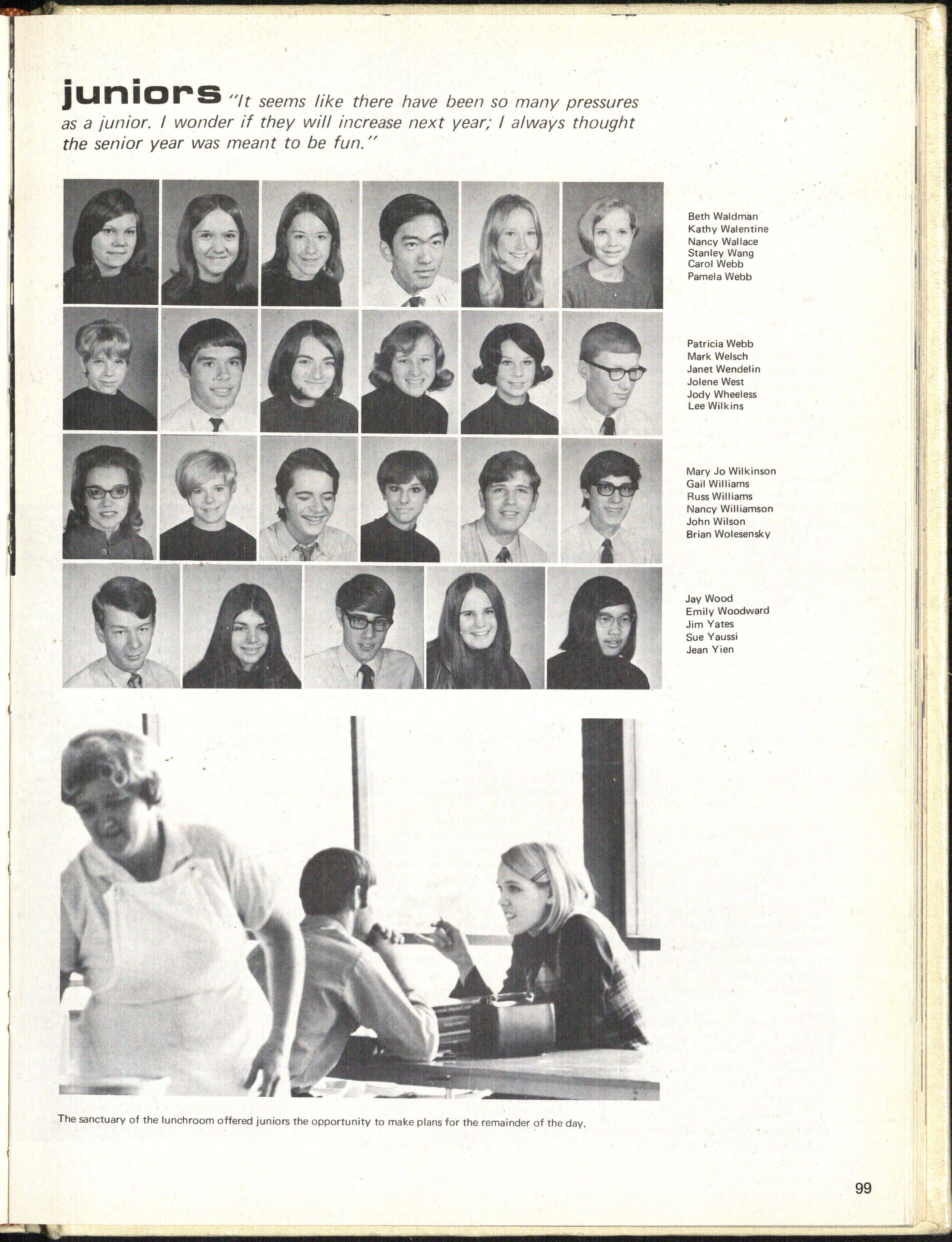 end of the day, others looked forward to a class. "In Philosophy-you talk about problems relevant to us right now; the teacher is well-read, humorous, talks on our level, understands our problems and keeps the class' attention," a senior said. Class discussions replaced lectures more and more. Performance classes and other methods were put into effect to create "a change of pace."