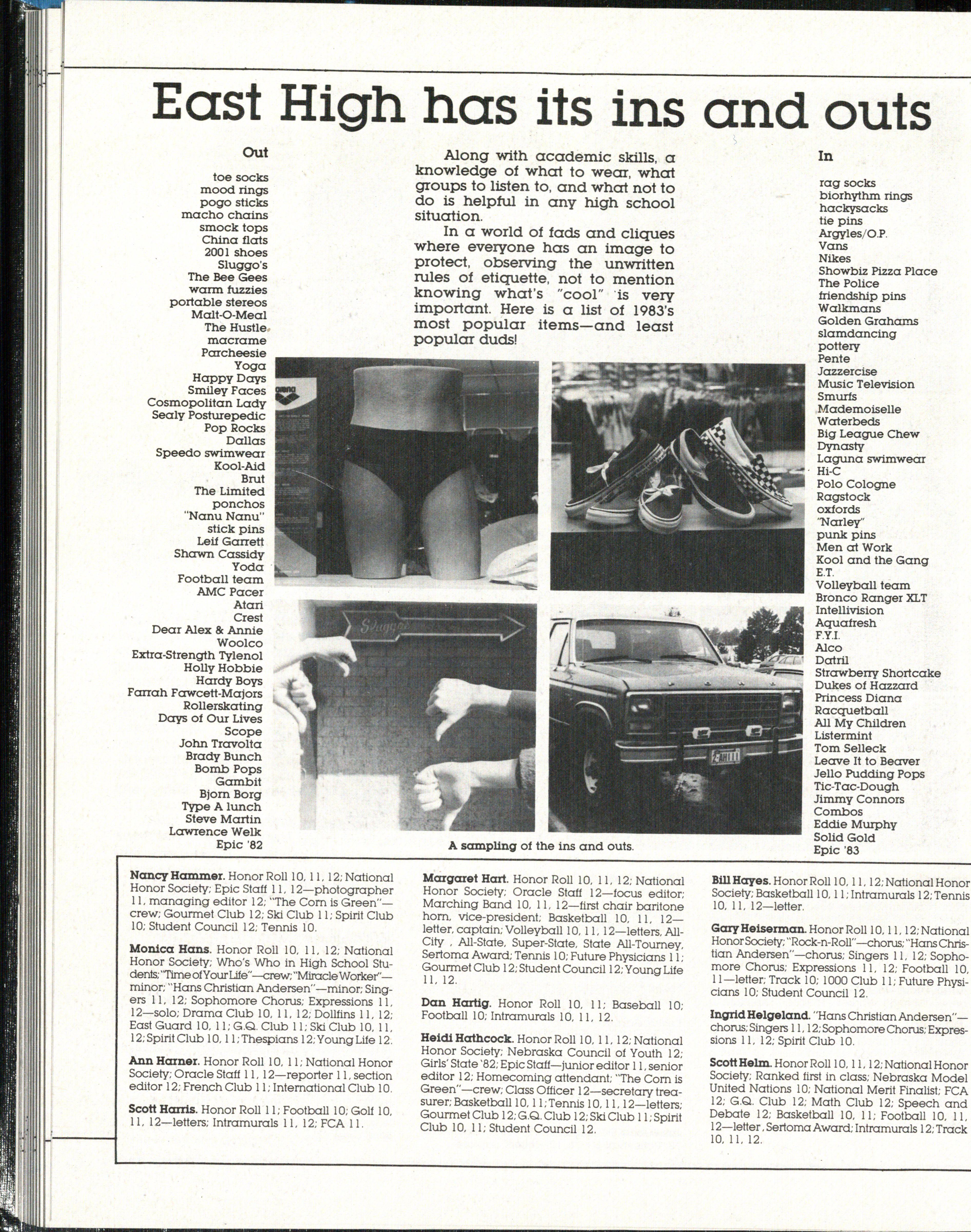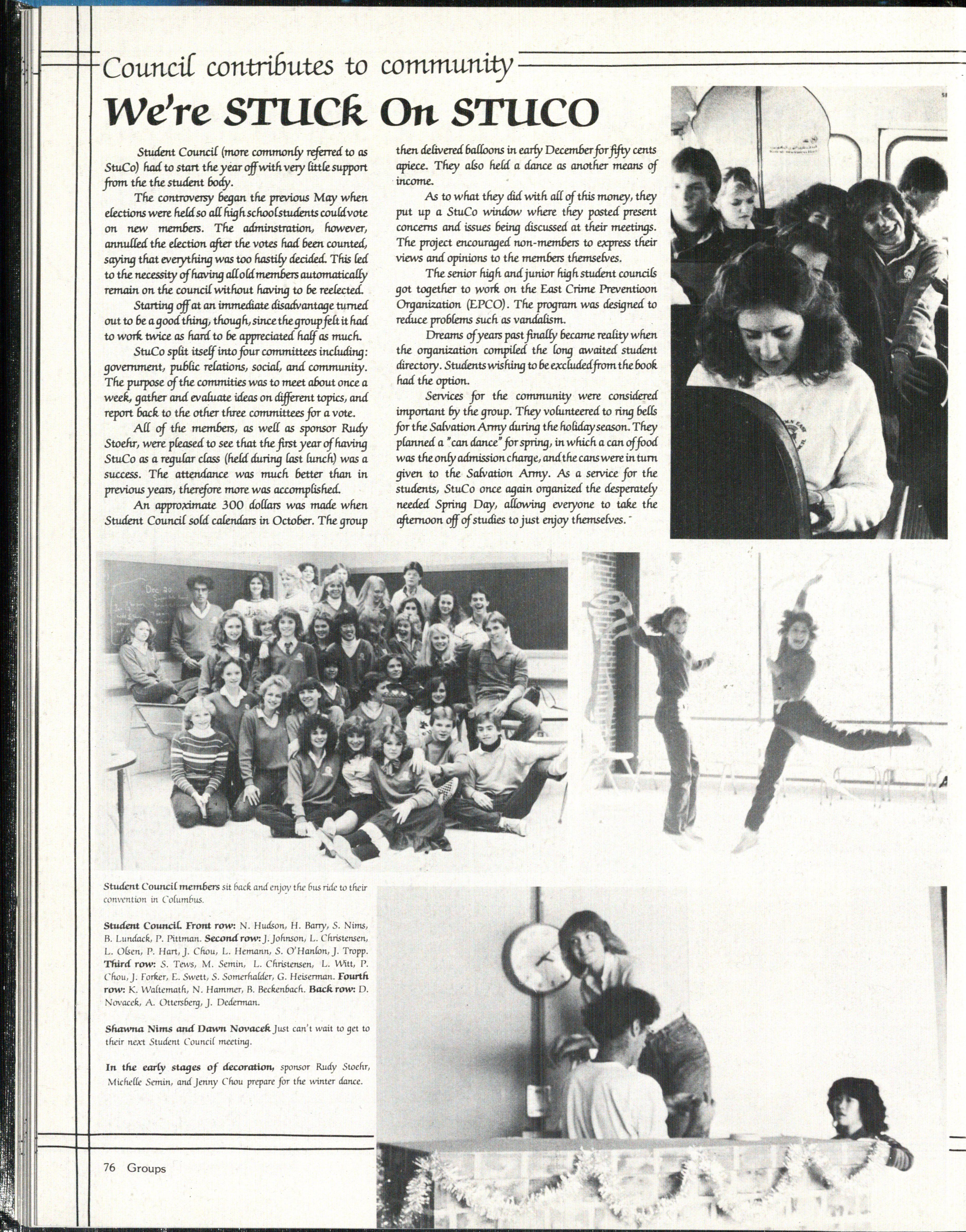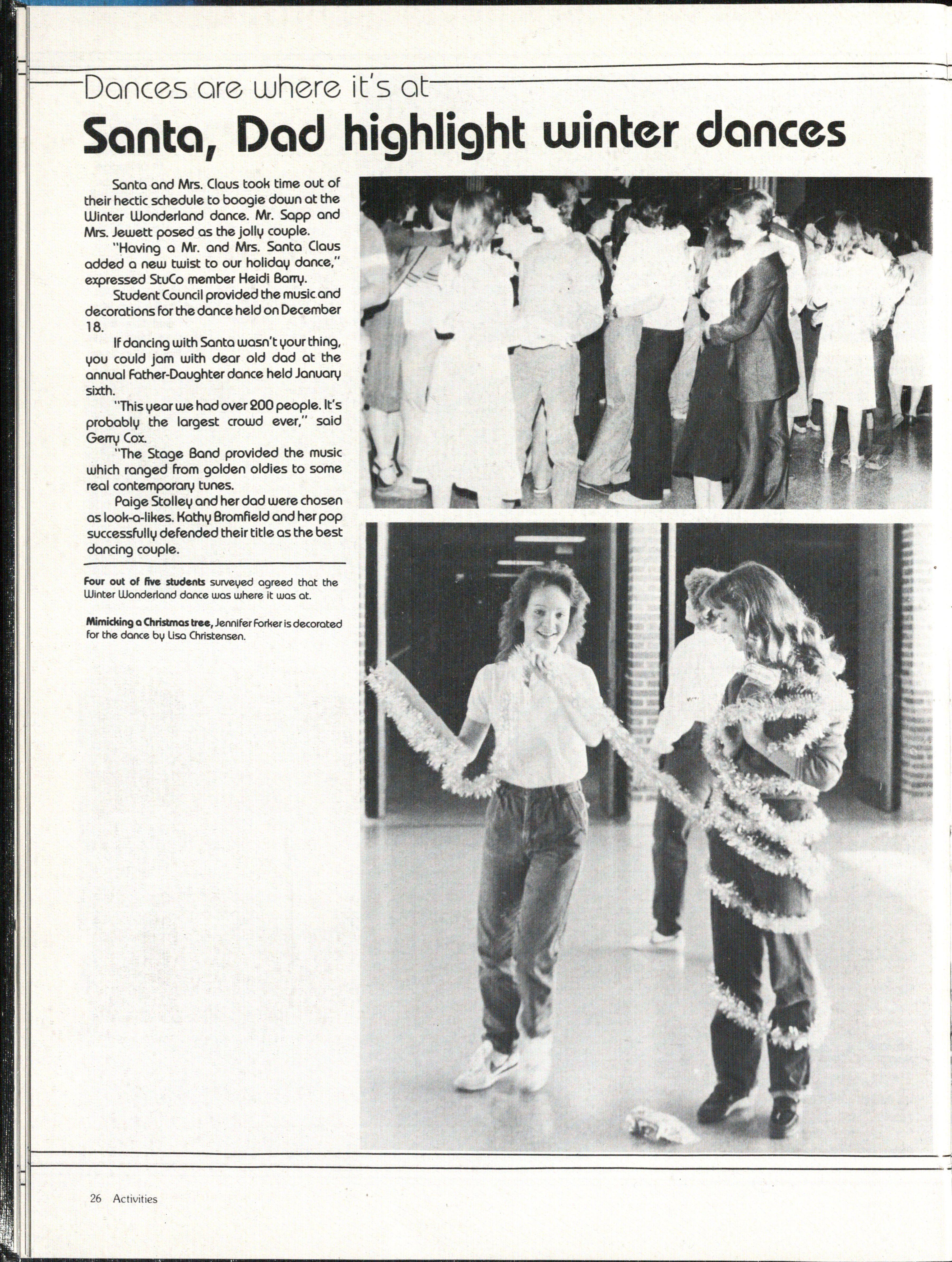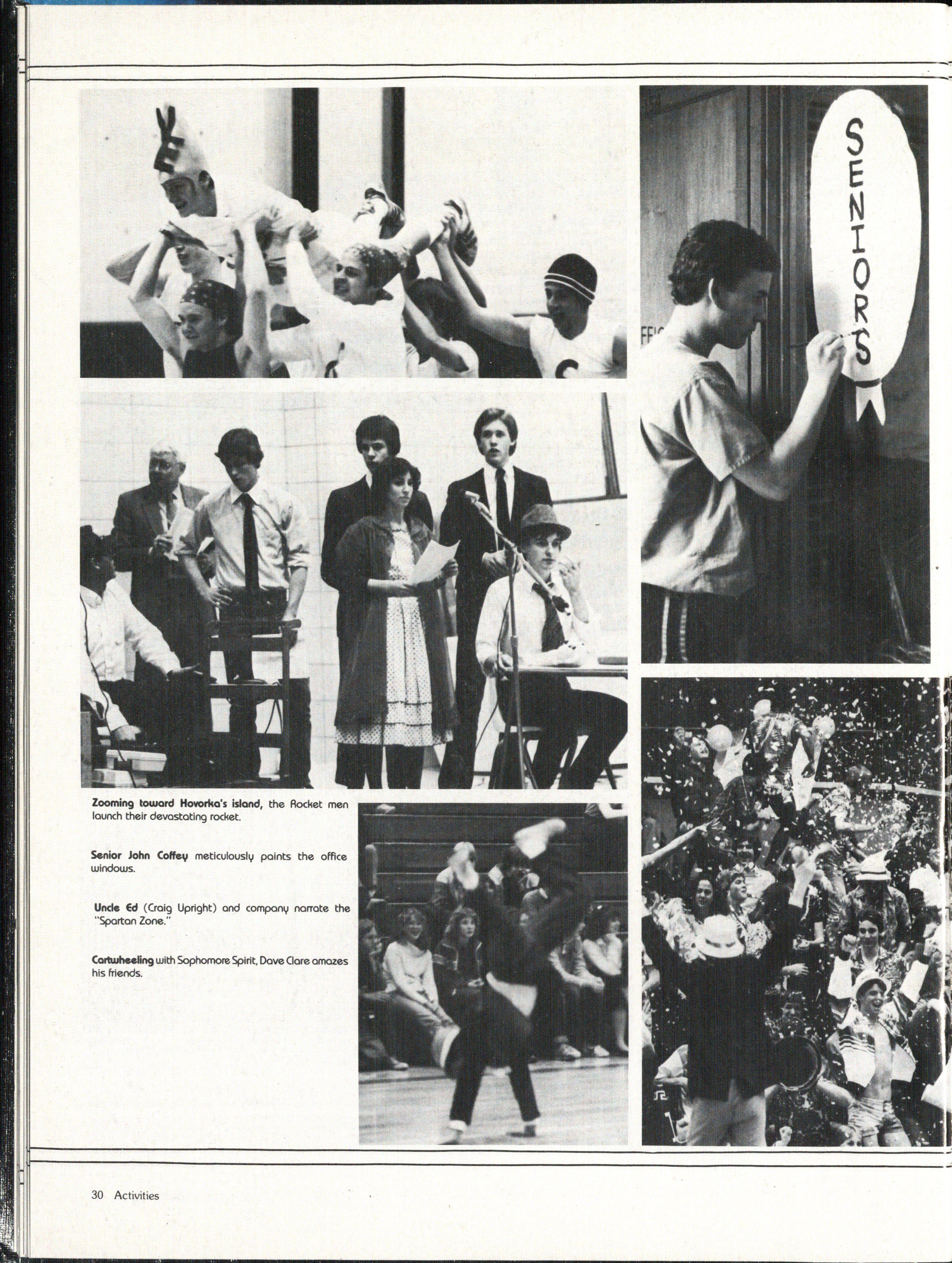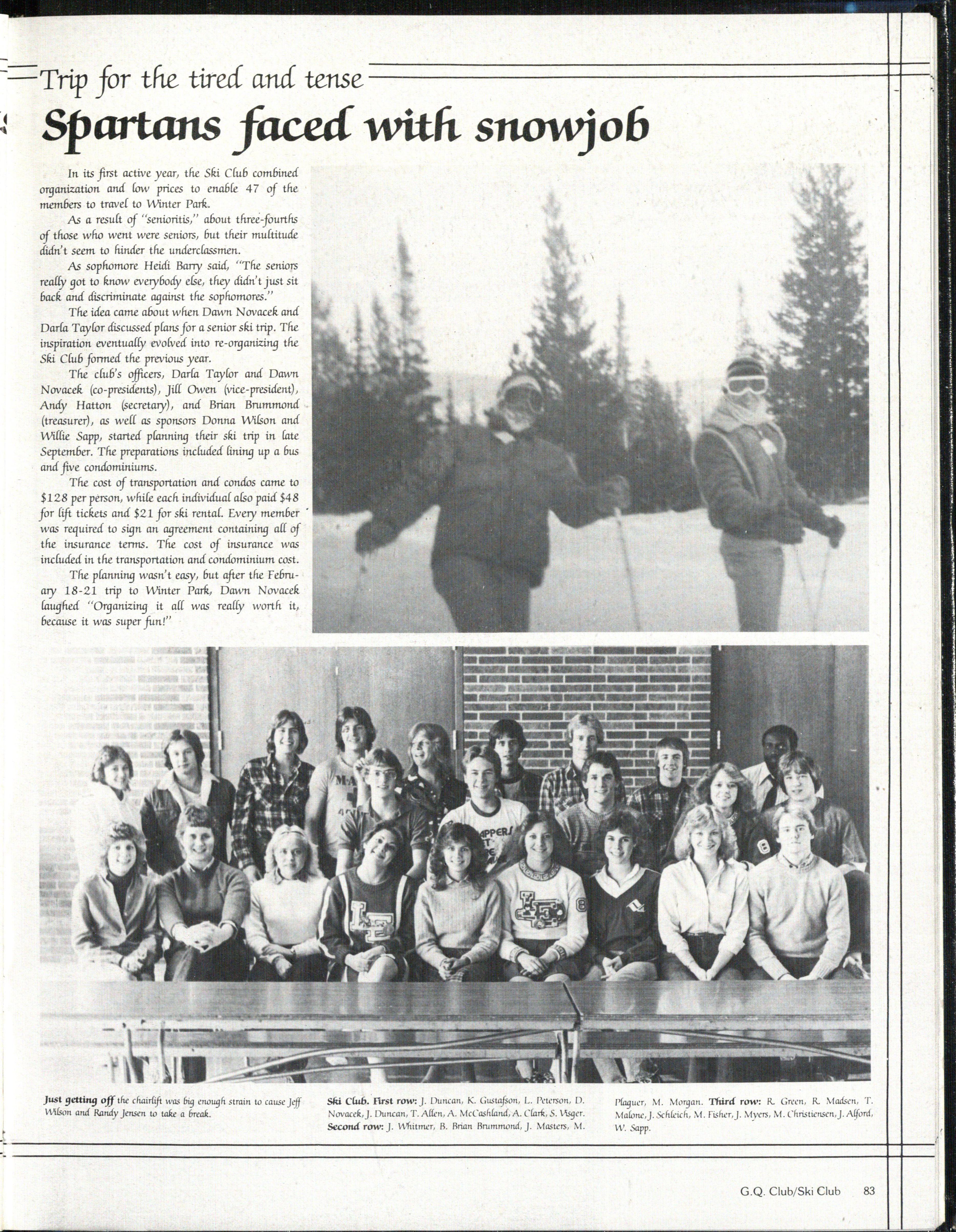 The clippings and reviews of '82-'83 reflected a successful booking. The season brought numerous state championships in sports as well as other activities. Highlights of the year included a "snow day" when school was cancelled, record highs in February which encouraged shorts, a football game played in a thunderstorm, the Punk-Funk Dance, classes held during a blackout, Johnny's Lounge (a new hang-