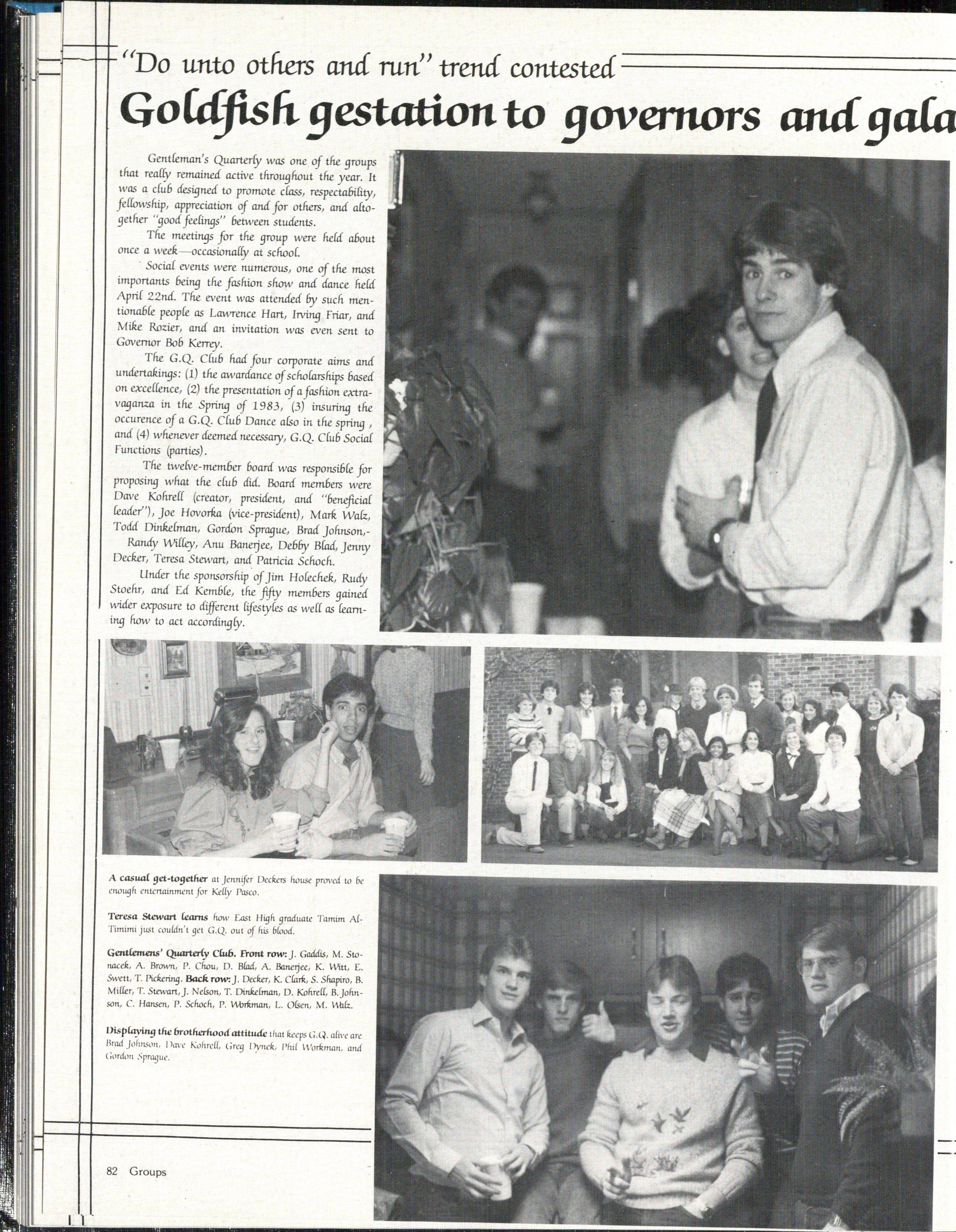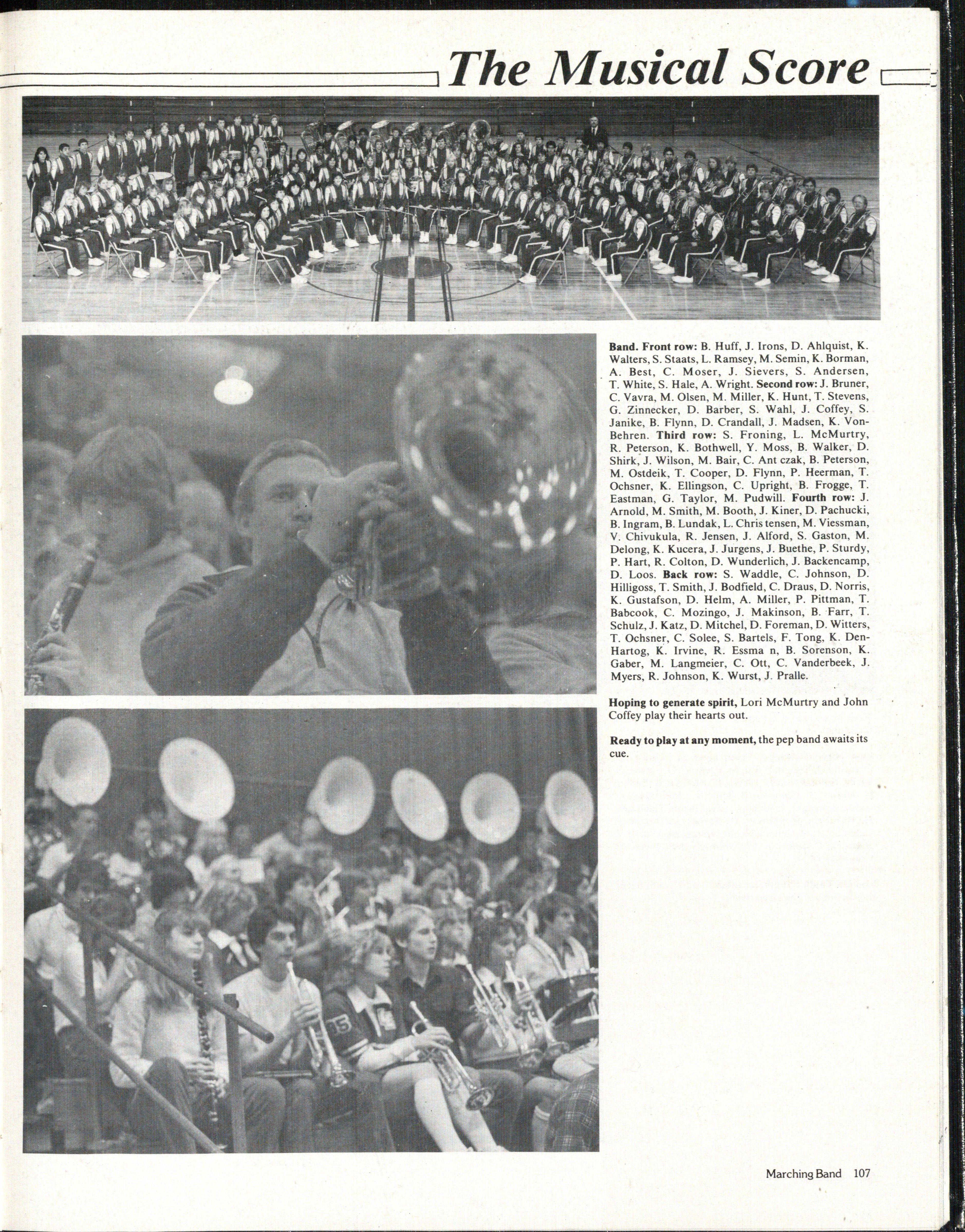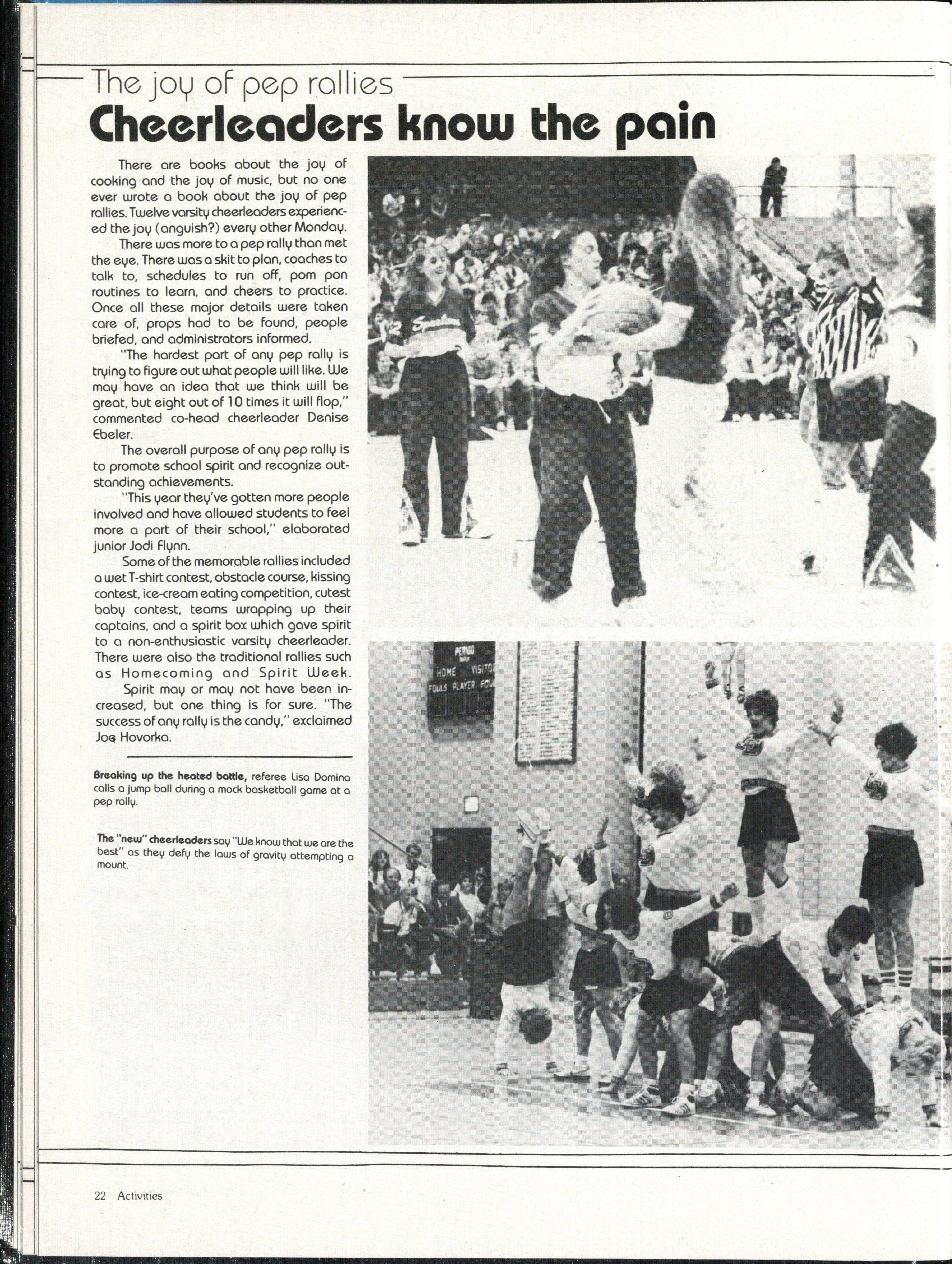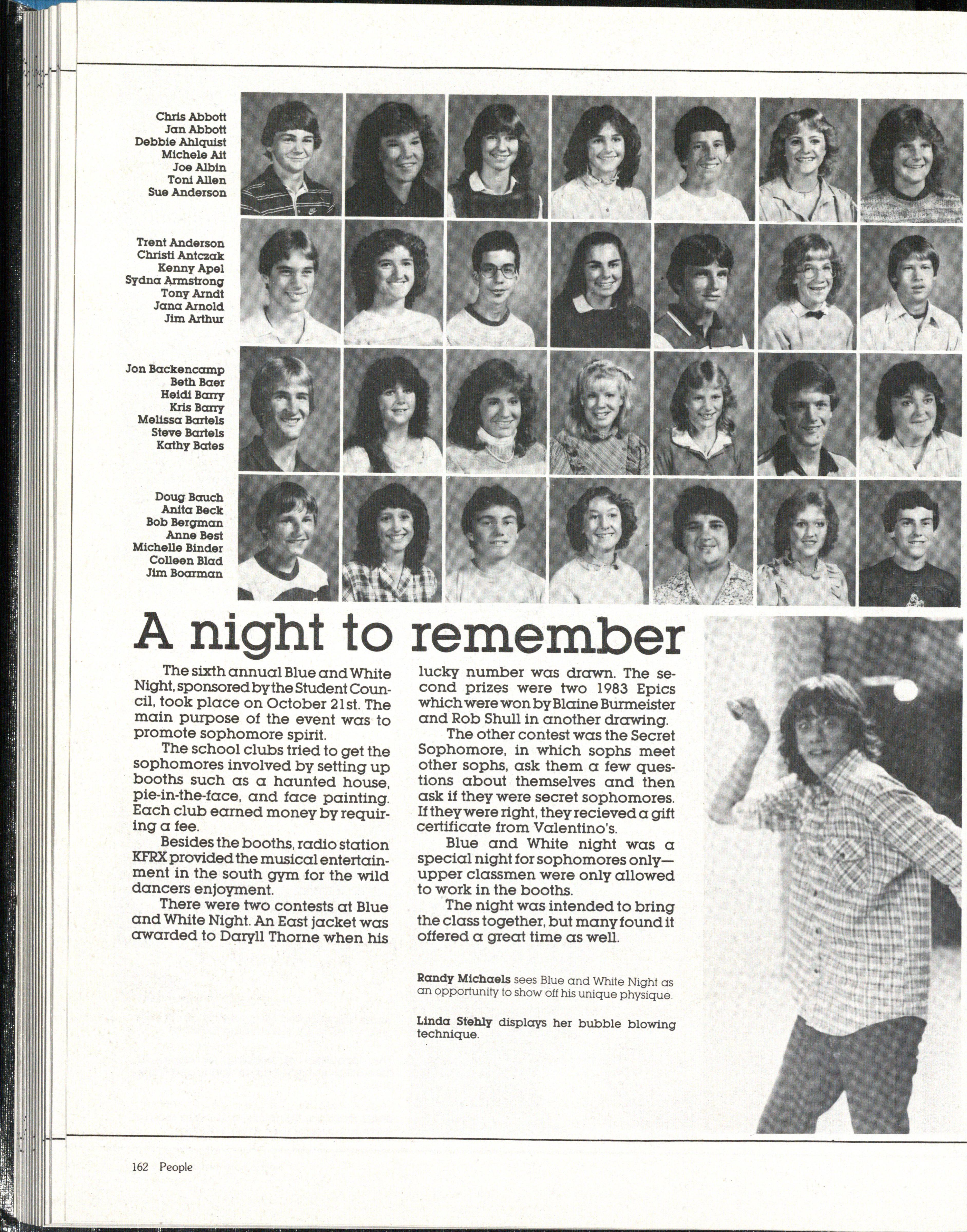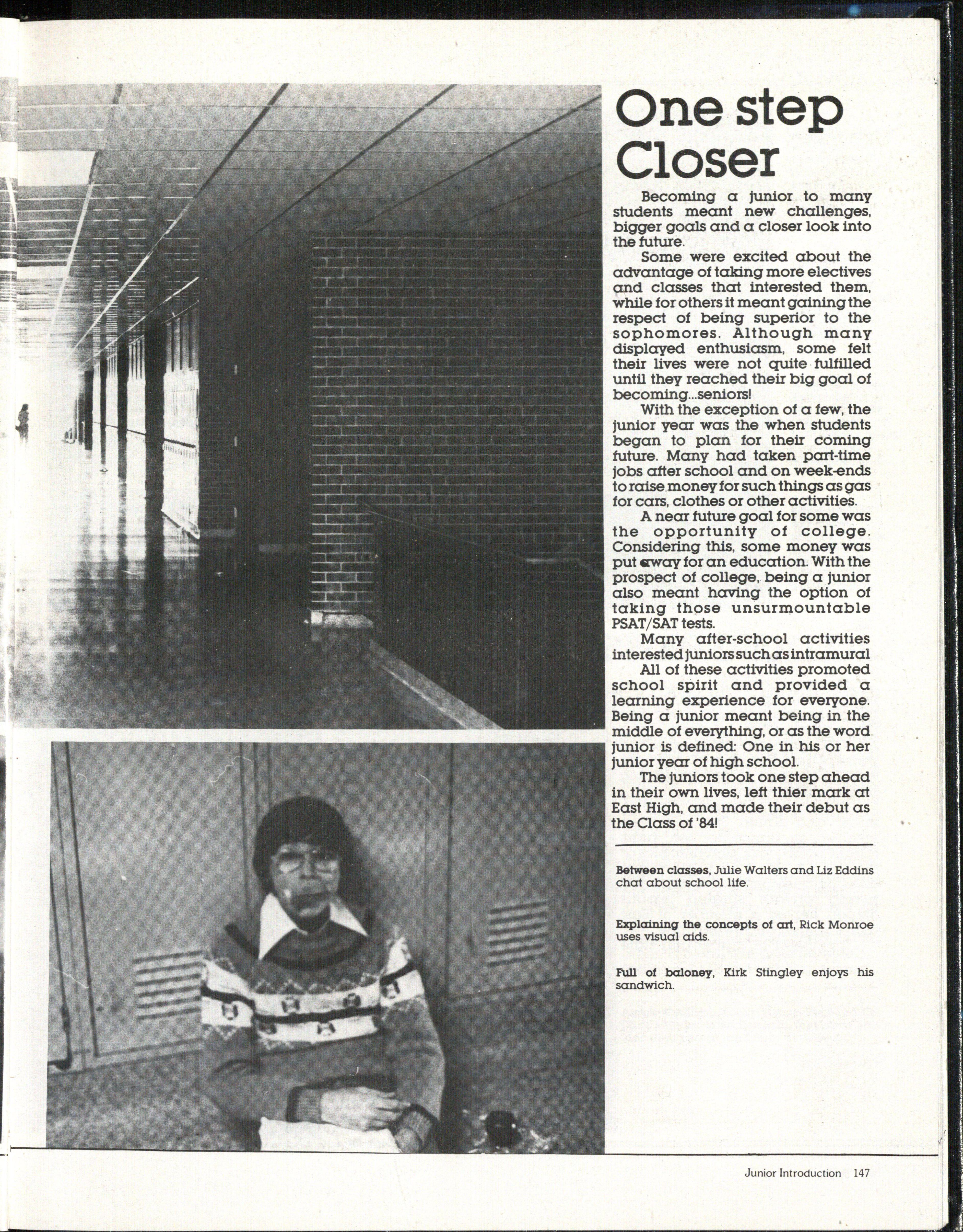 The clippings and reviews of '82-'83 reflected a successful booking. The season brought numerous state championships in sports as well as other activities. Highlights of the year included a "snow day" when school was cancelled, record highs in February which encouraged shorts, a football game played in a thunderstorm, the Punk-Funk Dance, classes held during a blackout, Johnny's Lounge (a new hang-