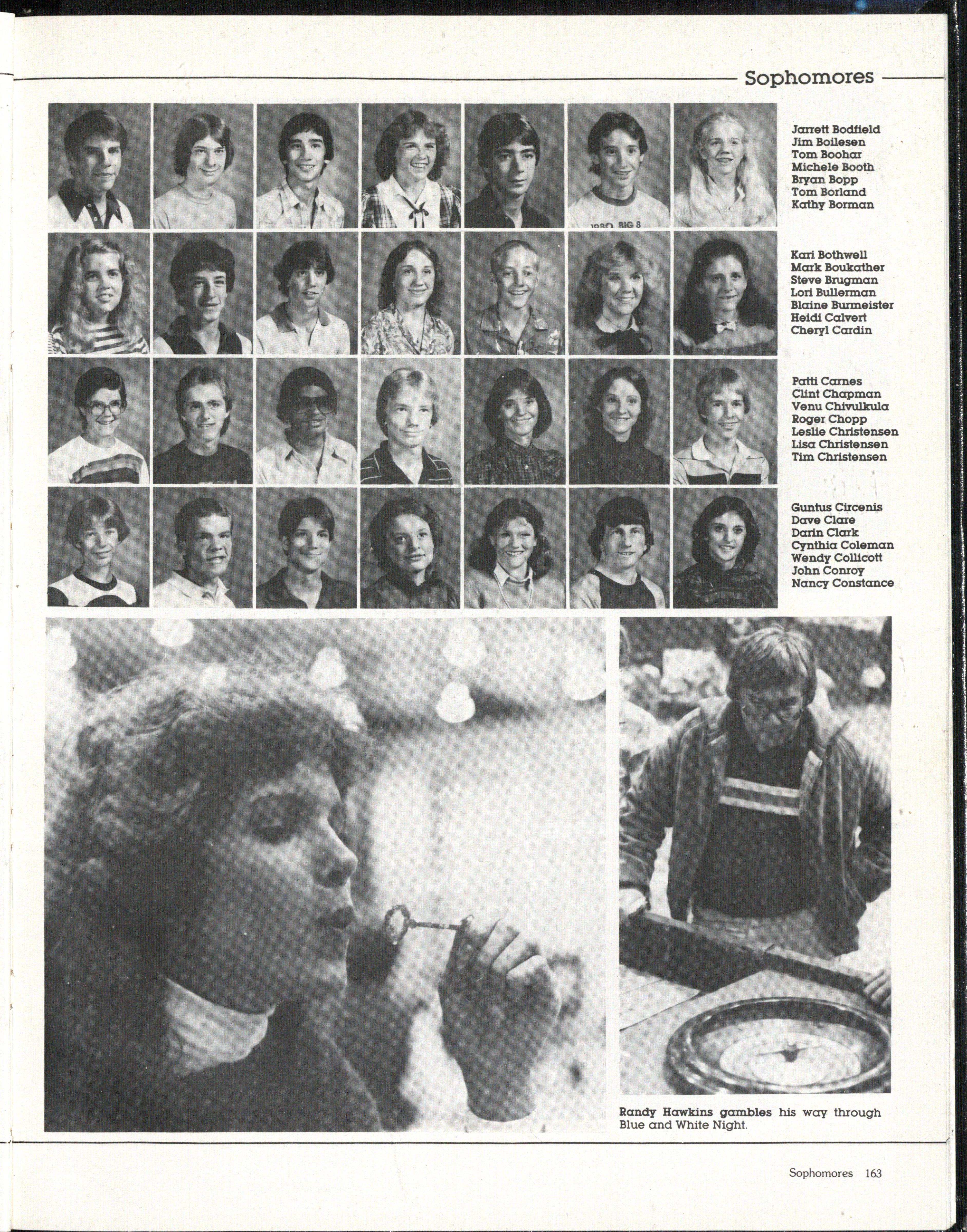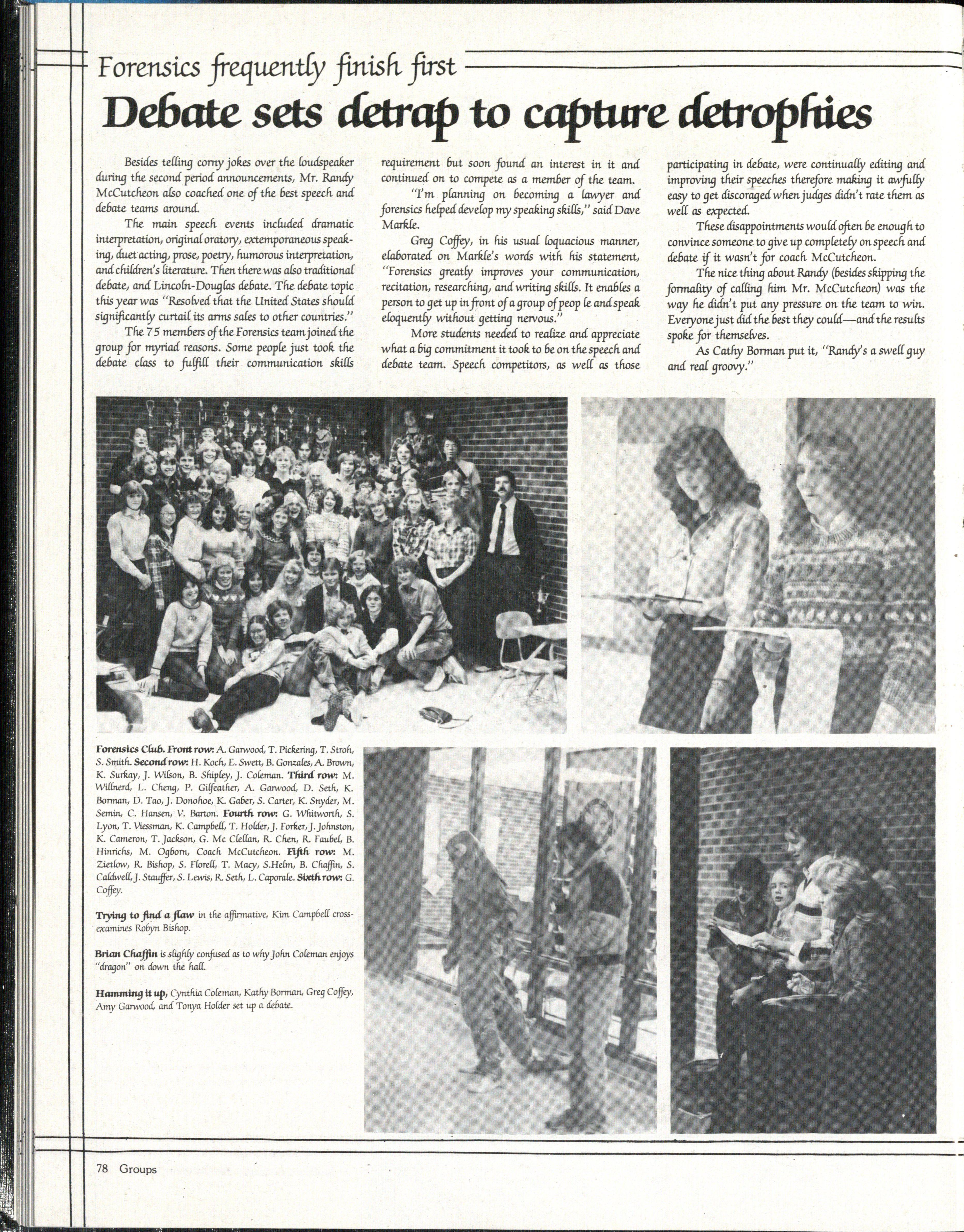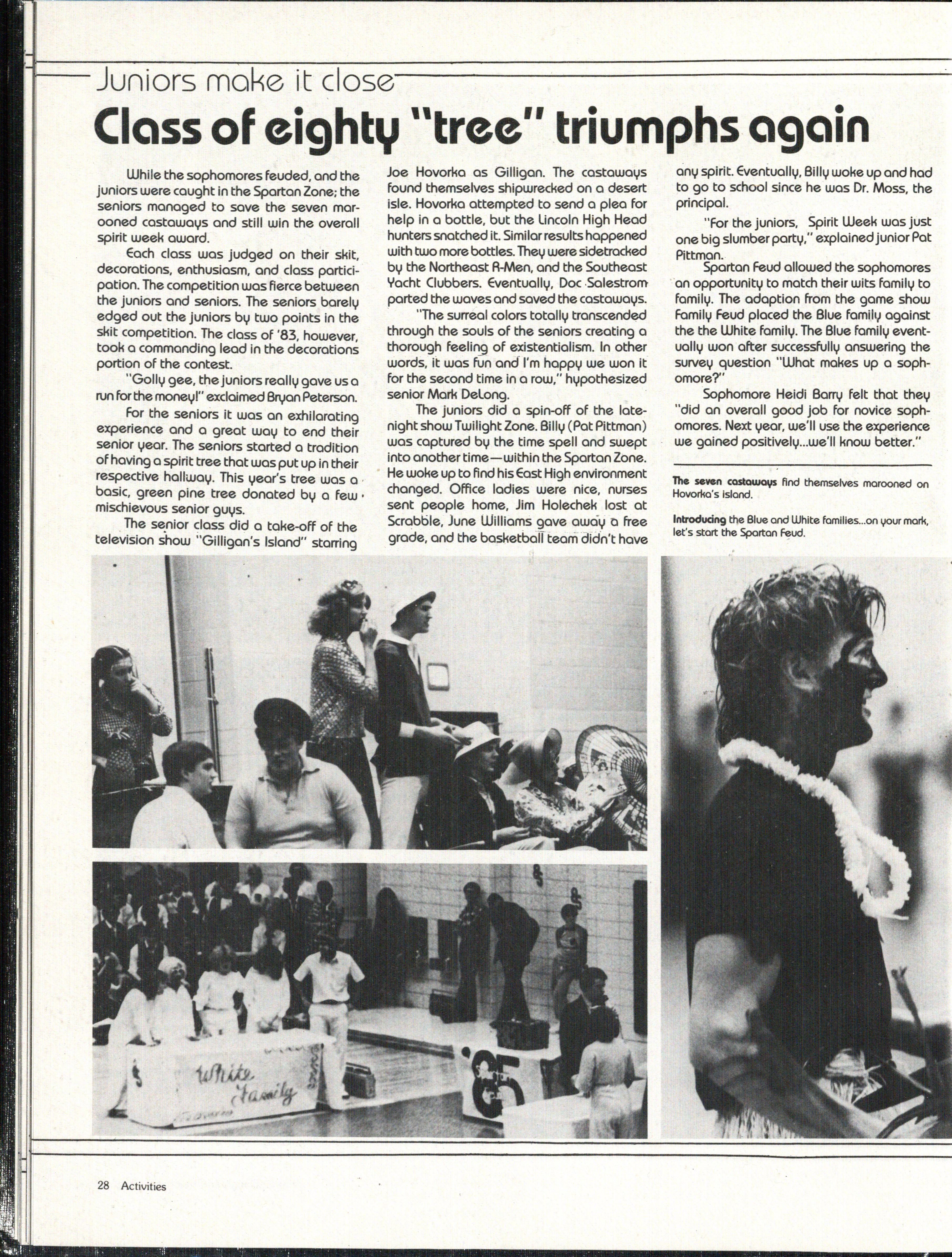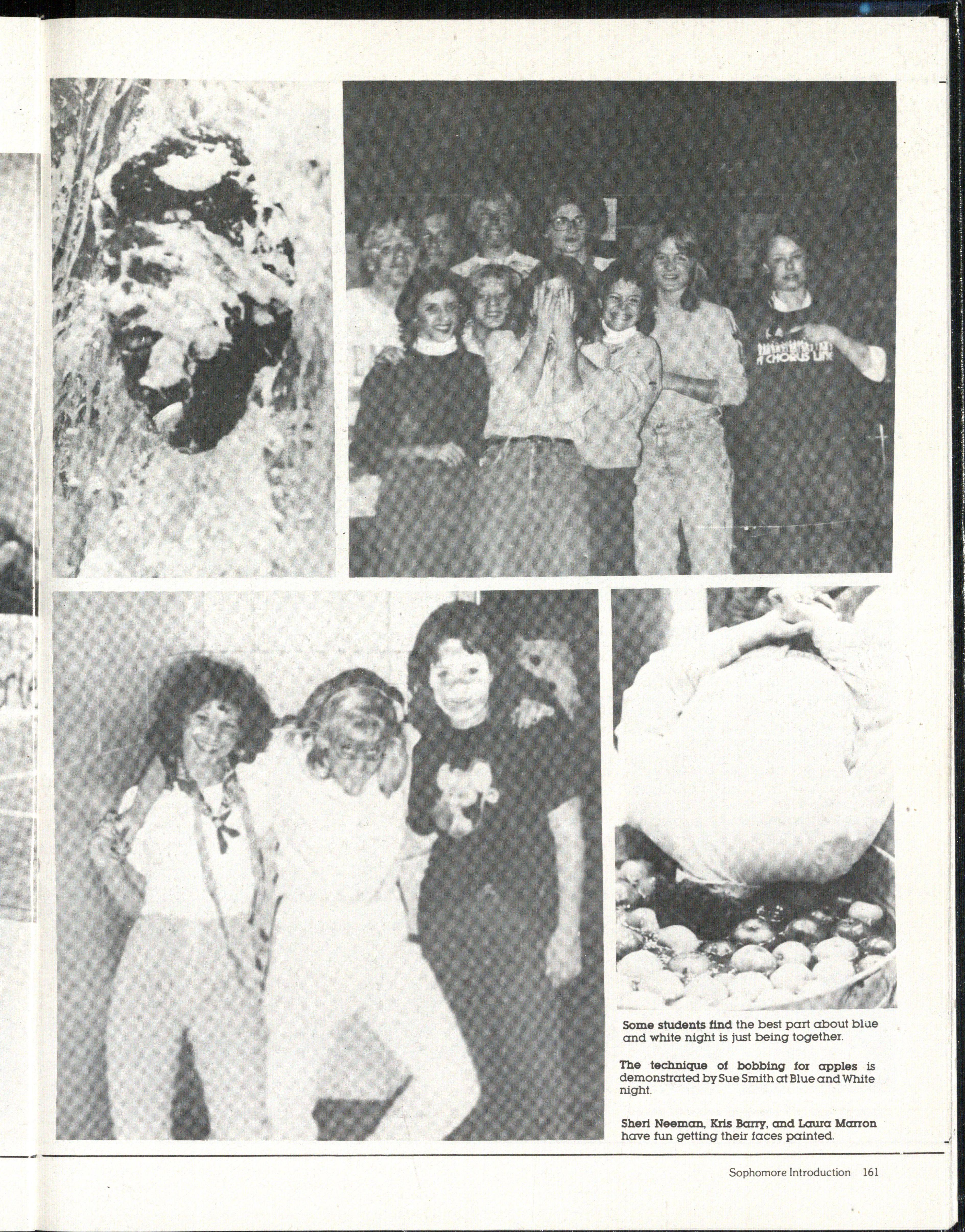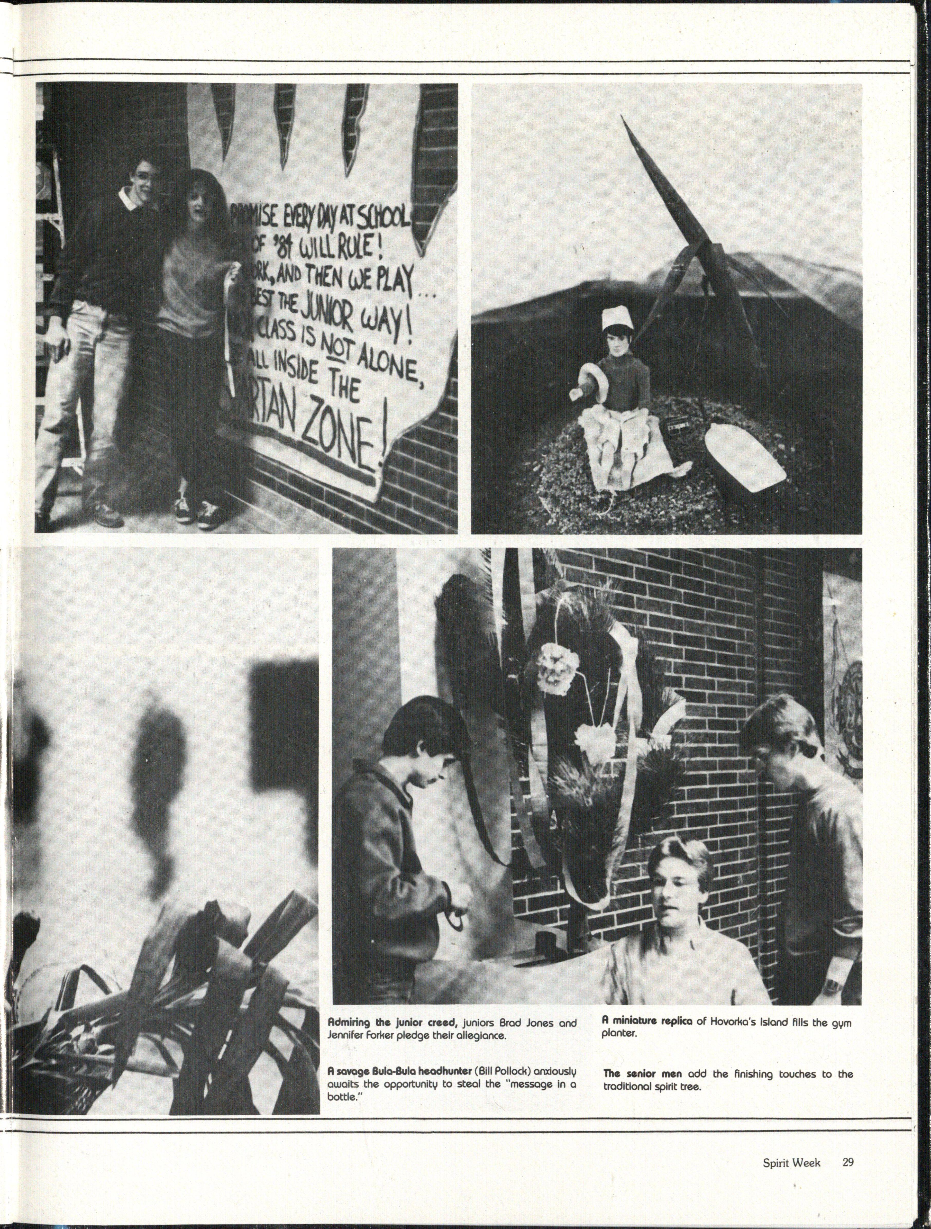 The clippings and reviews of '82-'83 reflected a successful booking. The season brought numerous state championships in sports as well as other activities. Highlights of the year included a "snow day" when school was cancelled, record highs in February which encouraged shorts, a football game played in a thunderstorm, the Punk-Funk Dance, classes held during a blackout, Johnny's Lounge (a new hang-