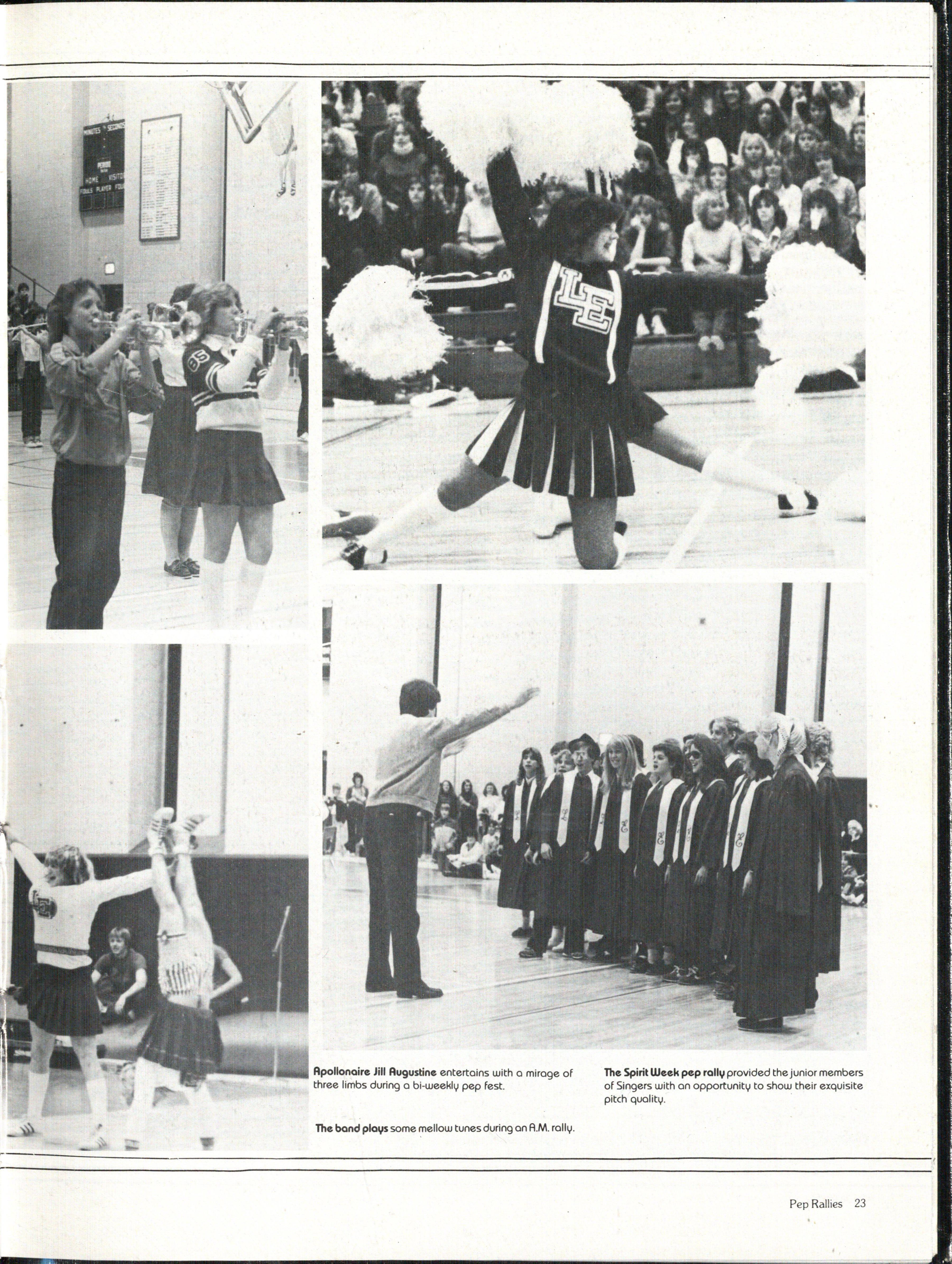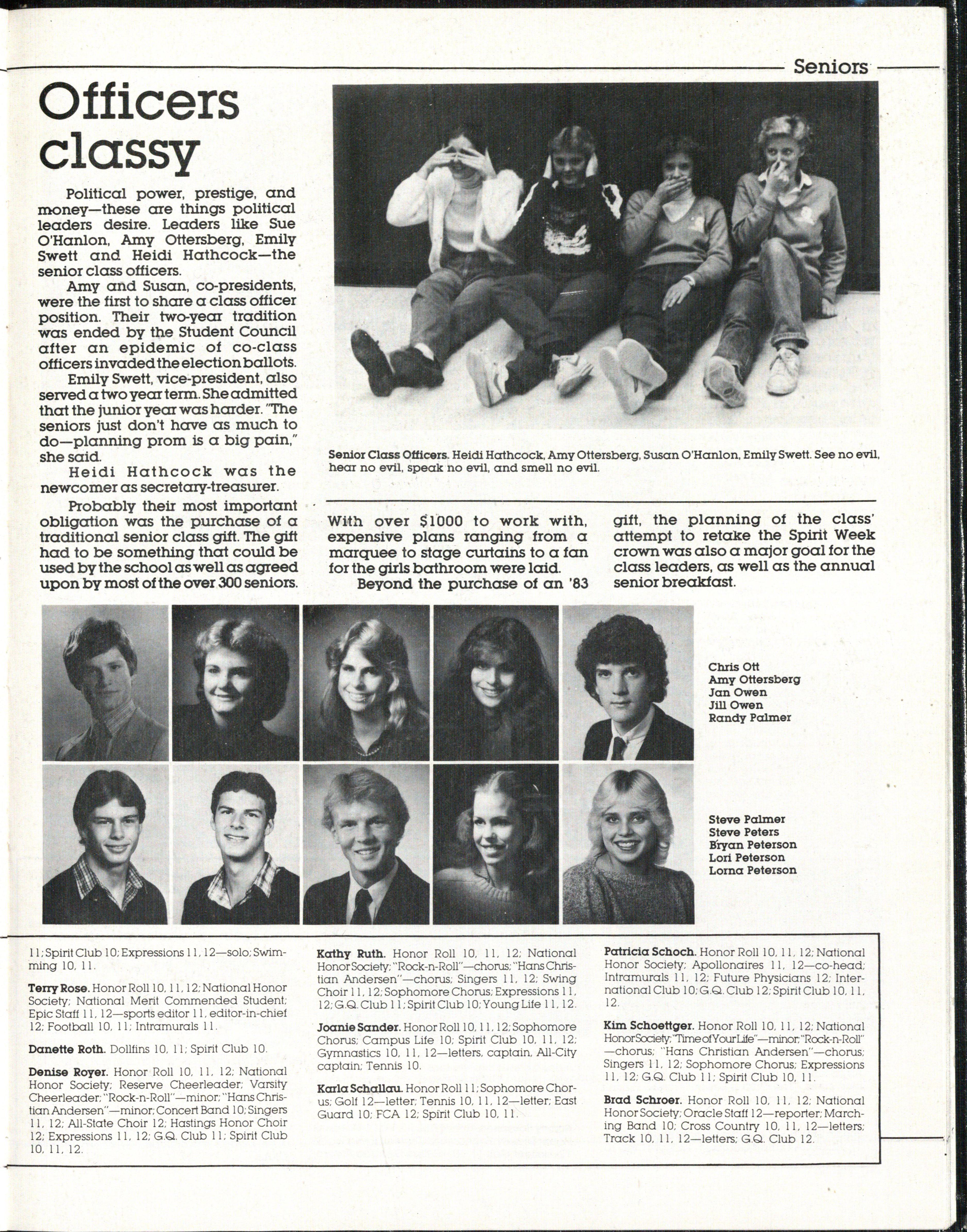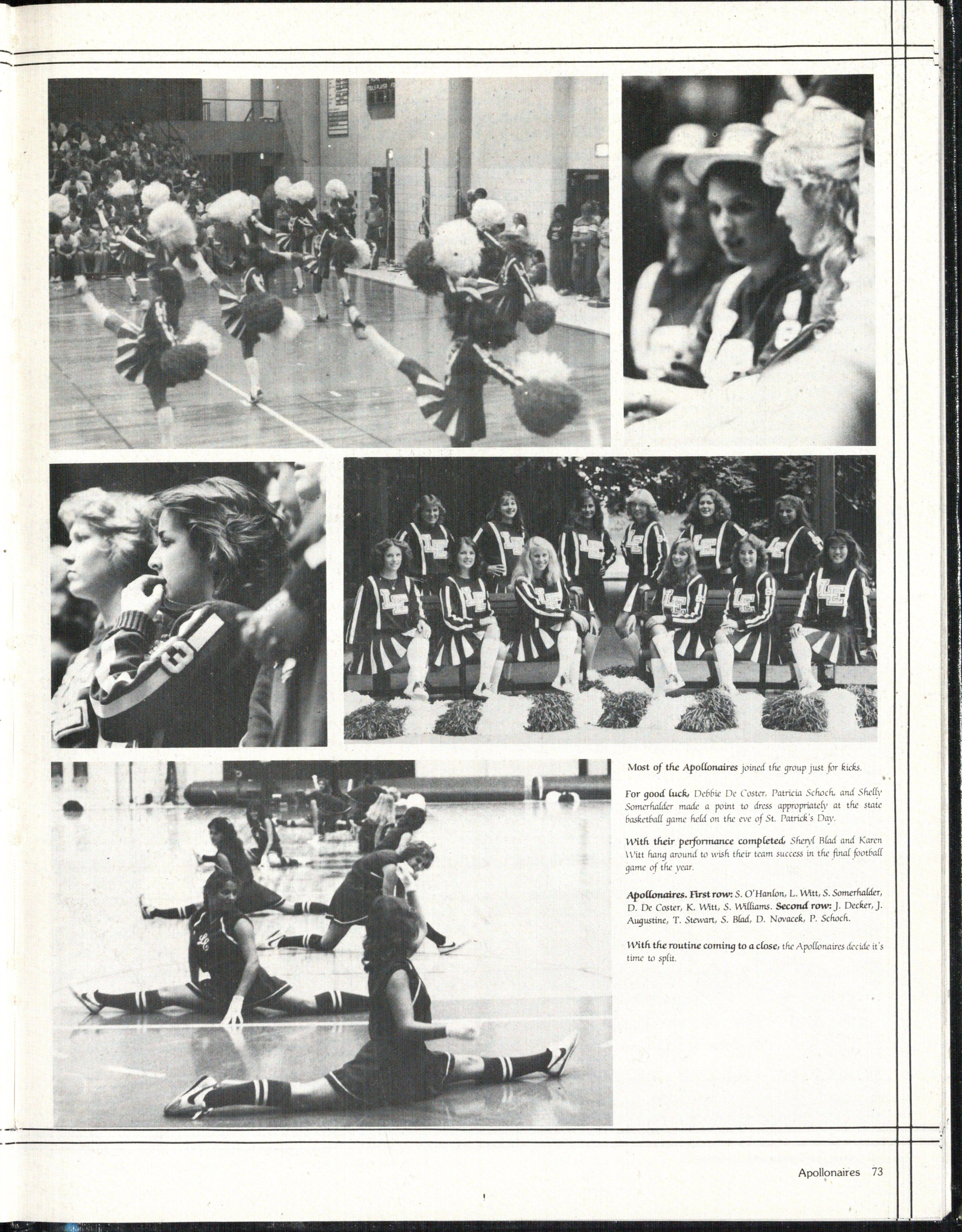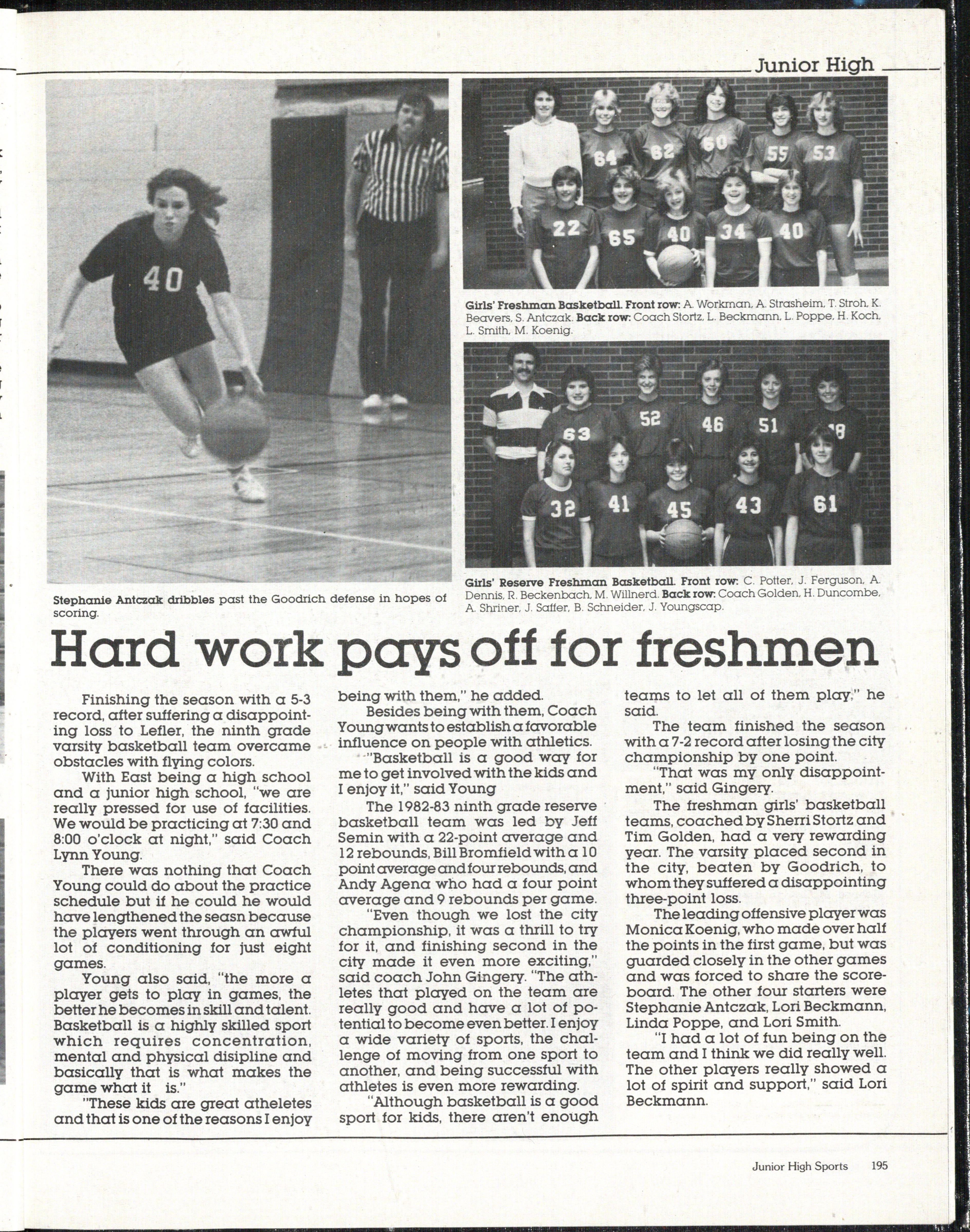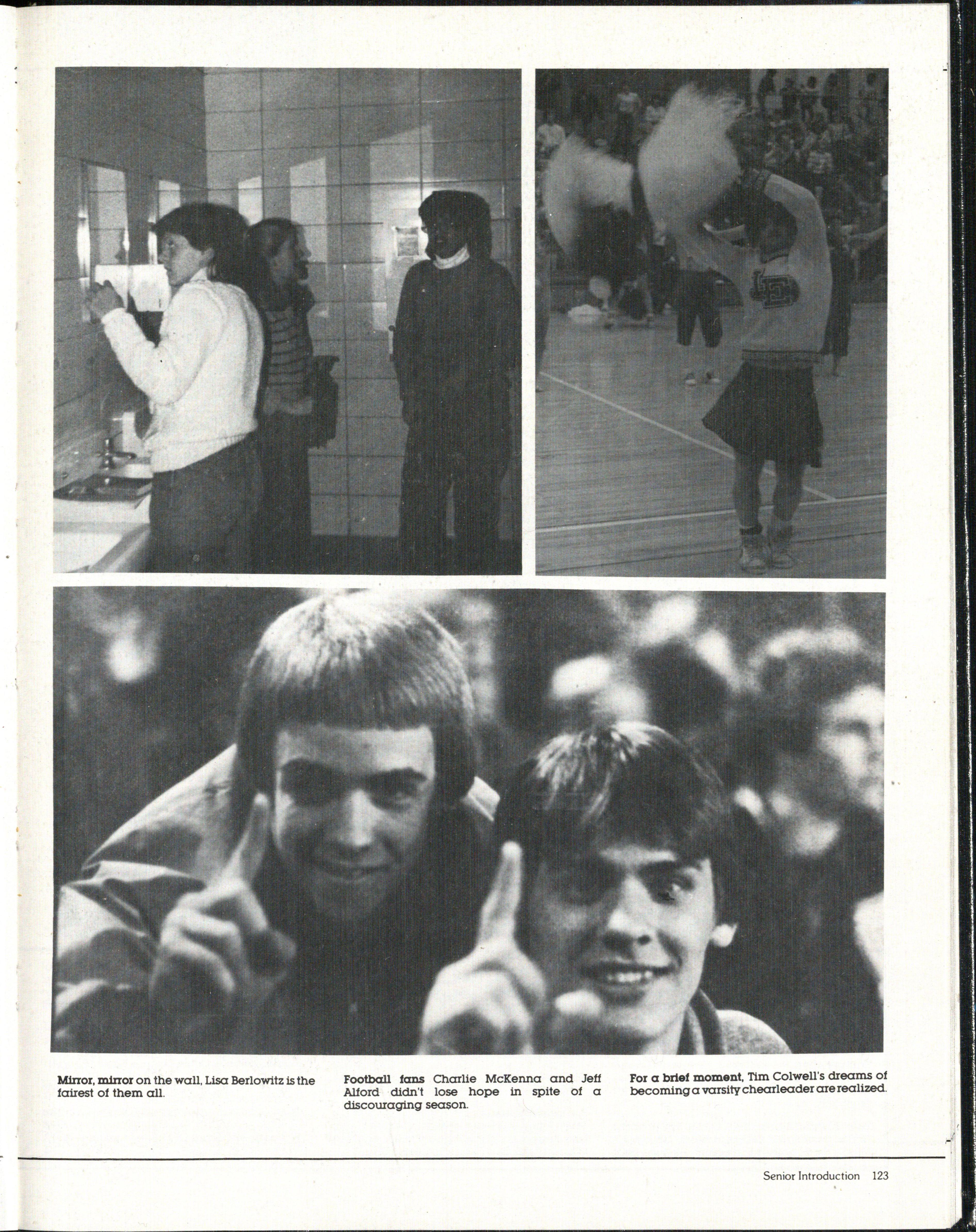The clippings and reviews of '82-'83 reflected a successful booking. The season brought numerous state championships in sports as well as other activities. Highlights of the year included a "snow day" when school was cancelled, record highs in February which encouraged shorts, a football game played in a thunderstorm, the Punk-Funk Dance, classes held during a blackout, Johnny's Lounge (a new hang-