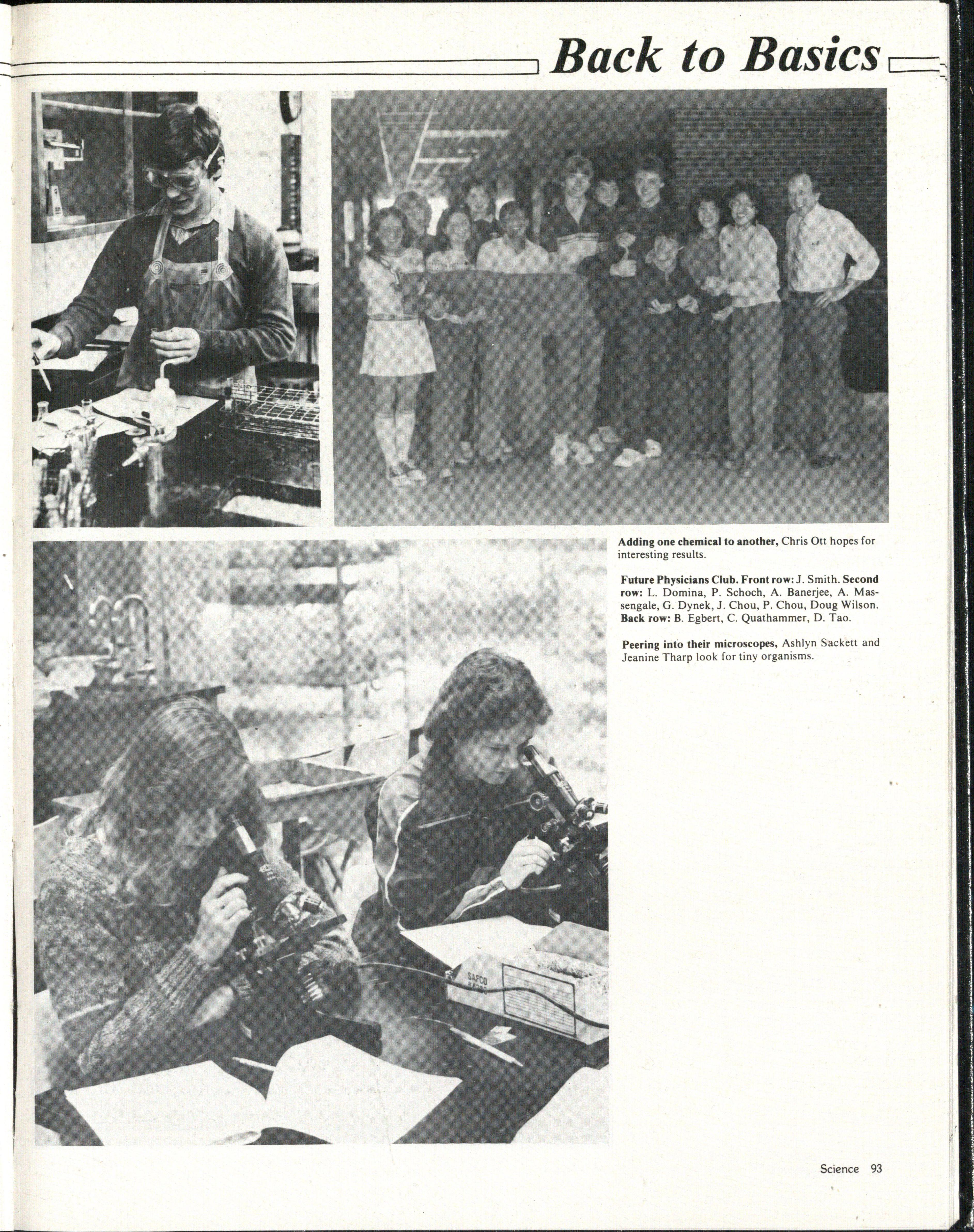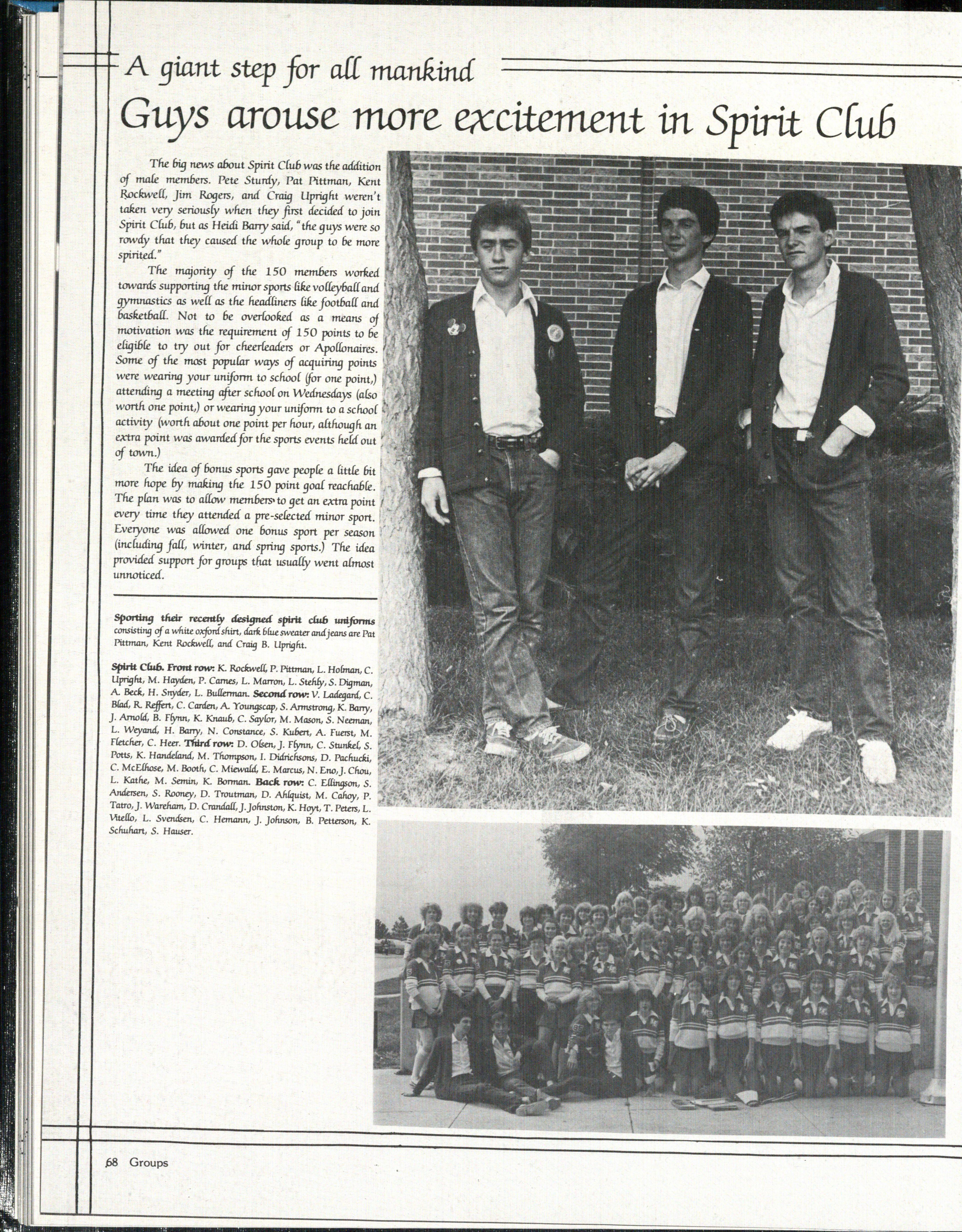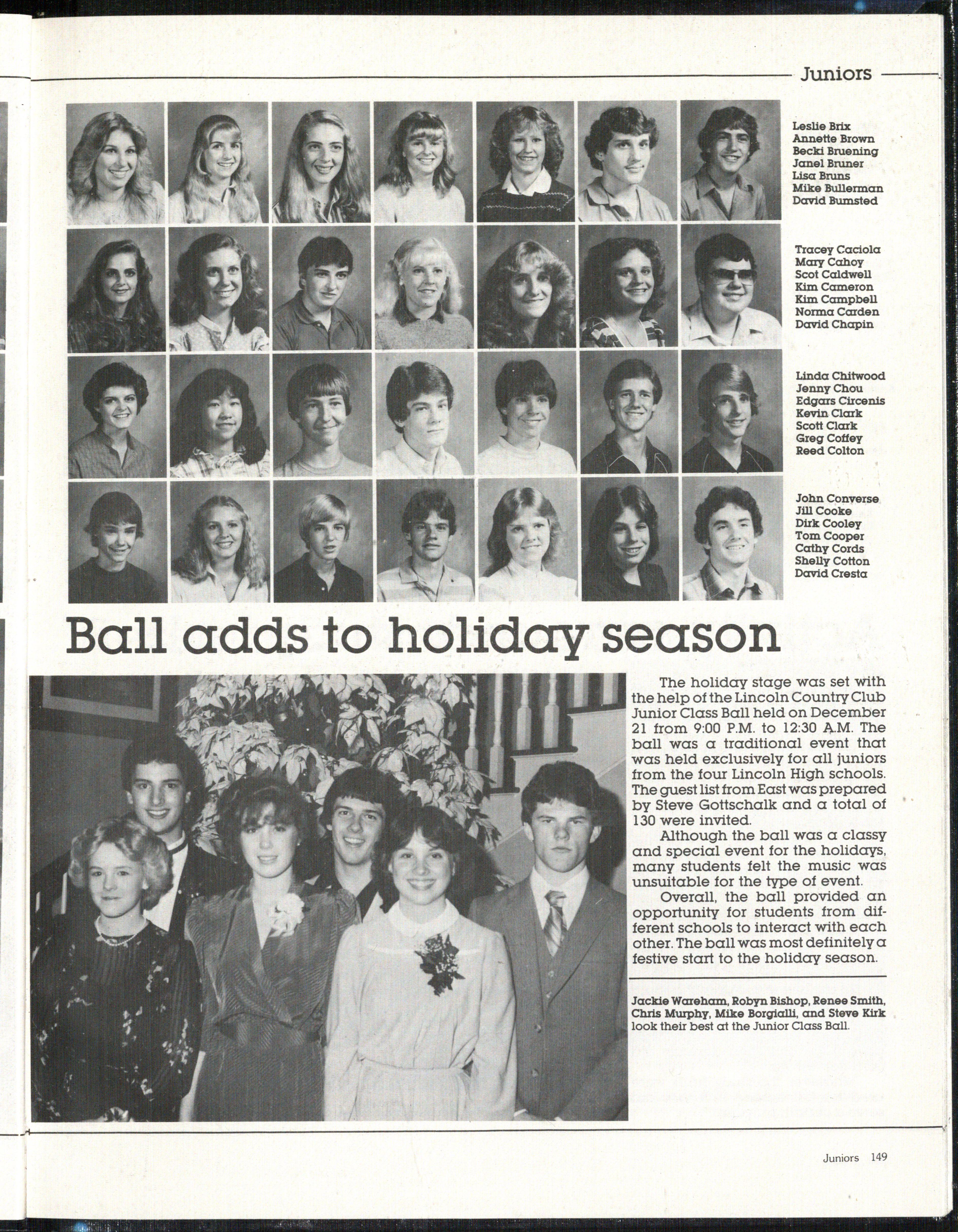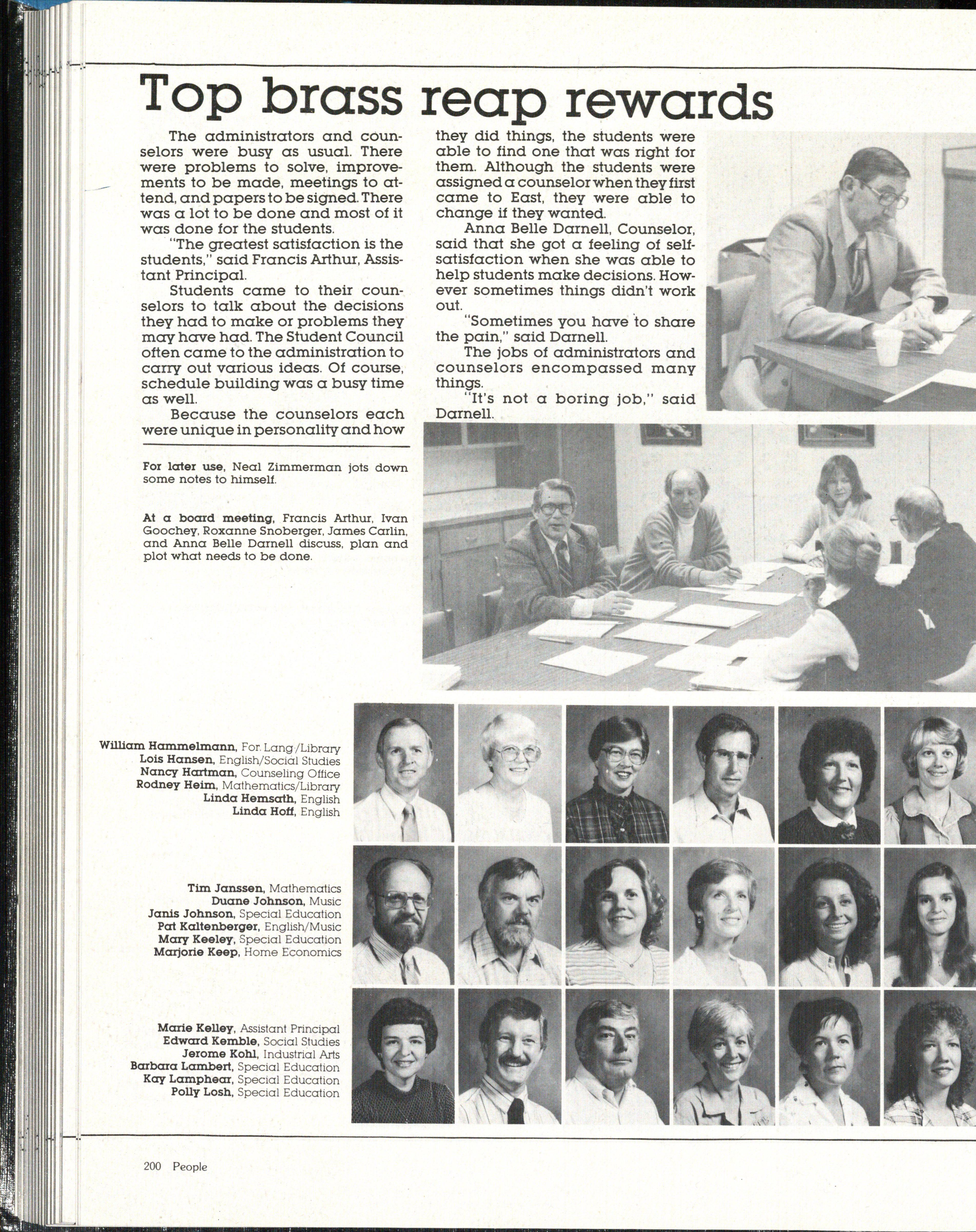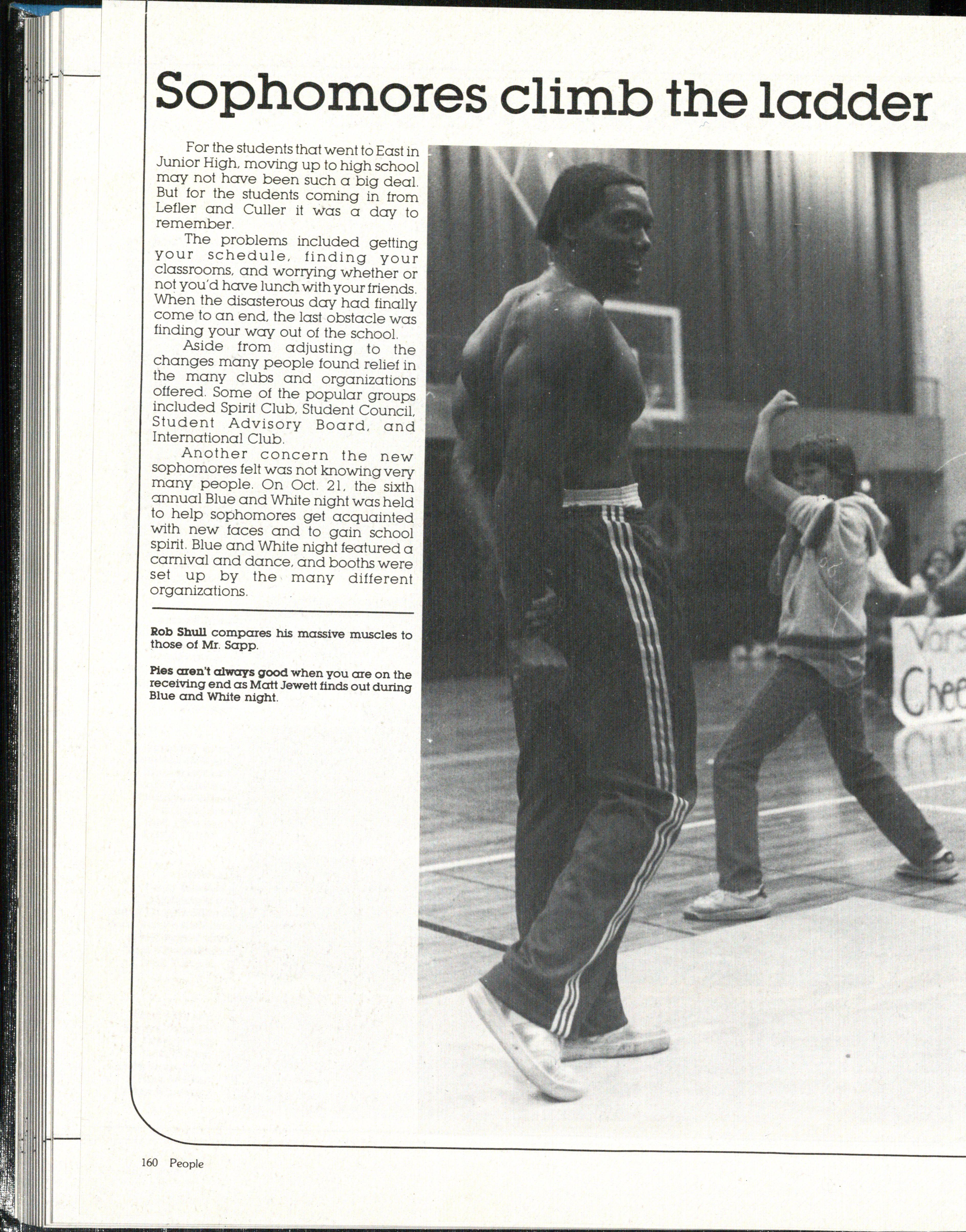 The clippings and reviews of '82-'83 reflected a successful booking. The season brought numerous state championships in sports as well as other activities. Highlights of the year included a "snow day" when school was cancelled, record highs in February which encouraged shorts, a football game played in a thunderstorm, the Punk-Funk Dance, classes held during a blackout, Johnny's Lounge (a new hang-
