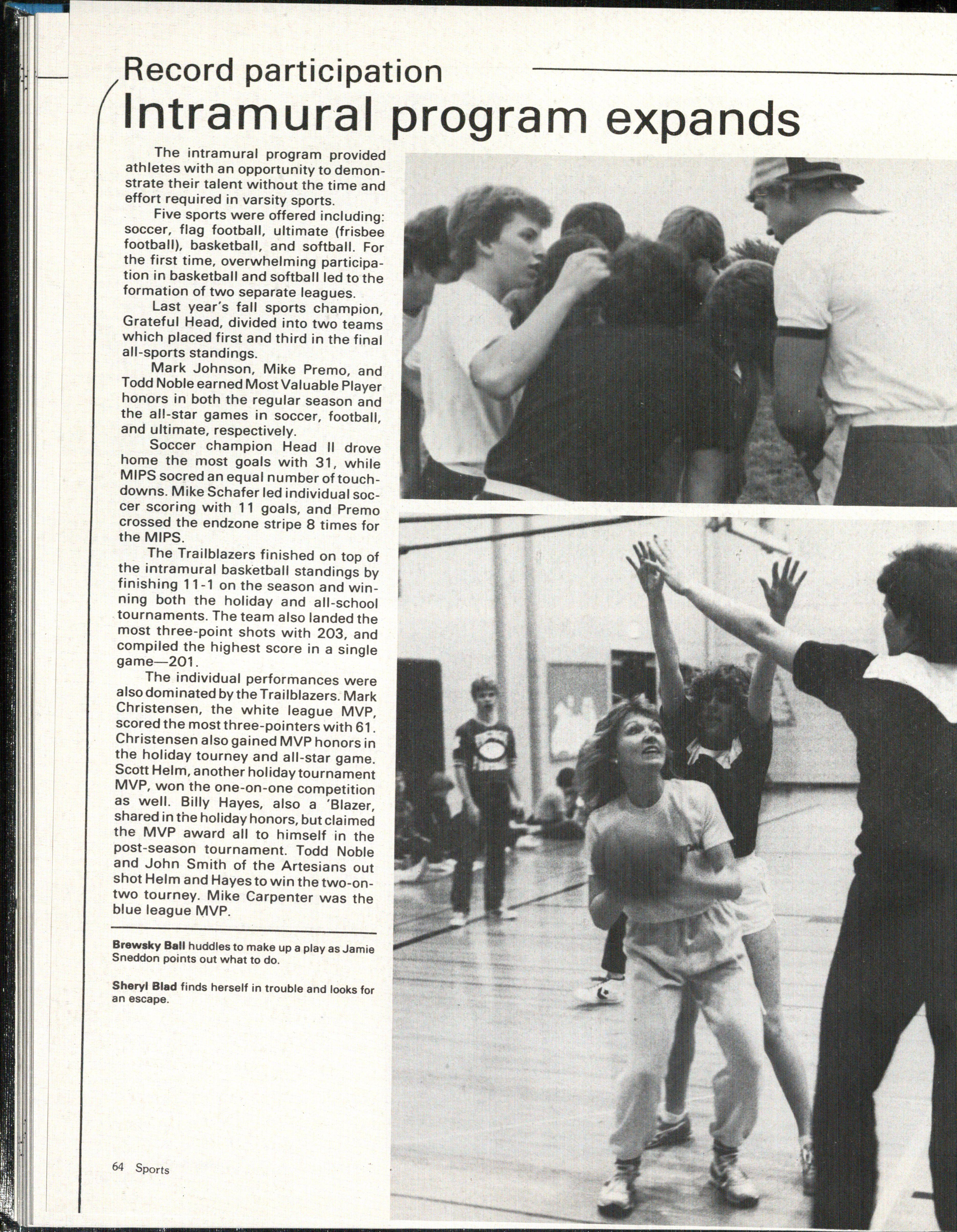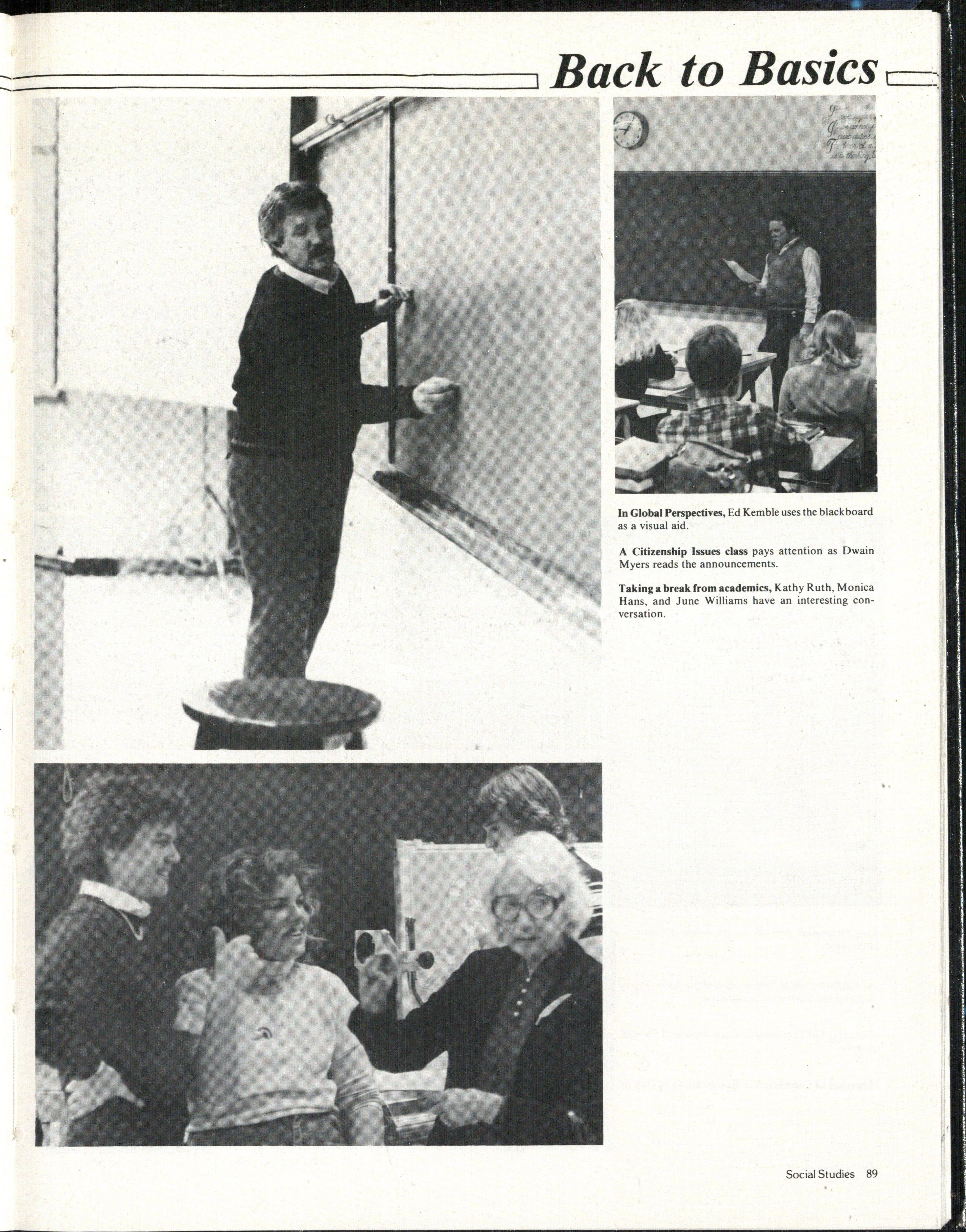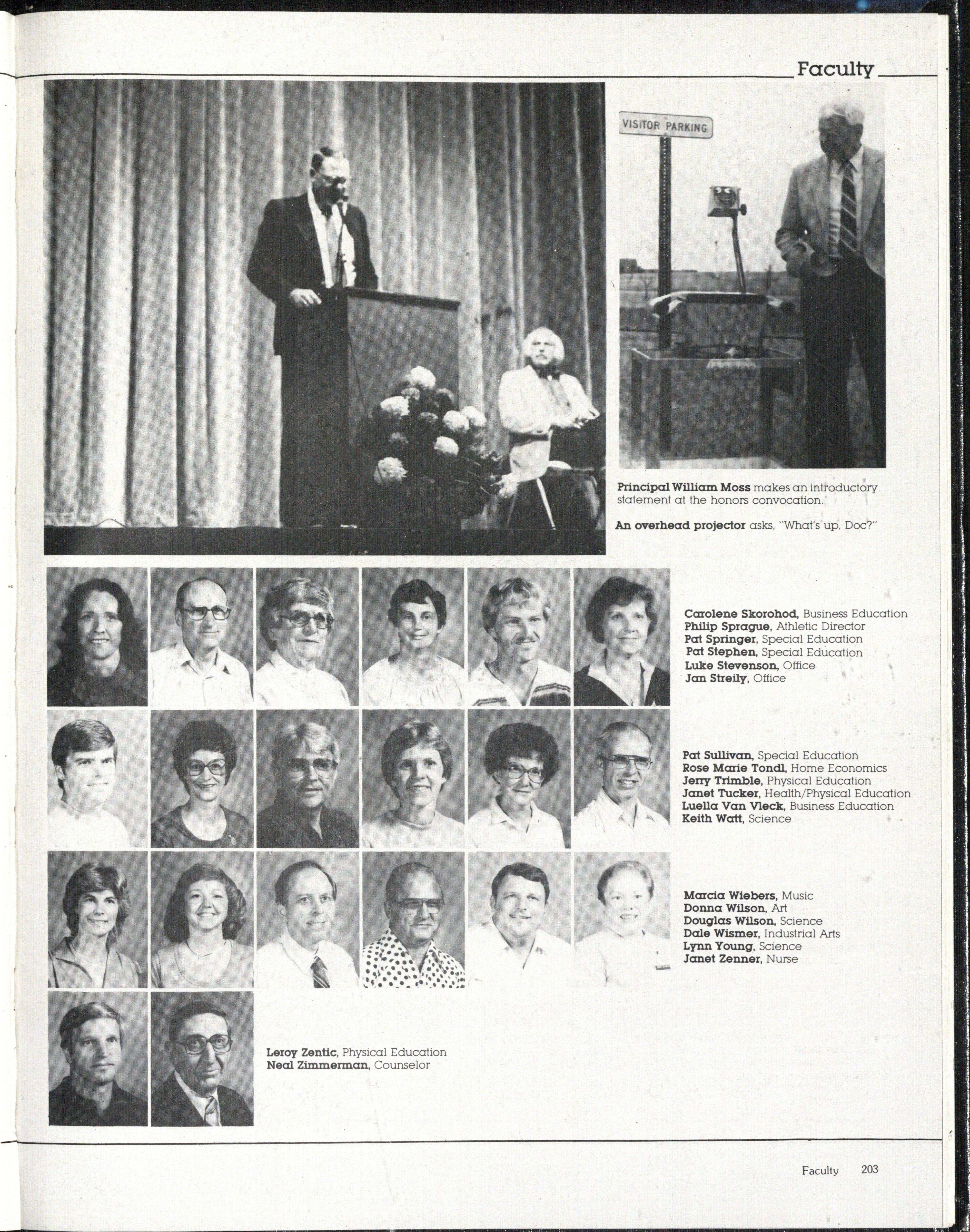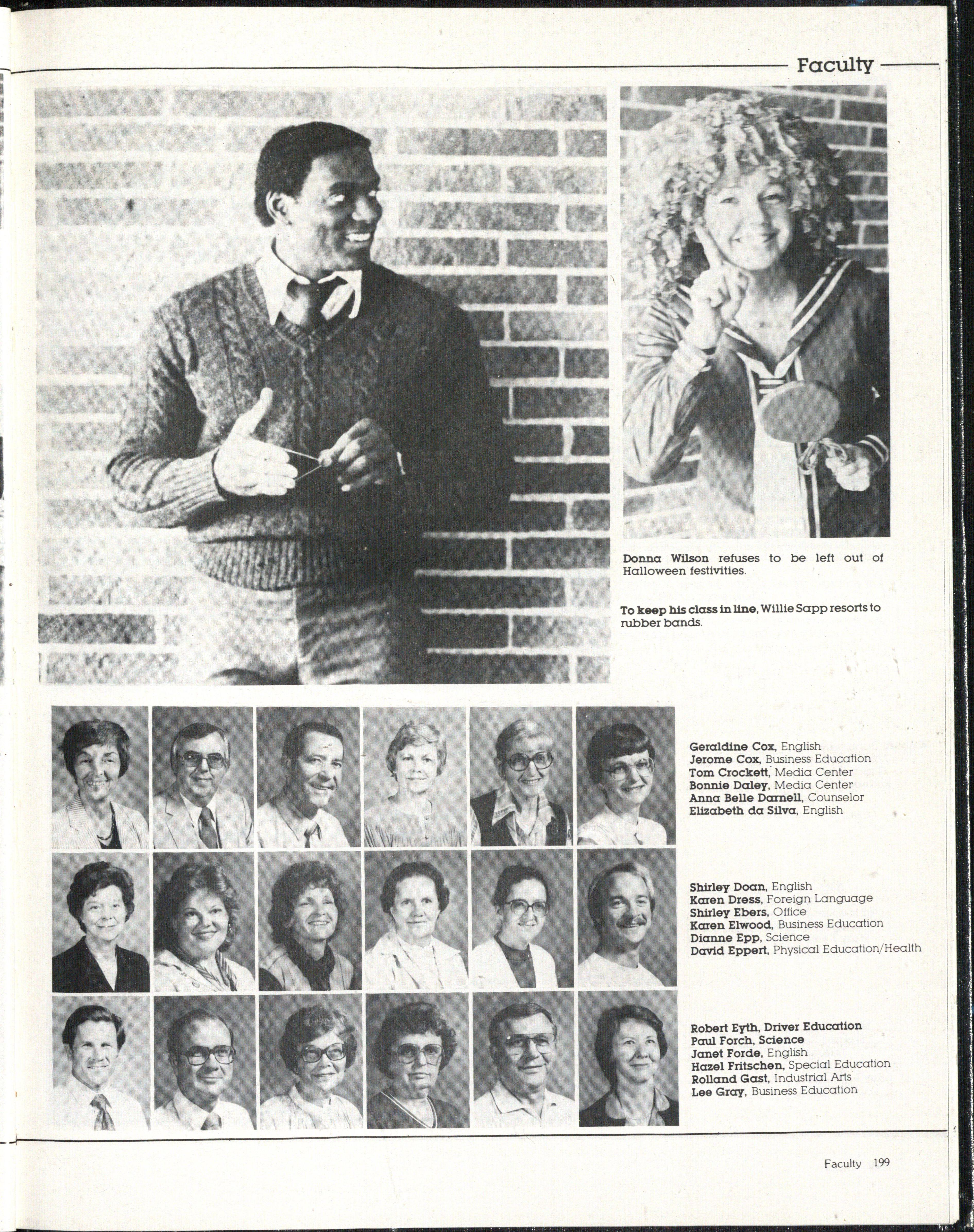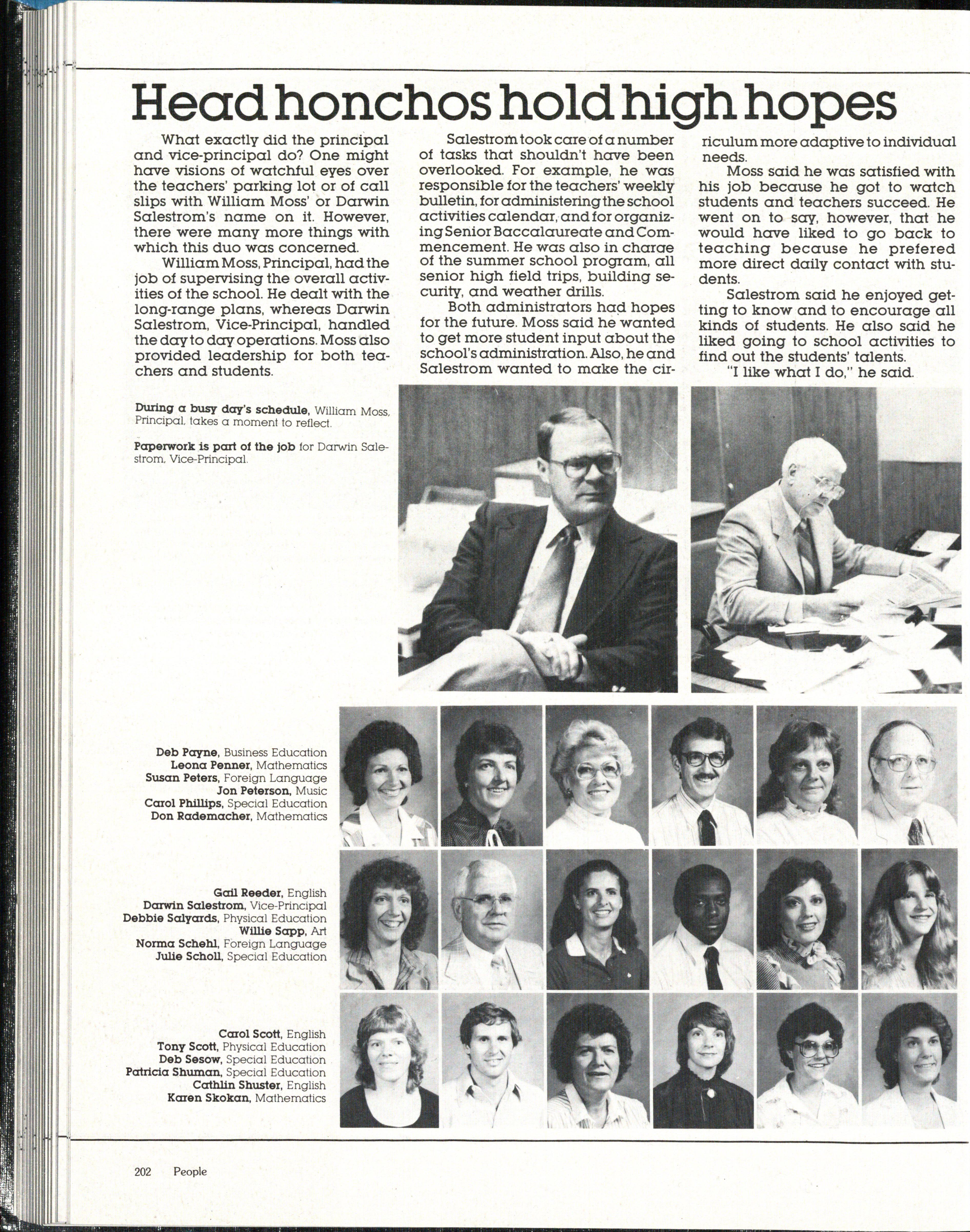 The clippings and reviews of '82-'83 reflected a successful booking. The season brought numerous state championships in sports as well as other activities. Highlights of the year included a "snow day" when school was cancelled, record highs in February which encouraged shorts, a football game played in a thunderstorm, the Punk-Funk Dance, classes held during a blackout, Johnny's Lounge (a new hang-