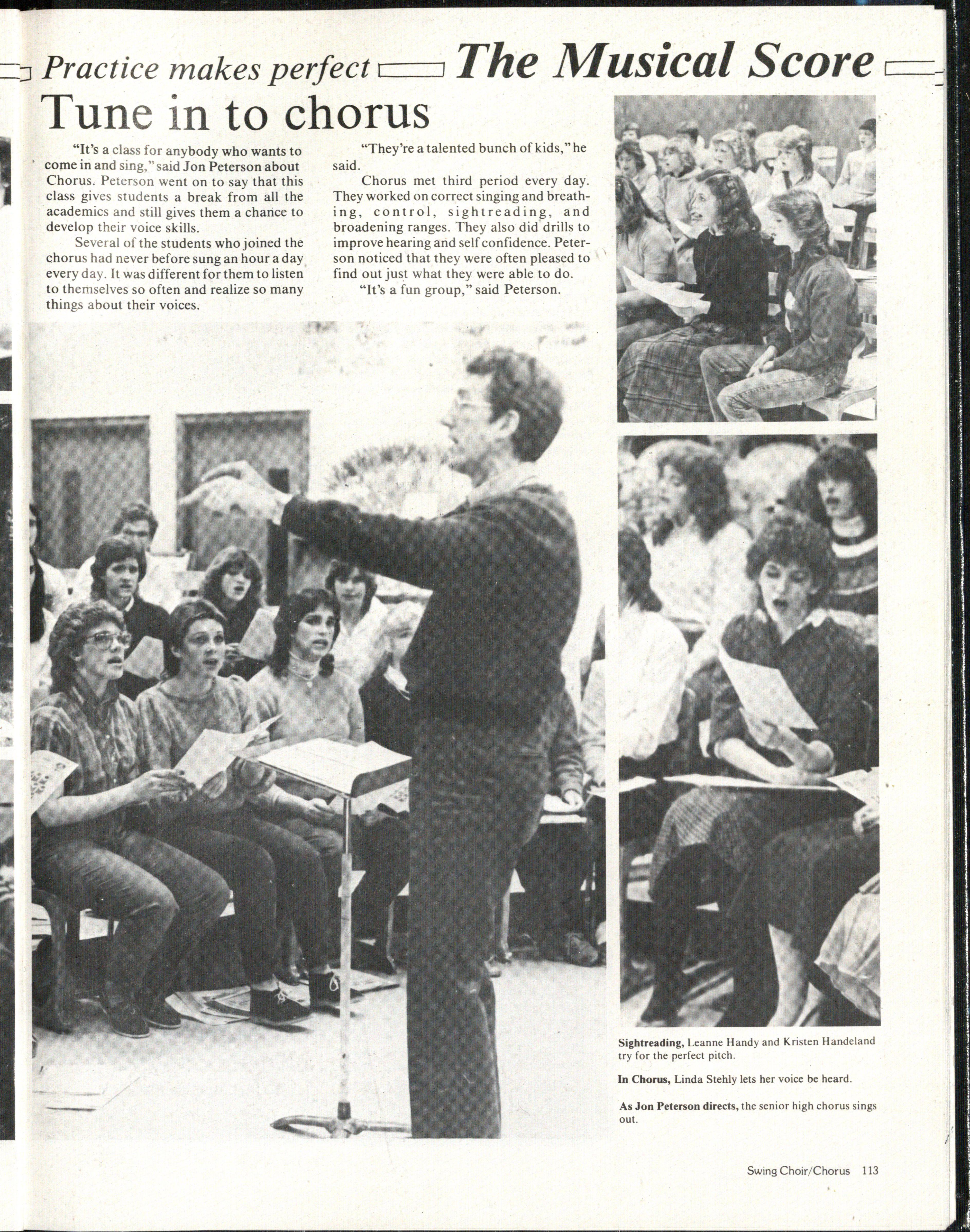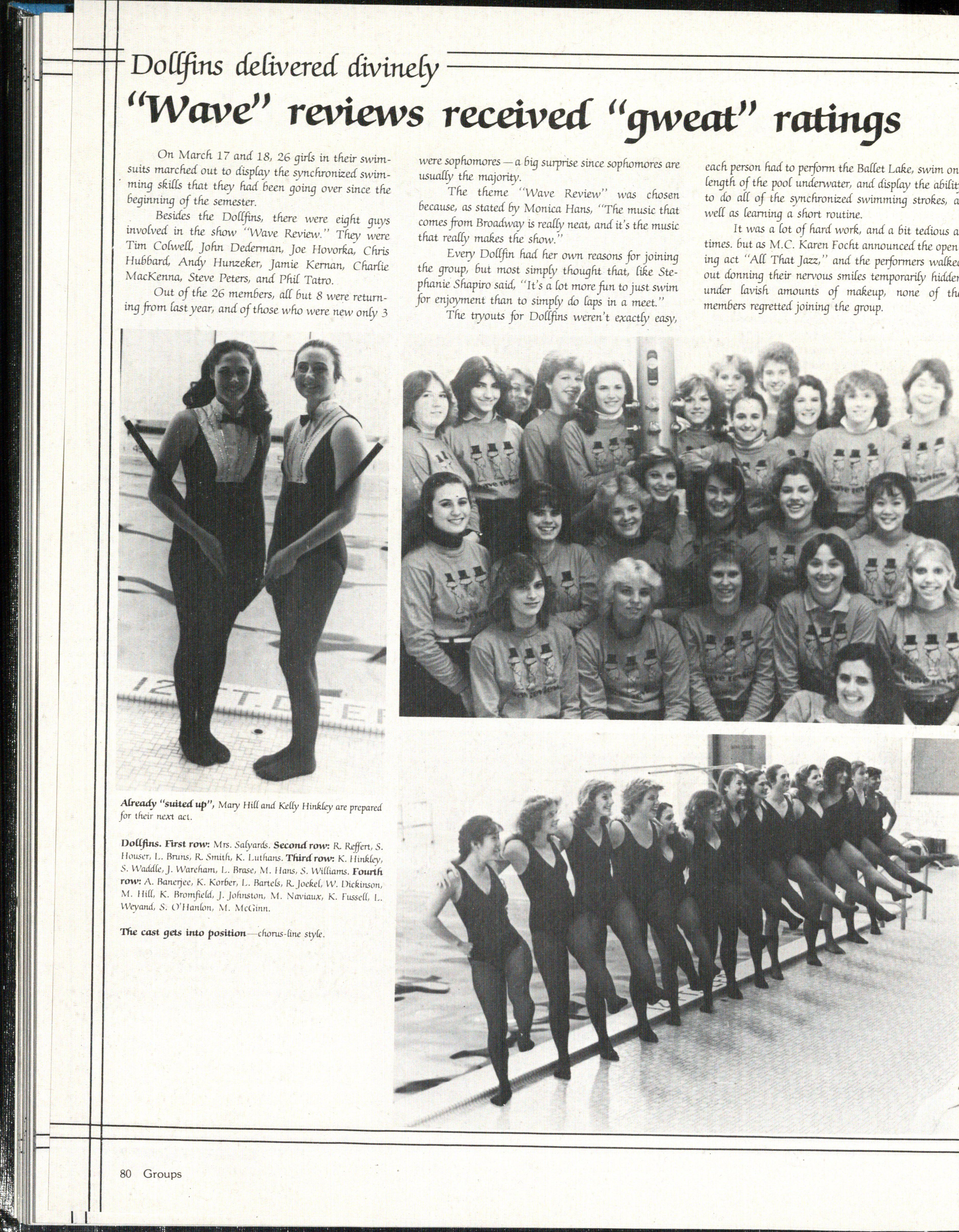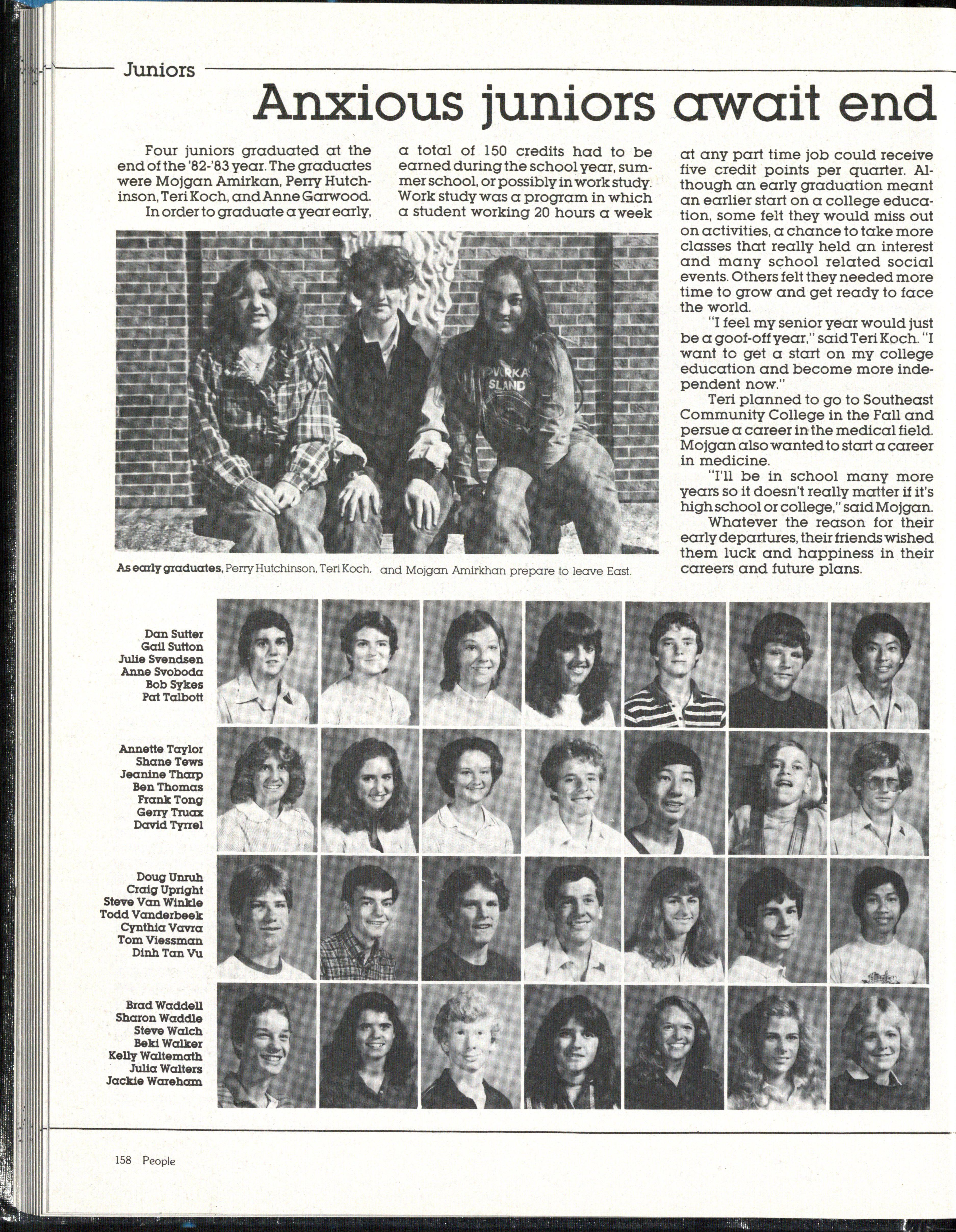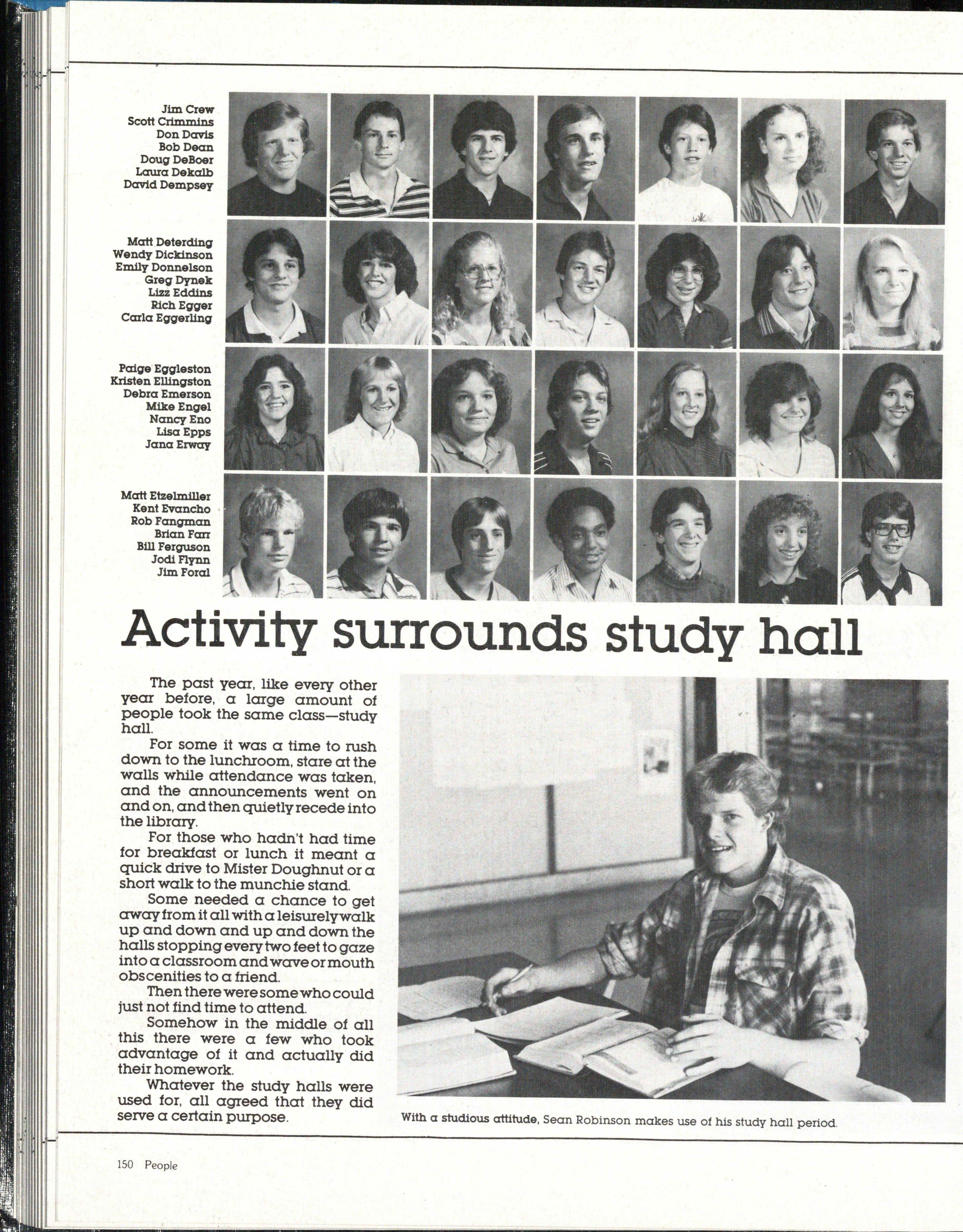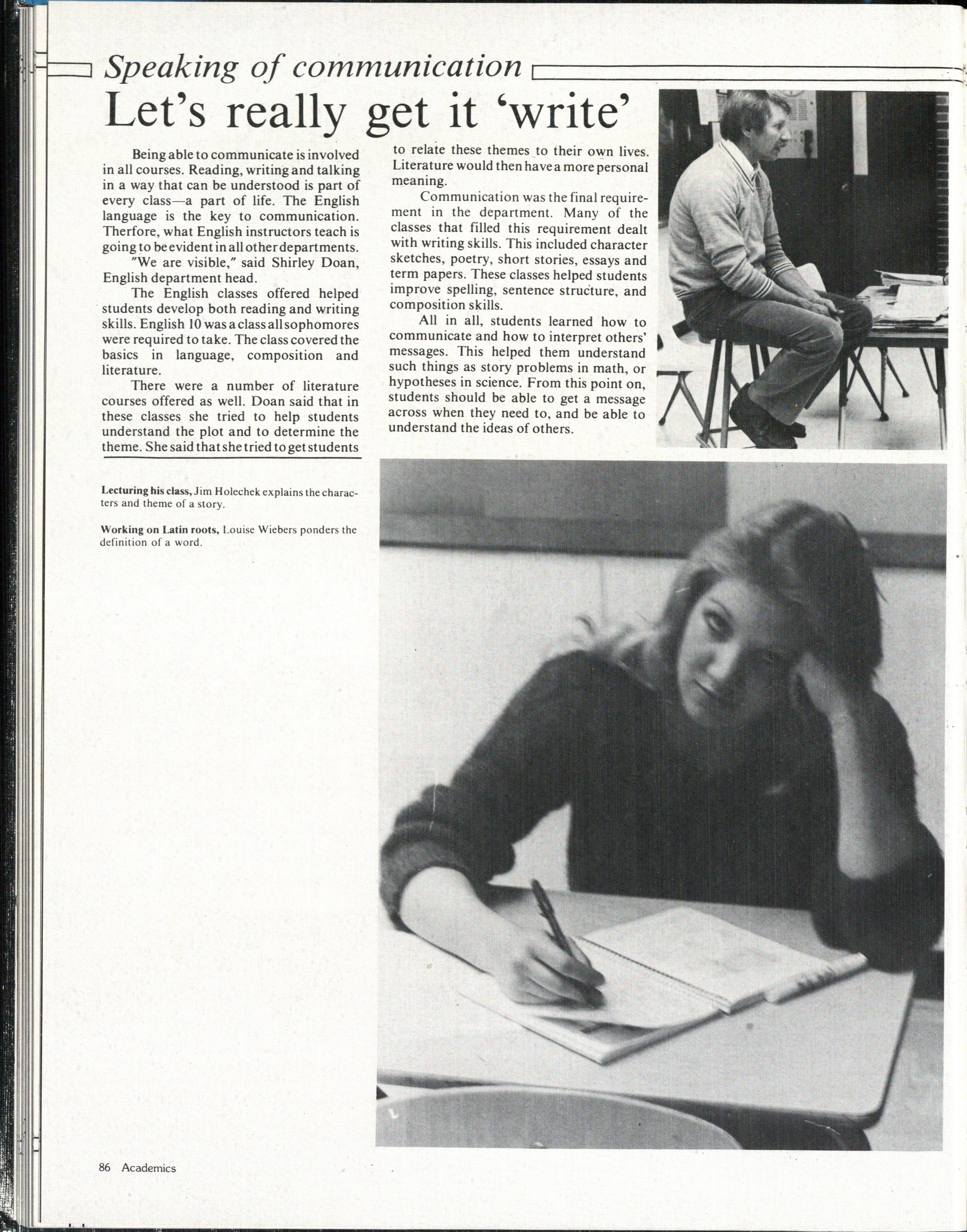 The clippings and reviews of '82-'83 reflected a successful booking. The season brought numerous state championships in sports as well as other activities. Highlights of the year included a "snow day" when school was cancelled, record highs in February which encouraged shorts, a football game played in a thunderstorm, the Punk-Funk Dance, classes held during a blackout, Johnny's Lounge (a new hang-