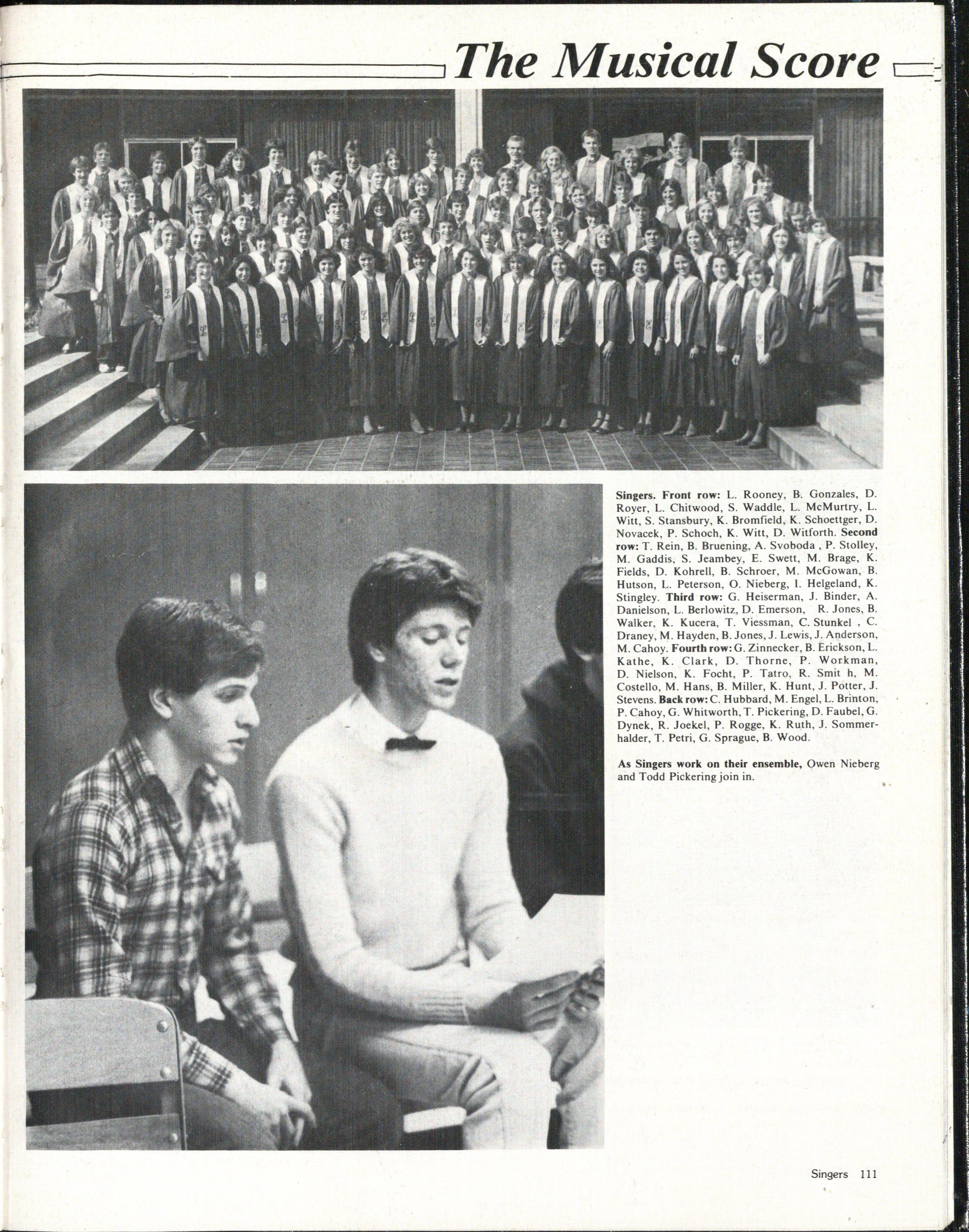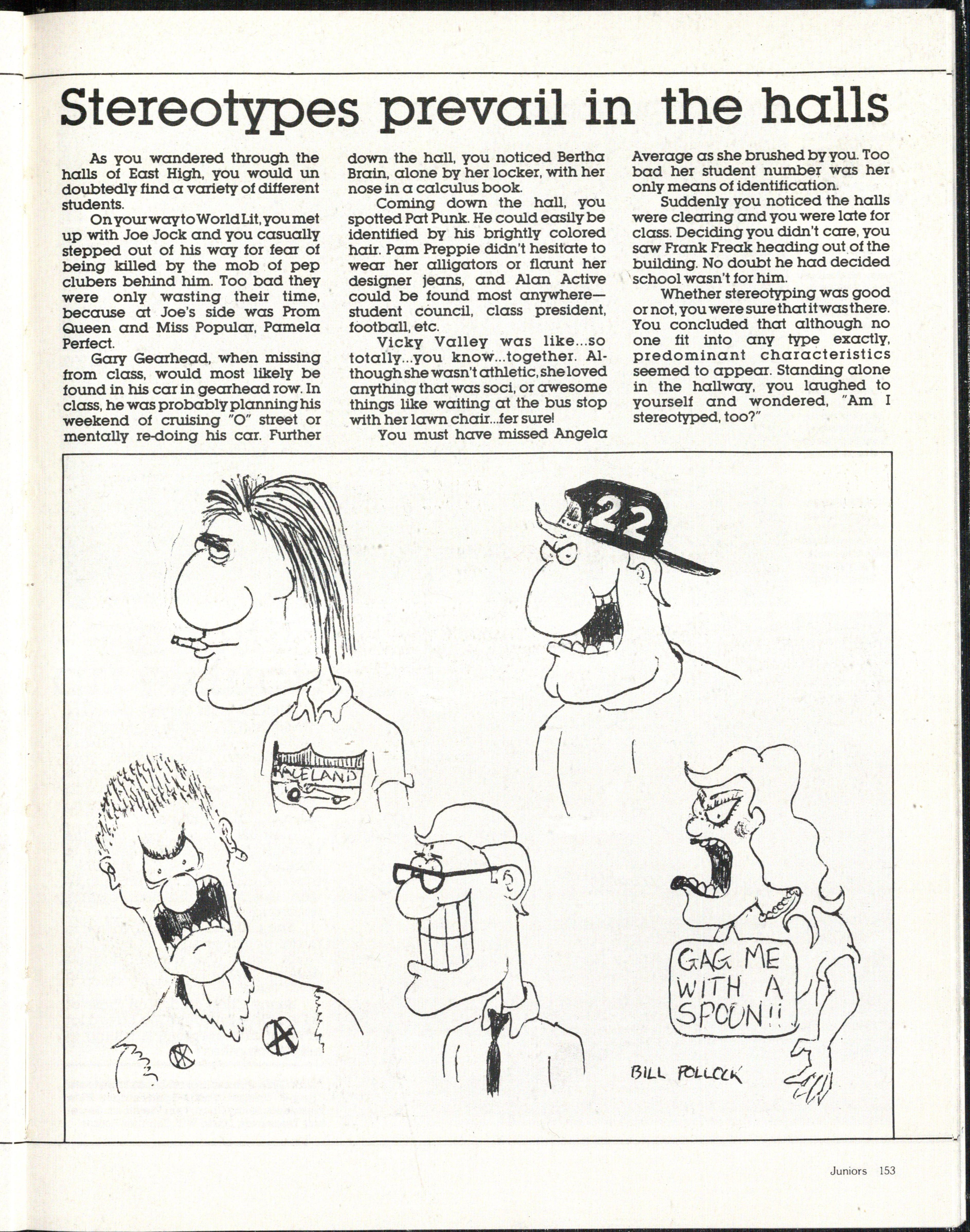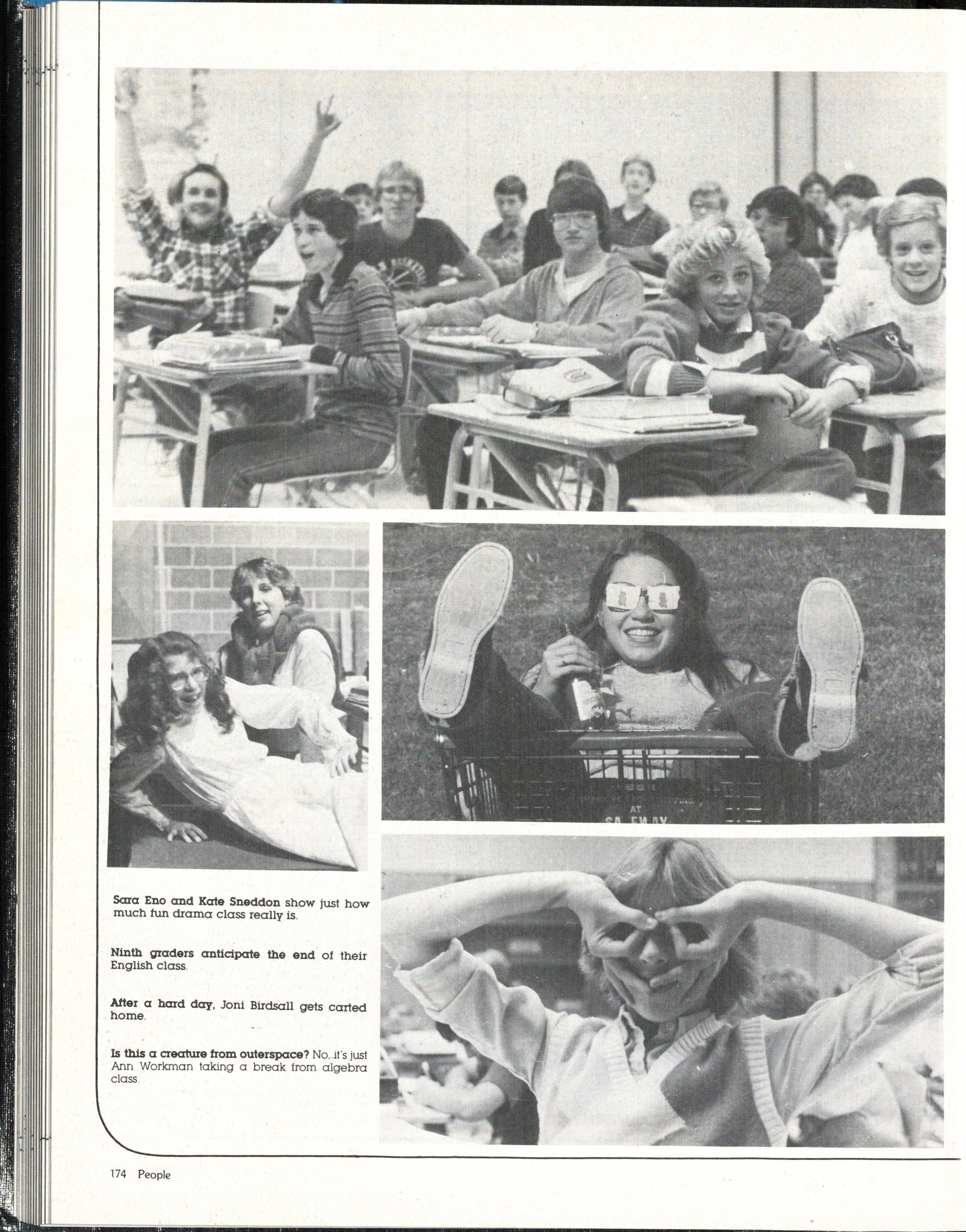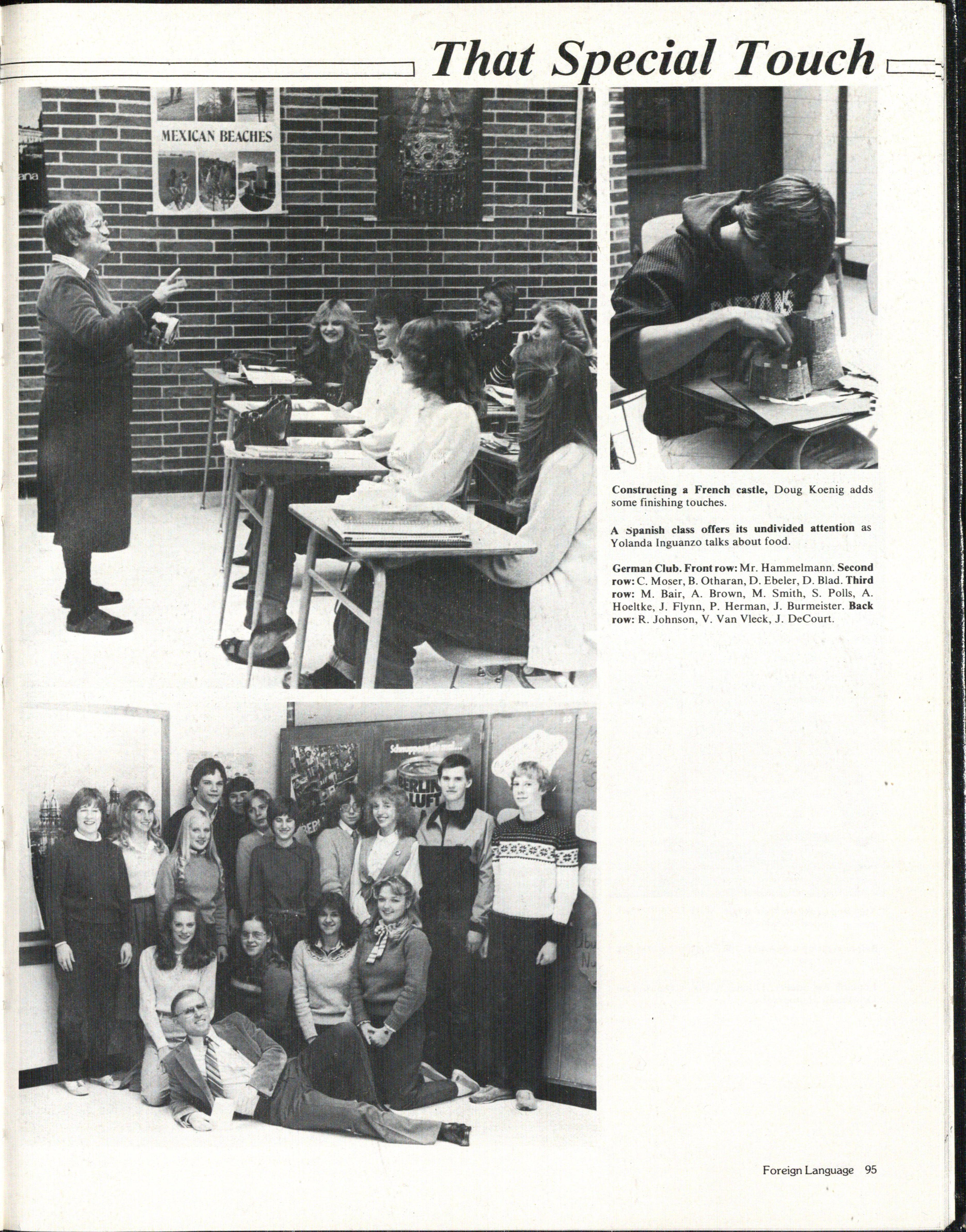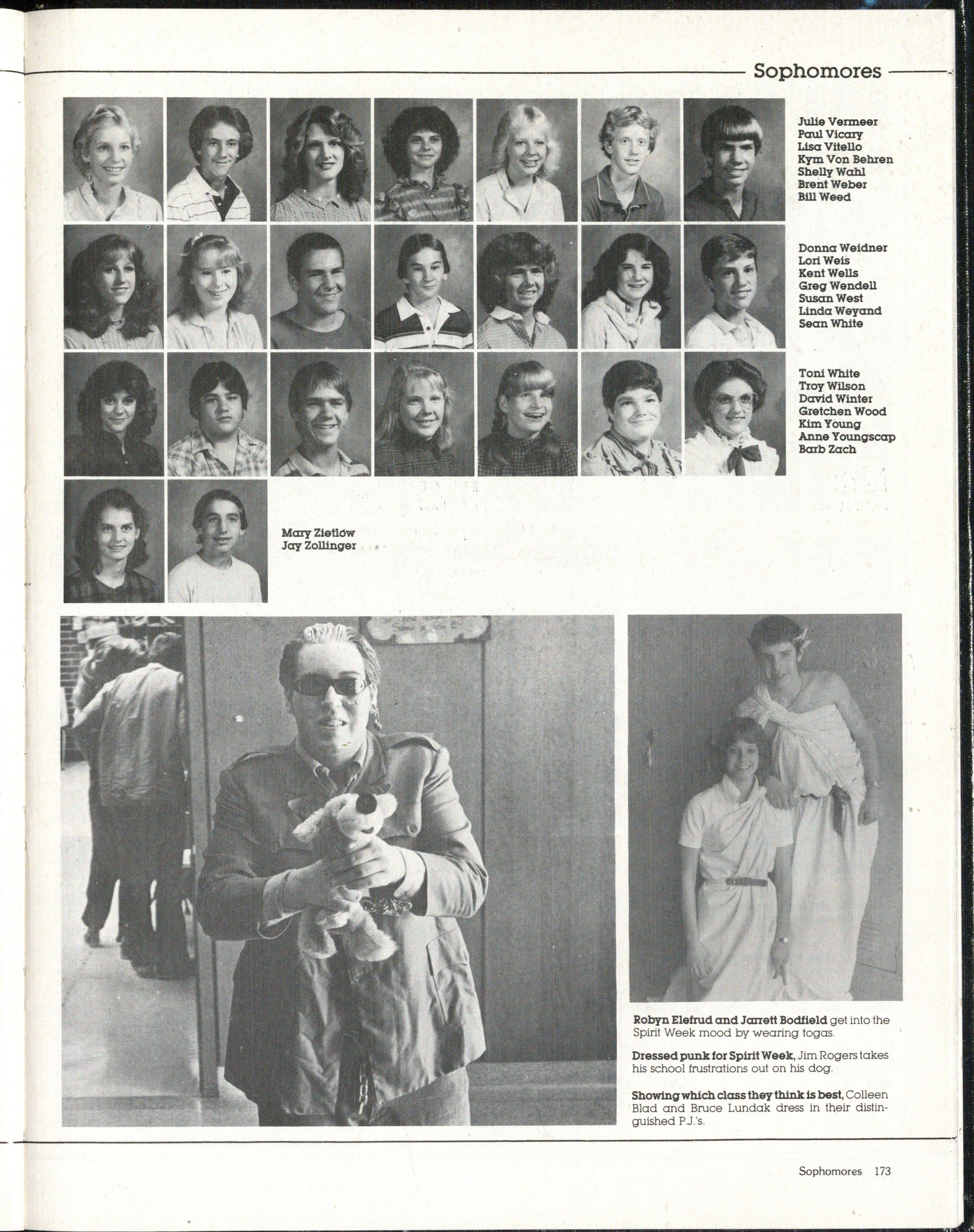 The clippings and reviews of '82-'83 reflected a successful booking. The season brought numerous state championships in sports as well as other activities. Highlights of the year included a "snow day" when school was cancelled, record highs in February which encouraged shorts, a football game played in a thunderstorm, the Punk-Funk Dance, classes held during a blackout, Johnny's Lounge (a new hang-