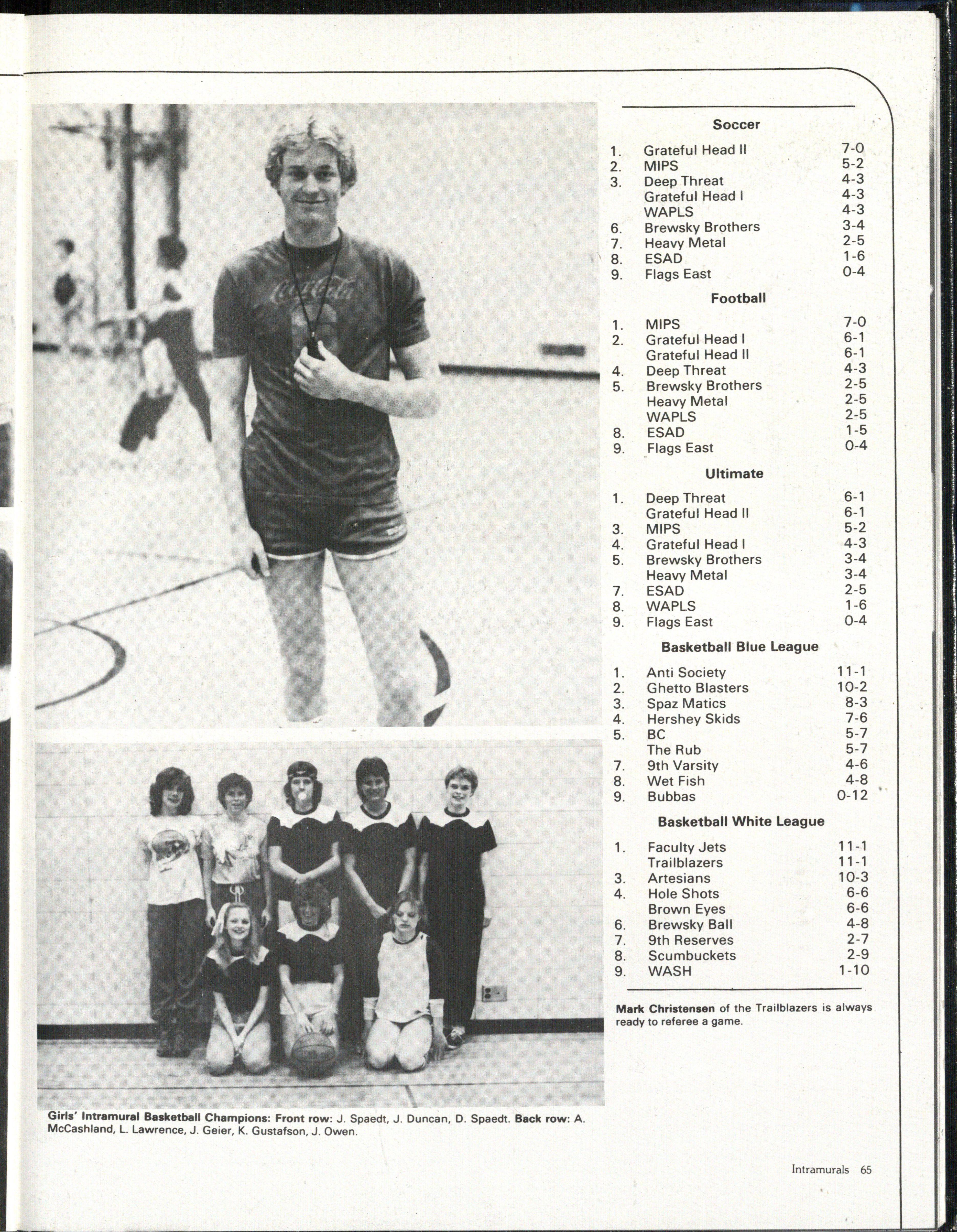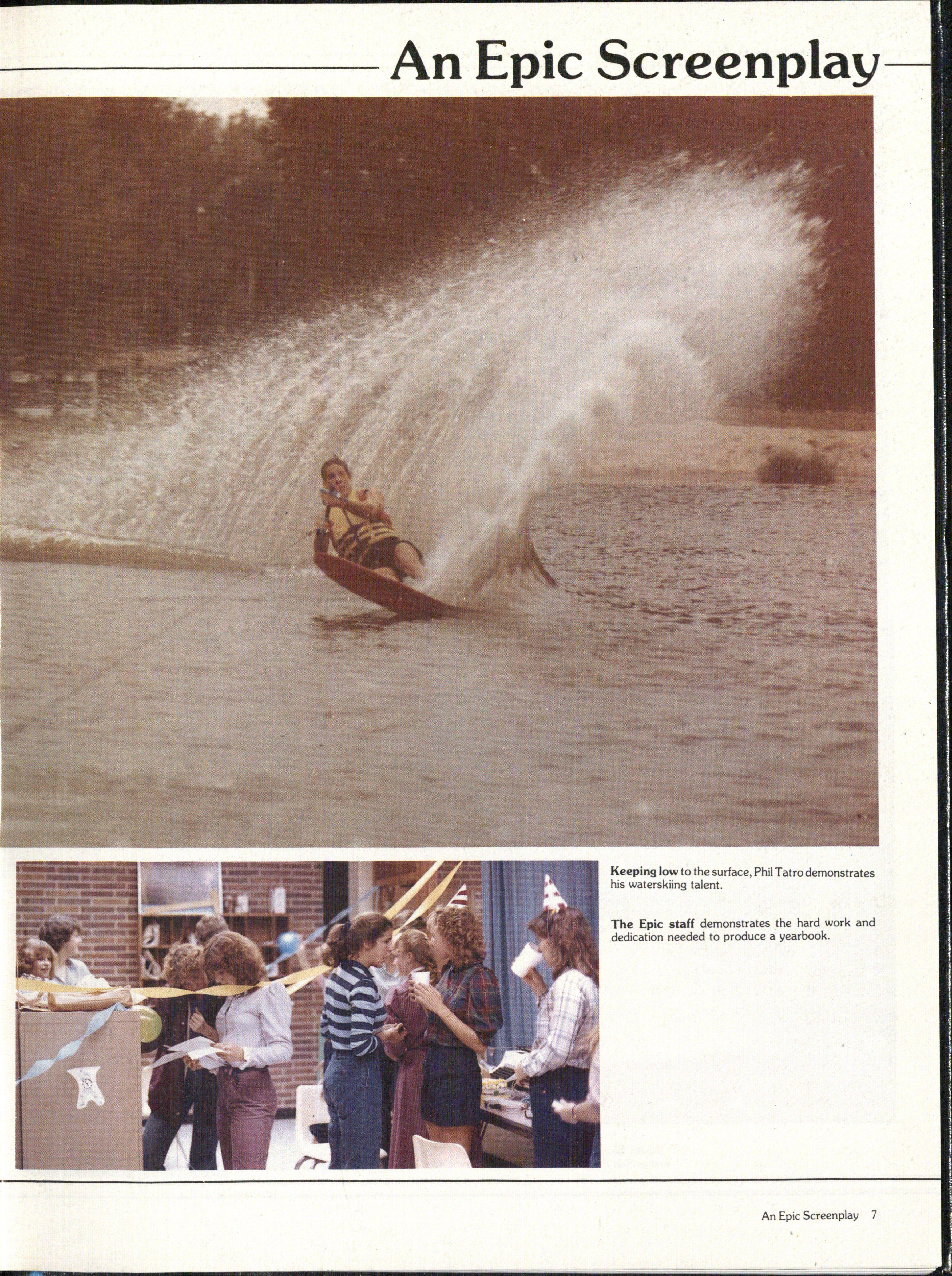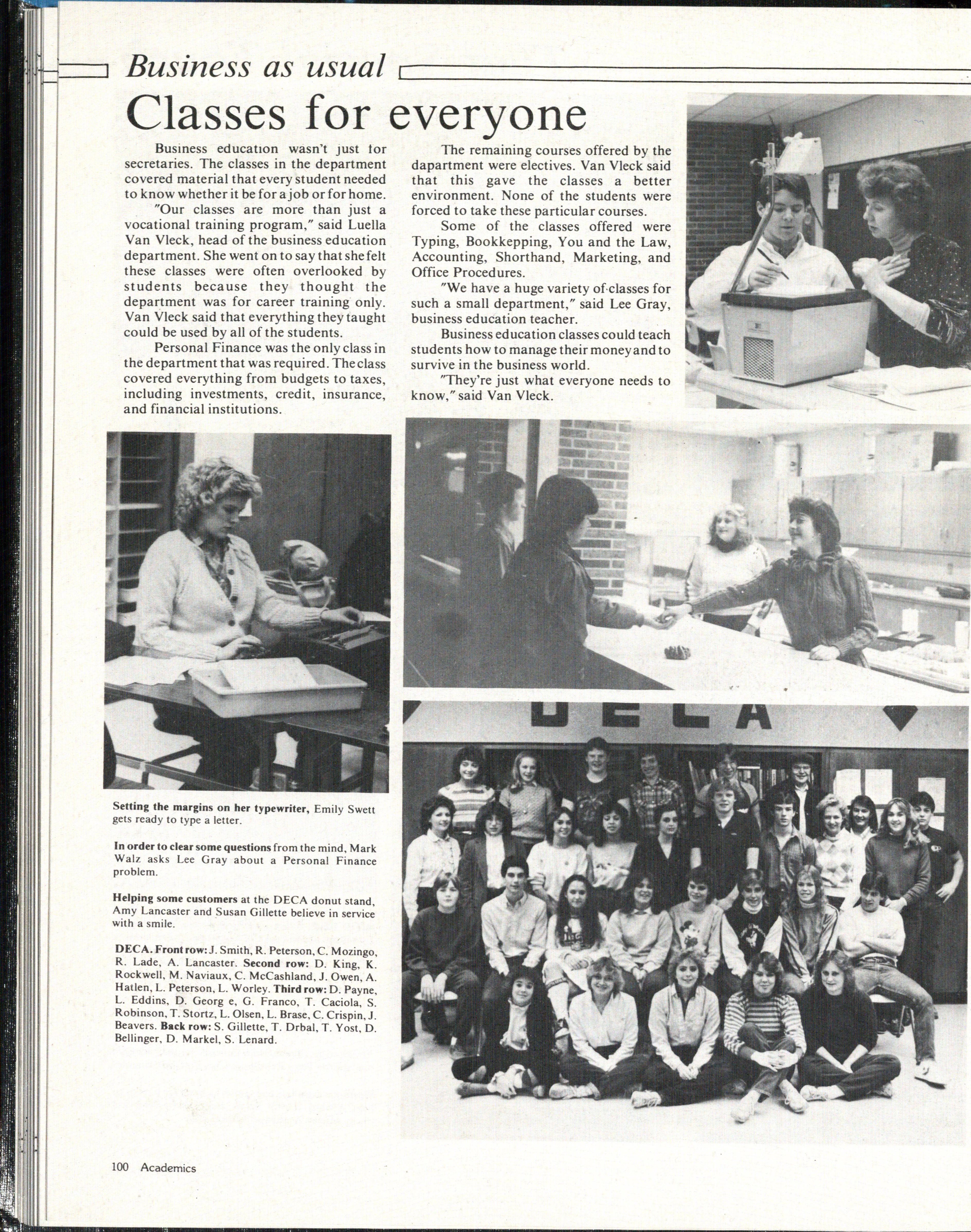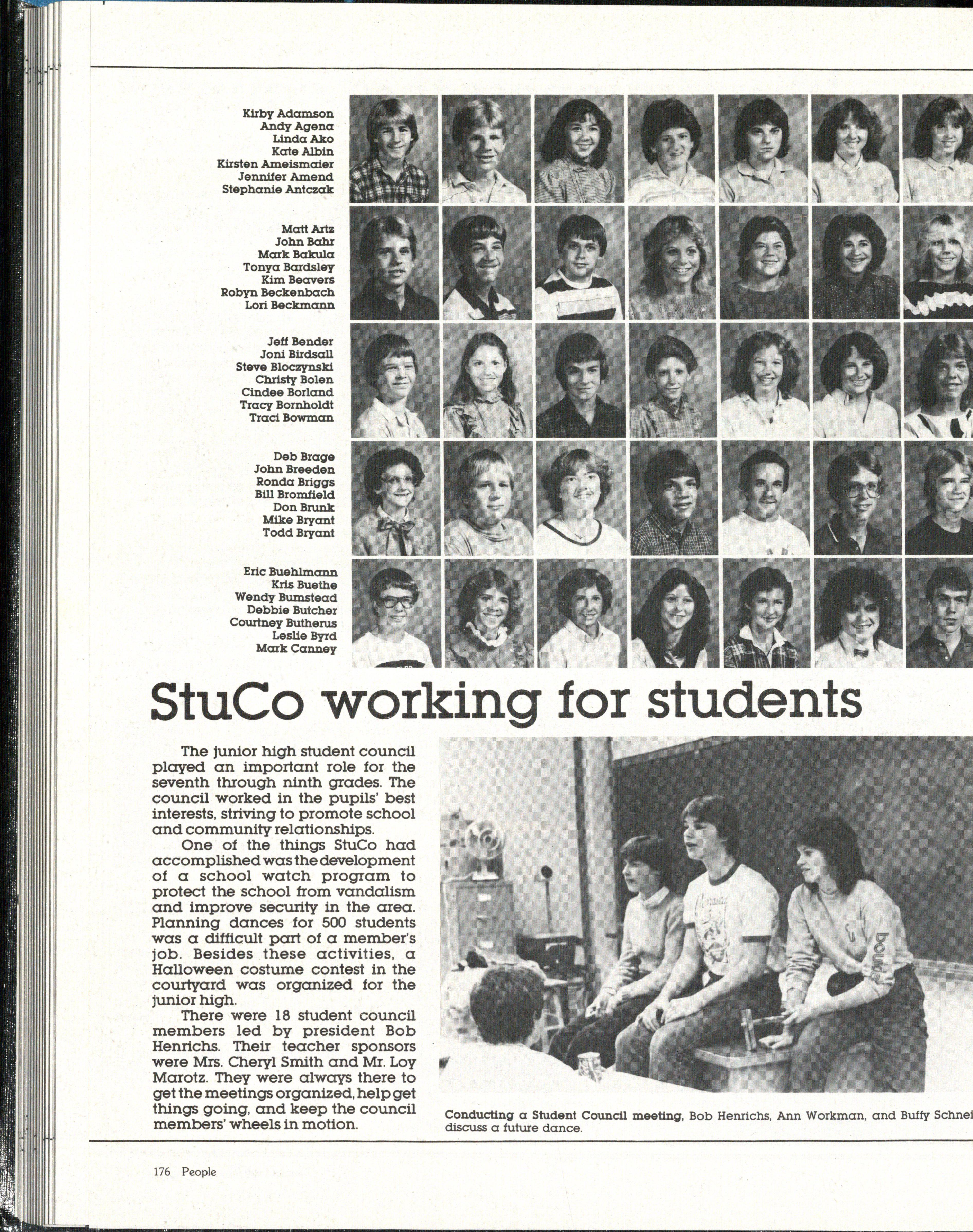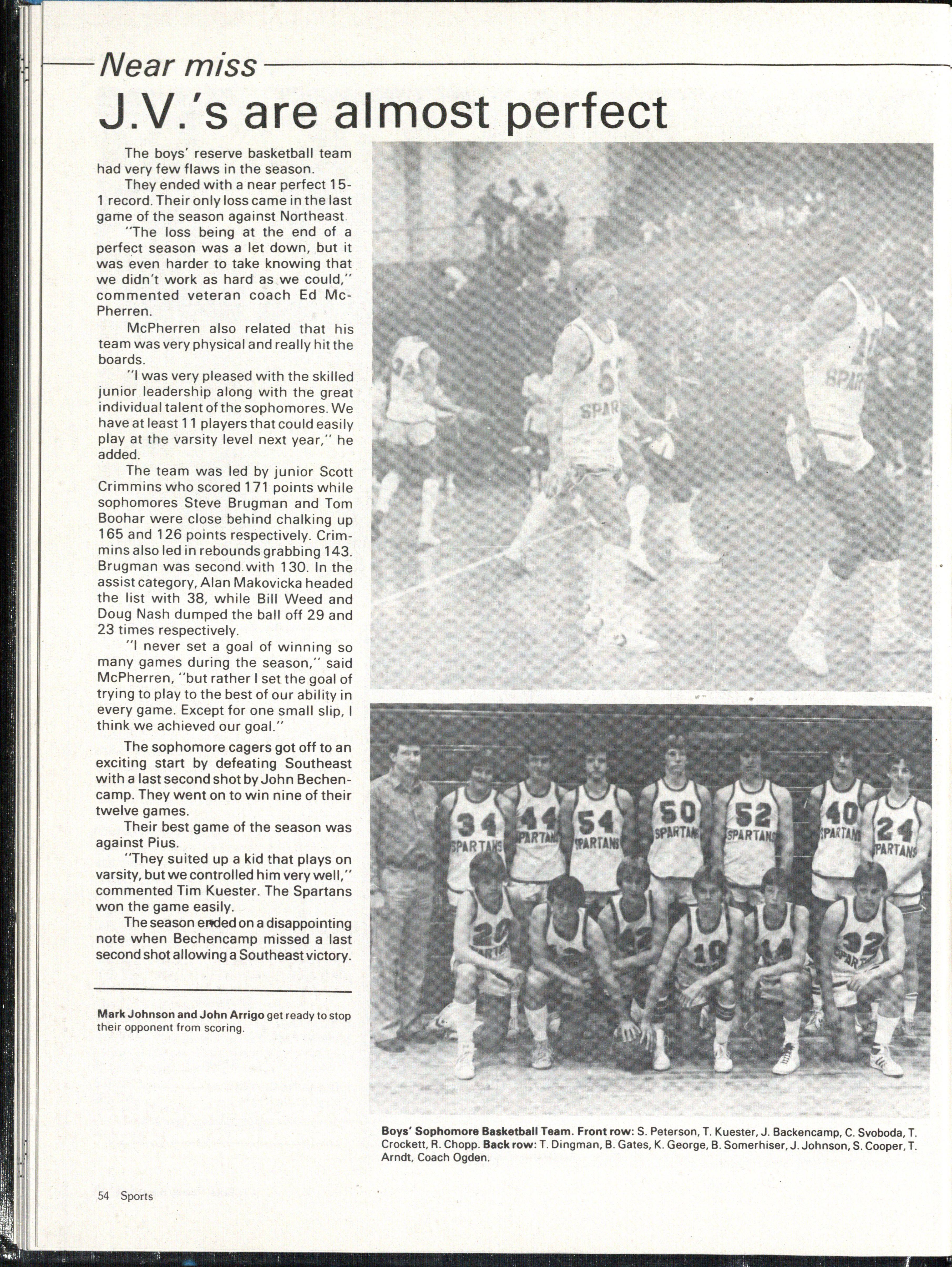 The clippings and reviews of '82-'83 reflected a successful booking. The season brought numerous state championships in sports as well as other activities. Highlights of the year included a "snow day" when school was cancelled, record highs in February which encouraged shorts, a football game played in a thunderstorm, the Punk-Funk Dance, classes held during a blackout, Johnny's Lounge (a new hang-
