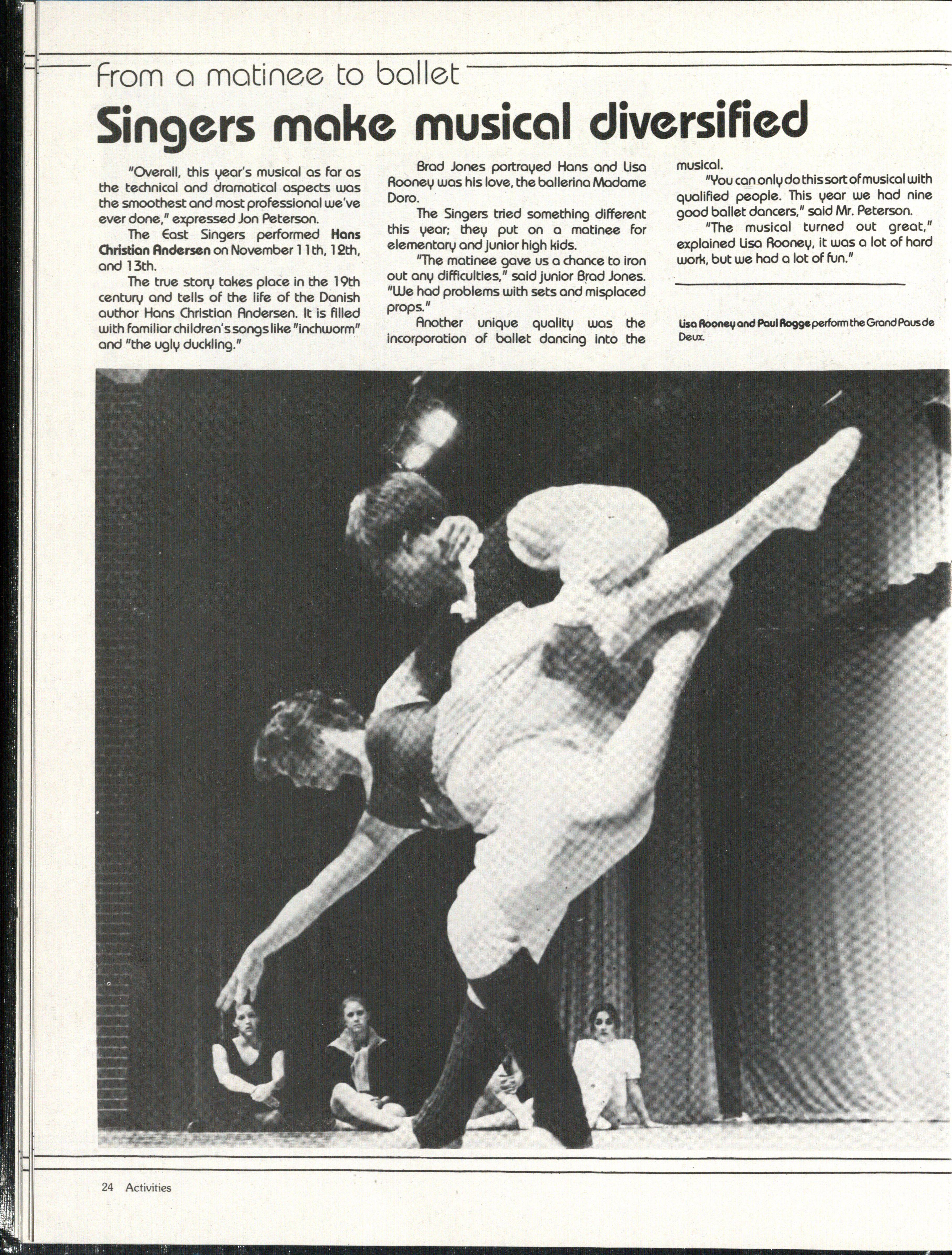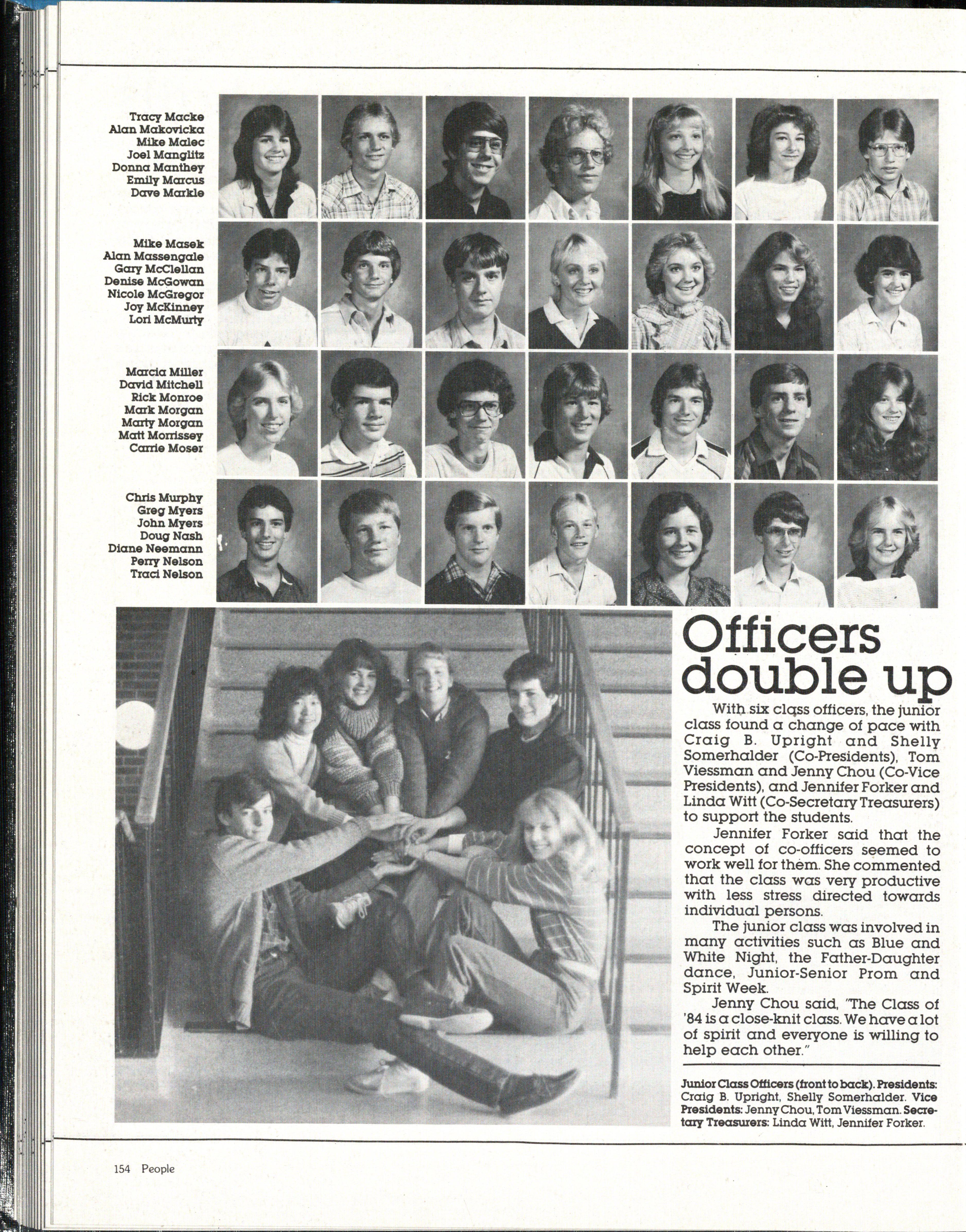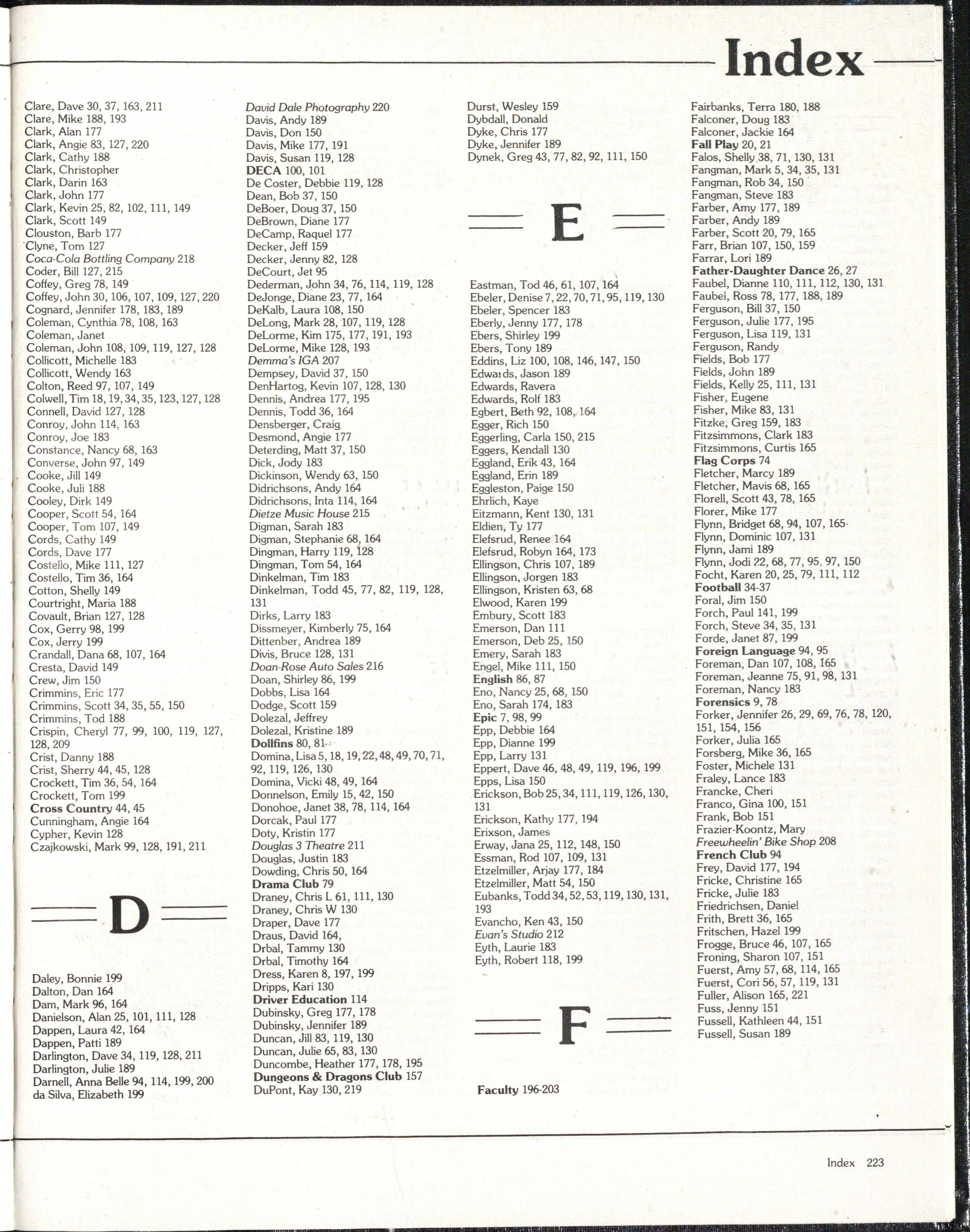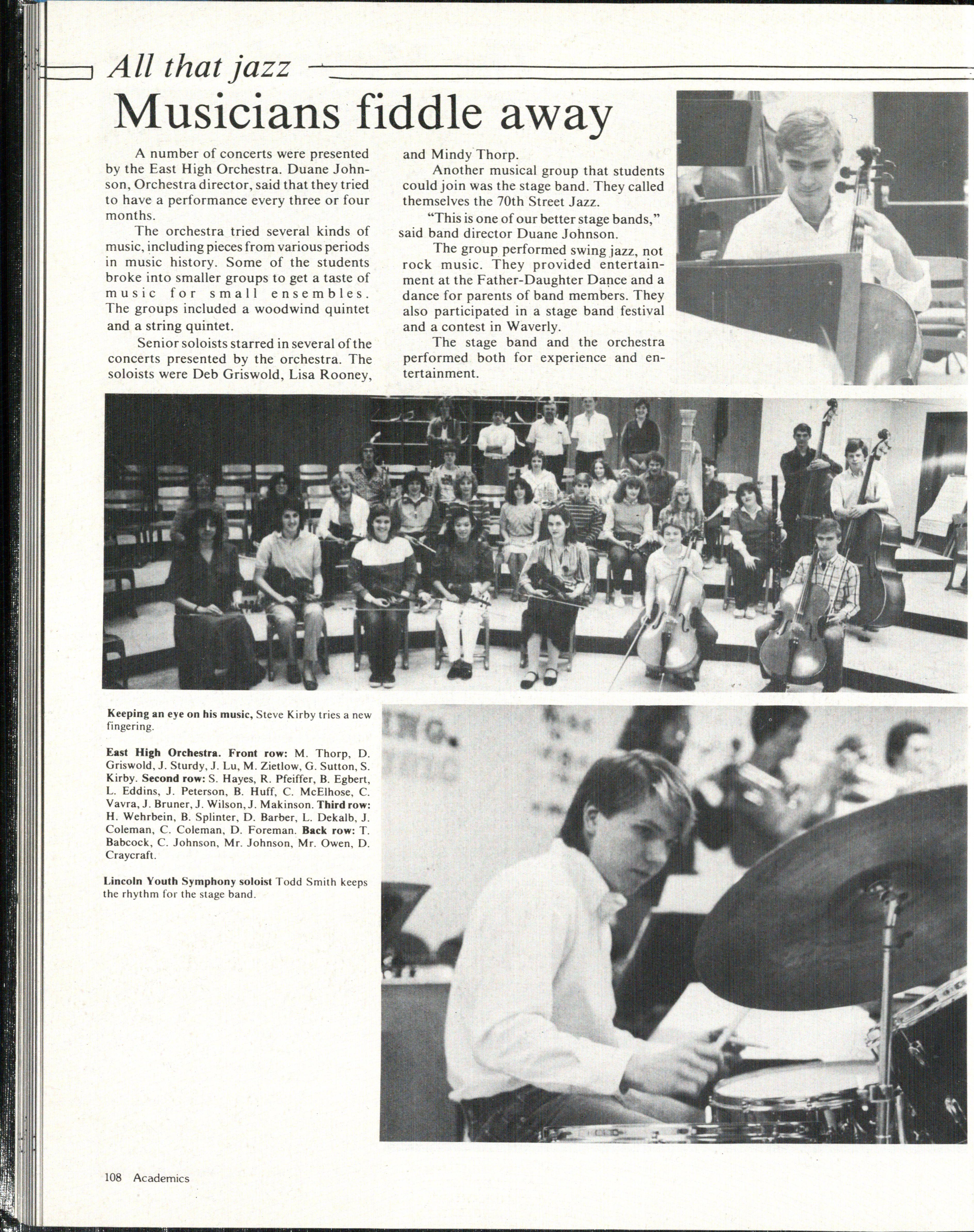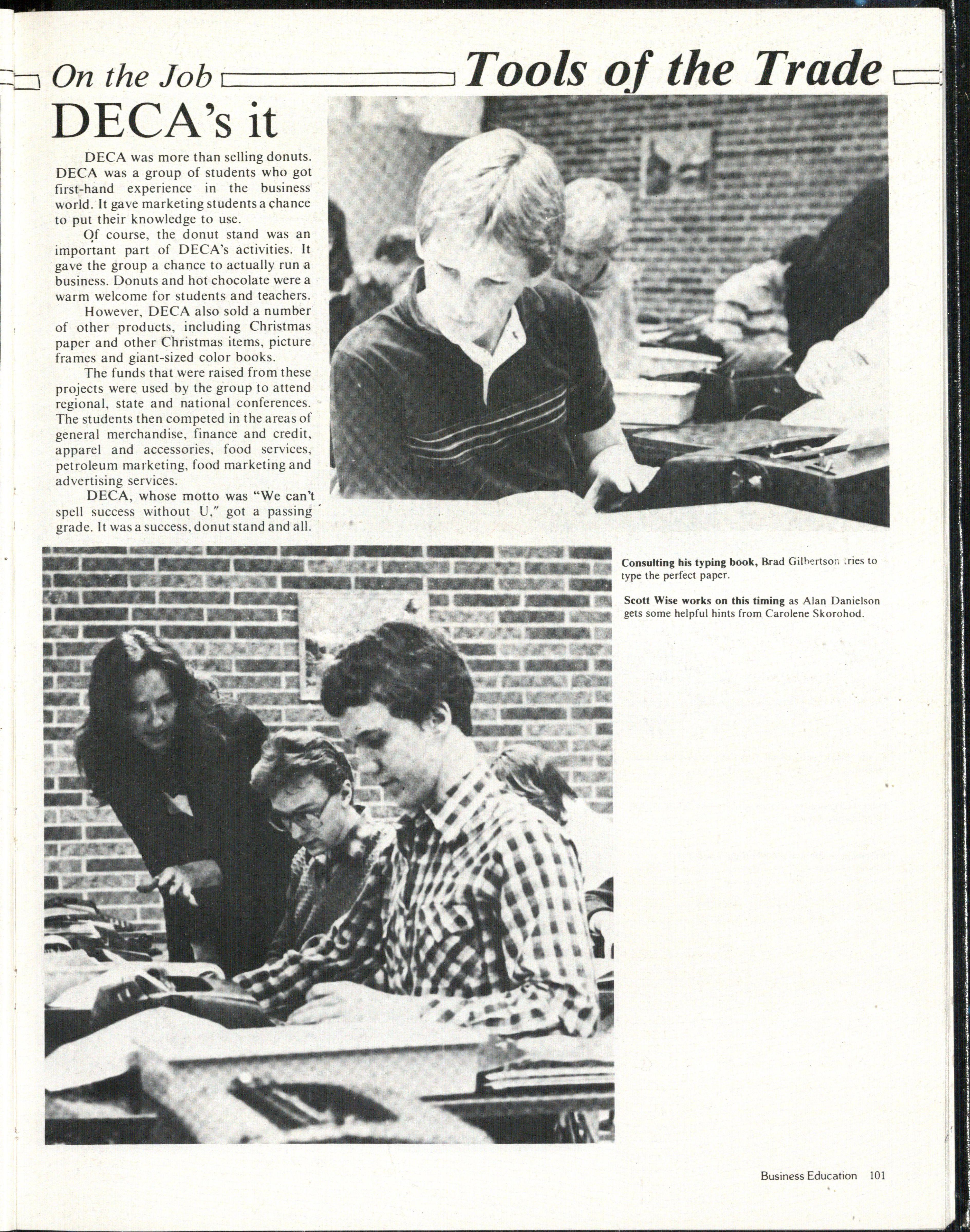 The clippings and reviews of '82-'83 reflected a successful booking. The season brought numerous state championships in sports as well as other activities. Highlights of the year included a "snow day" when school was cancelled, record highs in February which encouraged shorts, a football game played in a thunderstorm, the Punk-Funk Dance, classes held during a blackout, Johnny's Lounge (a new hang-