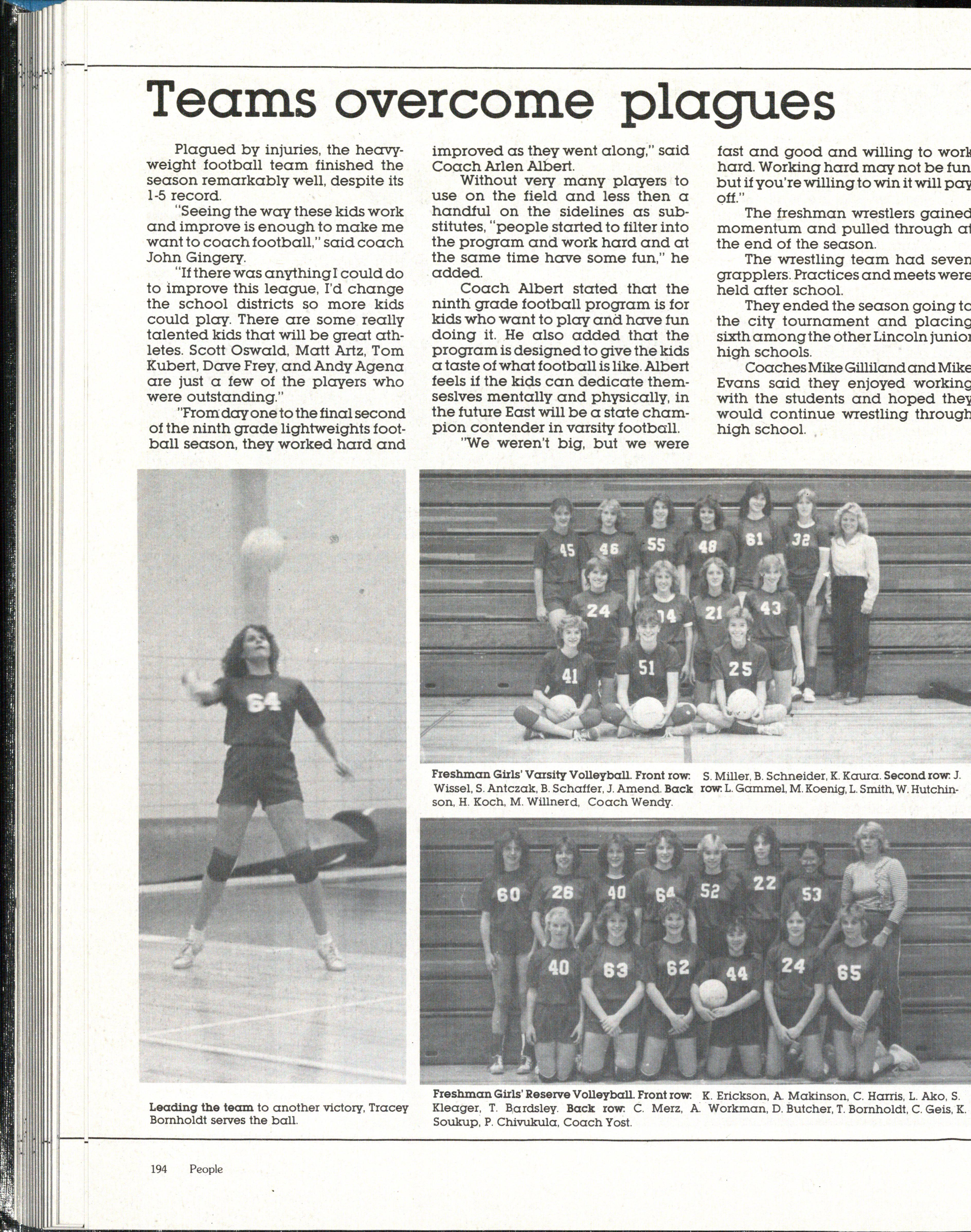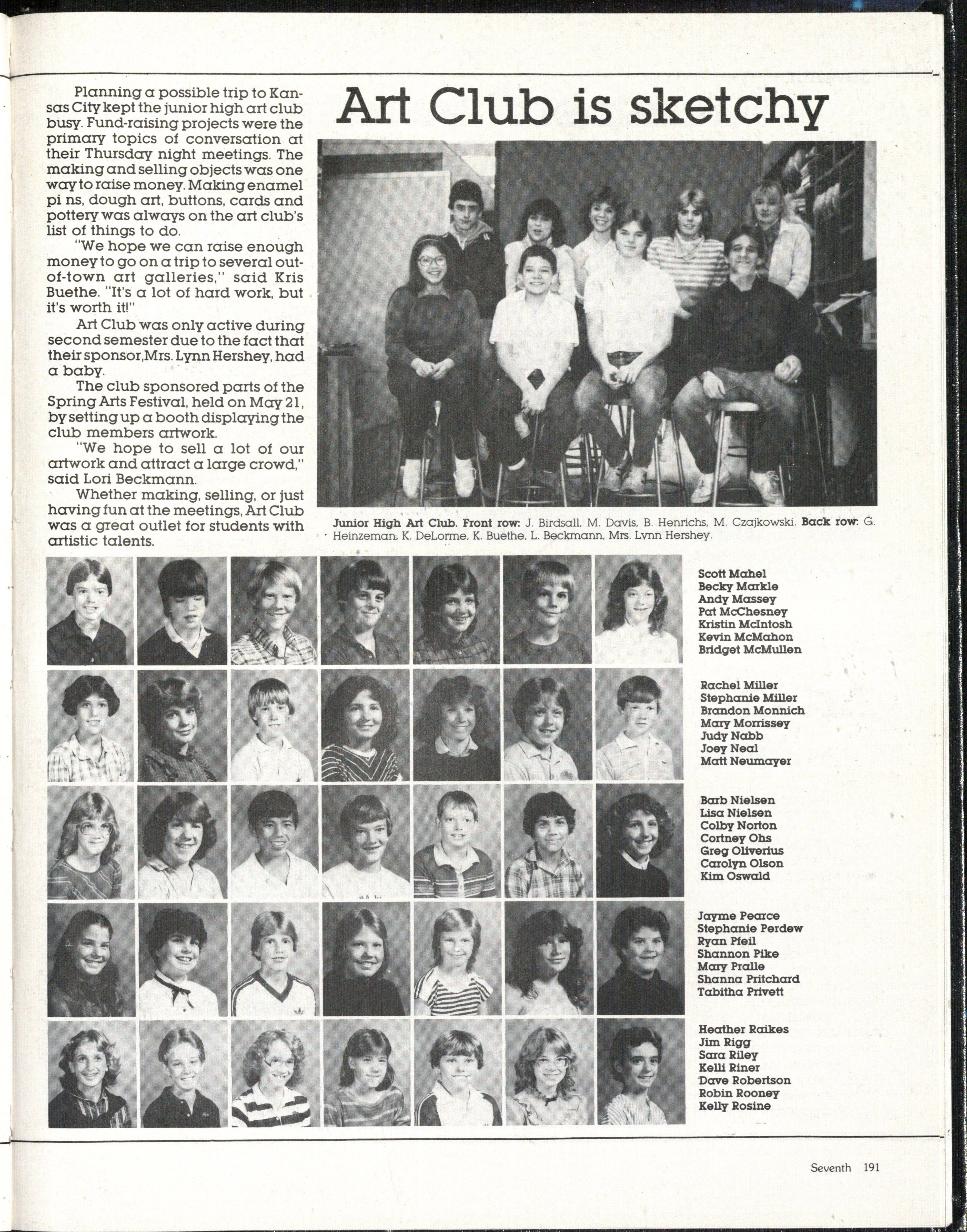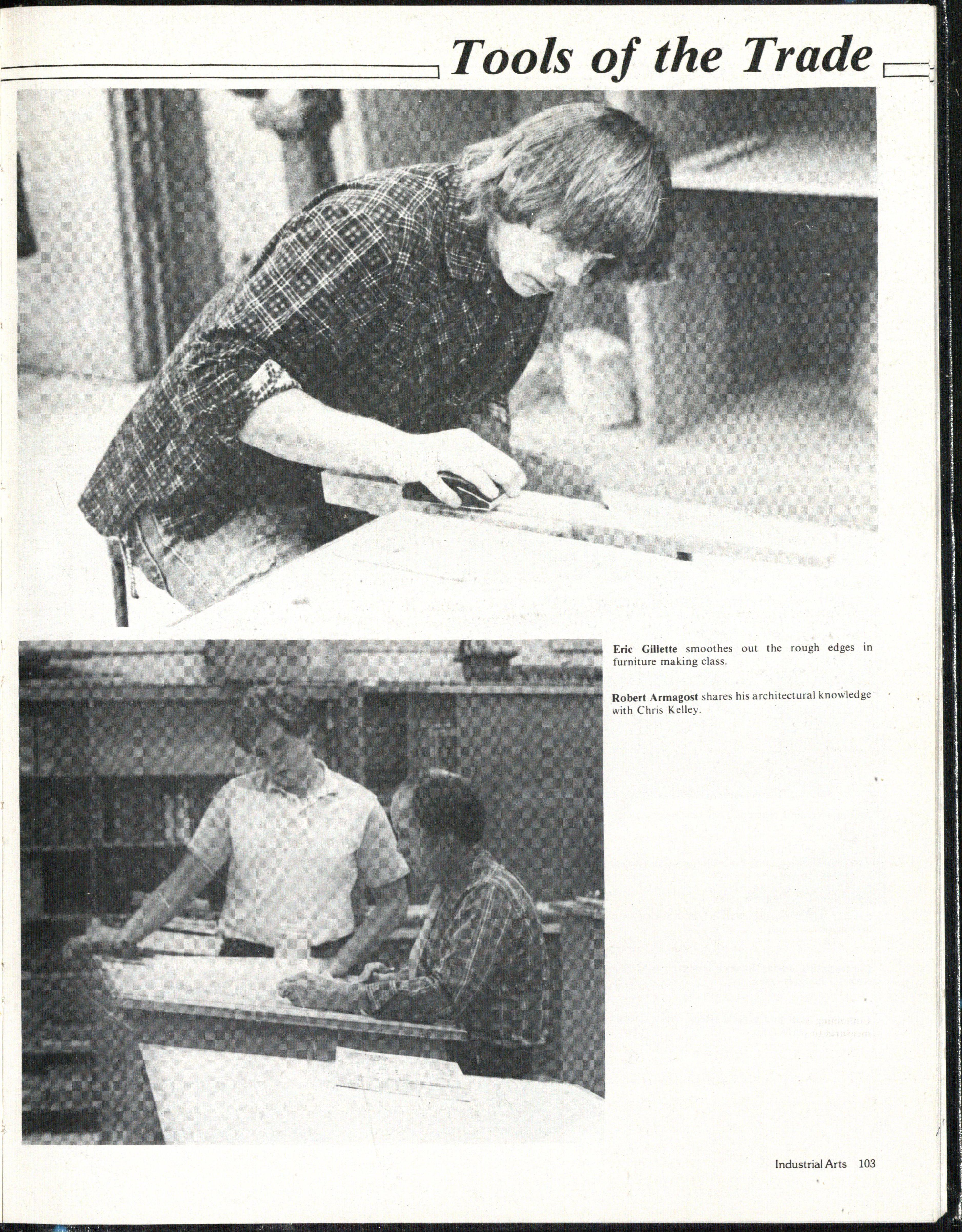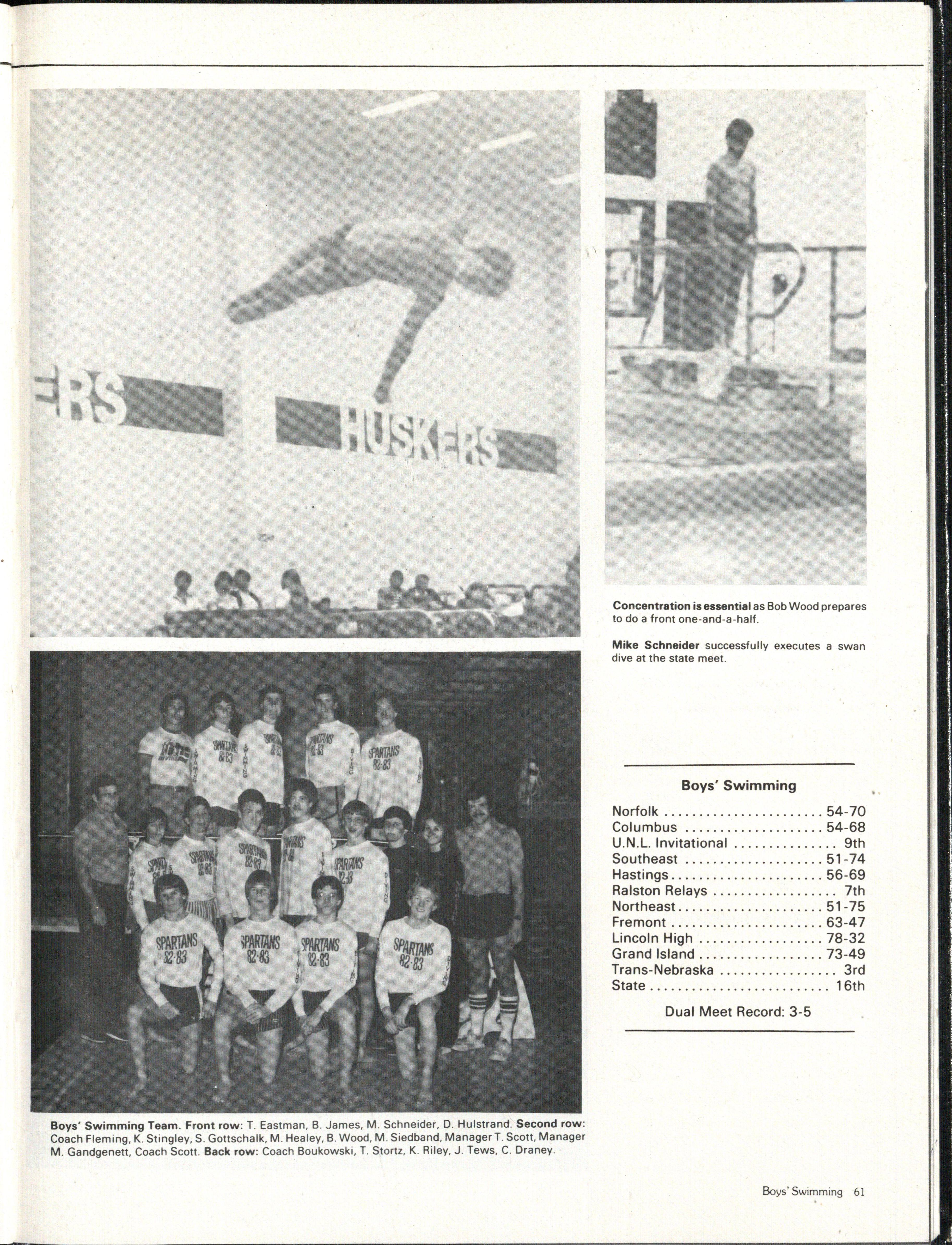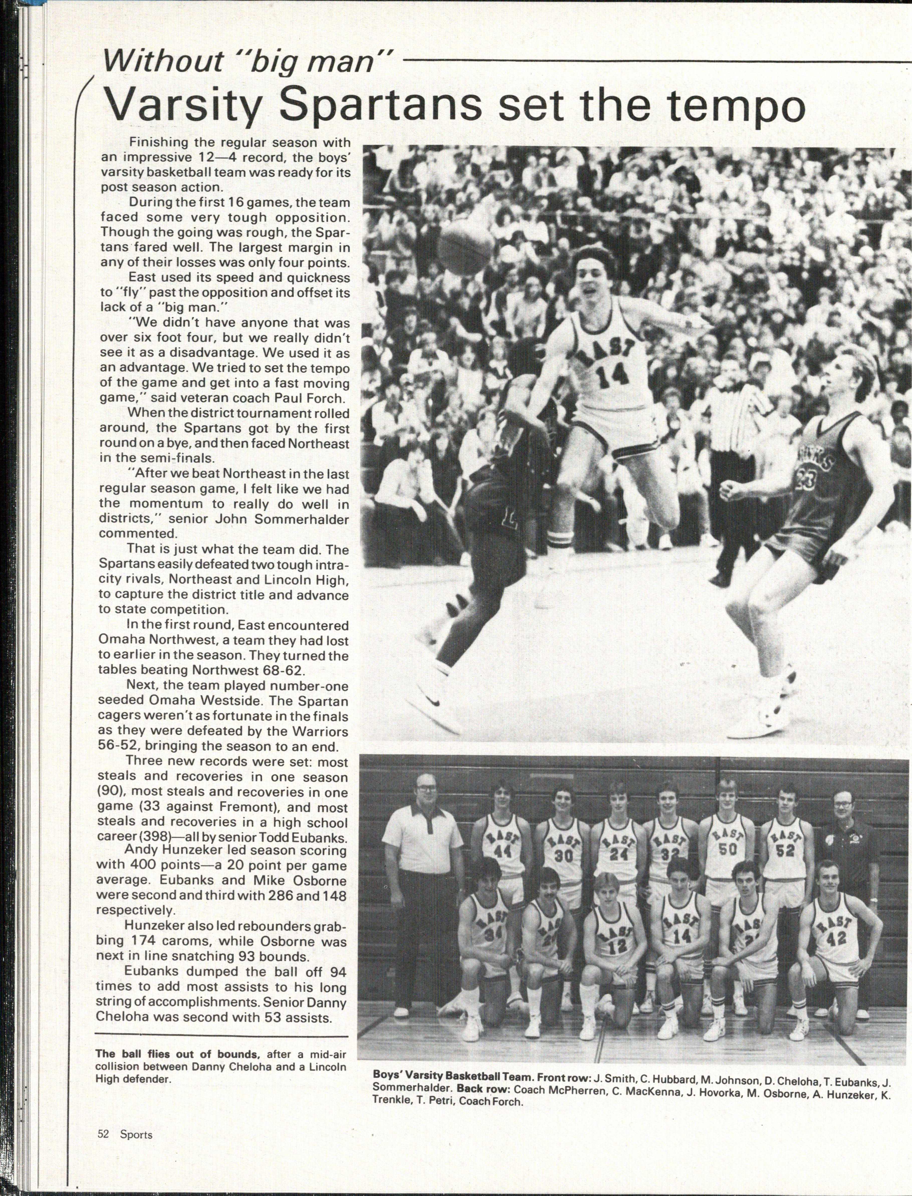 The clippings and reviews of '82-'83 reflected a successful booking. The season brought numerous state championships in sports as well as other activities. Highlights of the year included a "snow day" when school was cancelled, record highs in February which encouraged shorts, a football game played in a thunderstorm, the Punk-Funk Dance, classes held during a blackout, Johnny's Lounge (a new hang-