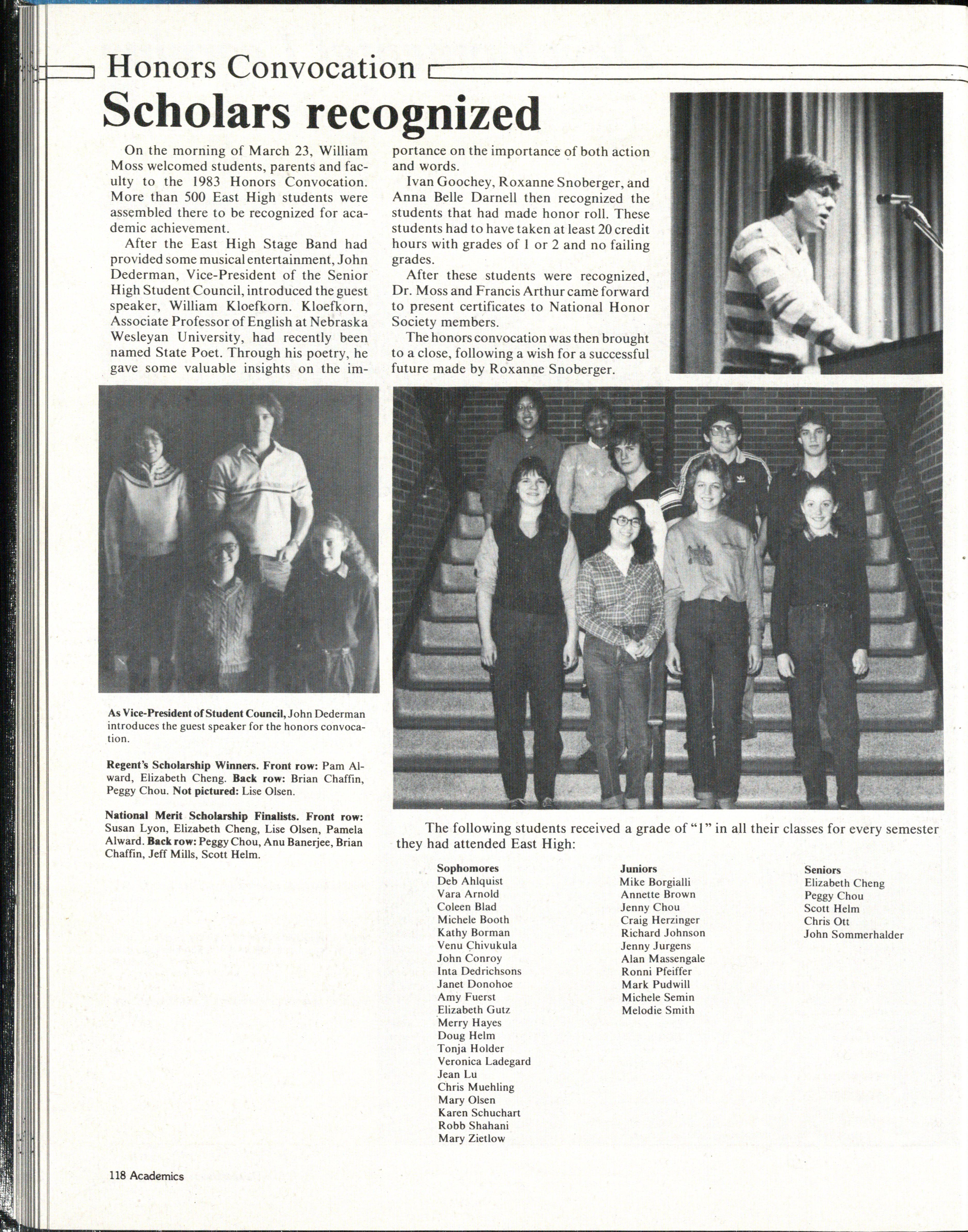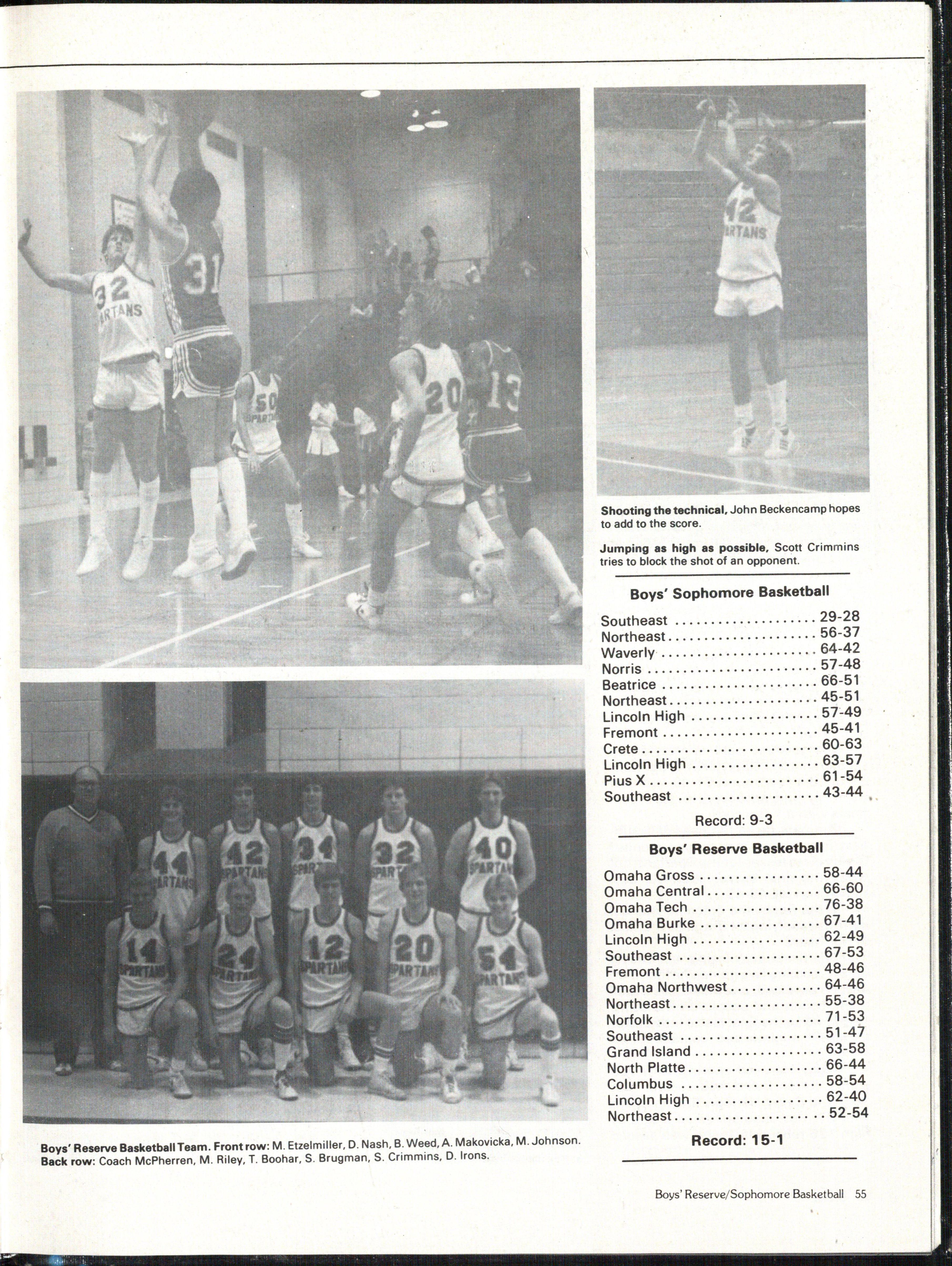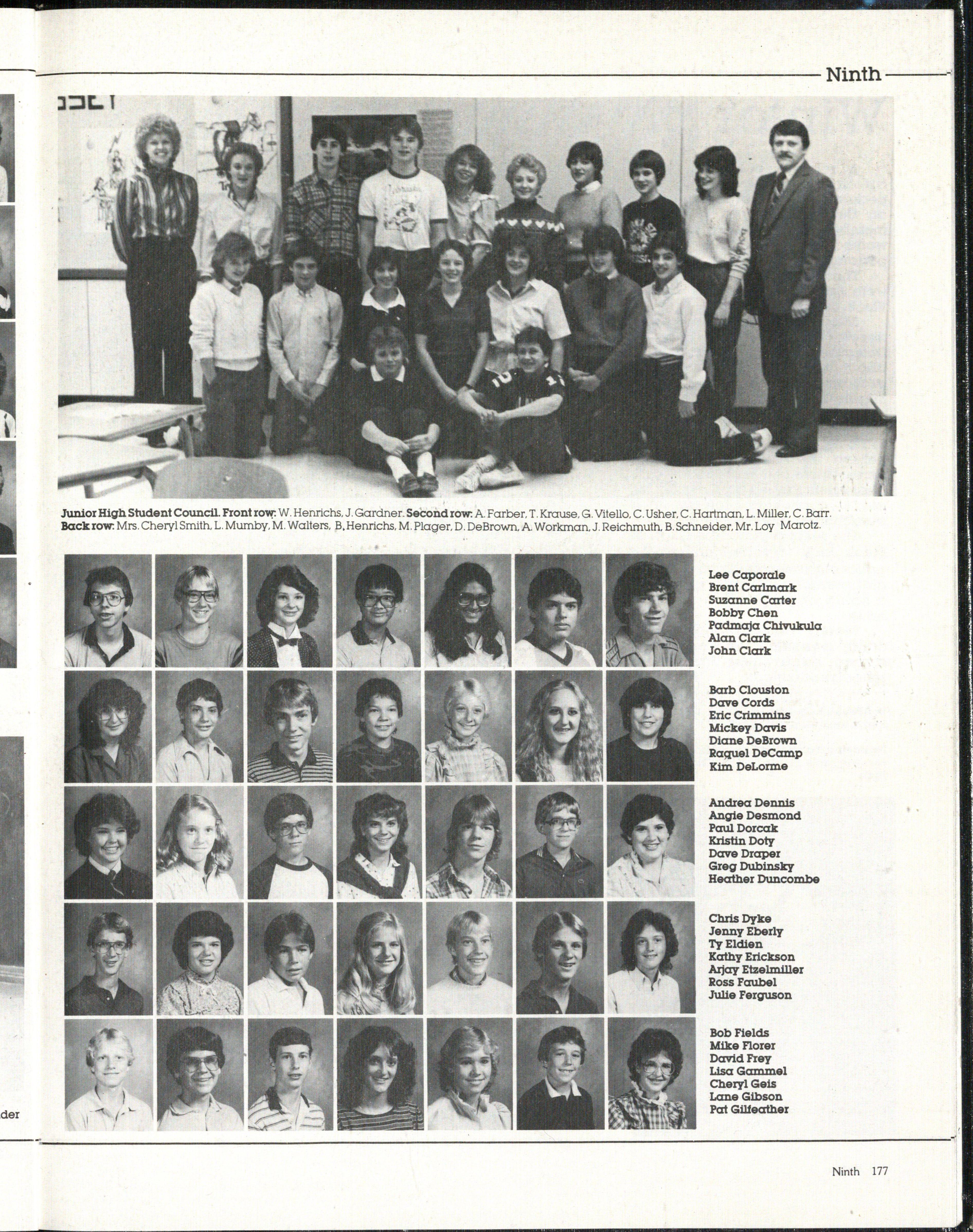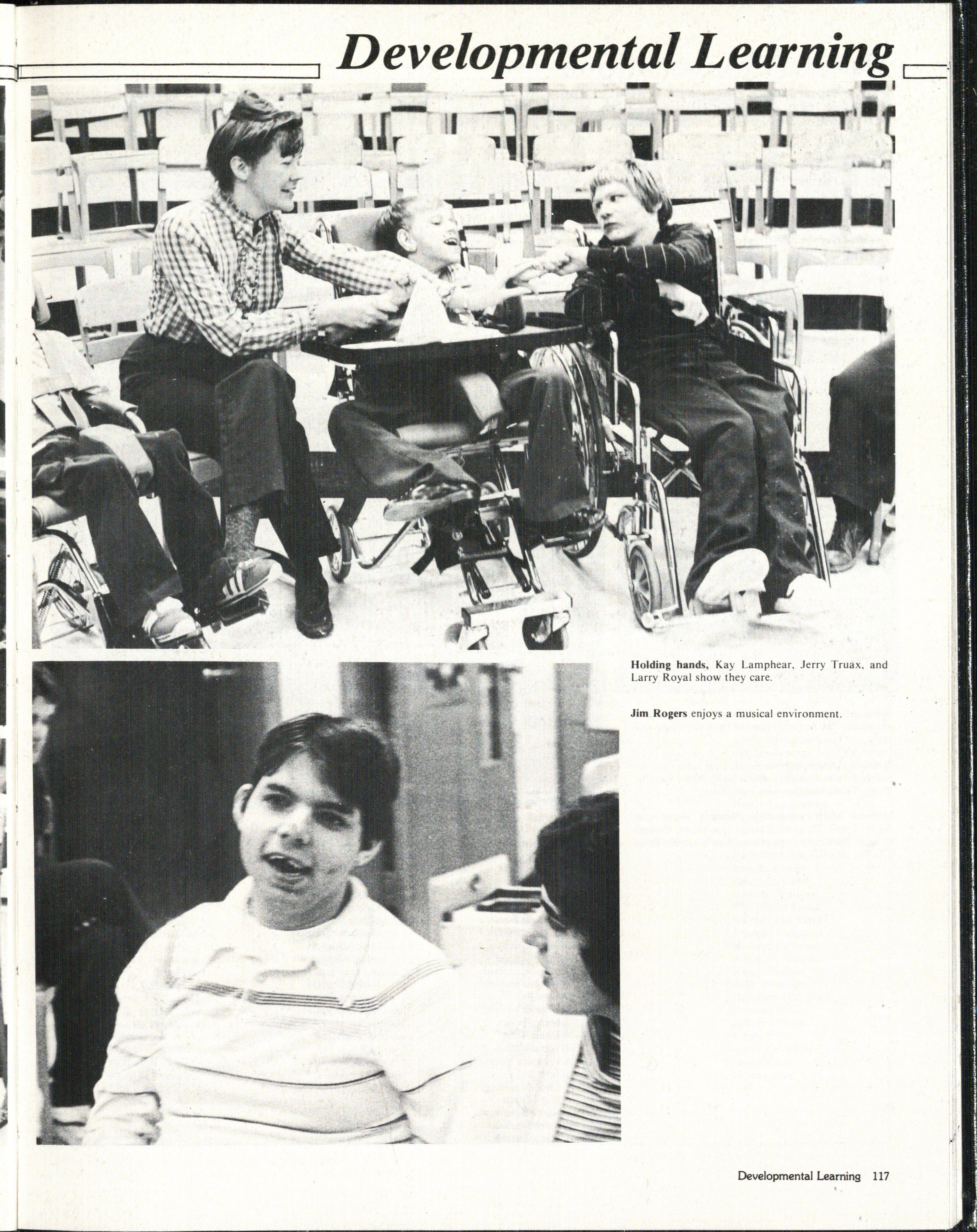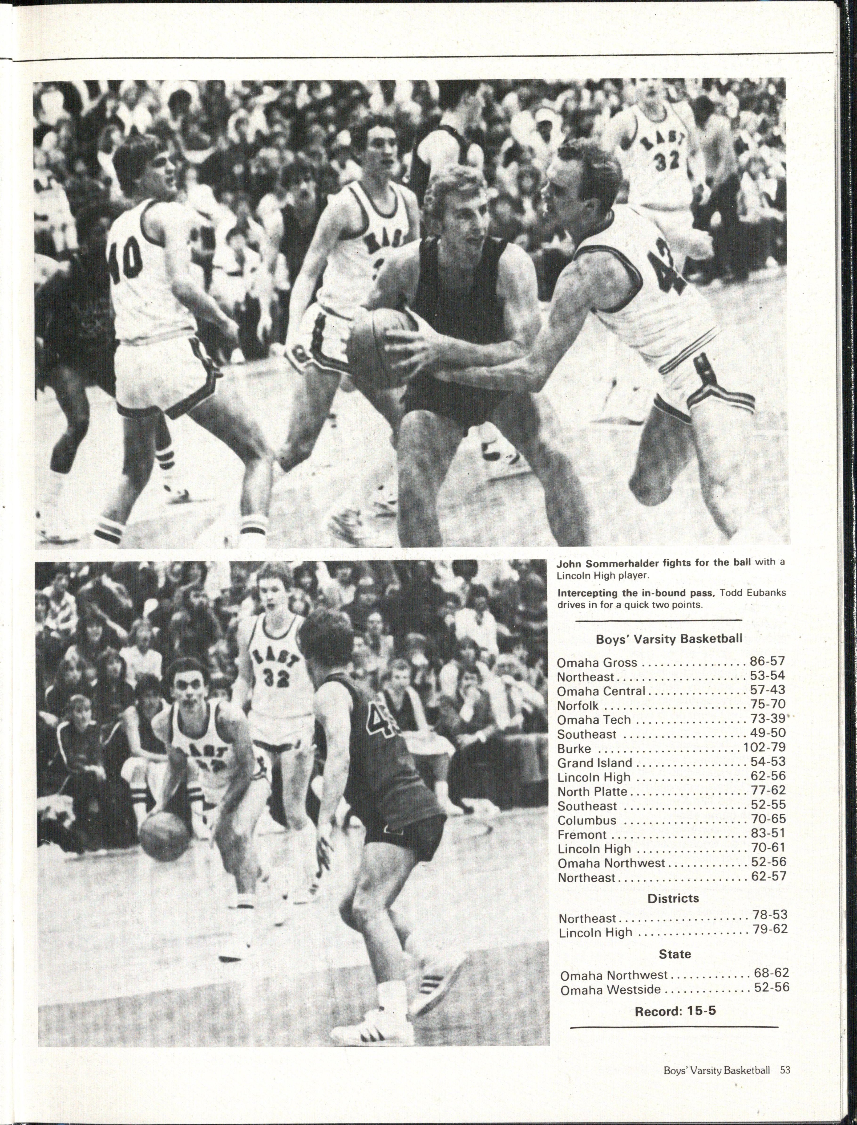 The clippings and reviews of '82-'83 reflected a successful booking. The season brought numerous state championships in sports as well as other activities. Highlights of the year included a "snow day" when school was cancelled, record highs in February which encouraged shorts, a football game played in a thunderstorm, the Punk-Funk Dance, classes held during a blackout, Johnny's Lounge (a new hang-