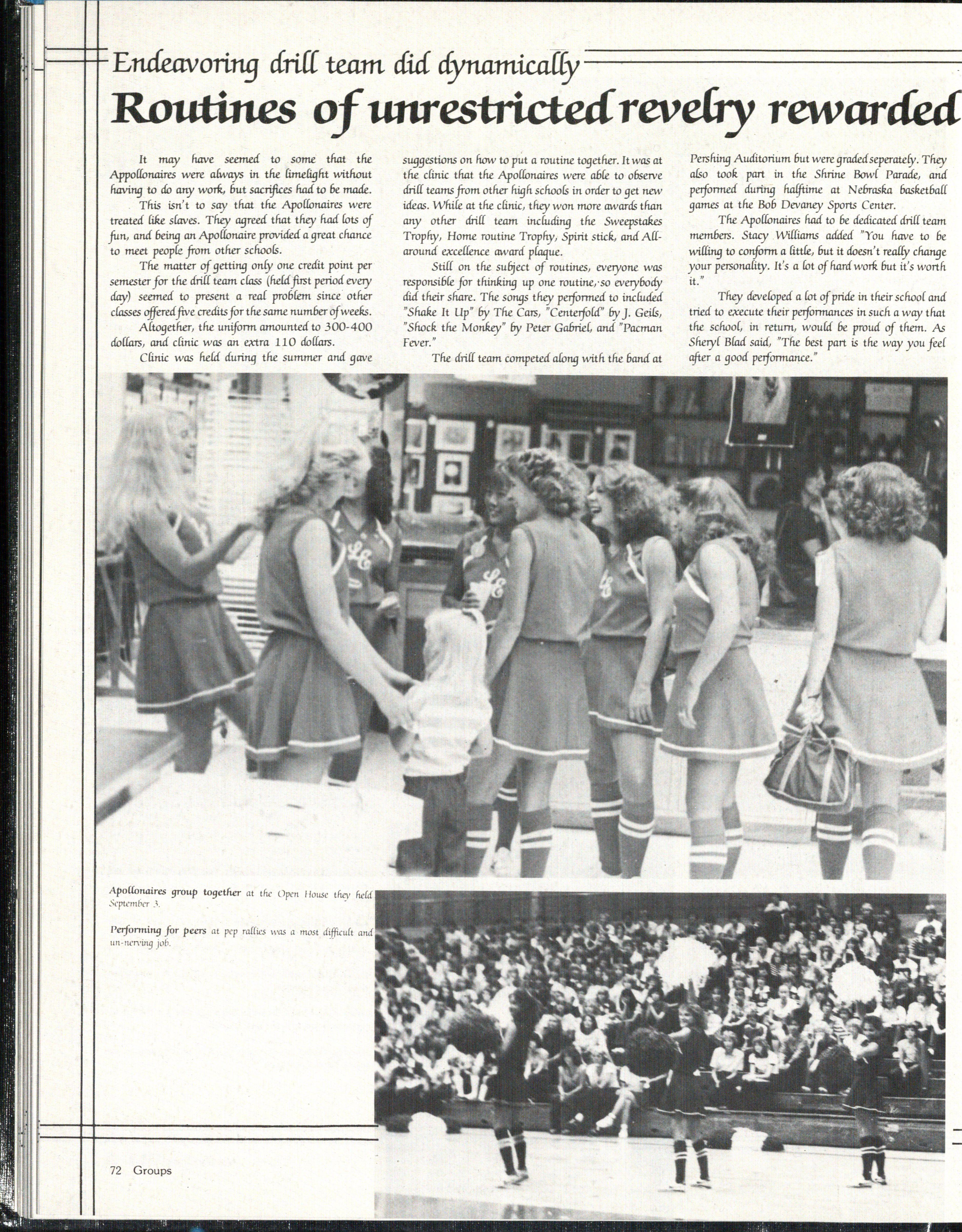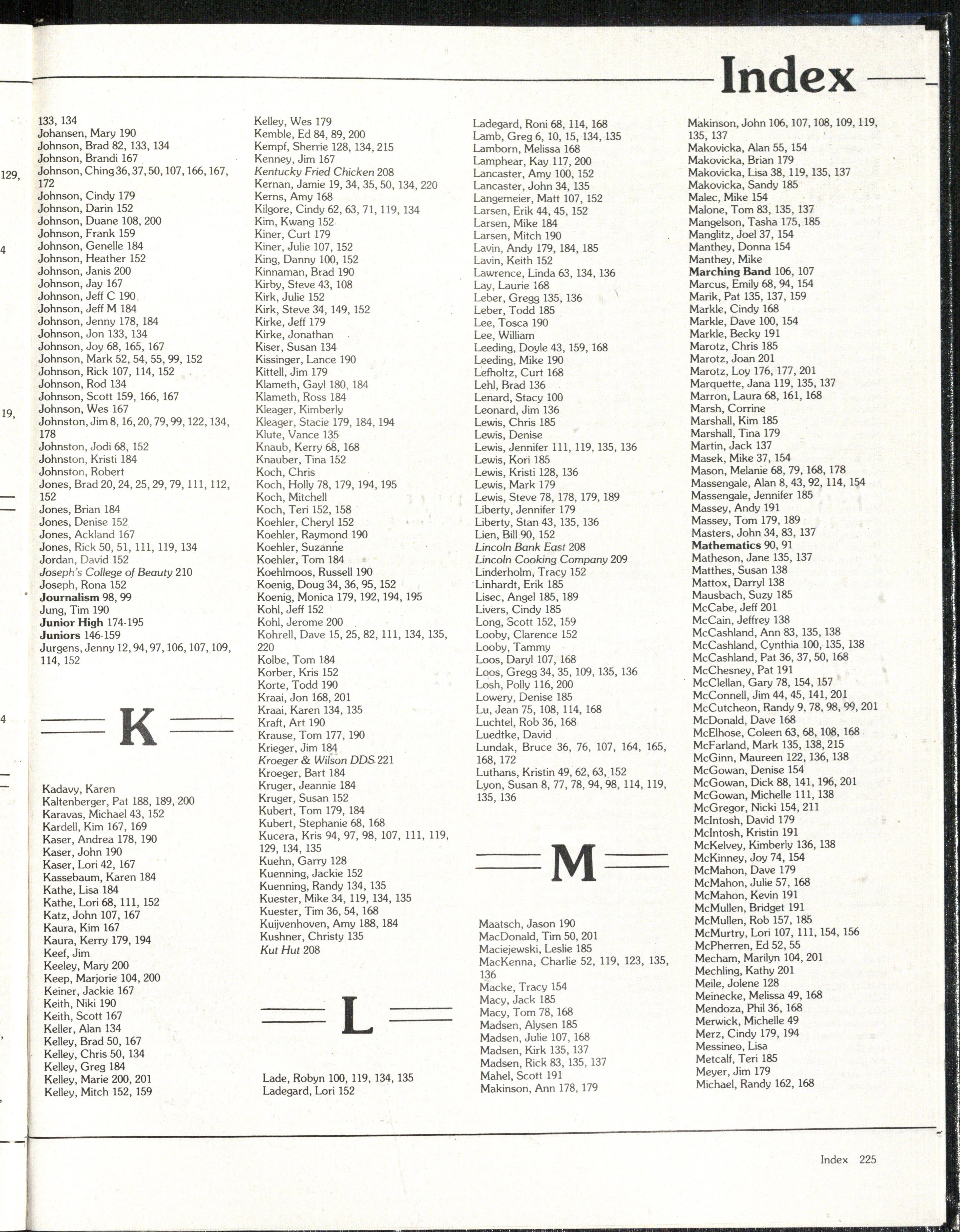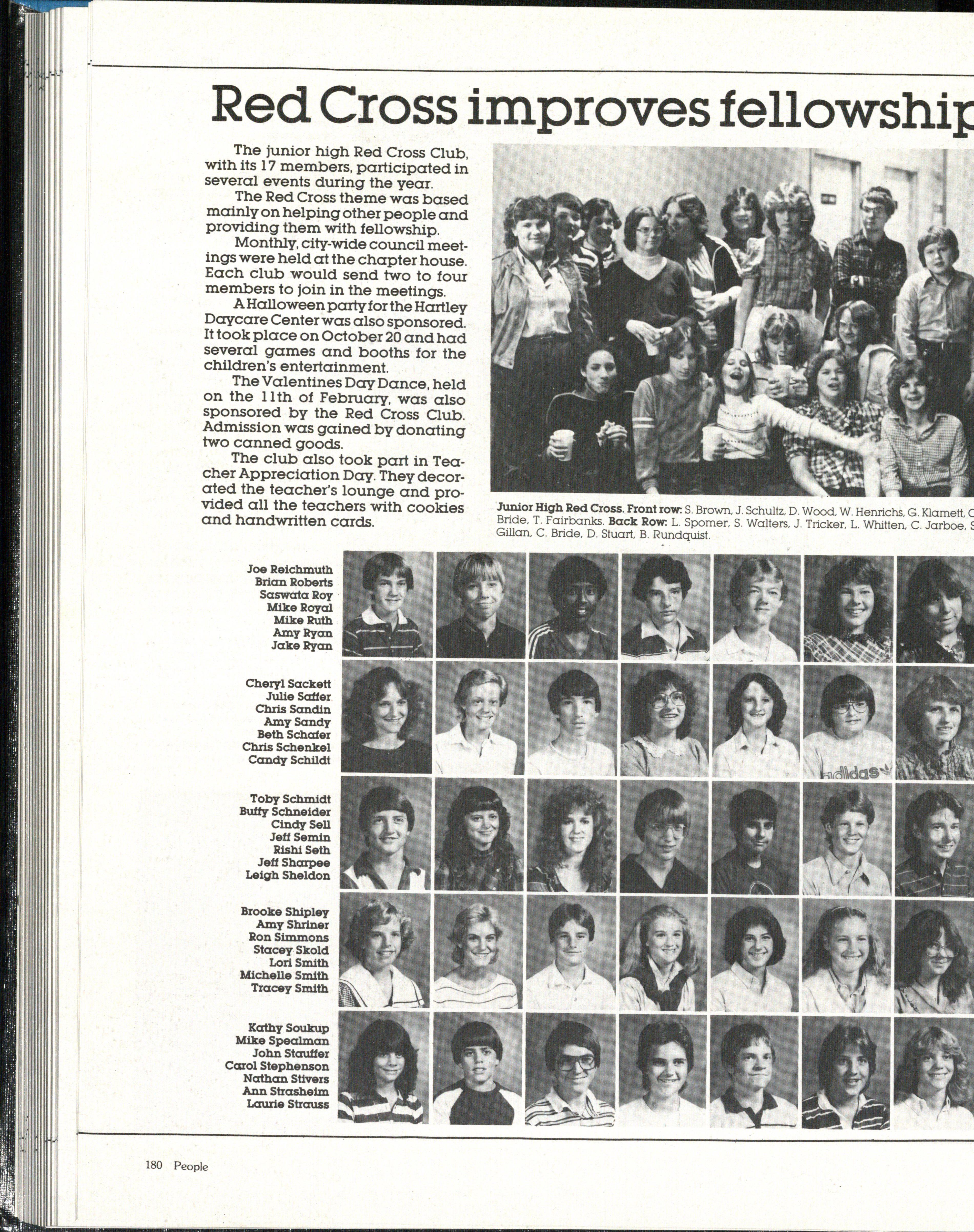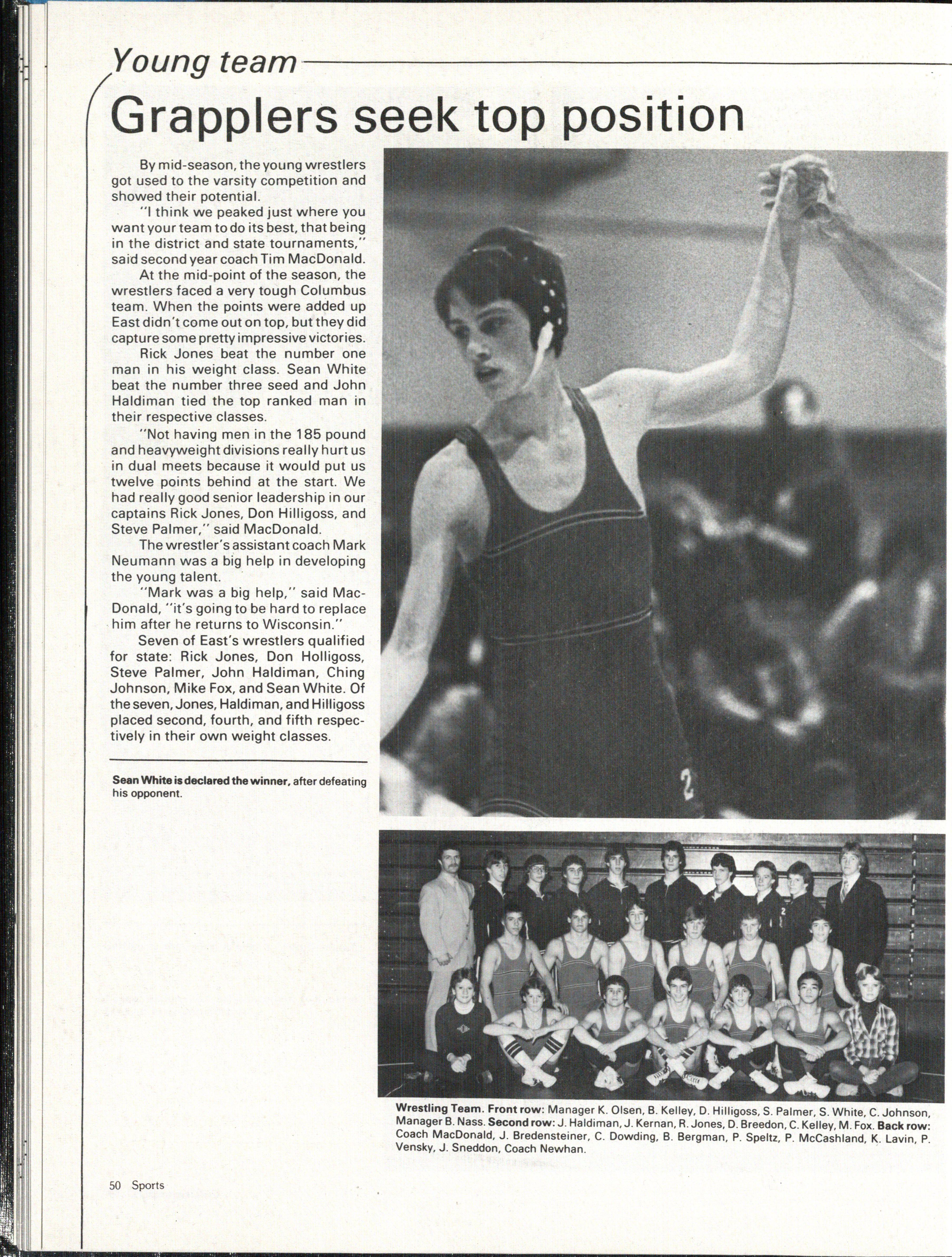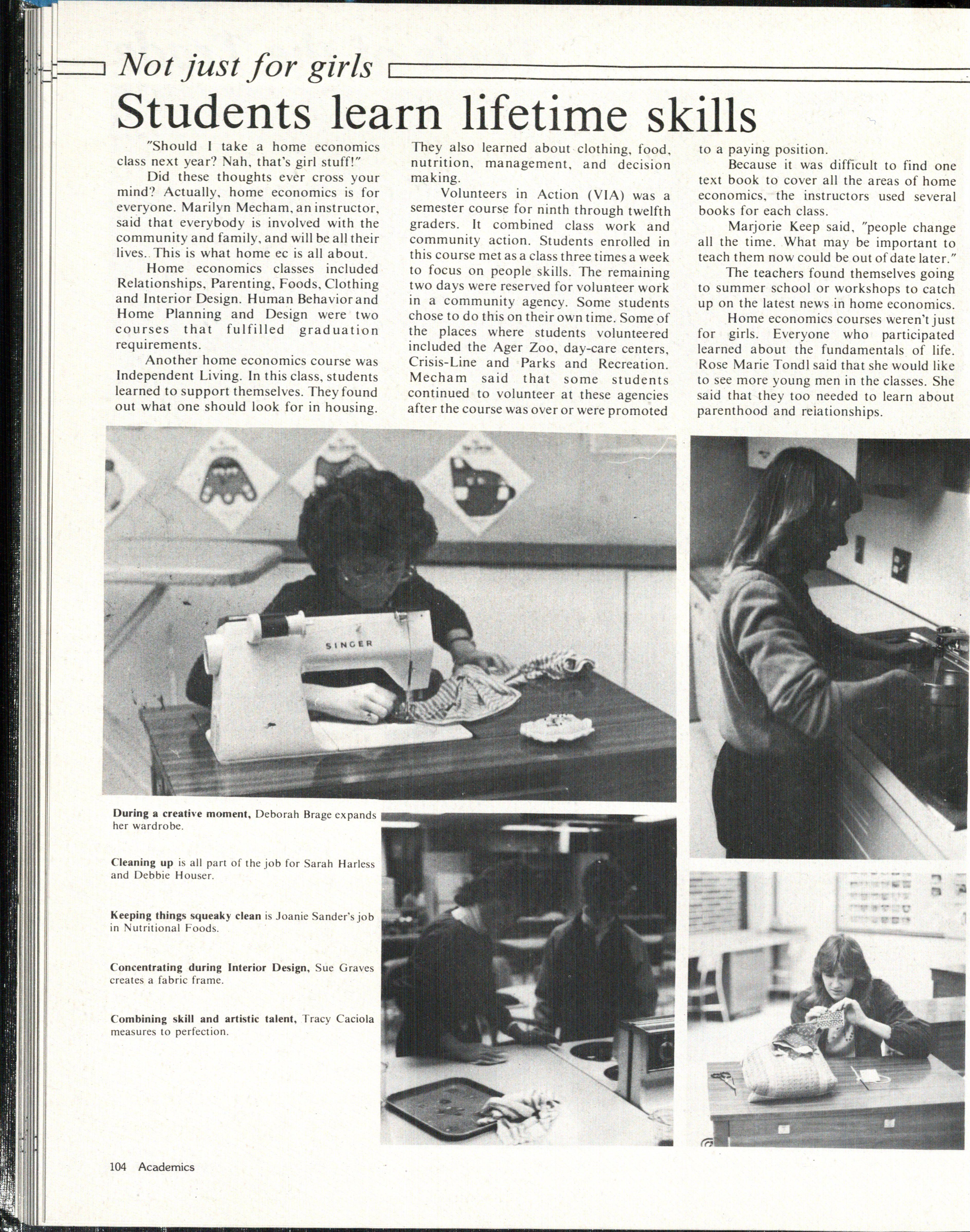 The clippings and reviews of '82-'83 reflected a successful booking. The season brought numerous state championships in sports as well as other activities. Highlights of the year included a "snow day" when school was cancelled, record highs in February which encouraged shorts, a football game played in a thunderstorm, the Punk-Funk Dance, classes held during a blackout, Johnny's Lounge (a new hang-