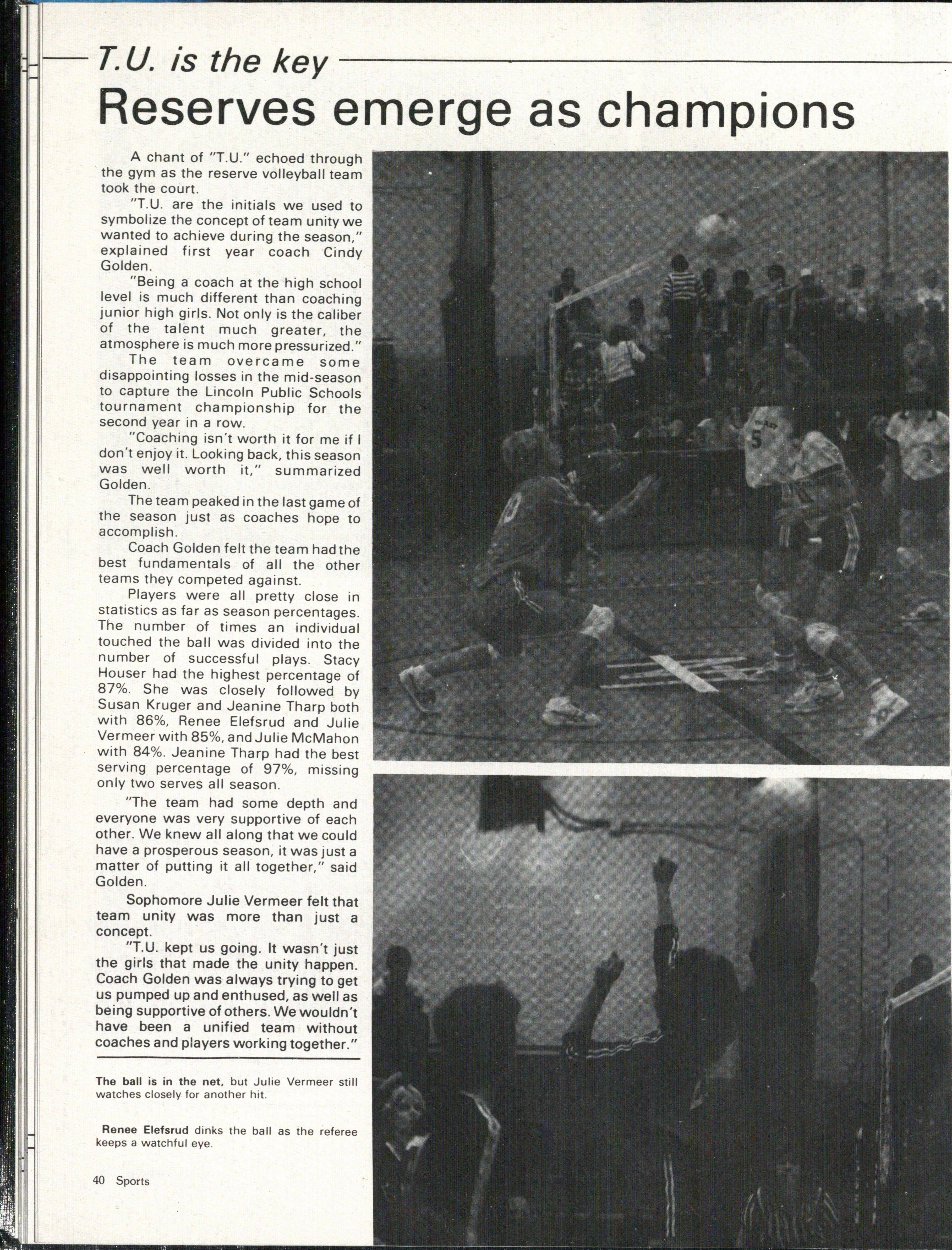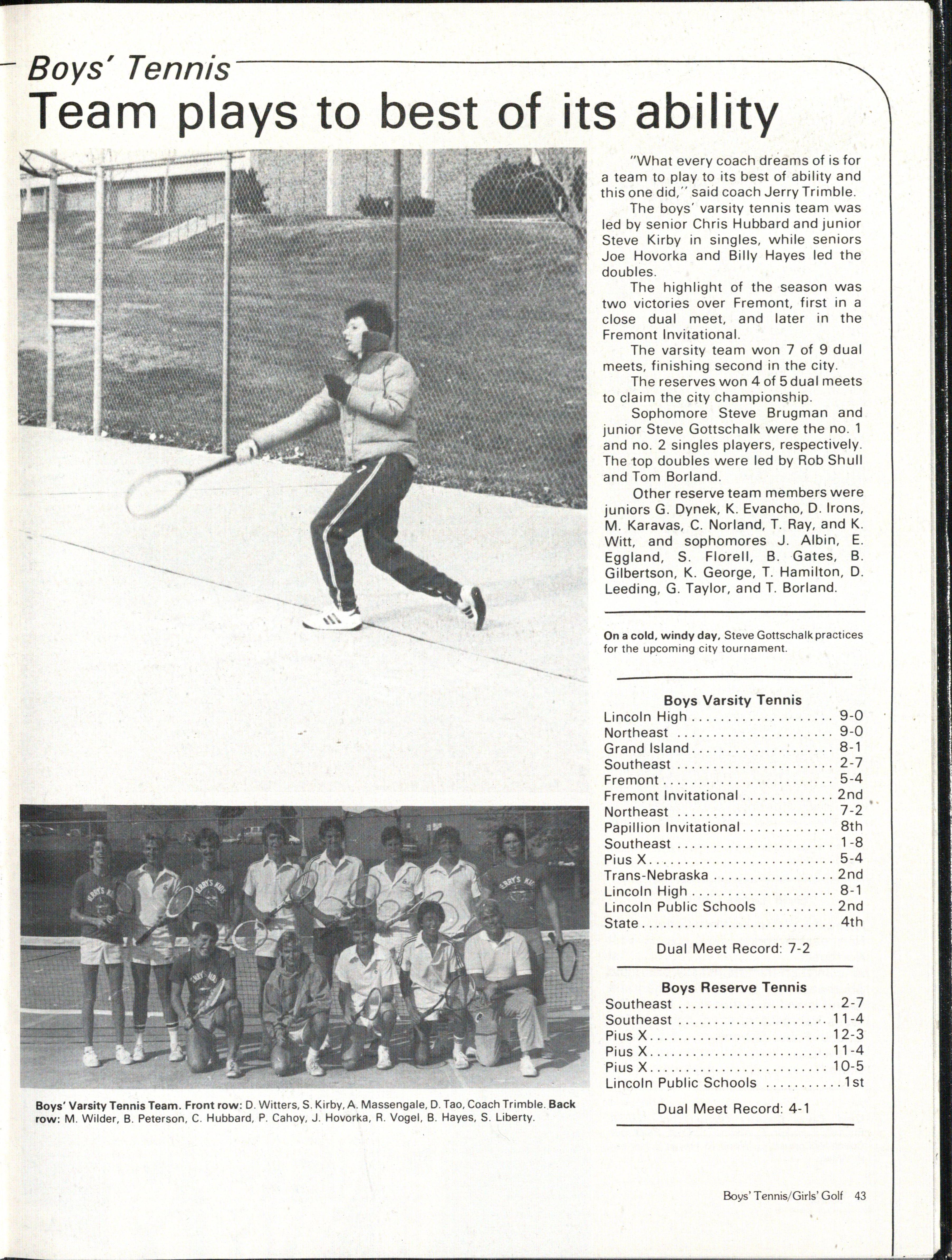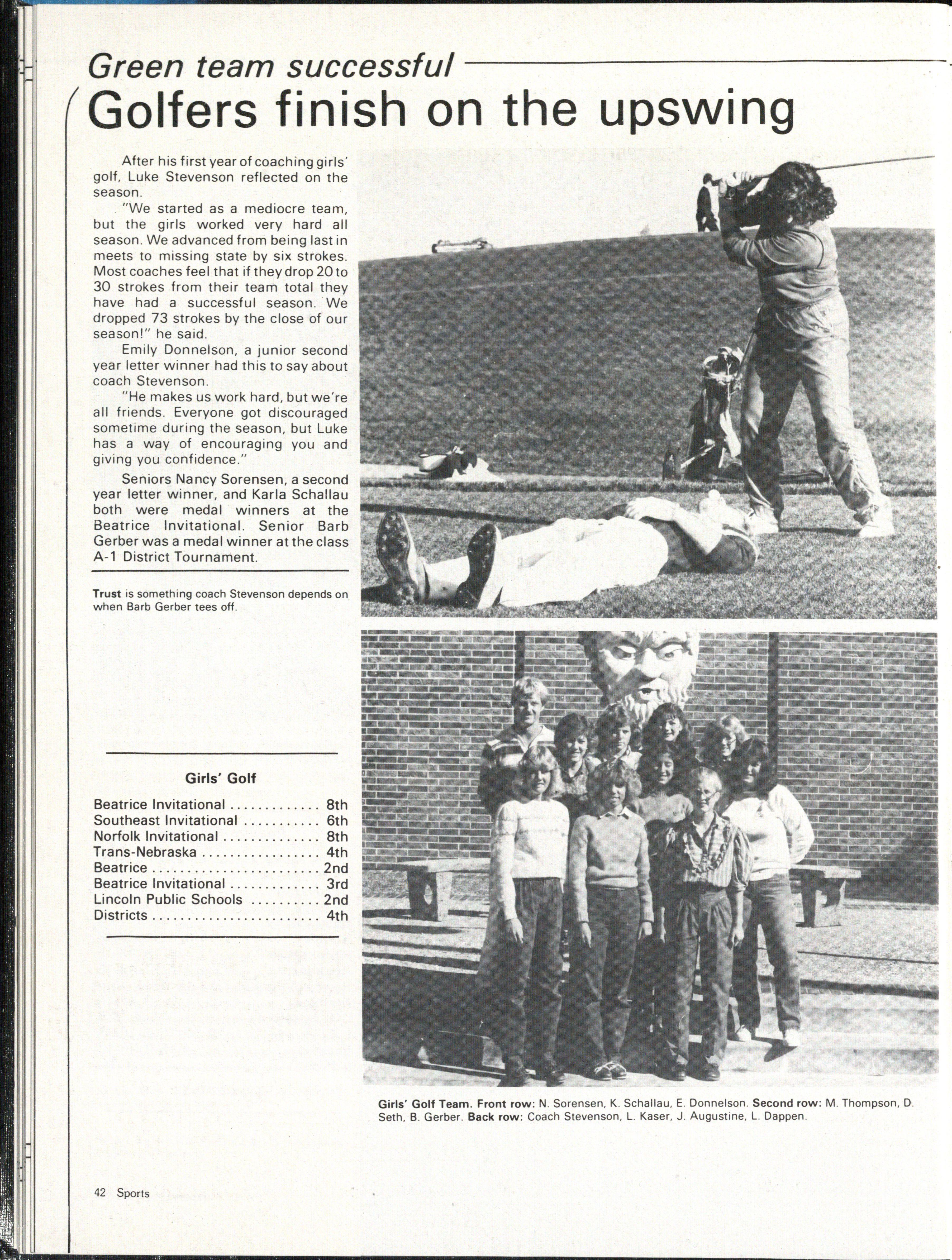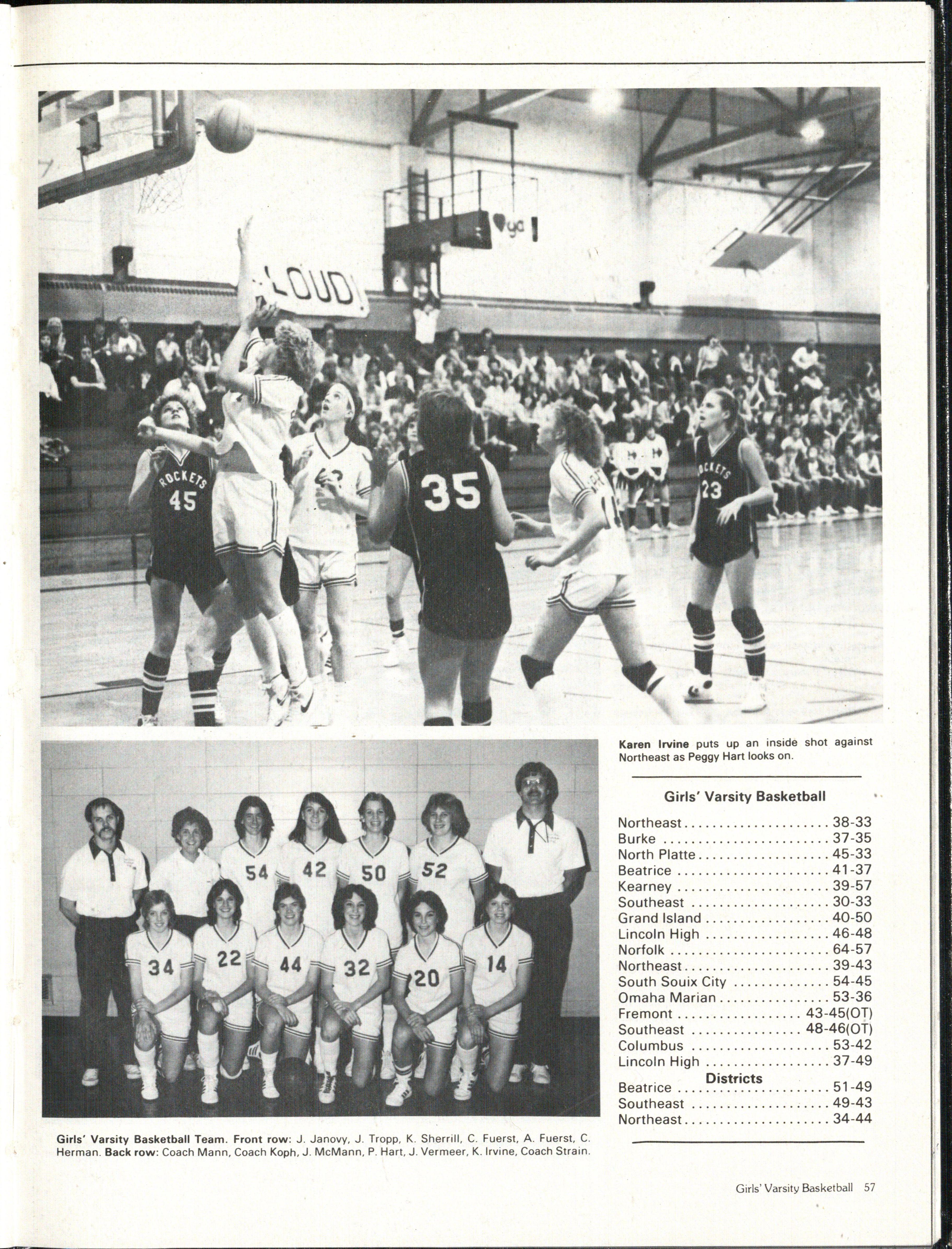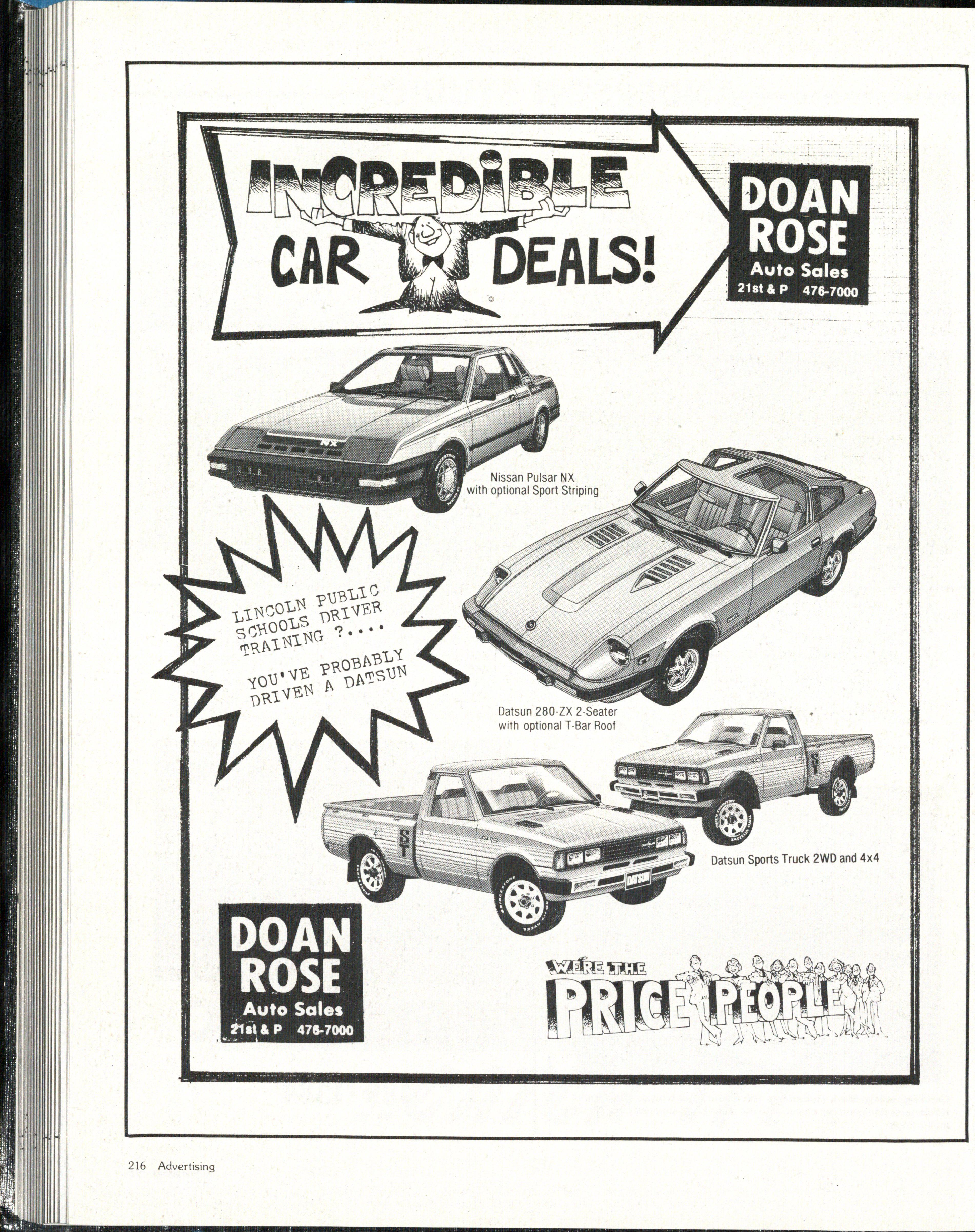 The clippings and reviews of '82-'83 reflected a successful booking. The season brought numerous state championships in sports as well as other activities. Highlights of the year included a "snow day" when school was cancelled, record highs in February which encouraged shorts, a football game played in a thunderstorm, the Punk-Funk Dance, classes held during a blackout, Johnny's Lounge (a new hang-