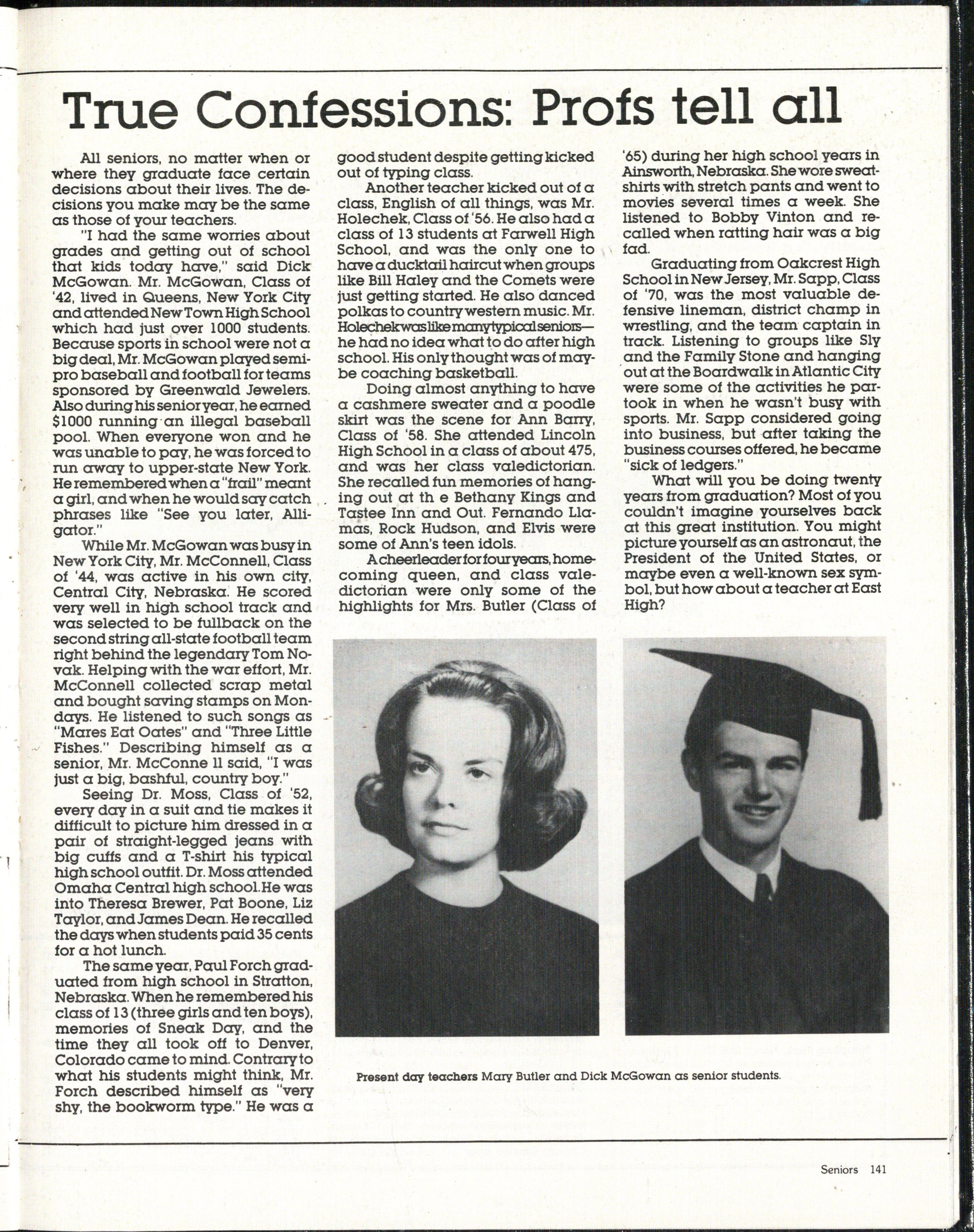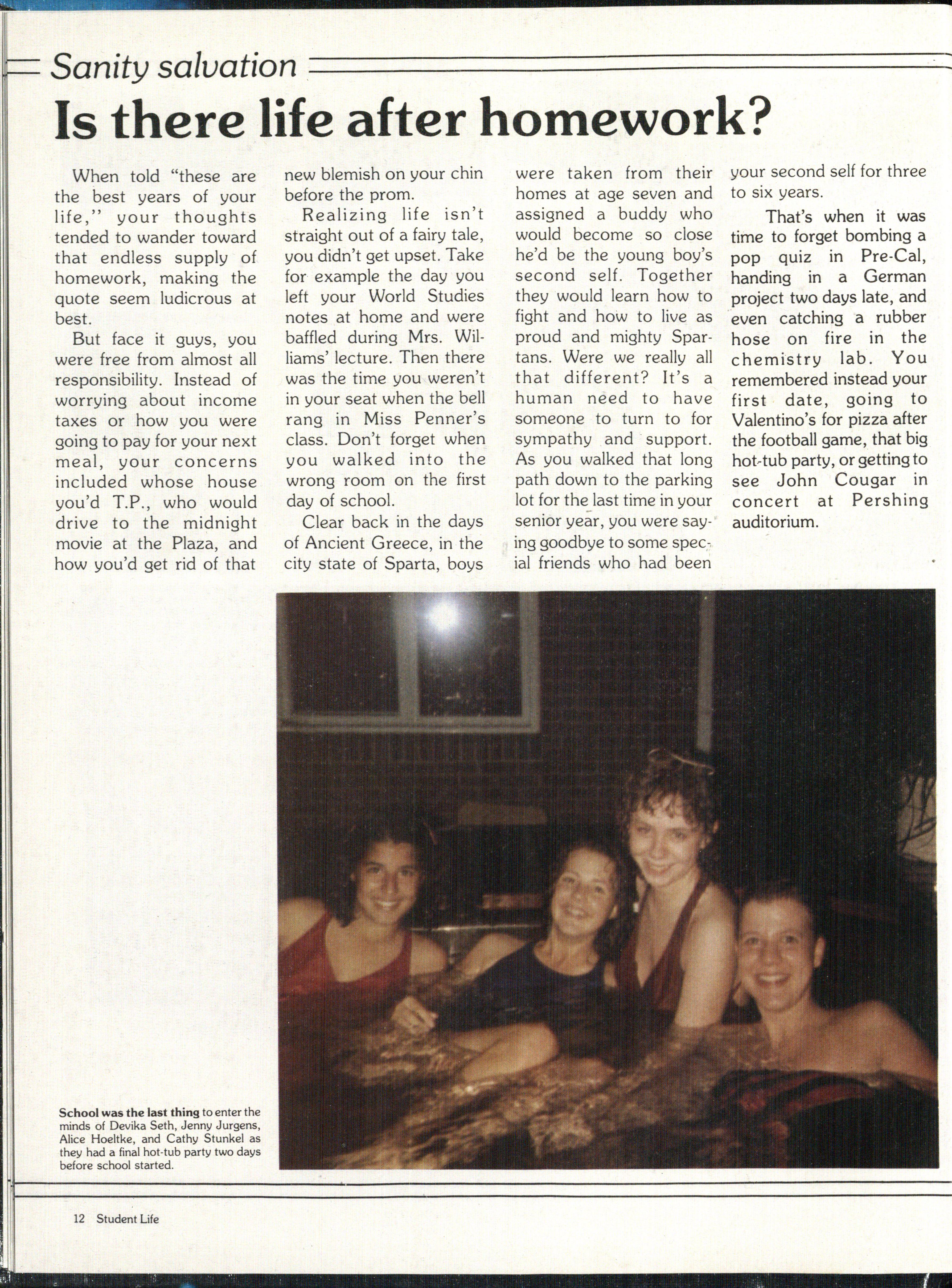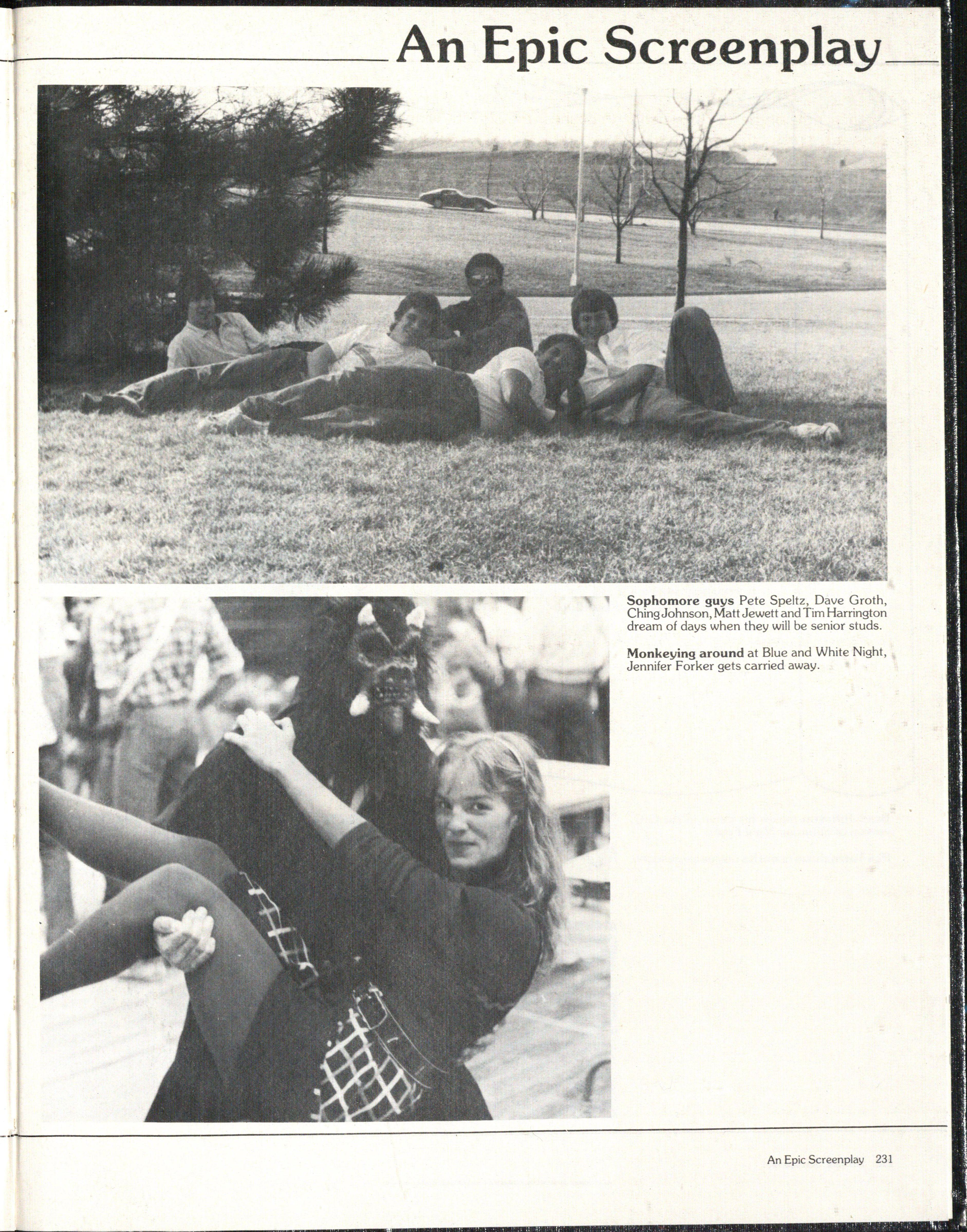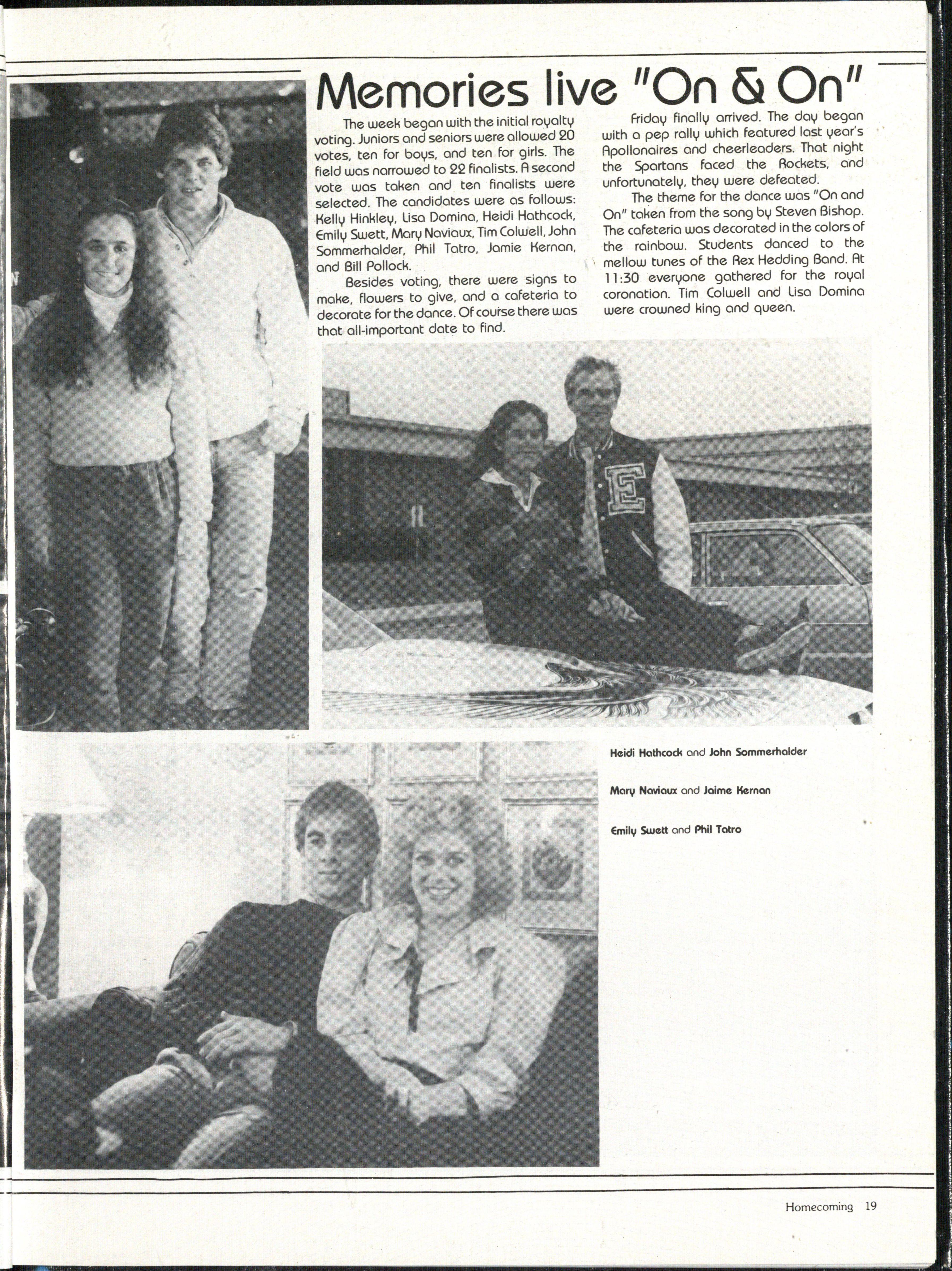 That's when it was time to forget bombing a pop quiz in Pre-Cal, handing in a German project two days late, and even catching a rubber hose on fire in the chemistry lab. You remembered instead your first date, going to Valentino's for pizza after the football game, that big hoUub party, or getting to see John Cougar in concert at Pershing auditorium.