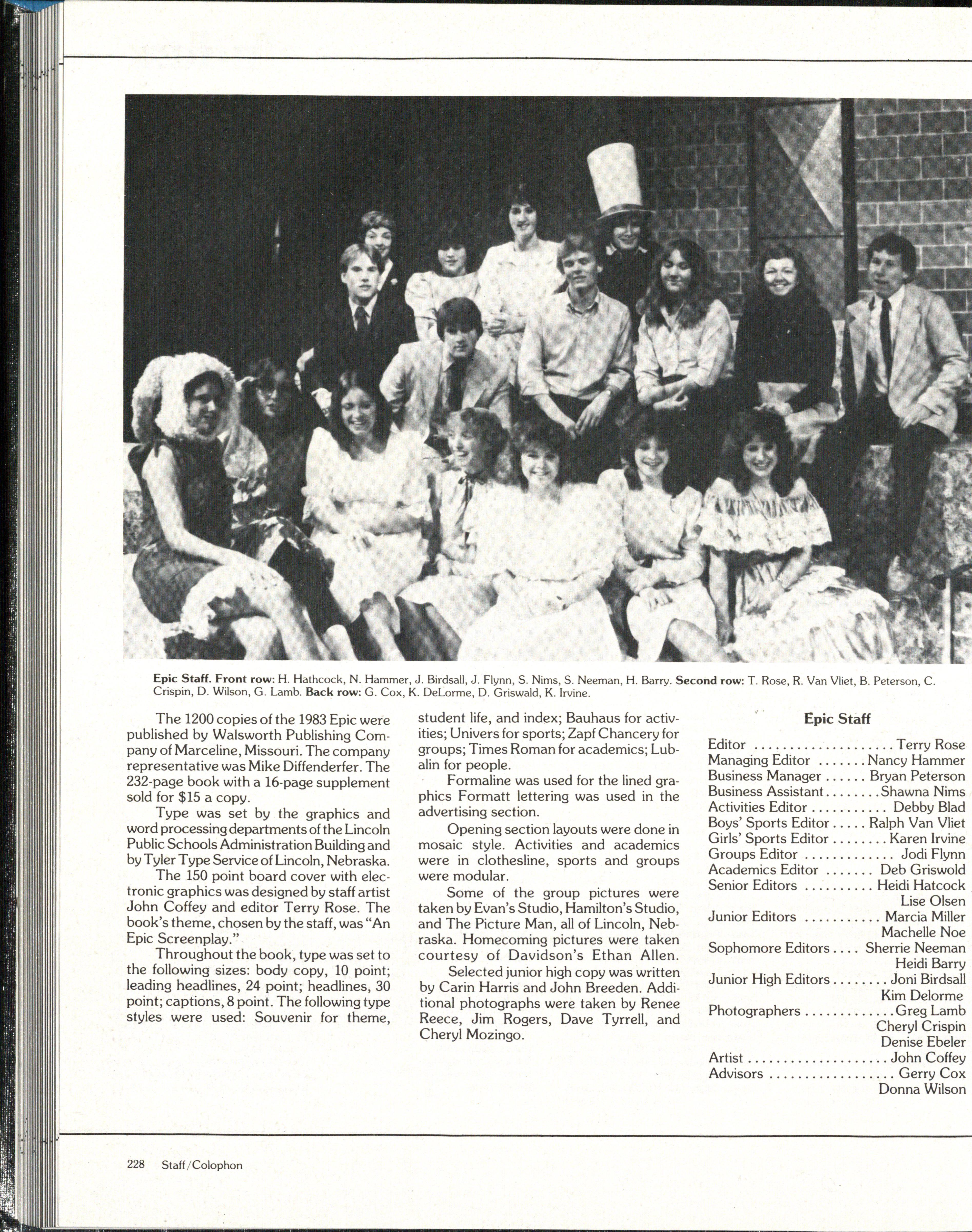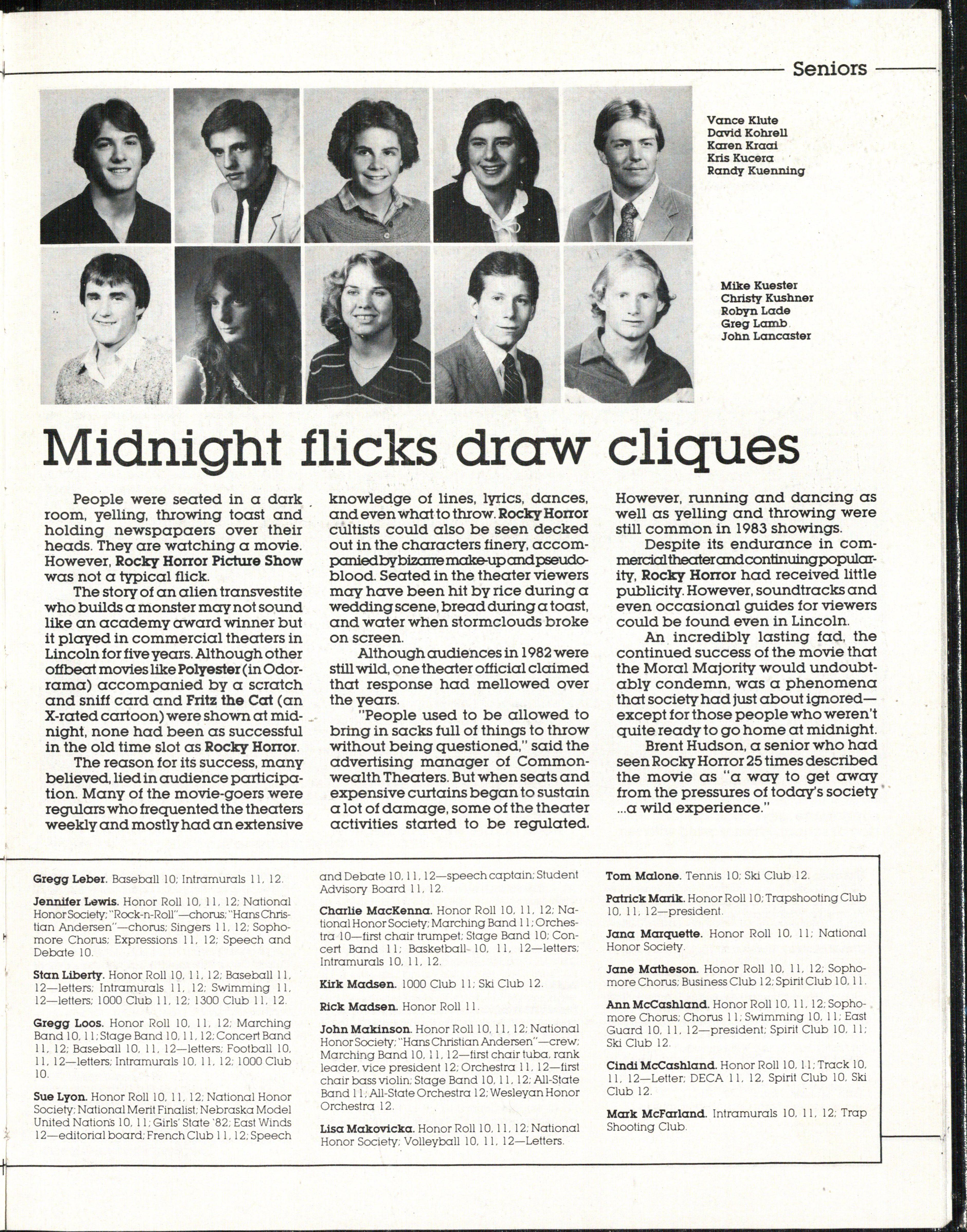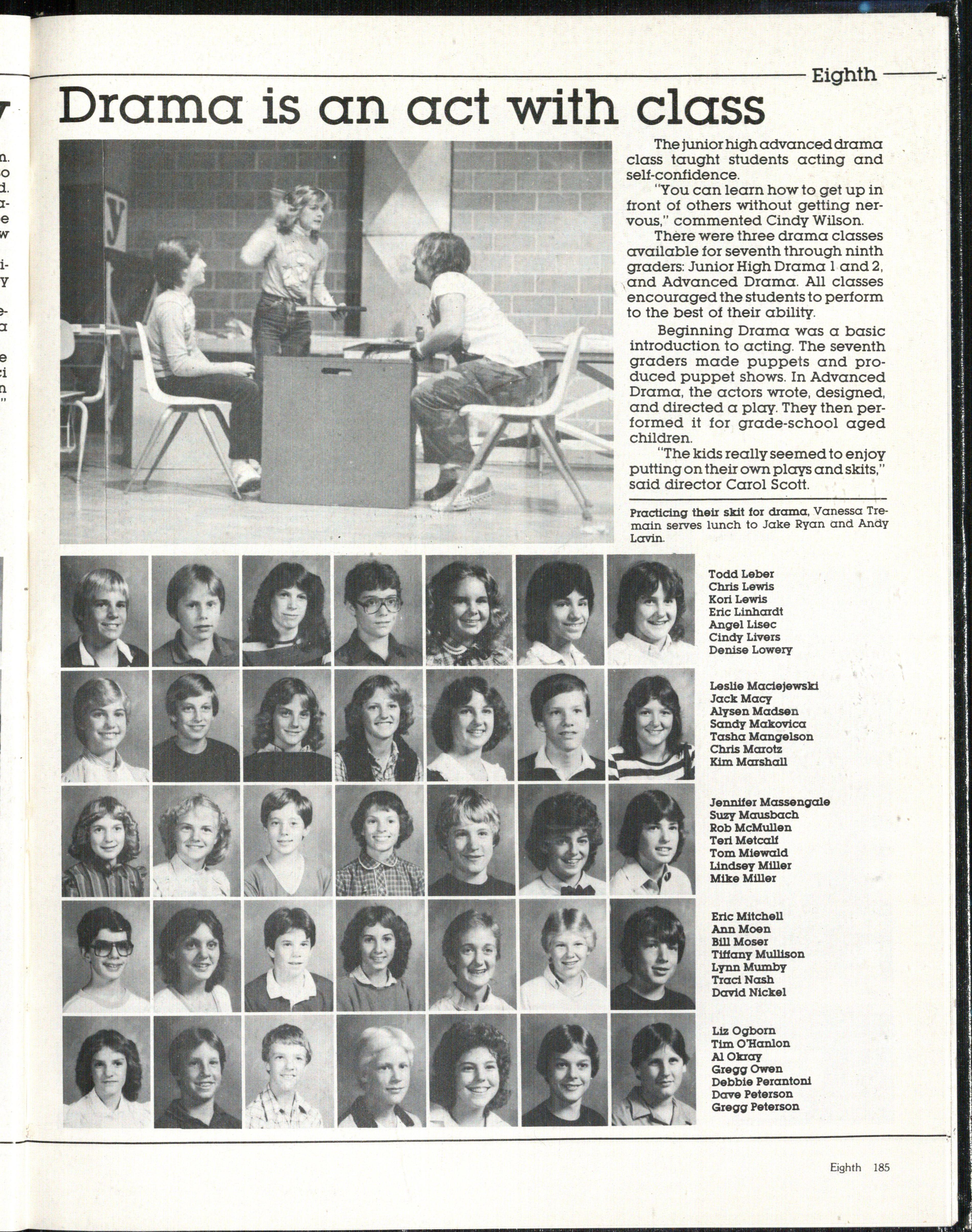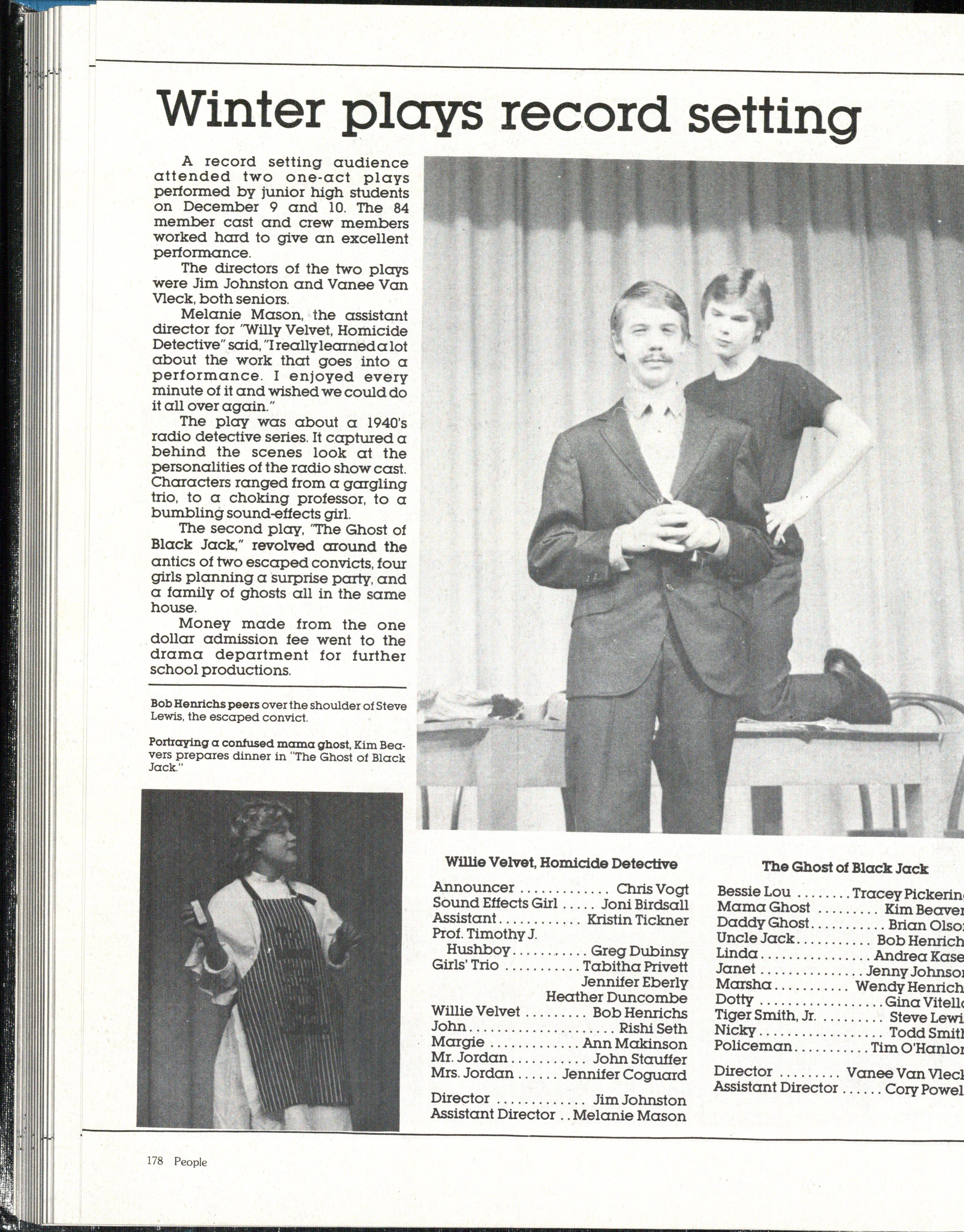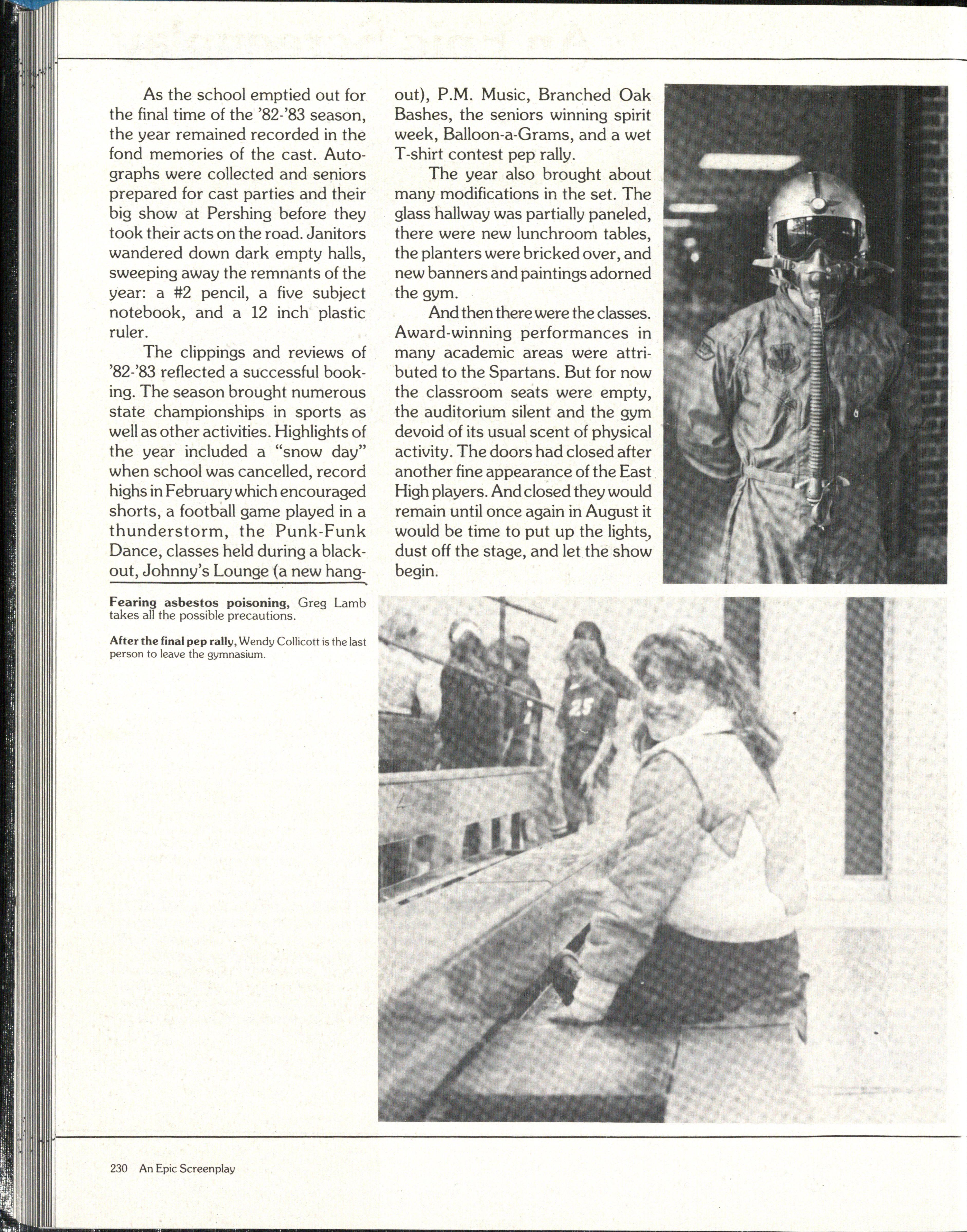 As the school emptied out for the final time of the '82-'83 season, the year remained recorded in the fond memories of the cast. Autographs were collected and seniors prepared for cast parties and their big show at Pershing before they took their acts on the road. Janitors wandered down dark empty halls, sweeping away the remnants of the year: a #2 pencil, a five subject notebook, and a 12 inch plastic ruler.