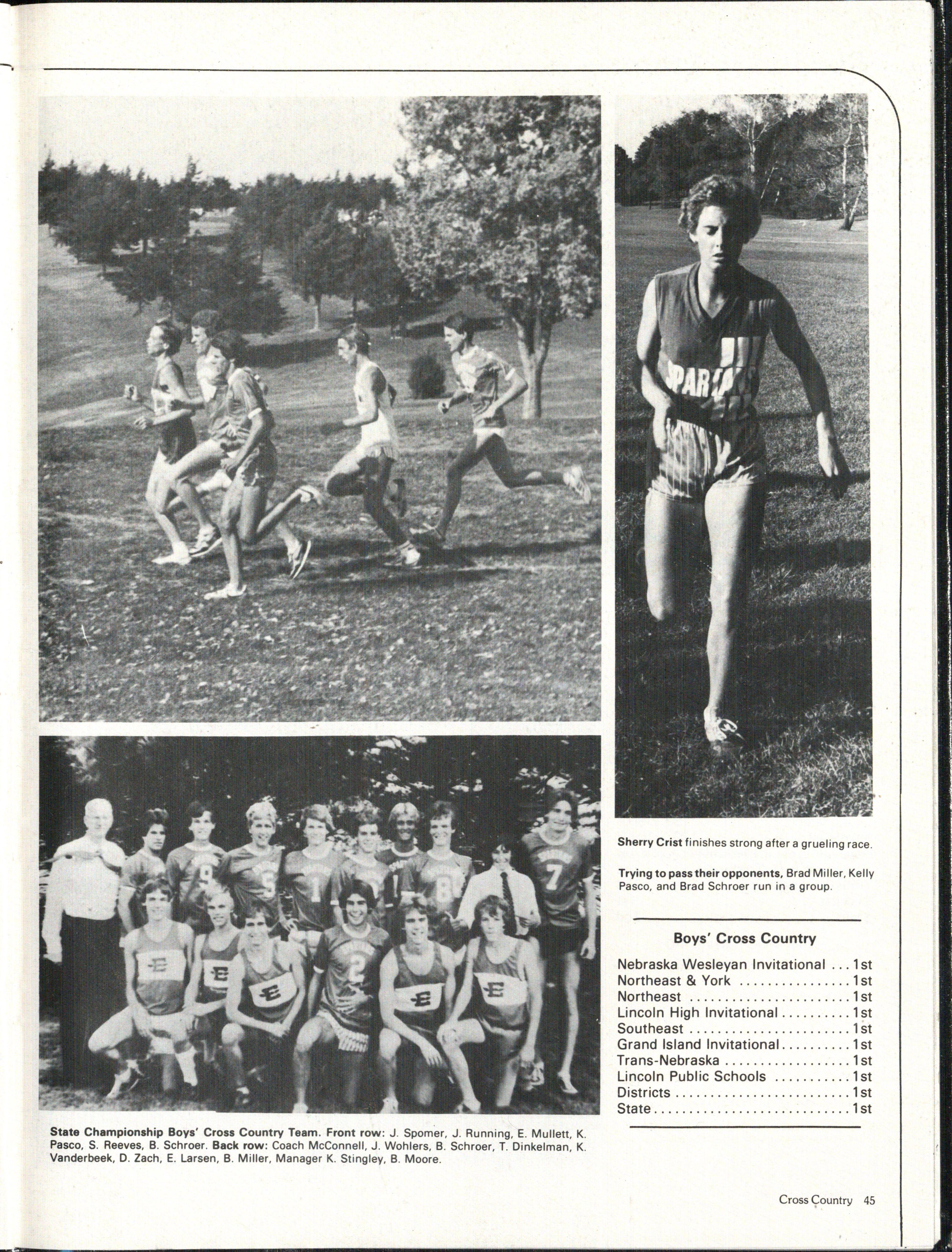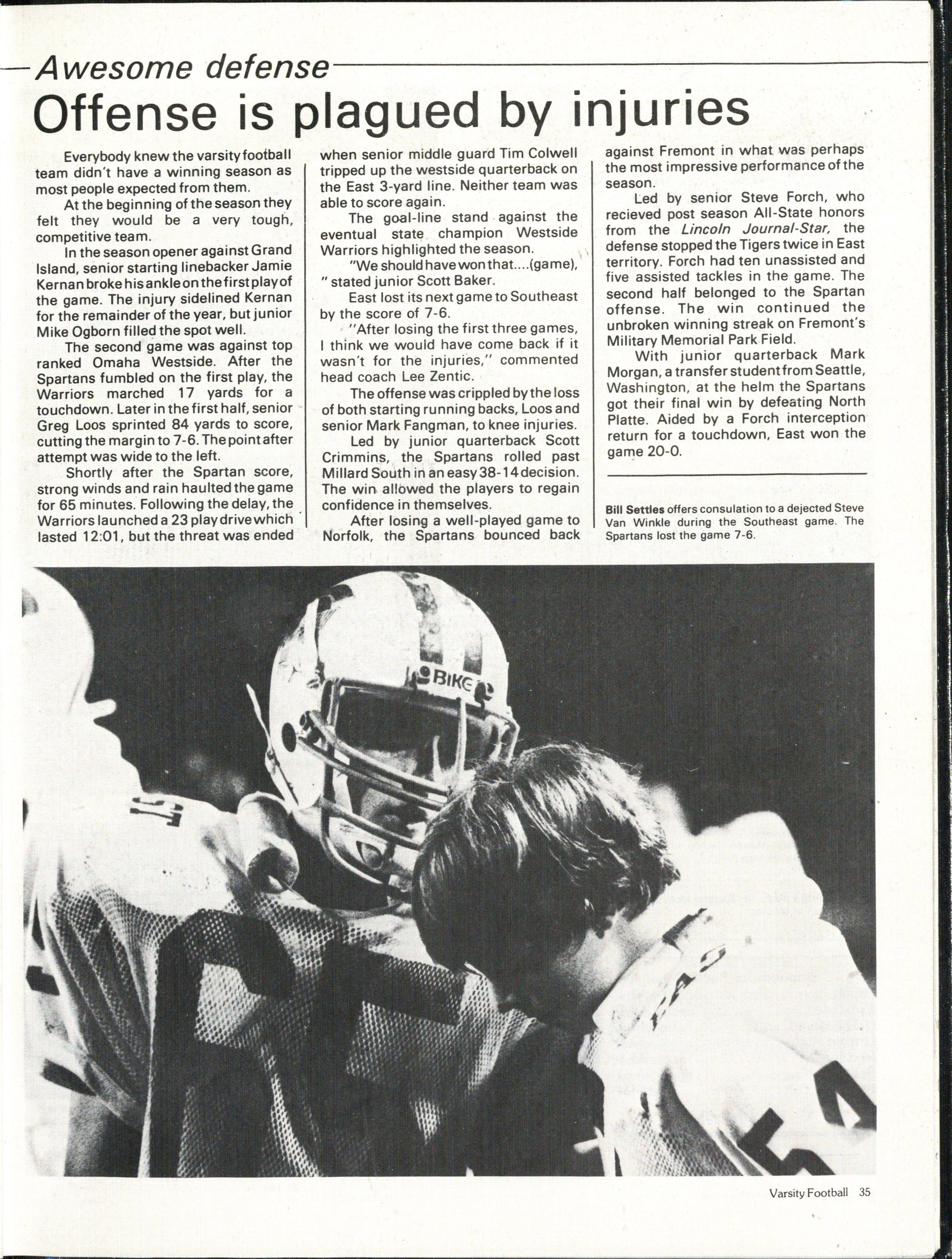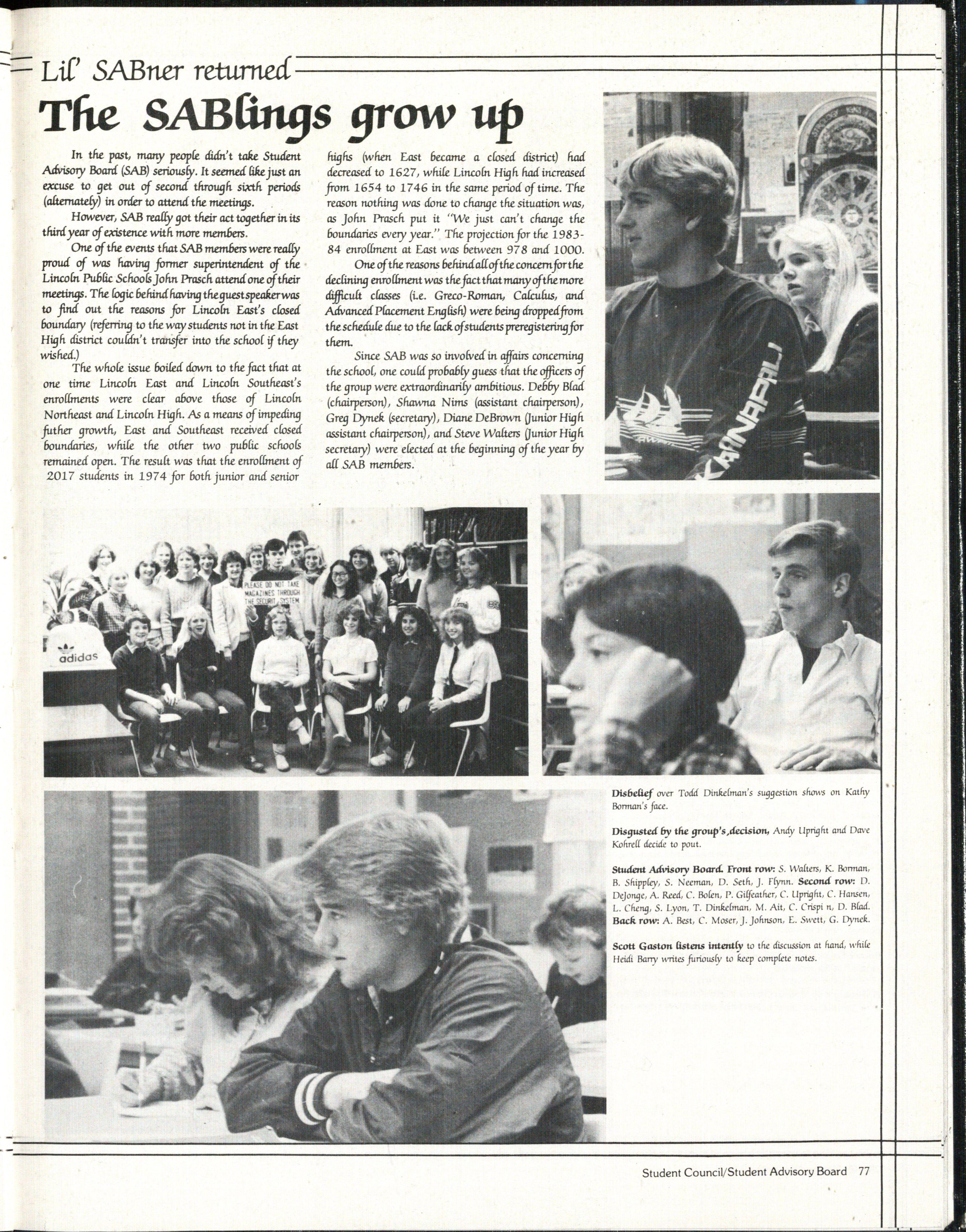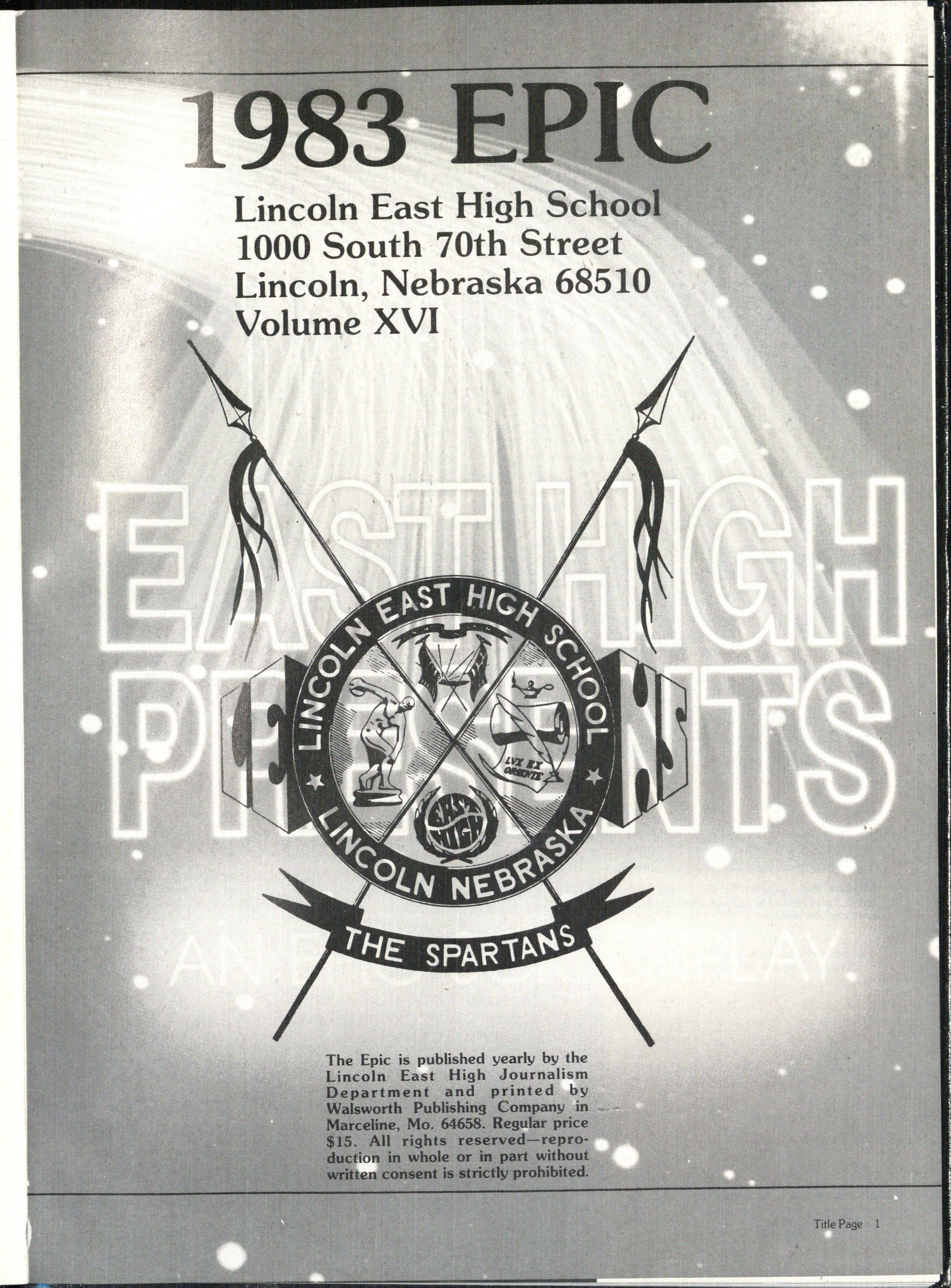 THE SETTING: (Fade in) A windowless brick building facing southward from atop a gradually sloping plateau of brown fields. On the southwest corner of the building the words "Lincoln East High School" are posted in large silver lettering. This is the home of the Spartans. Inside , along seemingly endless corridors, numerous trophy cases are bursting with awards. Everywhere there is a flurry of activity, from the classrooms and labs to the stage and gymnasium . Most of the people are in their middle to late teens. Some walk purposefully down the hall, others look confused. A student trips, dropping an unused spiral notebook, class schedule, and locker combination. Another, looking at a clock in the hallway, sees it's 8:05 and hurries to his first period class. Turning the corner he notices an upstairs clock reads 9:30, and another down the hall shows 1:45, then he smiles knowing that some things will never change. Friends gather by lockers to talk about the horrors of Calculus, Basic Studies, and Greco-Roman classes as well as the Friday night party after the football game. Suddenly a tone sounds, meaningless to the uninitiated, but a horrifyingly significant cue for all who pleasurably loiter in the dim hallways. (Fade out)