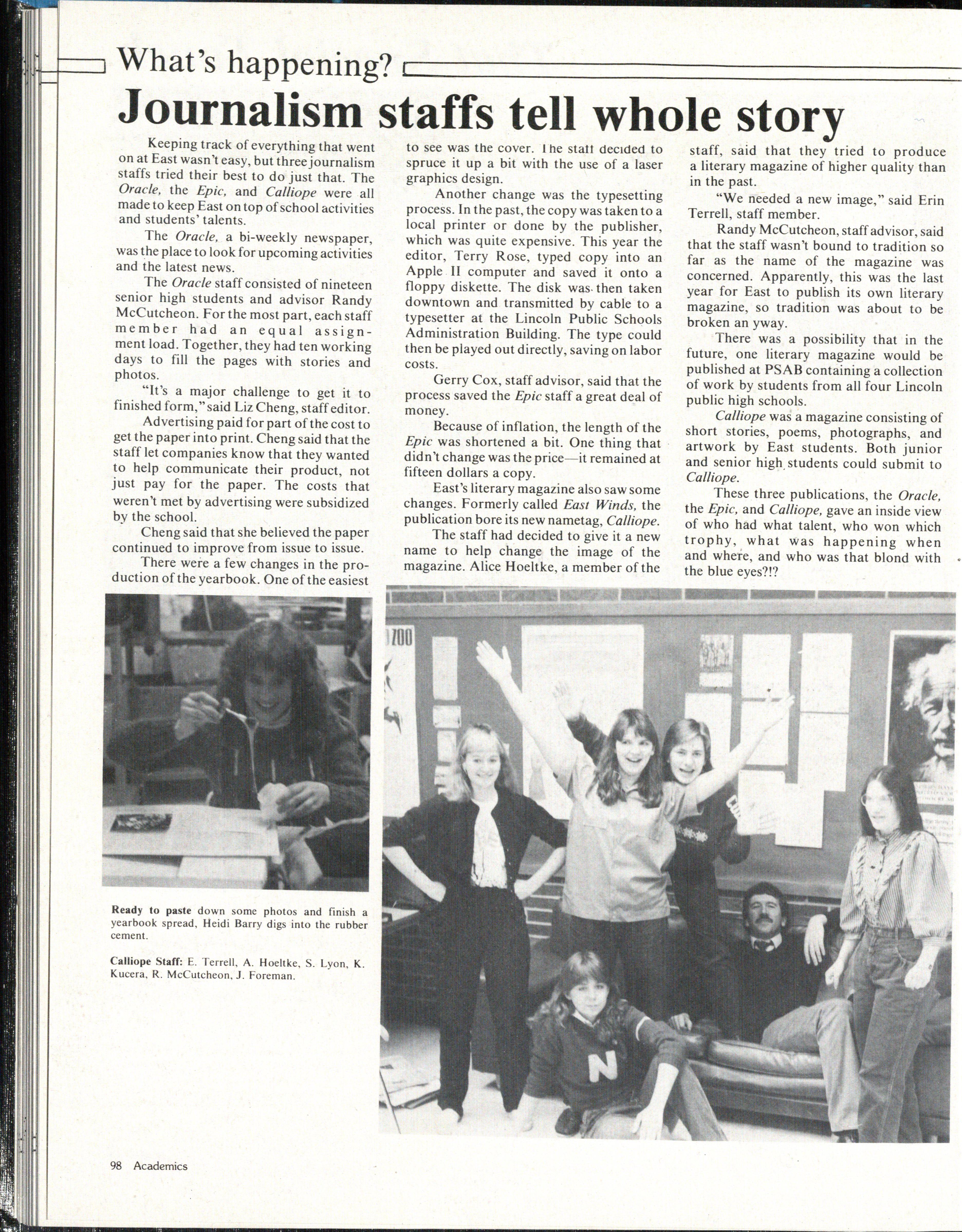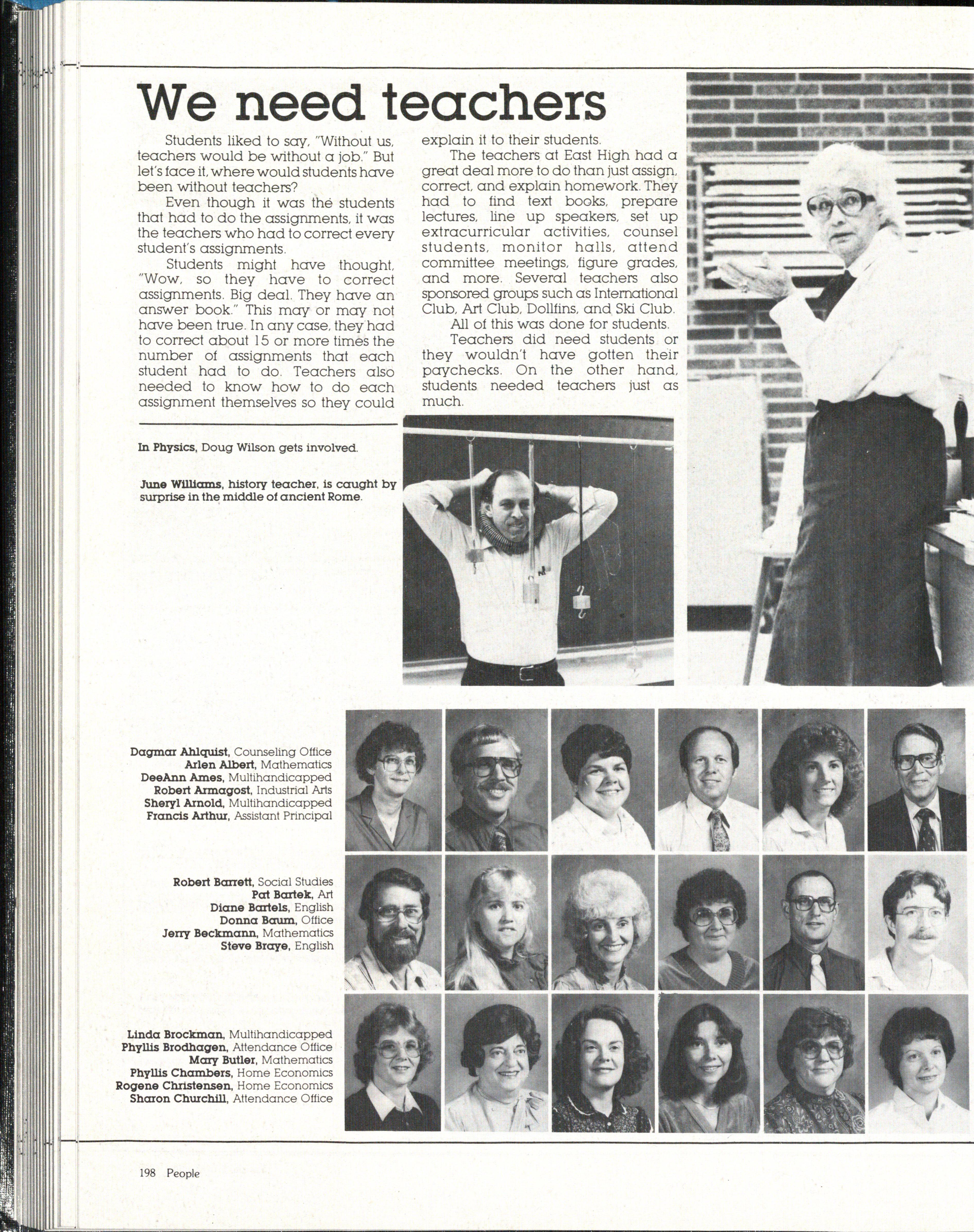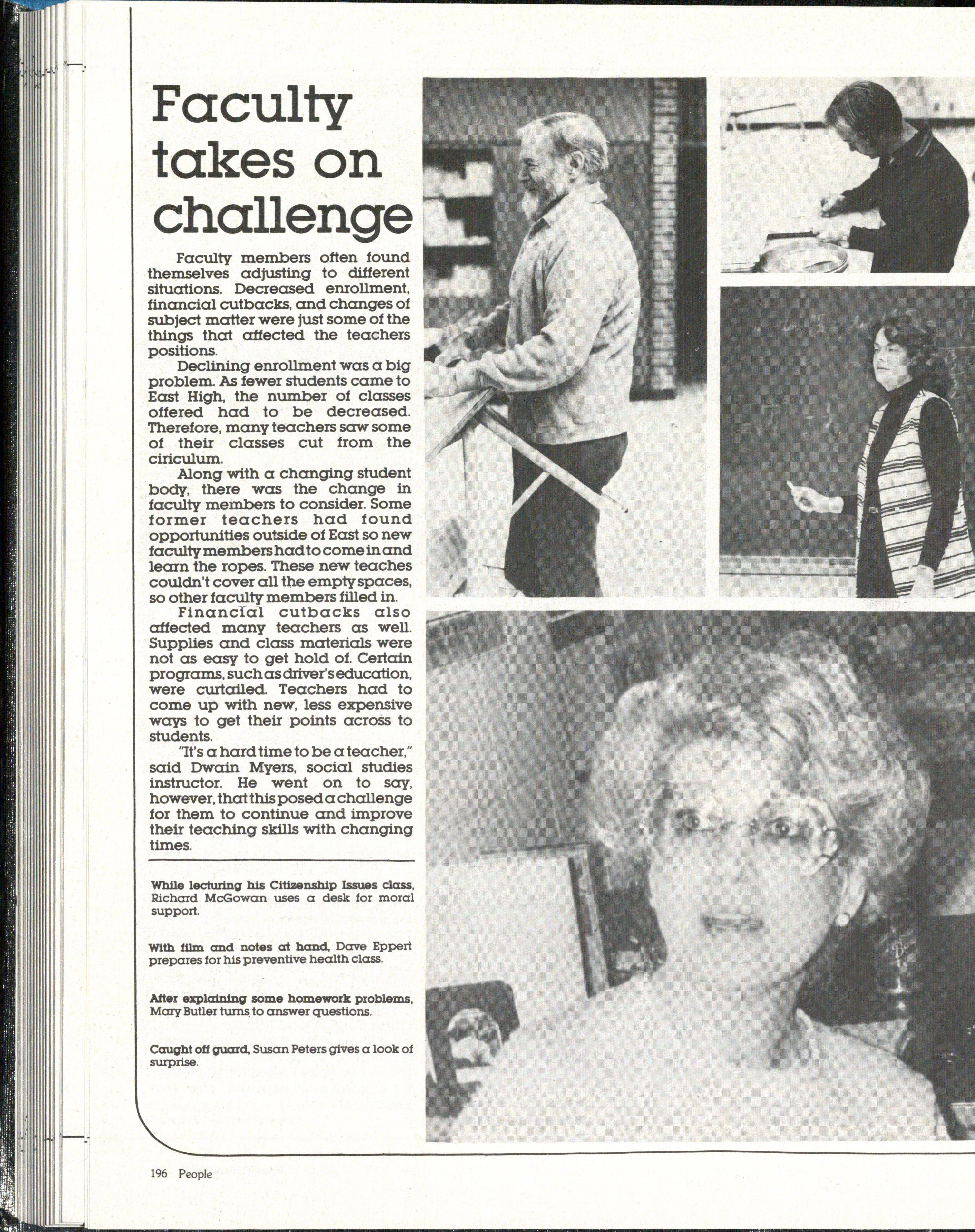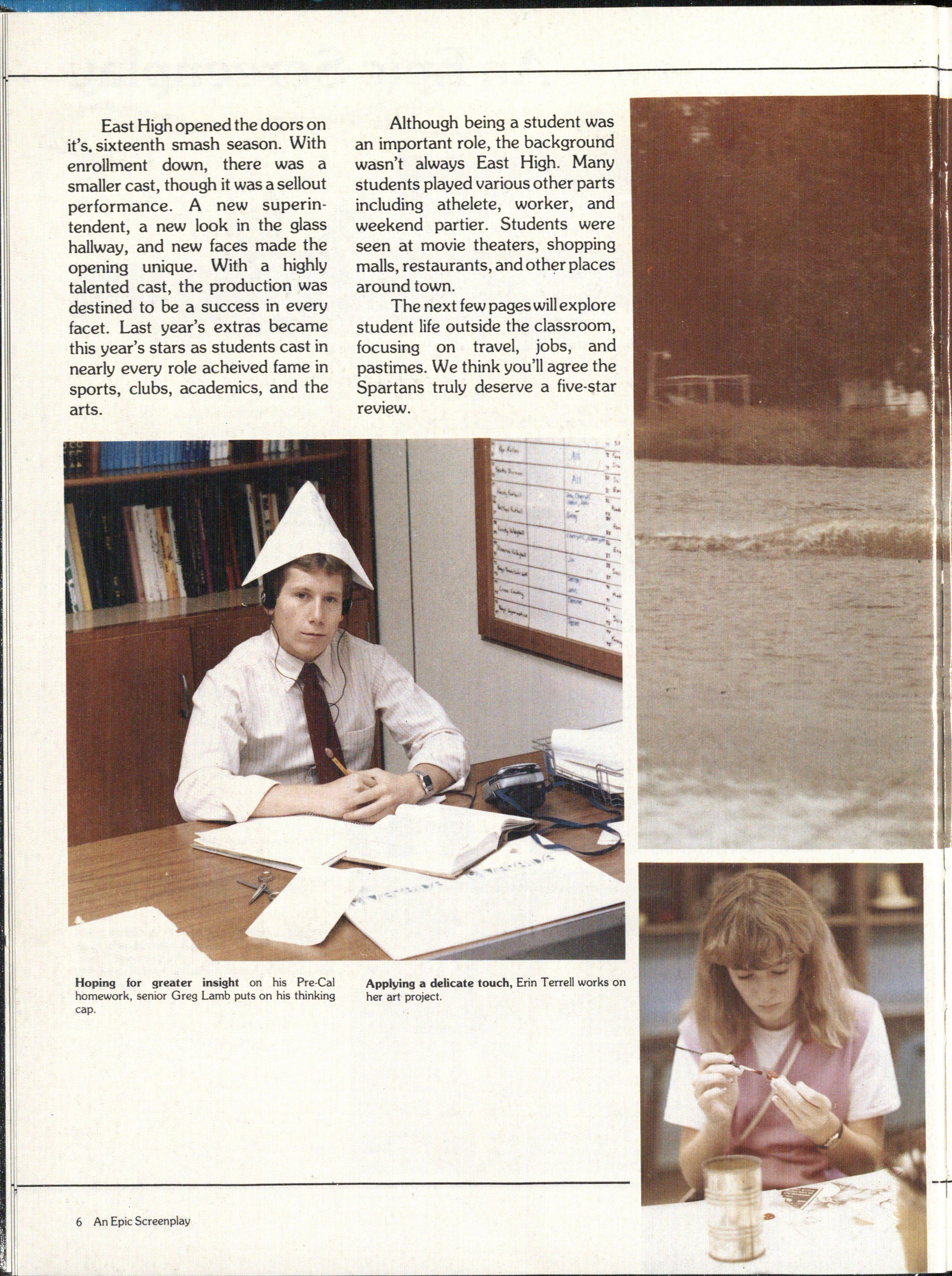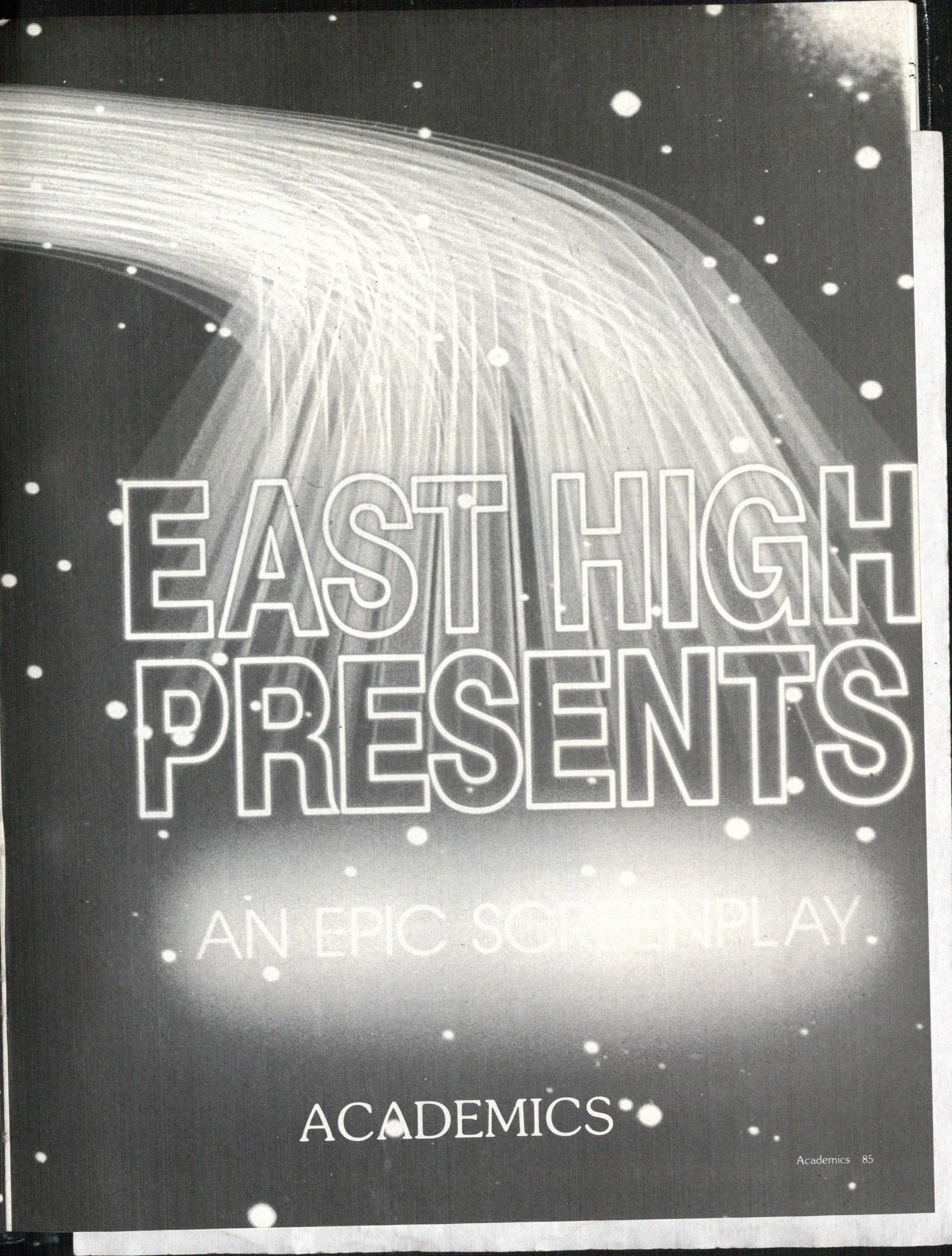East High opened the doors on it's. sixteenth smash season. With enrollment down, there was a smaller cast, though it was a sellout performance. A new superintendent, a new look in the glass hallway, and new faces made the opening unique. With a highly talented cast, the production was destined to be a success in every facet. Last year's extras became this year's stars as students cast in nearly every role acheived fame in sports, clubs, academics, and the arts.