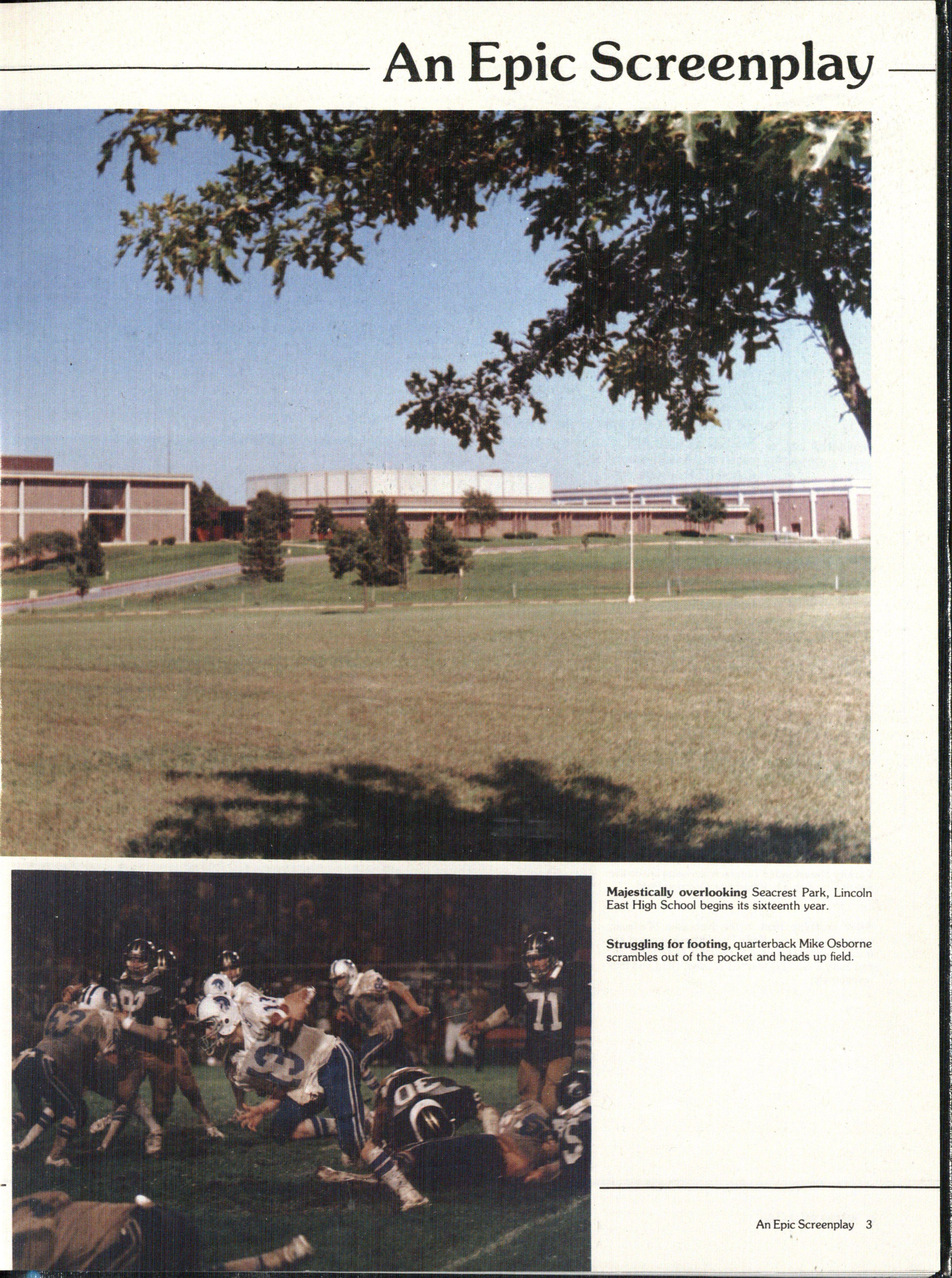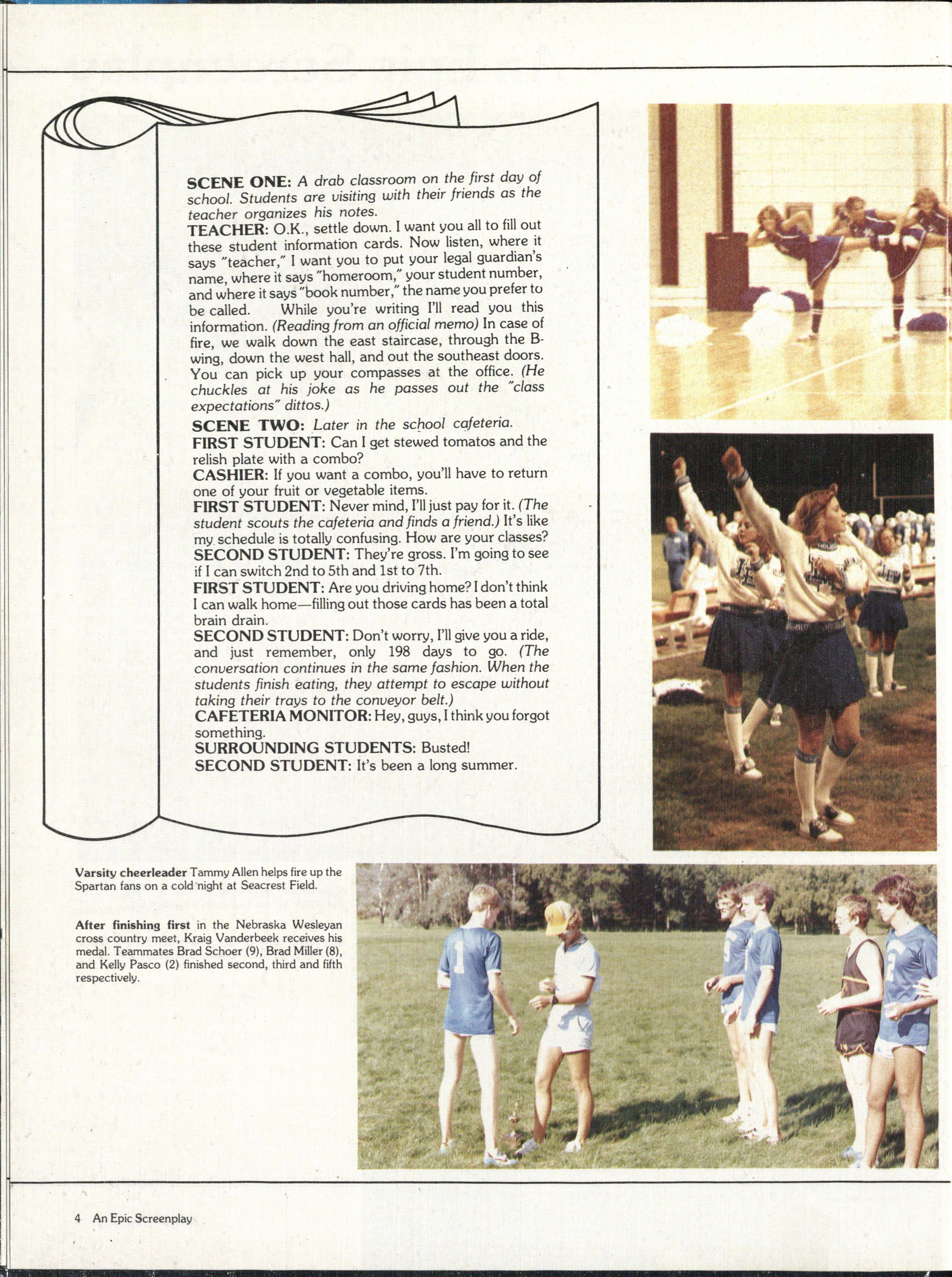 THE SETTING: (Fade in) A windowless bri c k building facing southward from atop a gradually sloping plateau of brown fields . On the southwest corner of the building the words "Lincoln East High School" are posted in large • silver lettering. This is the home of the Spartans Inside , along seemingly endless corr idors , numerous trophy cases are bursting with awards. Everywhere there is a flurry of activity , from the classrooms and labs to the stage and gymnasium . Most of the people are in their middle to late teens Some walk purposefully down the hall, others look confused. A student trips , dropping an unused spiral notebook , class schedule , and locker combination Another, looking at a clock in the hallway , sees it's 8 :05 and hurries to his first period class Turning the corner he notices an upstairs clock reads 9 :30 , and another down the hall shows 1:45 , then he smiles knowing that some things will never change. Friends gather by lockers to talk about the horrors of Calculus , Basic Studies , and Greco -Roman classes as well as the Friday night party after the football game Suddenly a tone sounds, meaningless to the uninitiated, but a horrifyingly significant cue for all who pleasurably loiter in the dim hallways. (Fade out)