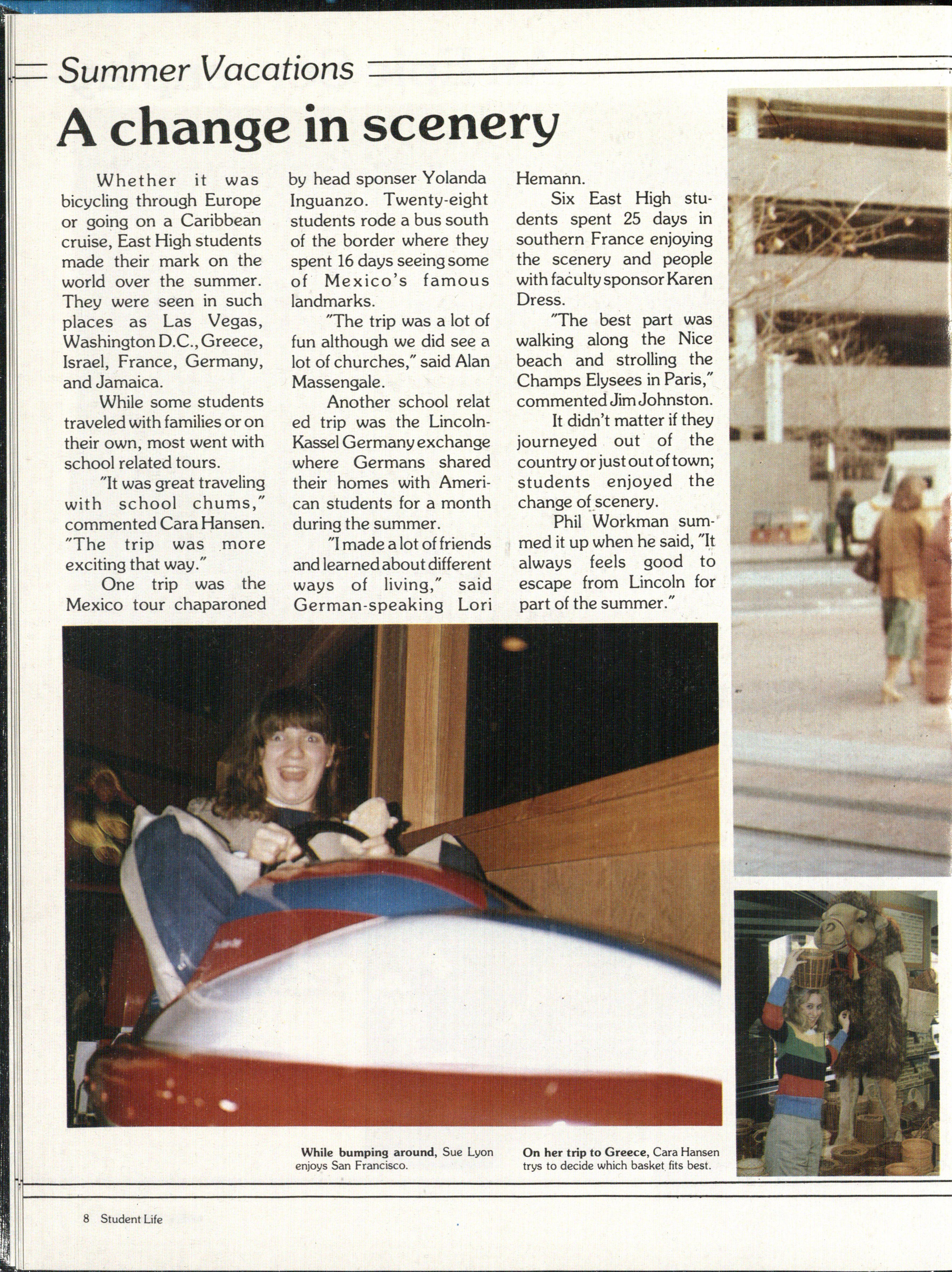 Whether it was bicycling through Europe or goi~g on a Caribbean cruise, East High students made their mark on the world over the summer. They were seen in such places as Las Vegas, Washington D.C., Greece, Israel, France, Germany, and Jamaica.