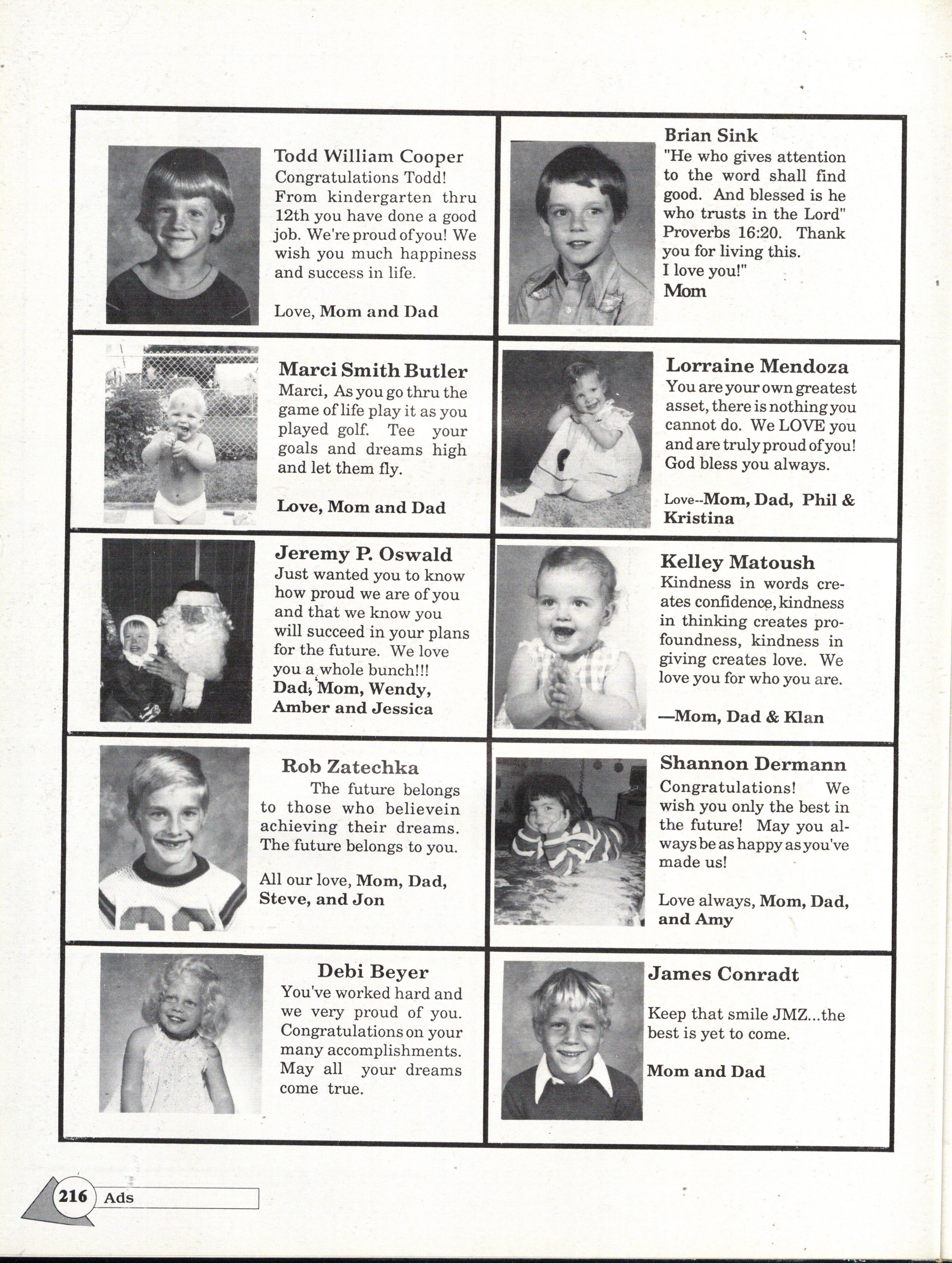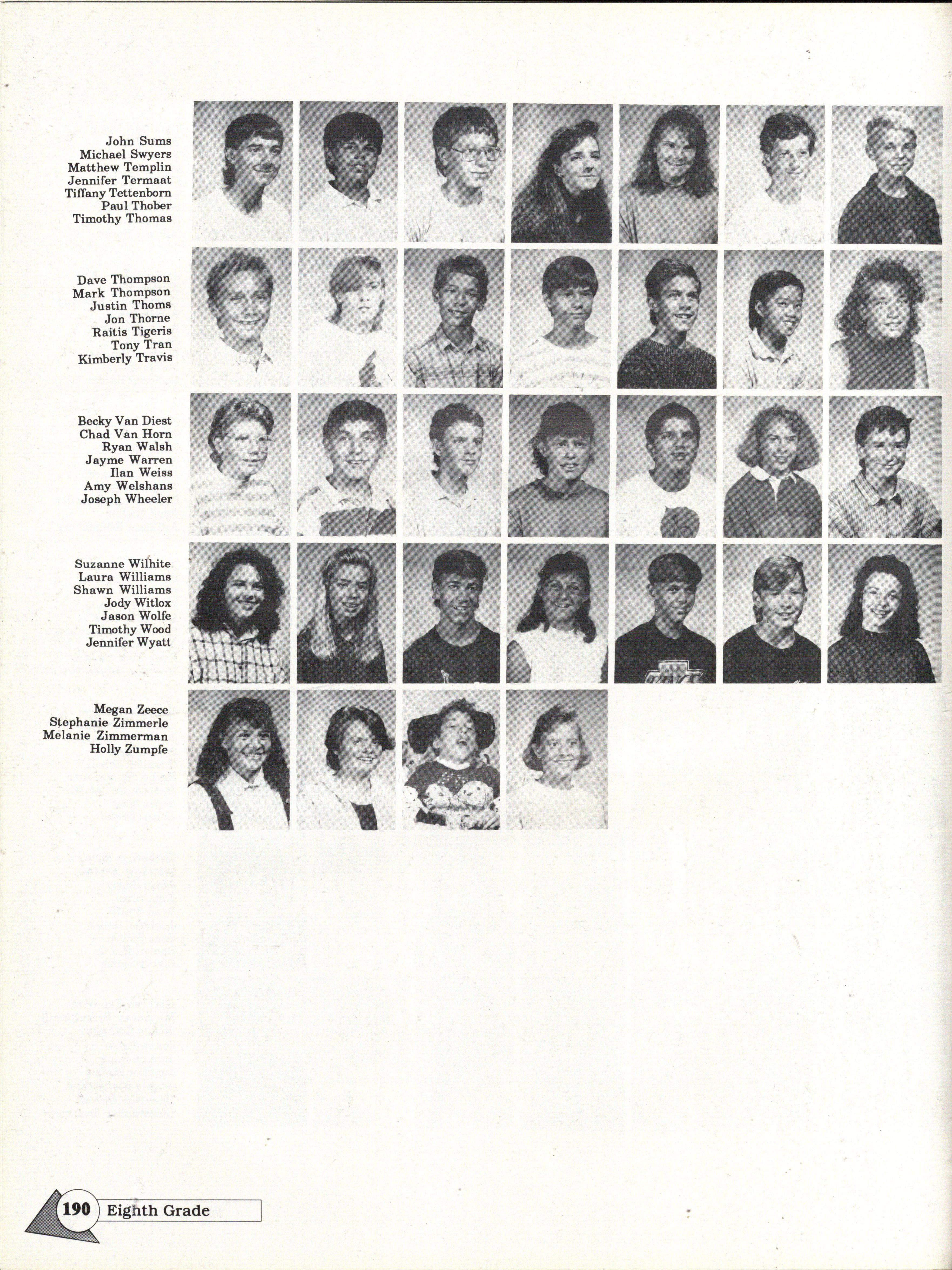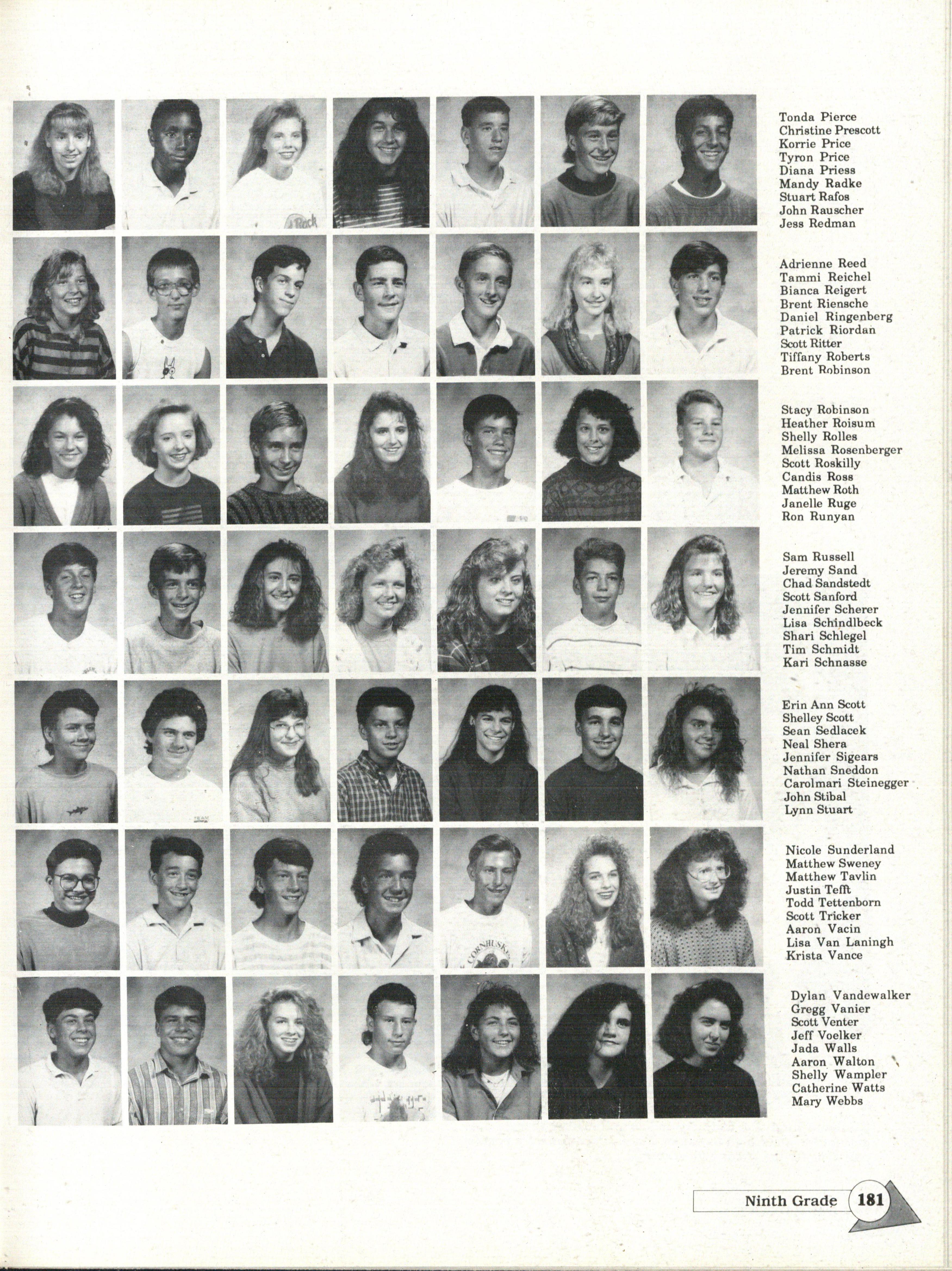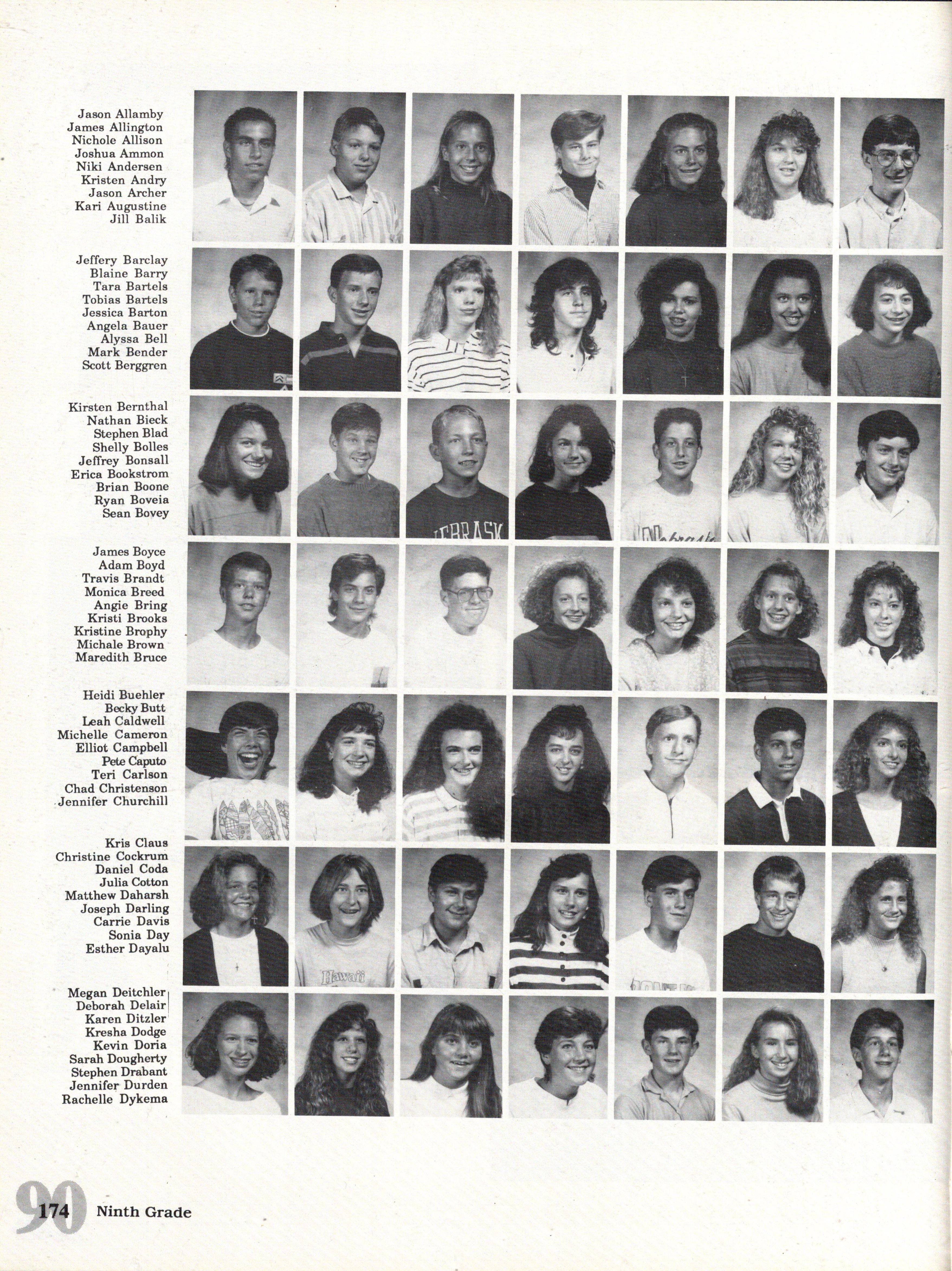 Spartans?? Not yet, but soon to be. These 9th graders from Culler, Steve Baker, Guy Mumford, Jon Squier, Todd Cooper, Matt Yost, Daren Hansen, Jim Edwards, and Mike Gruber proudly show off their basketball trophies. Andy Stock. SWEETTOREPEAT. IRATE Kerri Thomsen. MNSTRCKN, Plank, HICKMAN. YOUYOUPUTUPTHETENT HB, Pine Lake, Alleycats, Drool, Piddle, GUY.PROM?Slingin.A.C.A.G.S.O.AB. with Pee, Zrberts, SS, Sis, Chineseballs, TC, band nerd. Stretching strings. FJB C.H. Thumper, prom, "6-Pk"