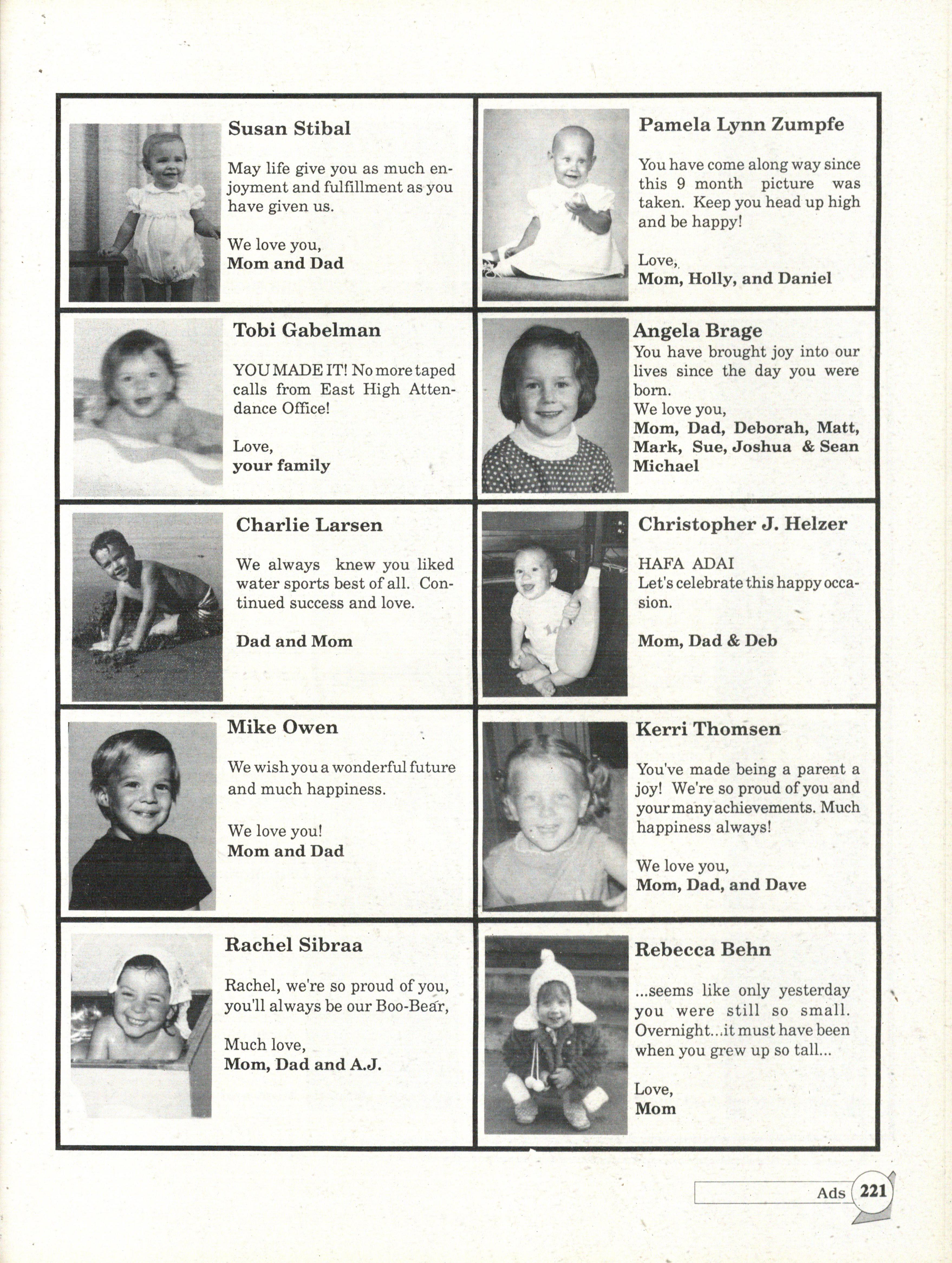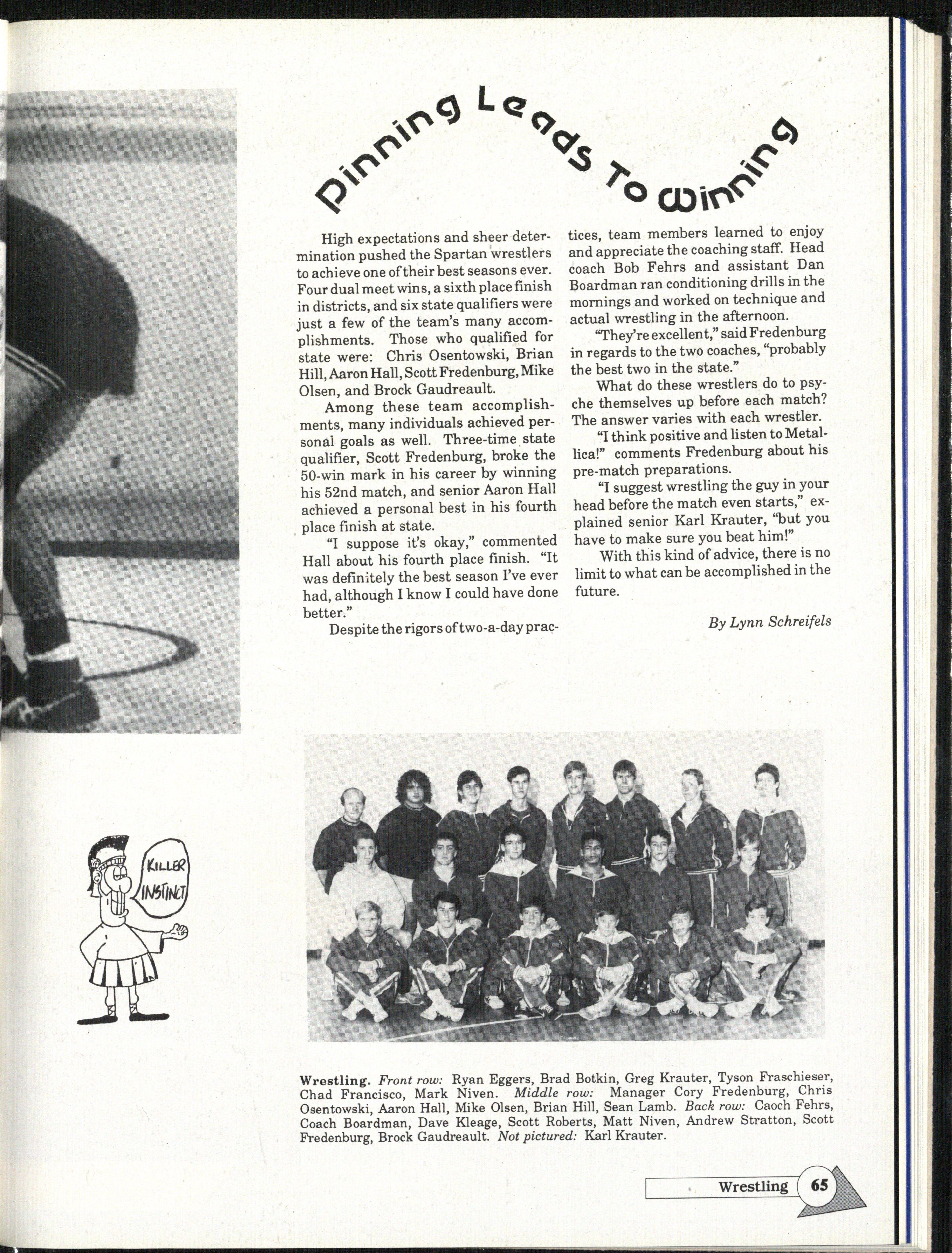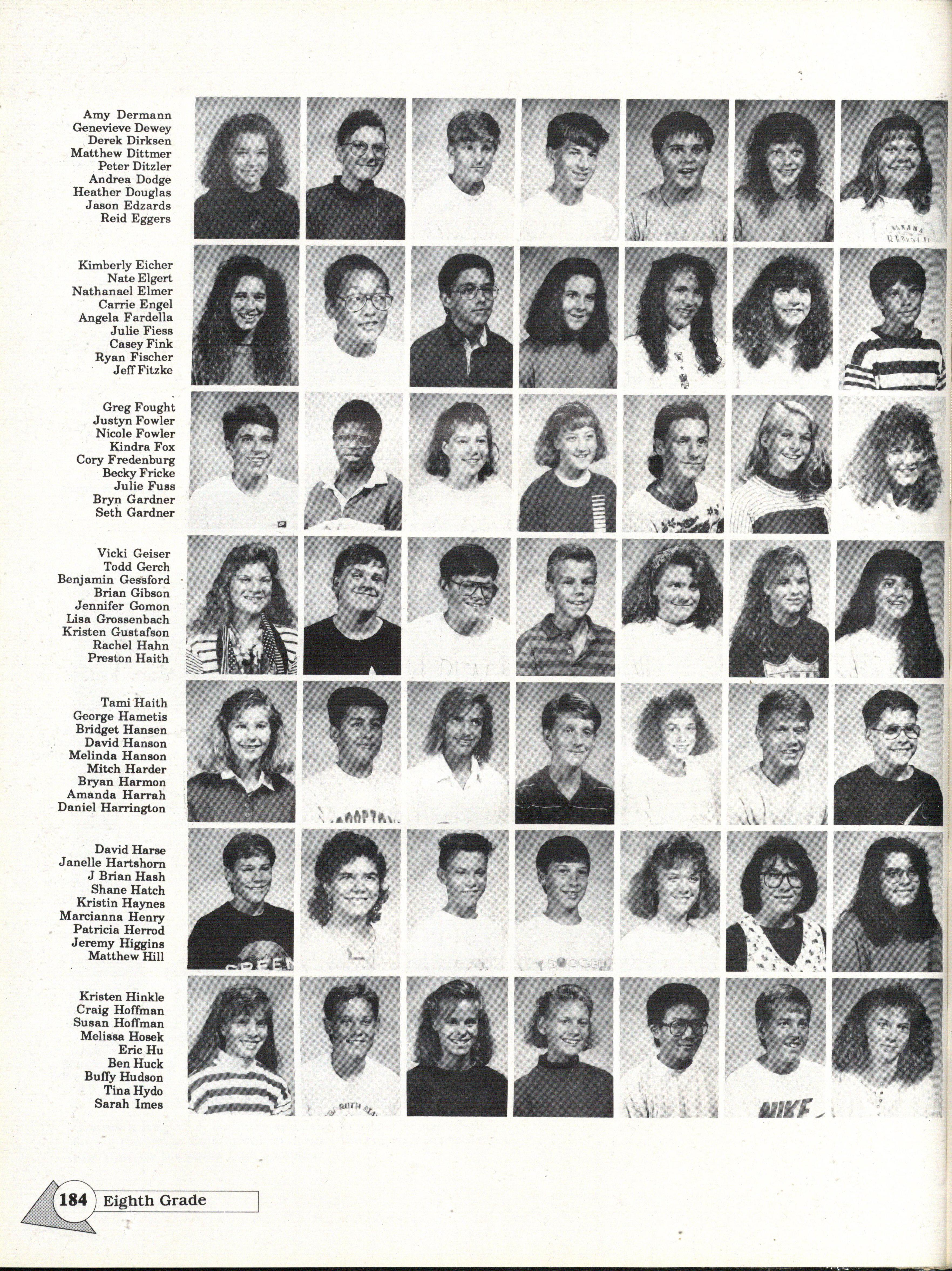 Spartans?? Not yet, but soon to be. These 9th graders from Culler, Steve Baker, Guy Mumford, Jon Squier, Todd Cooper, Matt Yost, Daren Hansen, Jim Edwards, and Mike Gruber proudly show off their basketball trophies. Andy Stock. SWEETTOREPEAT. IRATE Kerri Thomsen. MNSTRCKN, Plank, HICKMAN. YOUYOUPUTUPTHETENT HB, Pine Lake, Alleycats, Drool, Piddle, GUY.PROM?Slingin.A.C.A.G.S.O.AB. with Pee, Zrberts, SS, Sis, Chineseballs, TC, band nerd. Stretching strings. FJB C.H. Thumper, prom, "6-Pk"