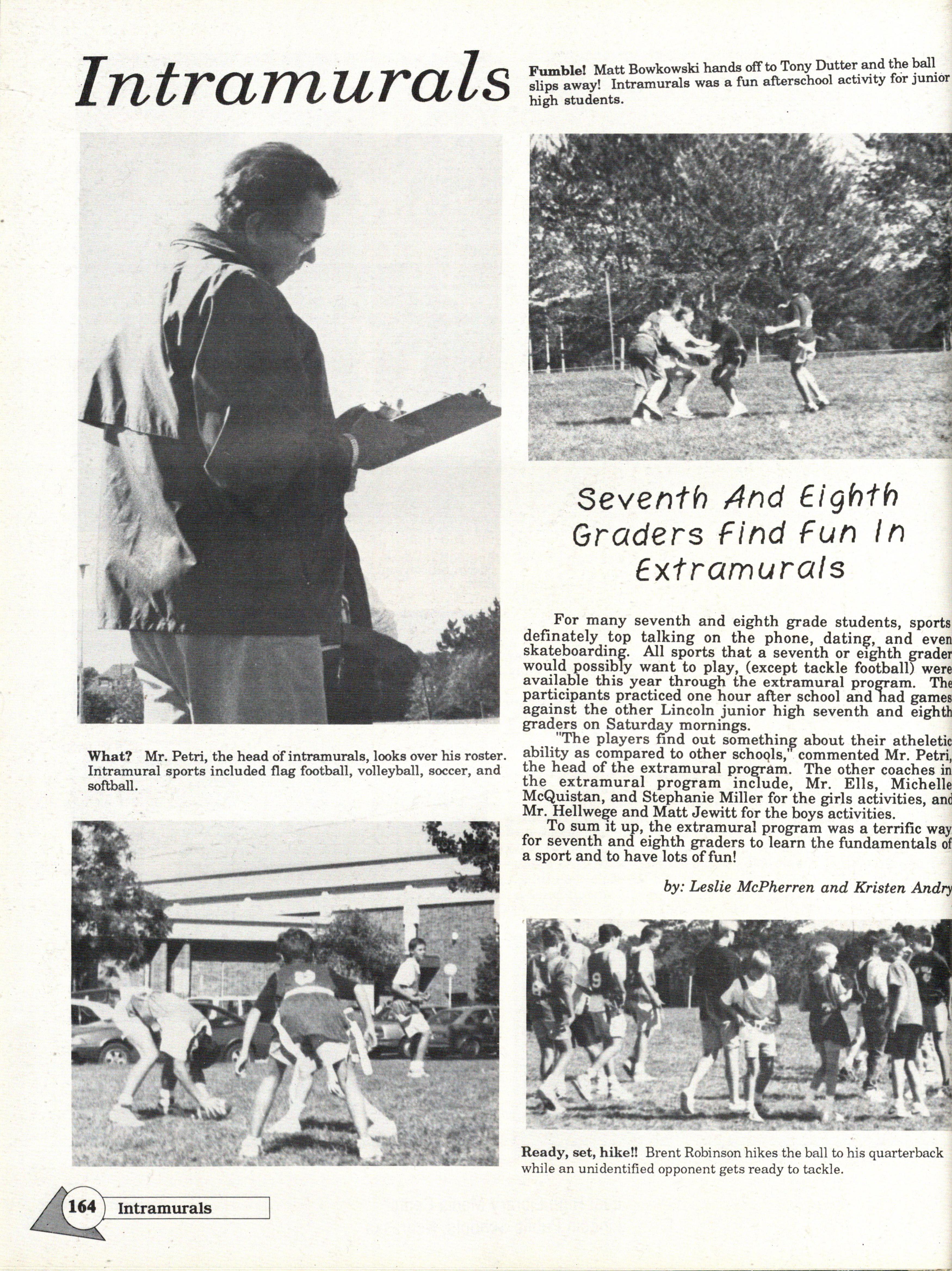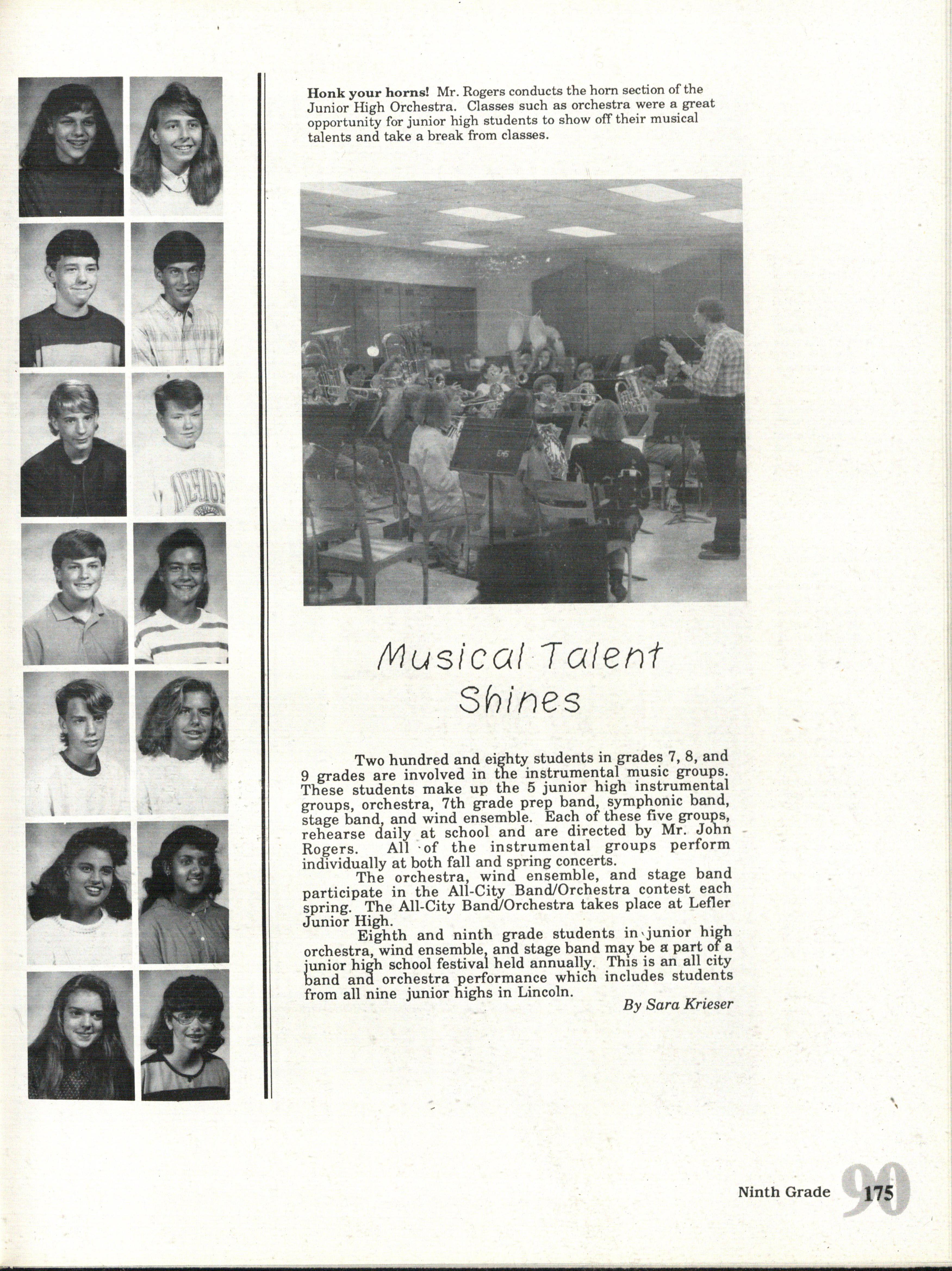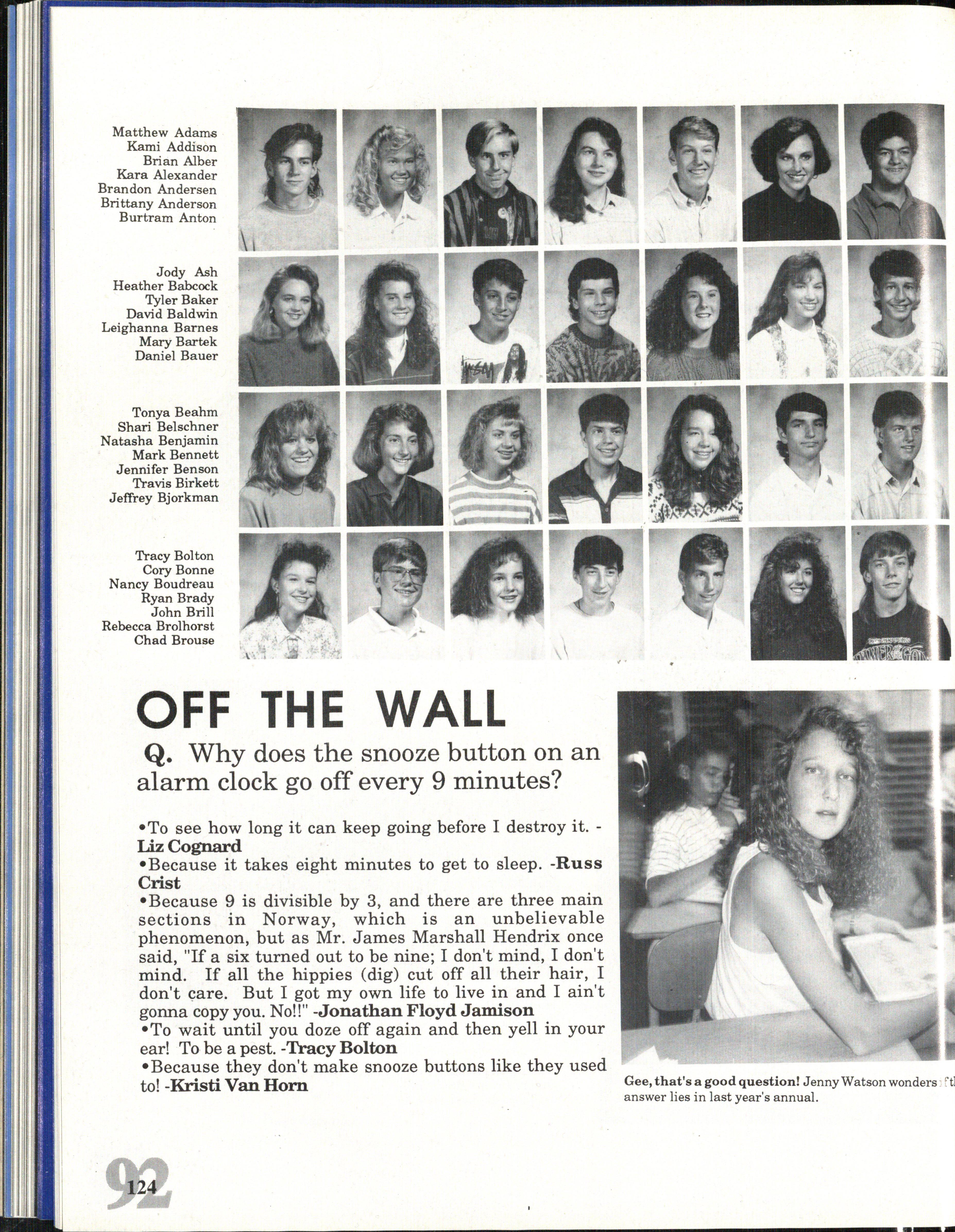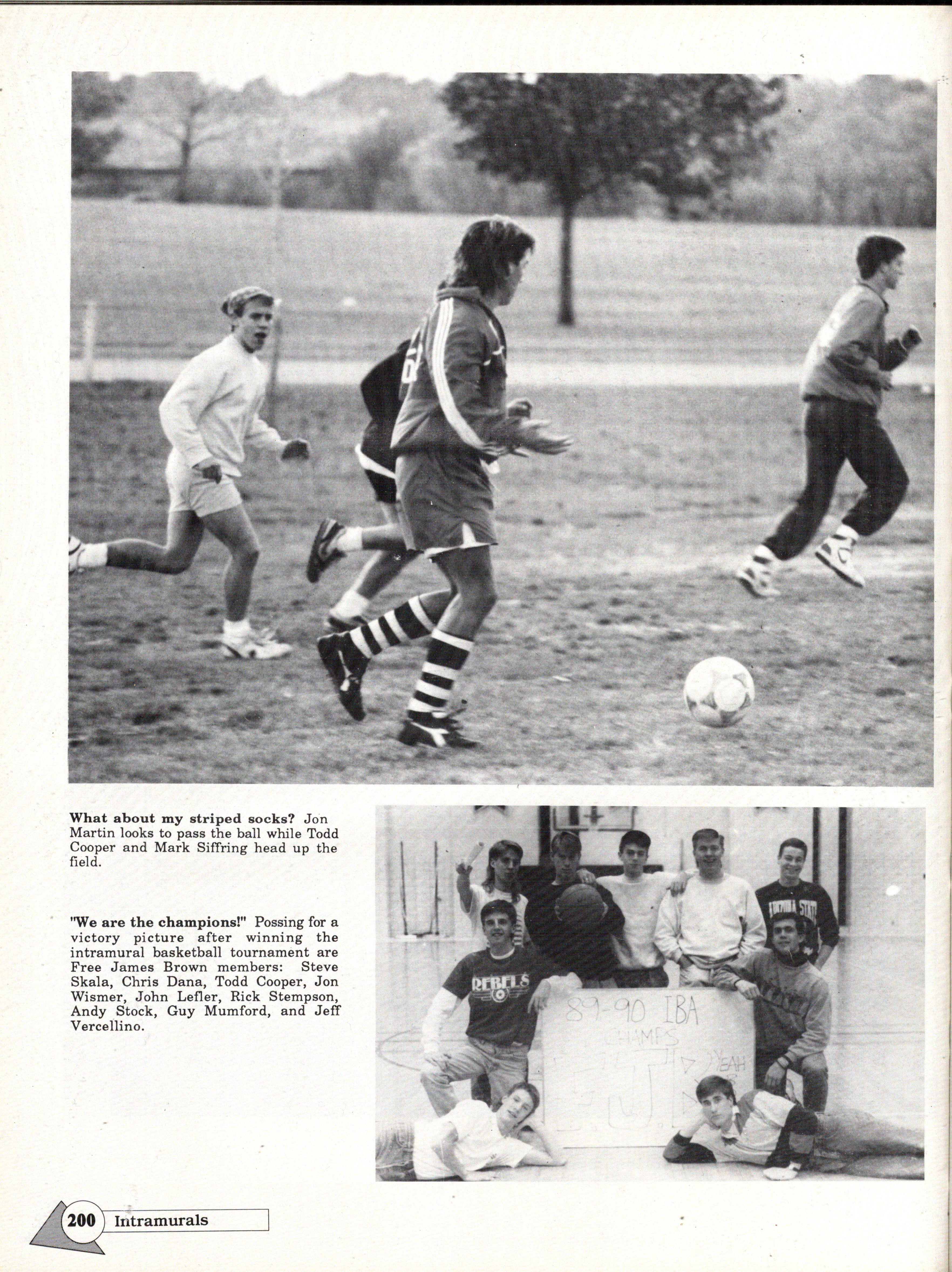Spartans?? Not yet, but soon to be. These 9th graders from Culler, Steve Baker, Guy Mumford, Jon Squier, Todd Cooper, Matt Yost, Daren Hansen, Jim Edwards, and Mike Gruber proudly show off their basketball trophies. Andy Stock. SWEETTOREPEAT. IRATE Kerri Thomsen. MNSTRCKN, Plank, HICKMAN. YOUYOUPUTUPTHETENT HB, Pine Lake, Alleycats, Drool, Piddle, GUY.PROM?Slingin.A.C.A.G.S.O.AB. with Pee, Zrberts, SS, Sis, Chineseballs, TC, band nerd. Stretching strings. FJB C.H. Thumper, prom, "6-Pk"