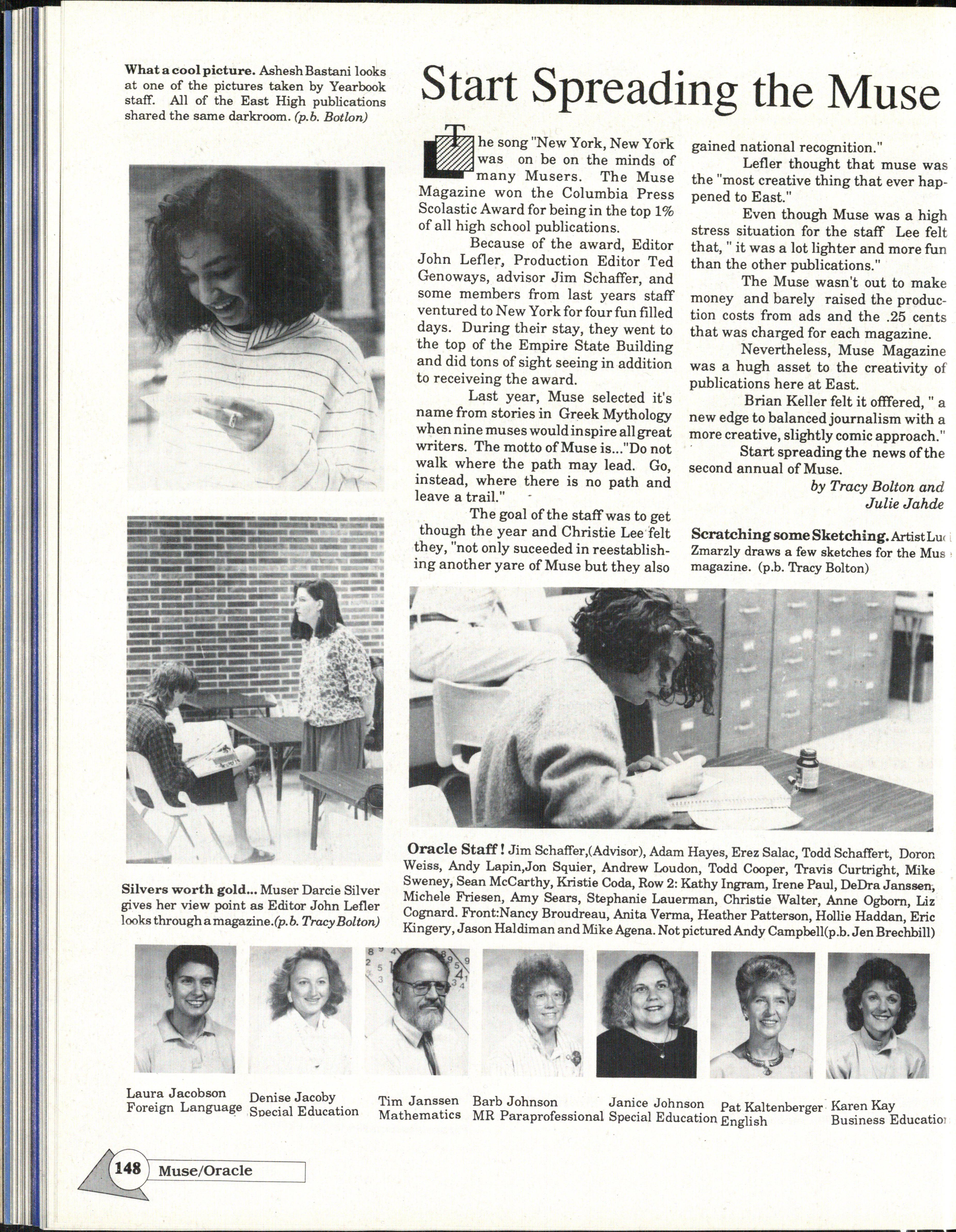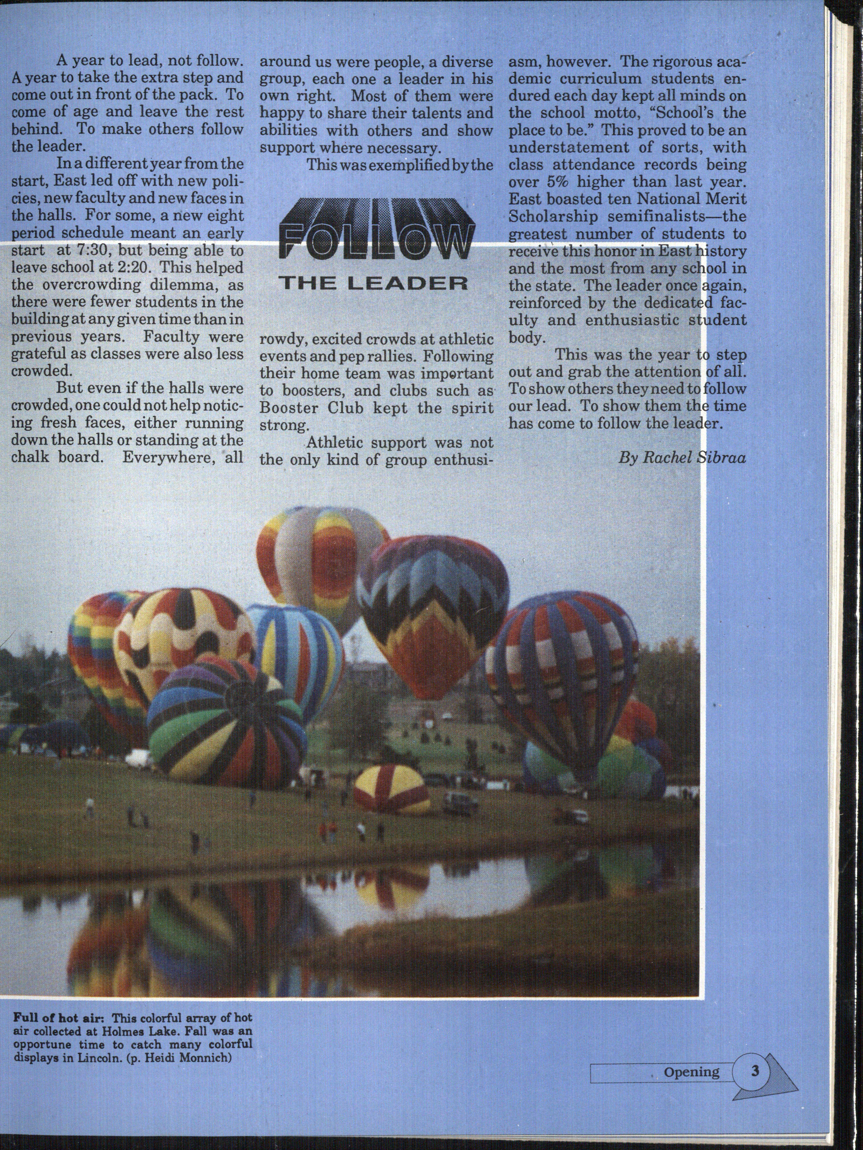 Leading the way once again, the East High Epic staff turned a year to remember into a book to serve that purpose--remembering. This would not have been possible without the help and undying patience of Walsworth representative Mike Diffenderfer and the company, Walsworth Publishing in Marceline, Missouri. Type for "Follow the Leader" was set in New Century Schoolbook, with body copy at ten point and captions at eight point. The theme, "Follow the Leader" was chosen by the entire staff and developed by Editors .Rachel Sibraa, Sejal Patel and Design Editor Andrea Woodburn. Copy on the division pages was written by Rachel Sibraa and Sejal Patel and design was by Andrea Woodburn. A big thanks to Mr Schaffer . for his eternal patience and support throughout the entire ·year!