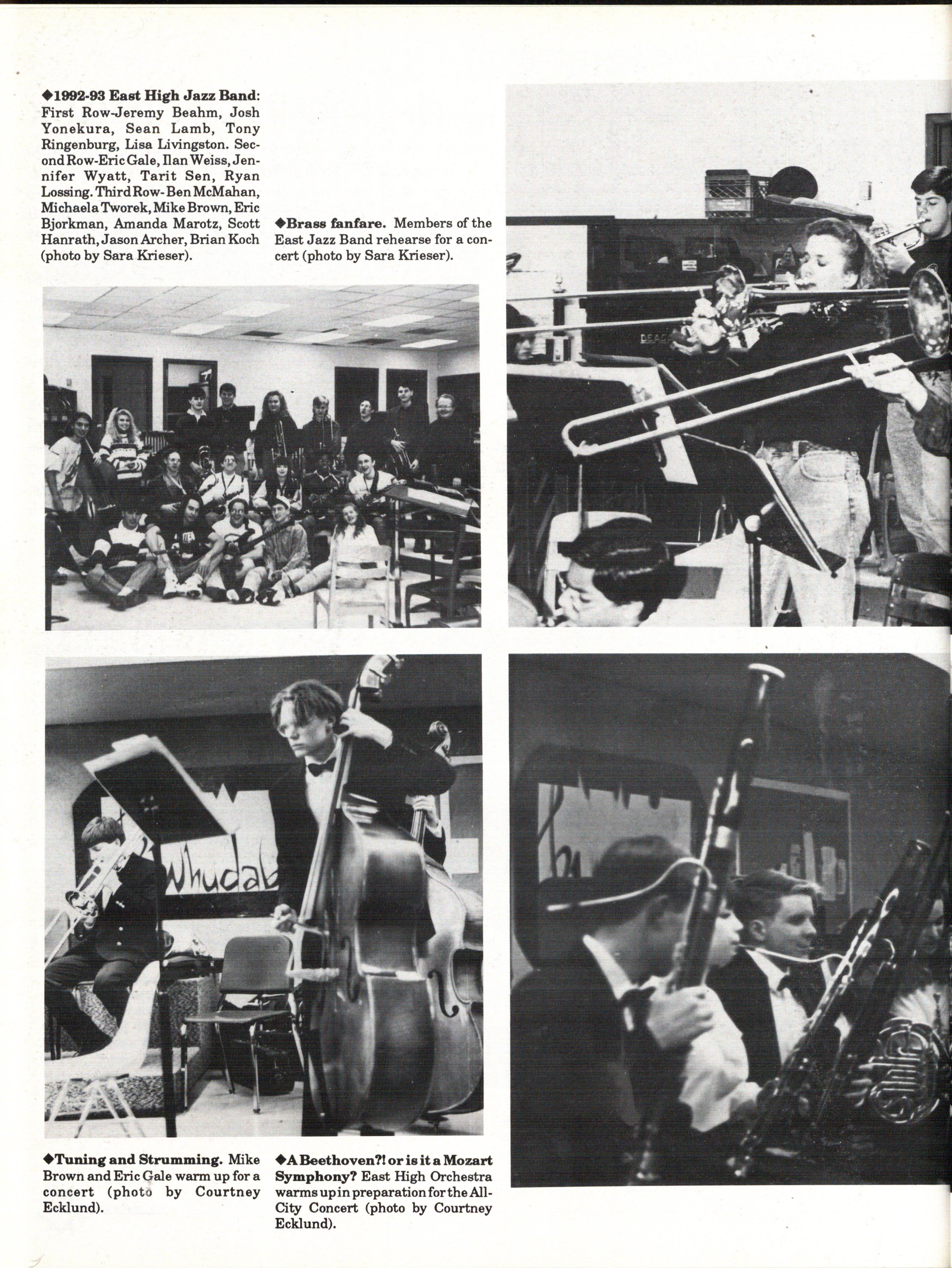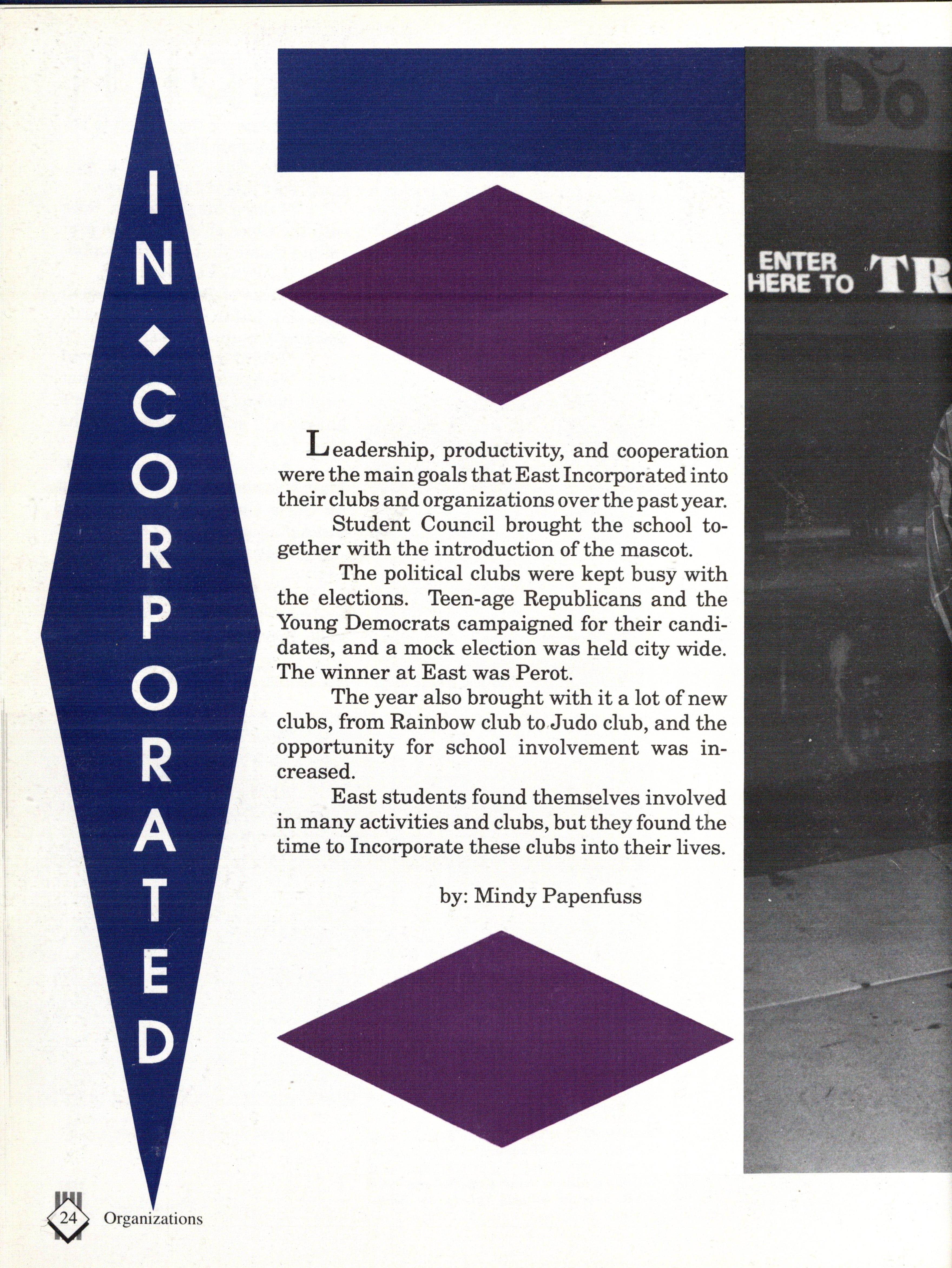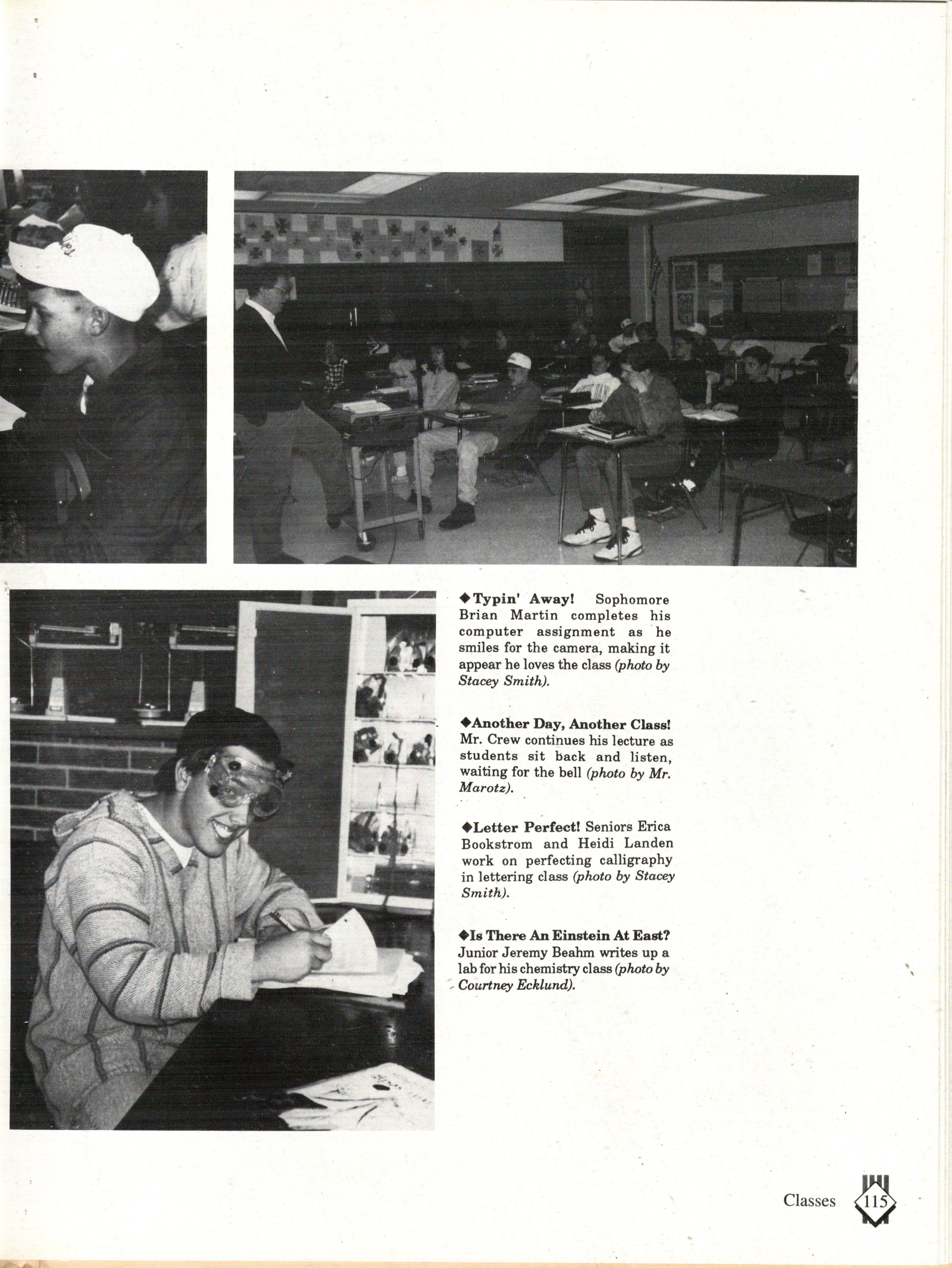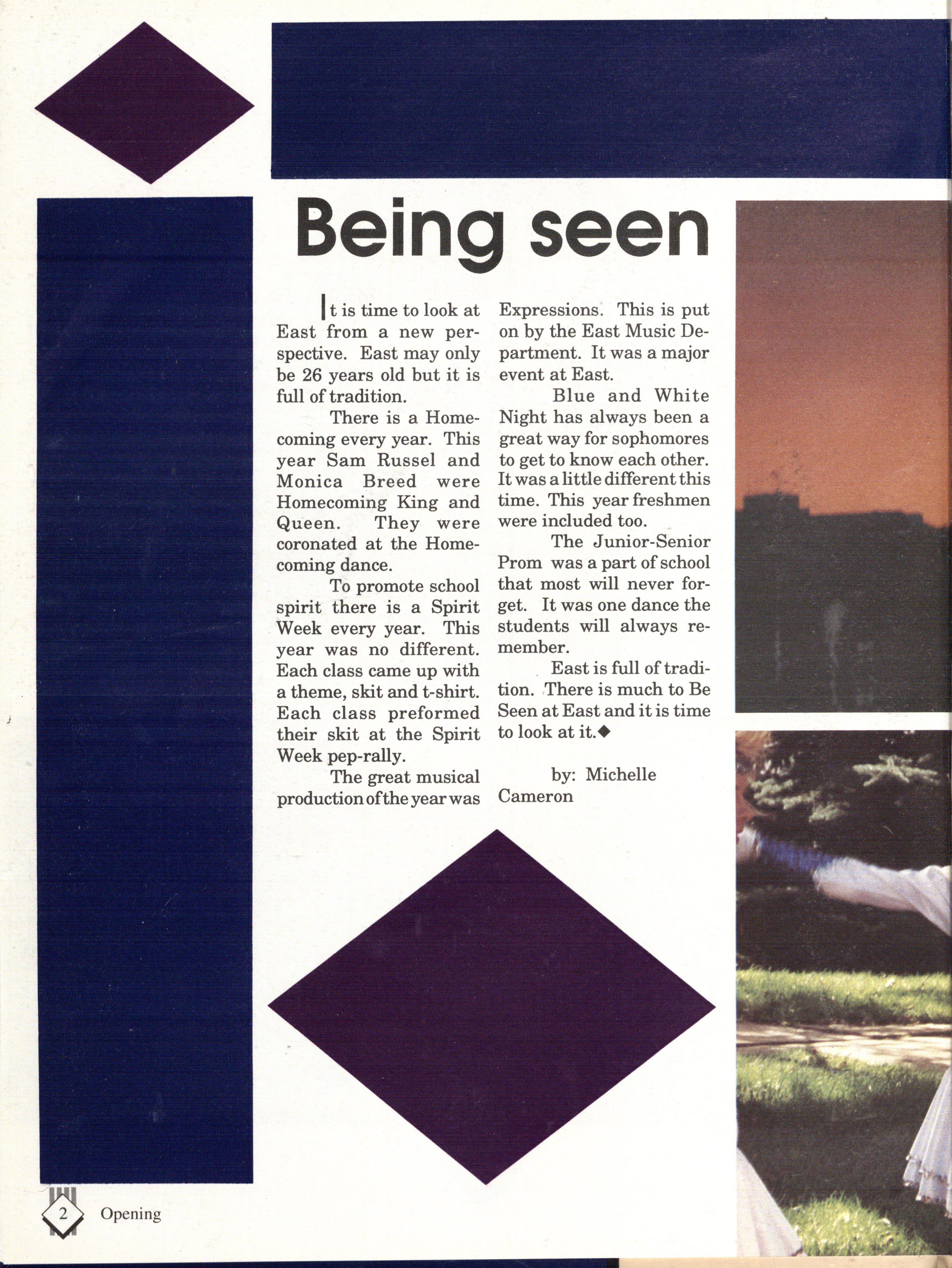 Although the appearence of East contributed to our color, the mixture of attitudes and personalities was what really made East colorful. Some have said that East is sheltered from the real world, but the students who walked East's halls on a daily basis knew otherwise. During the course of a student's life at East, you are exposed to a wide variety of people, situations and activities.