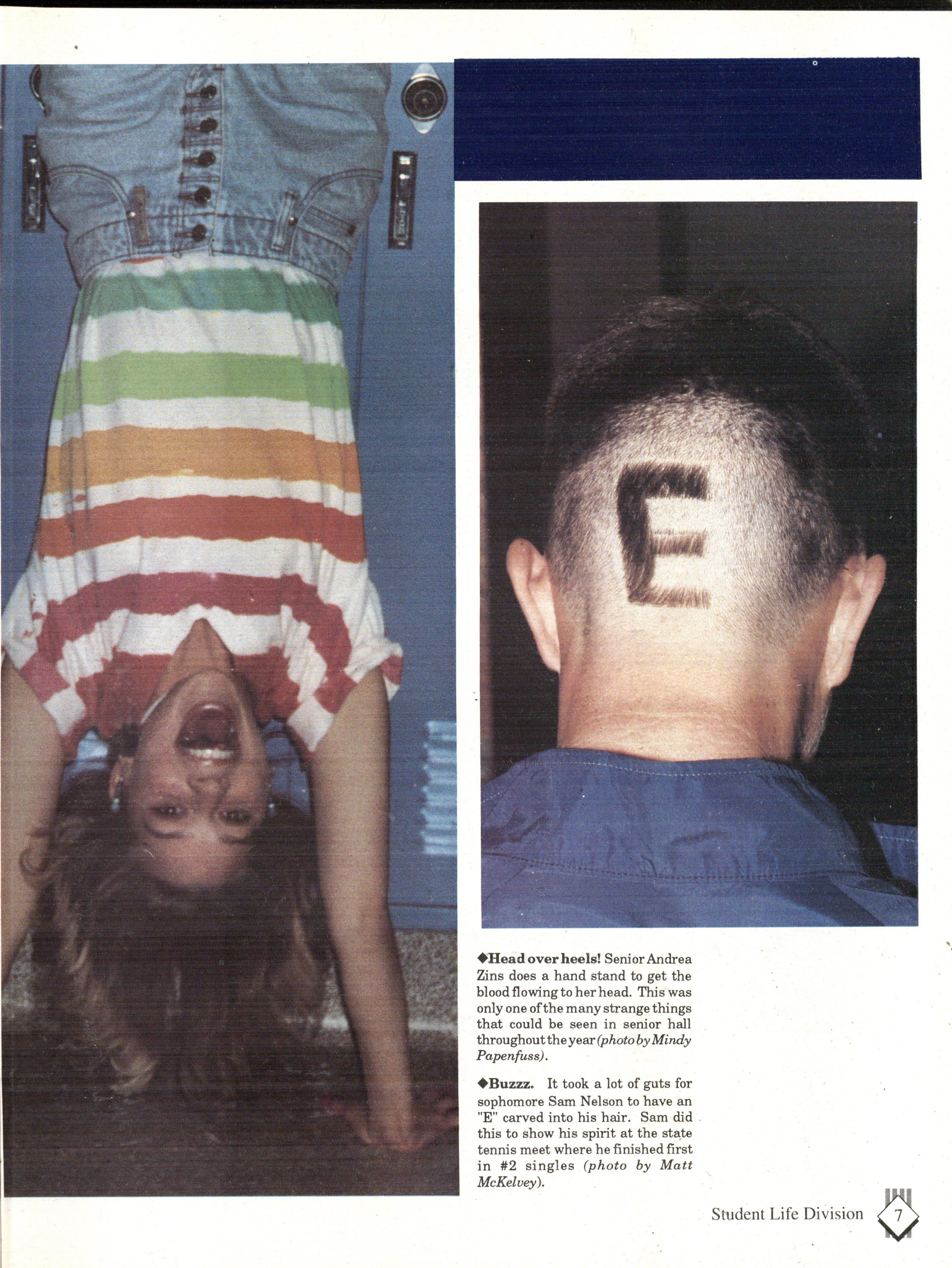 It took a lot of guts for sophomore Sam Nelson to have an "E" carved into his hair. Sam did this to show his spirit at the st~te tennis meet where he finished first in #2 singles (photo by Matt McKeluey).