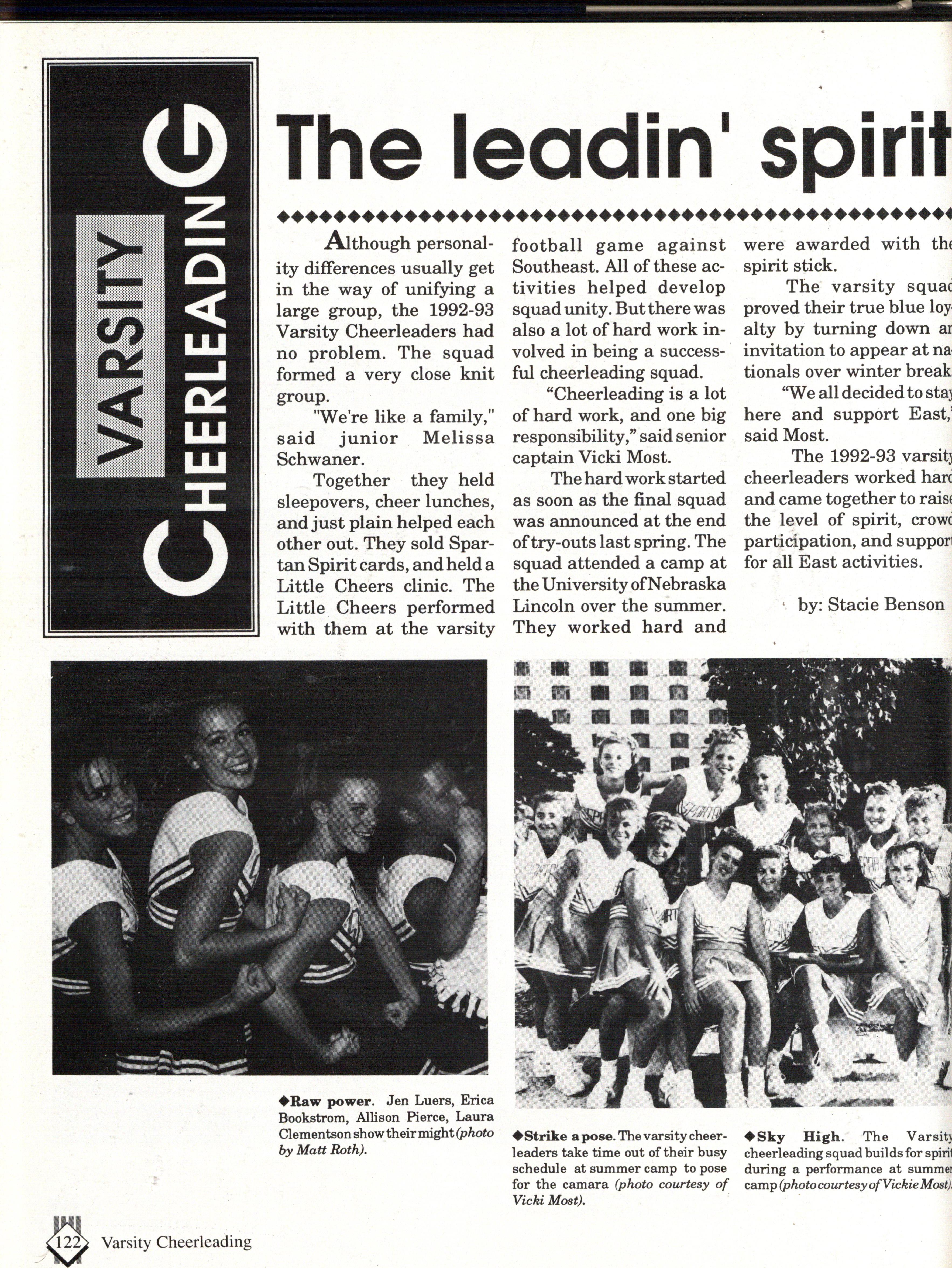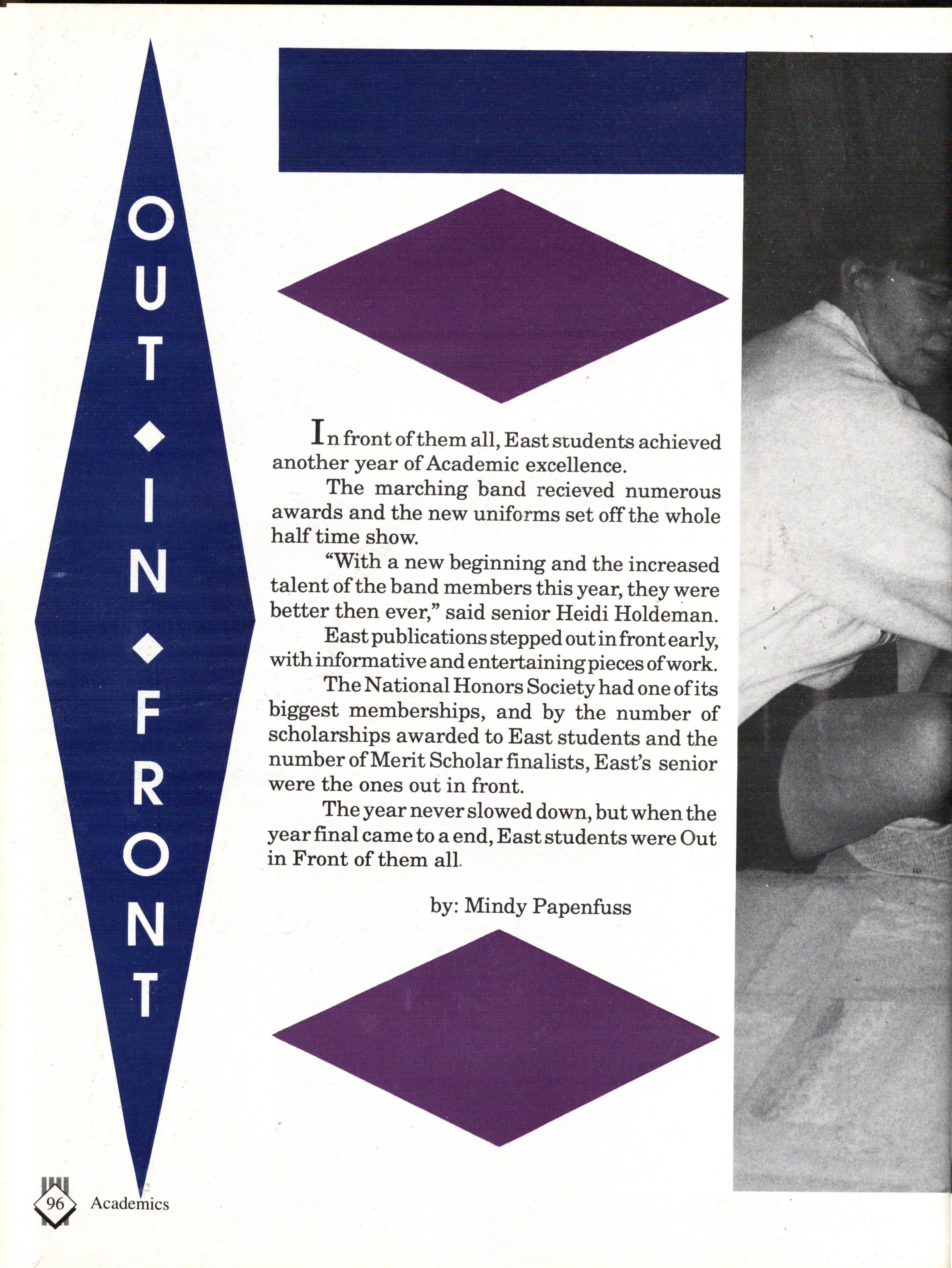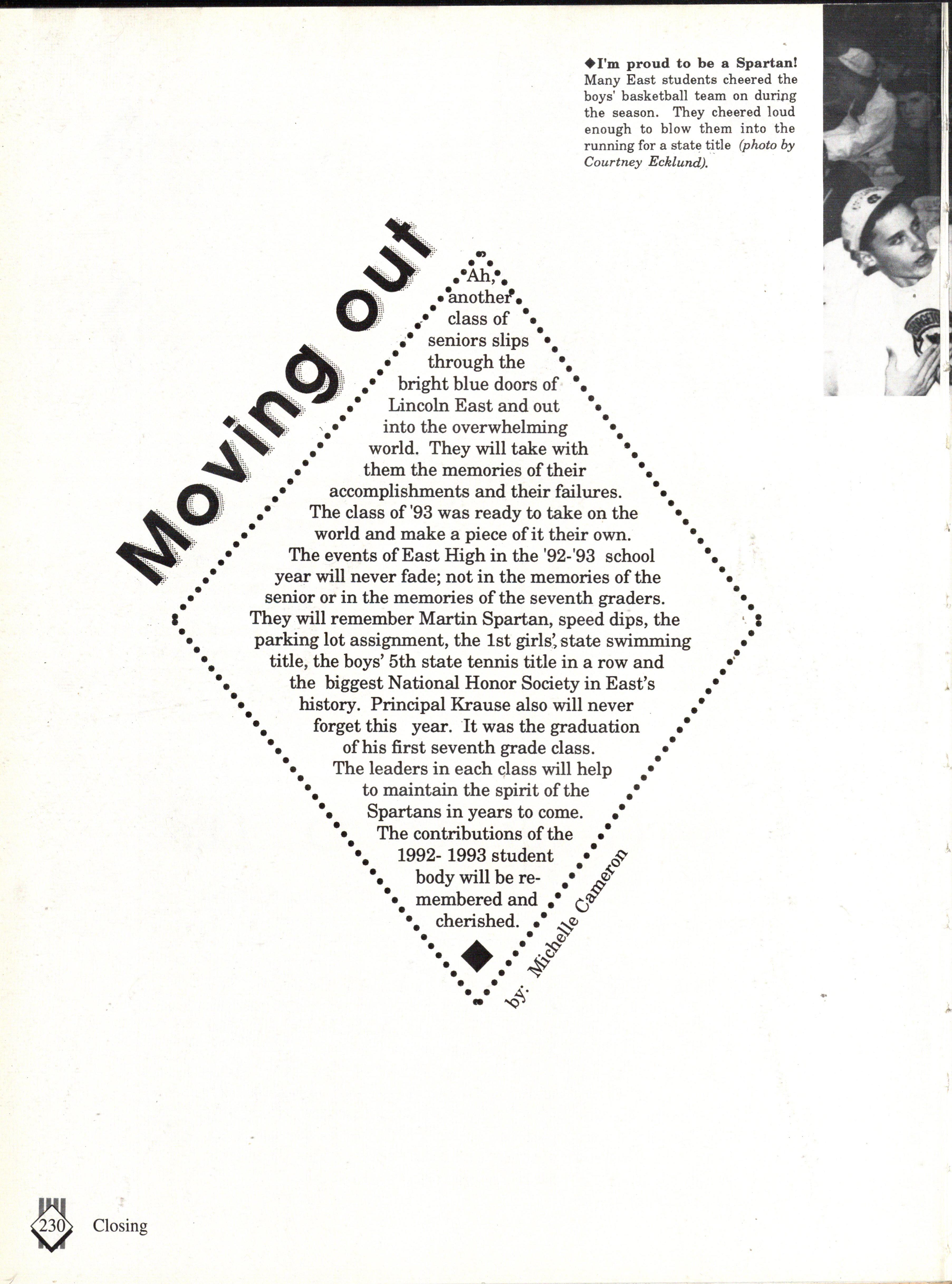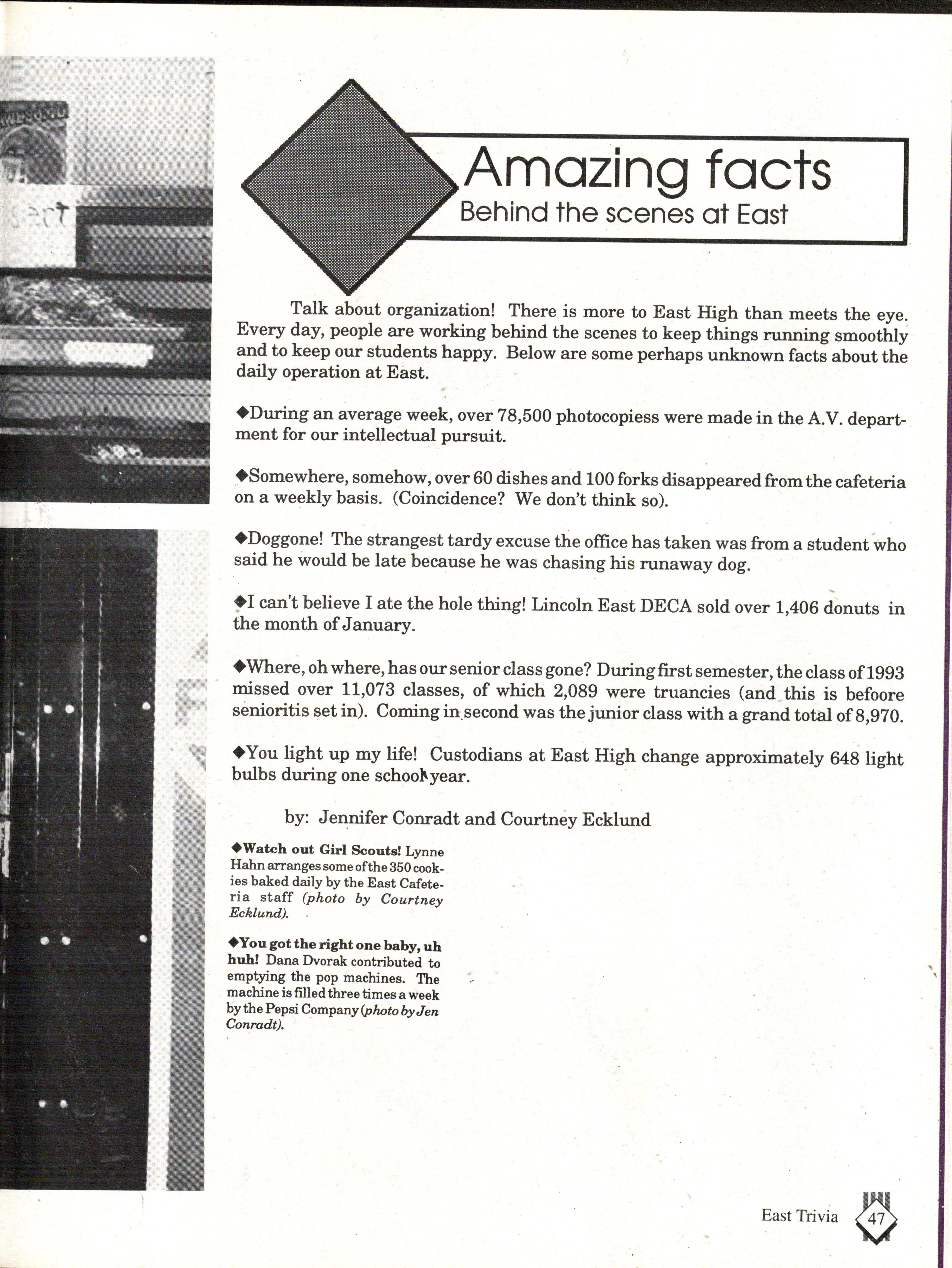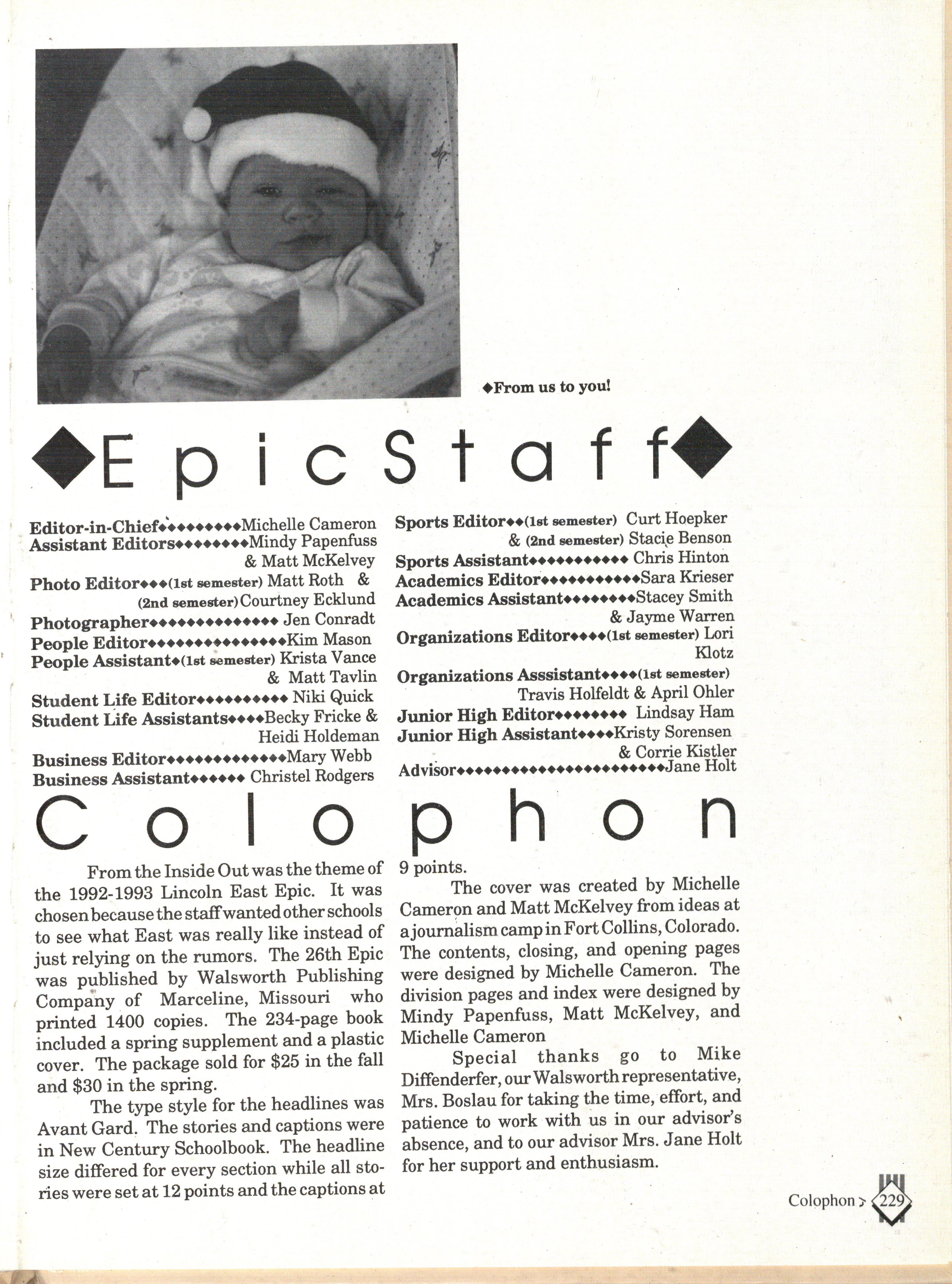 From the Inside Out was the theme of the 1992-1993 Lincoln East Epic. It was chosen because the staffwanted other schools to see what East was really like instead of just relying on the rumors. The 26th Epic was published by Walsworth Publishing 1 Company . of Marceline, Missouri who printed 1400 copies. The 234-page book included a spring supplement and a plastic cover. The package sold for $25 in the fall and $30 in the spring.