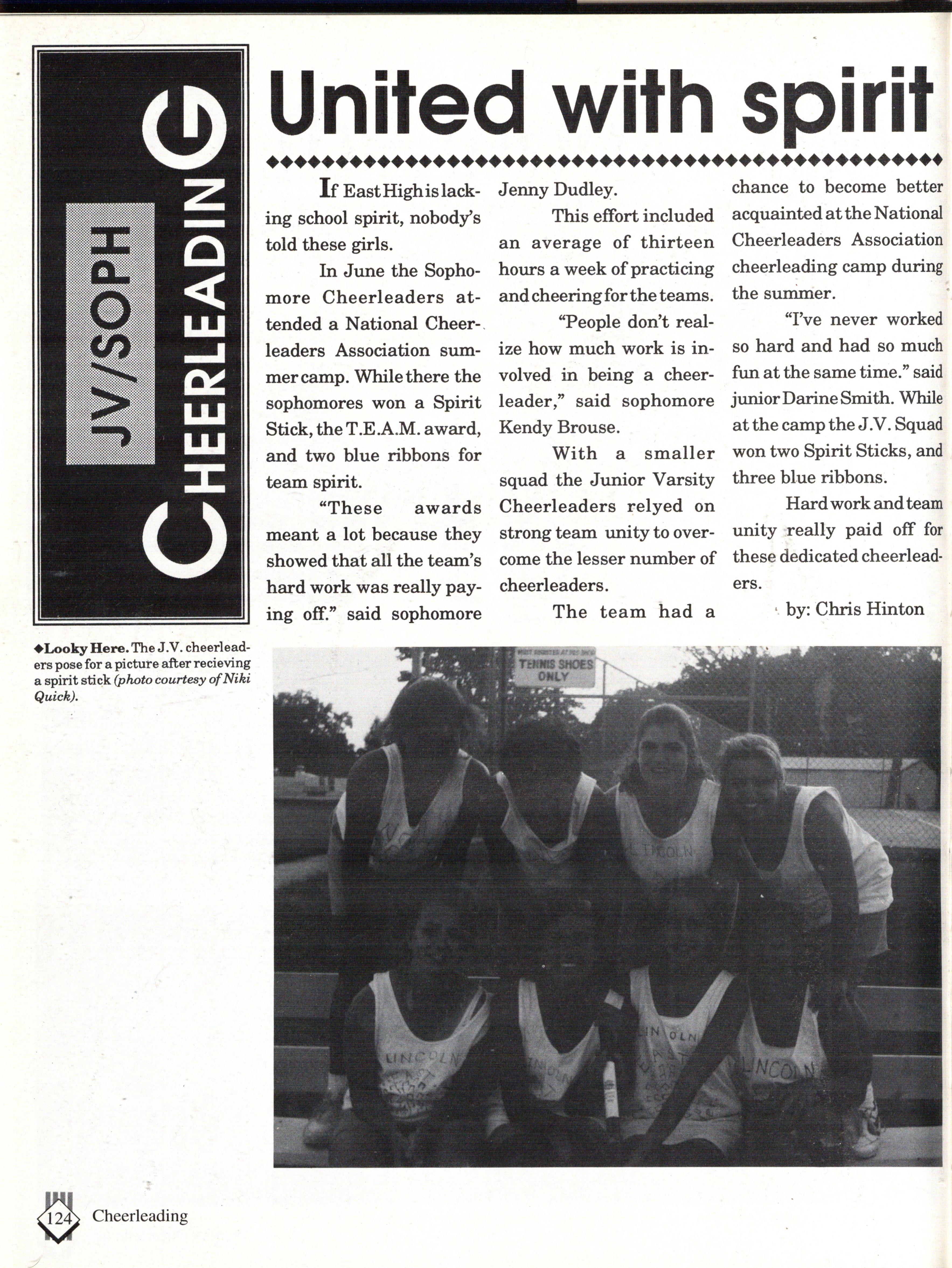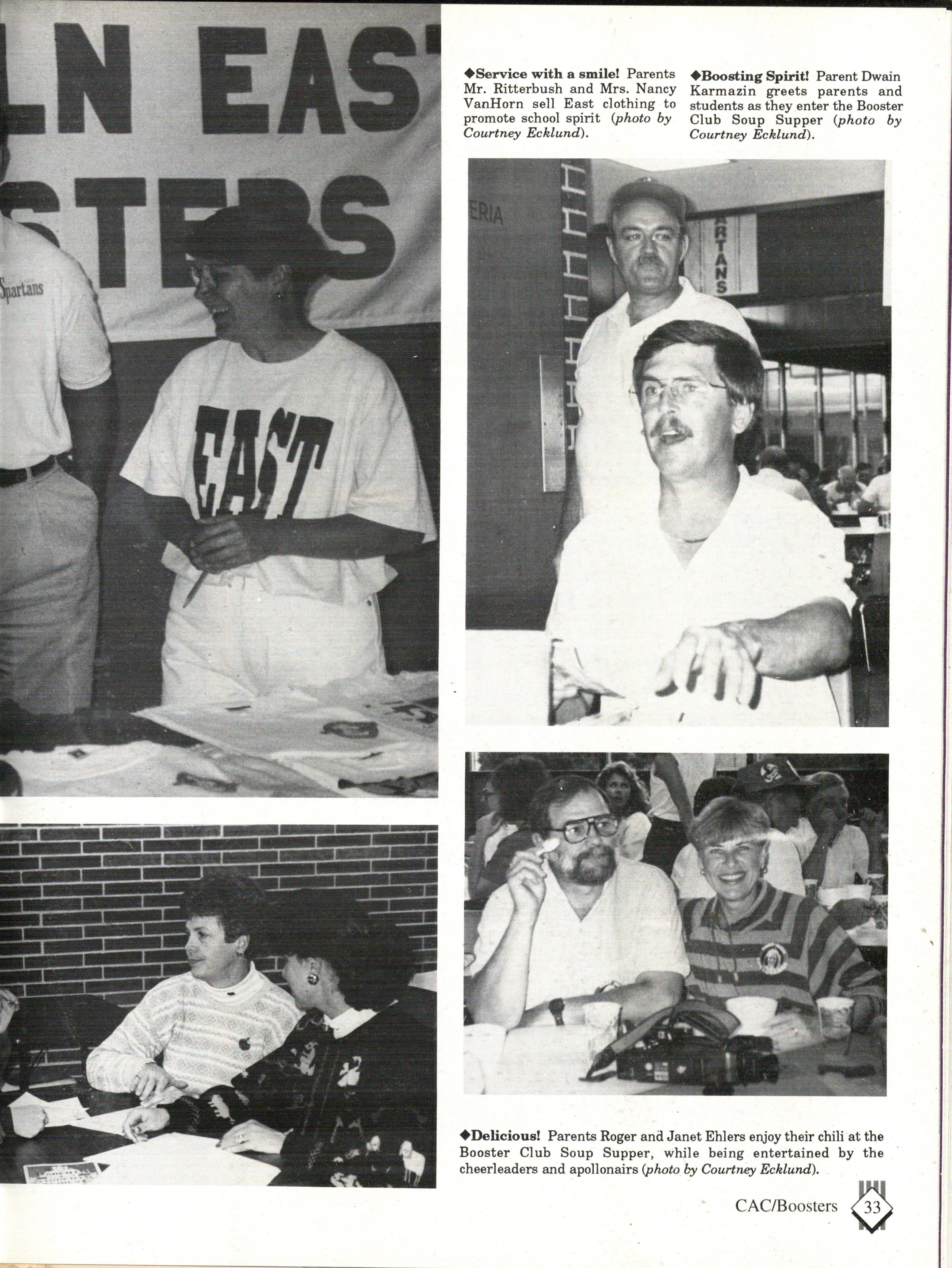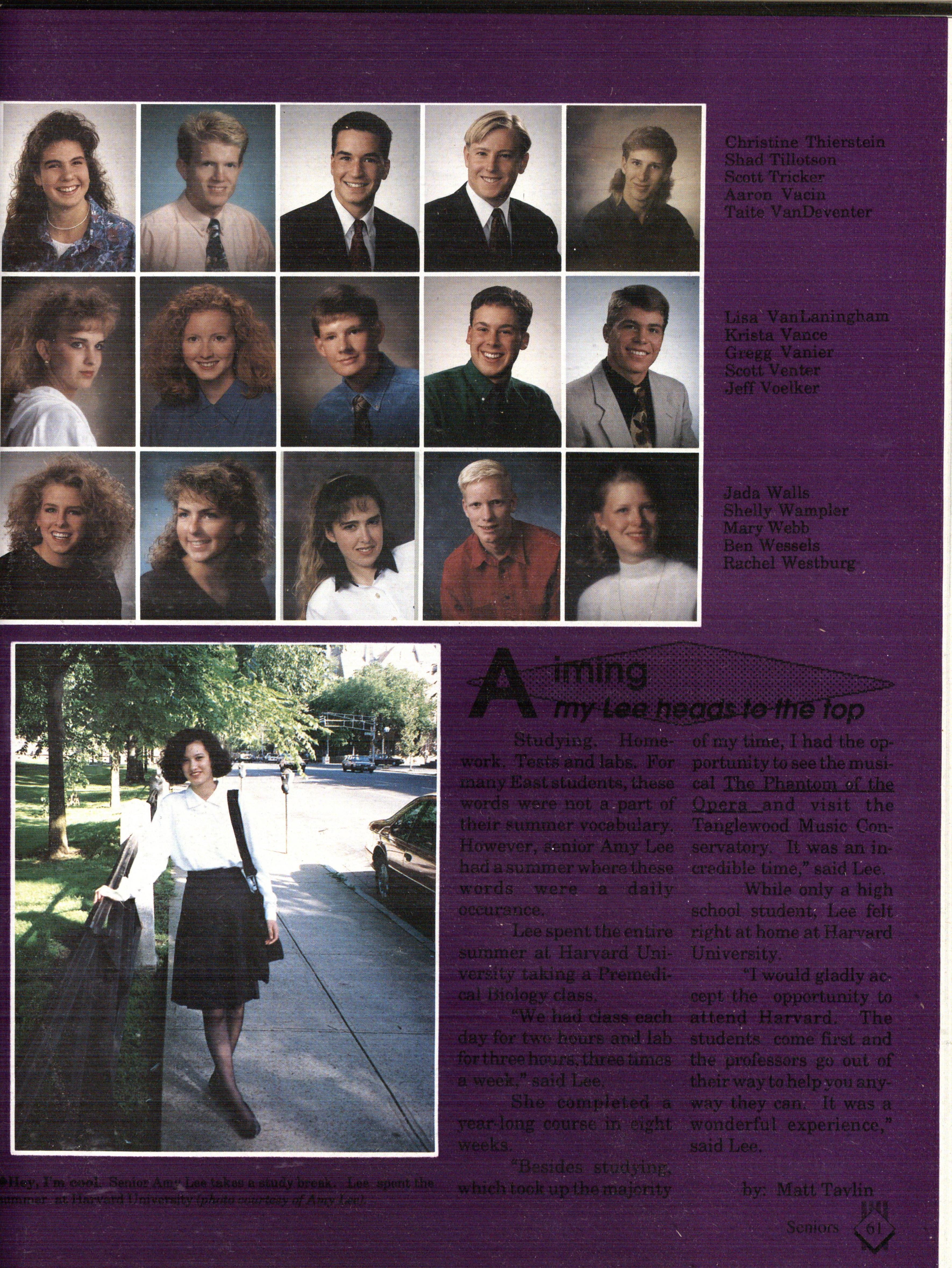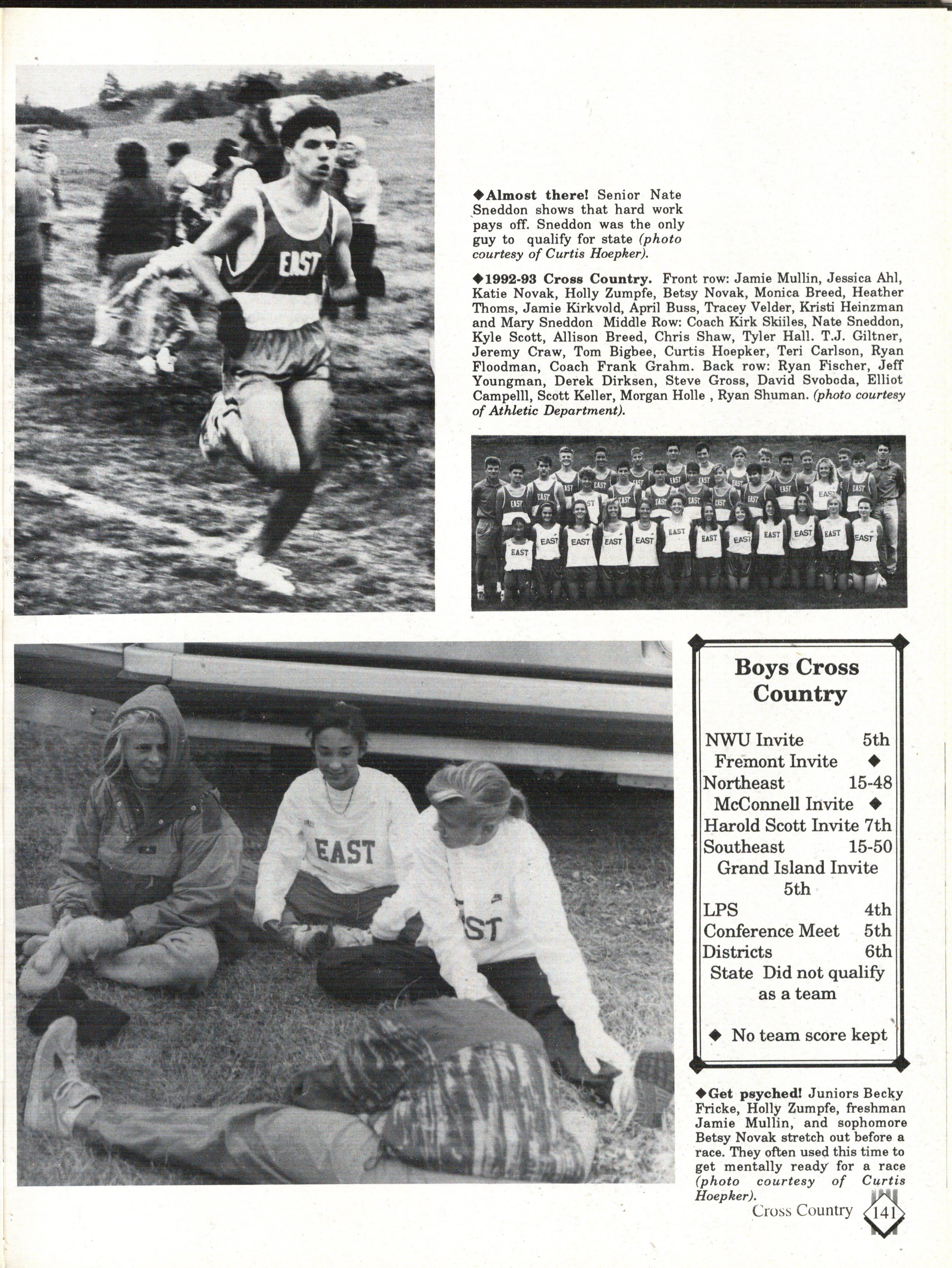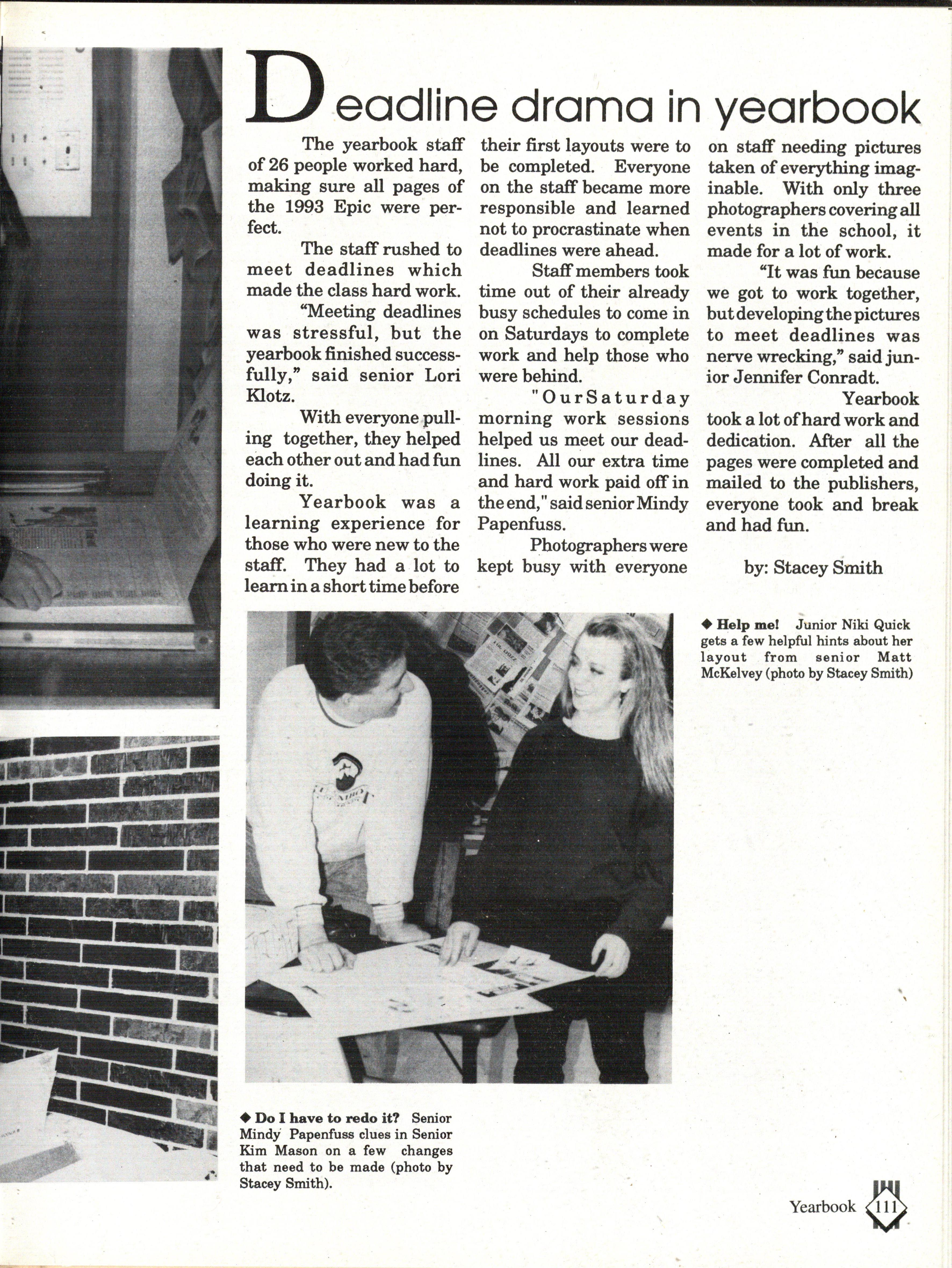 From the Inside Out was the theme of the 1992-1993 Lincoln East Epic. It was chosen because the staffwanted other schools to see what East was really like instead of just relying on the rumors. The 26th Epic was published by Walsworth Publishing 1 Company . of Marceline, Missouri who printed 1400 copies. The 234-page book included a spring supplement and a plastic cover. The package sold for $25 in the fall and $30 in the spring.