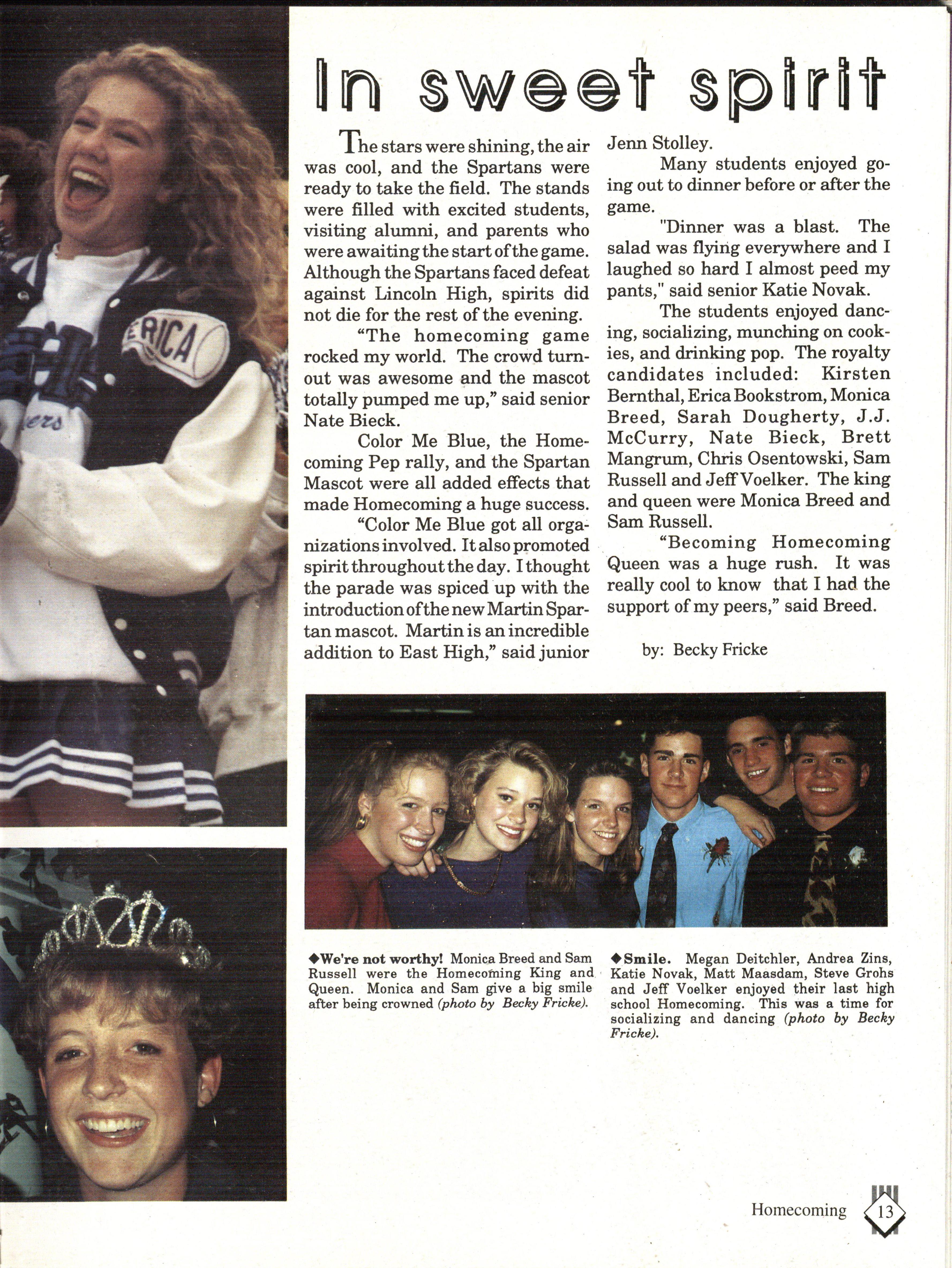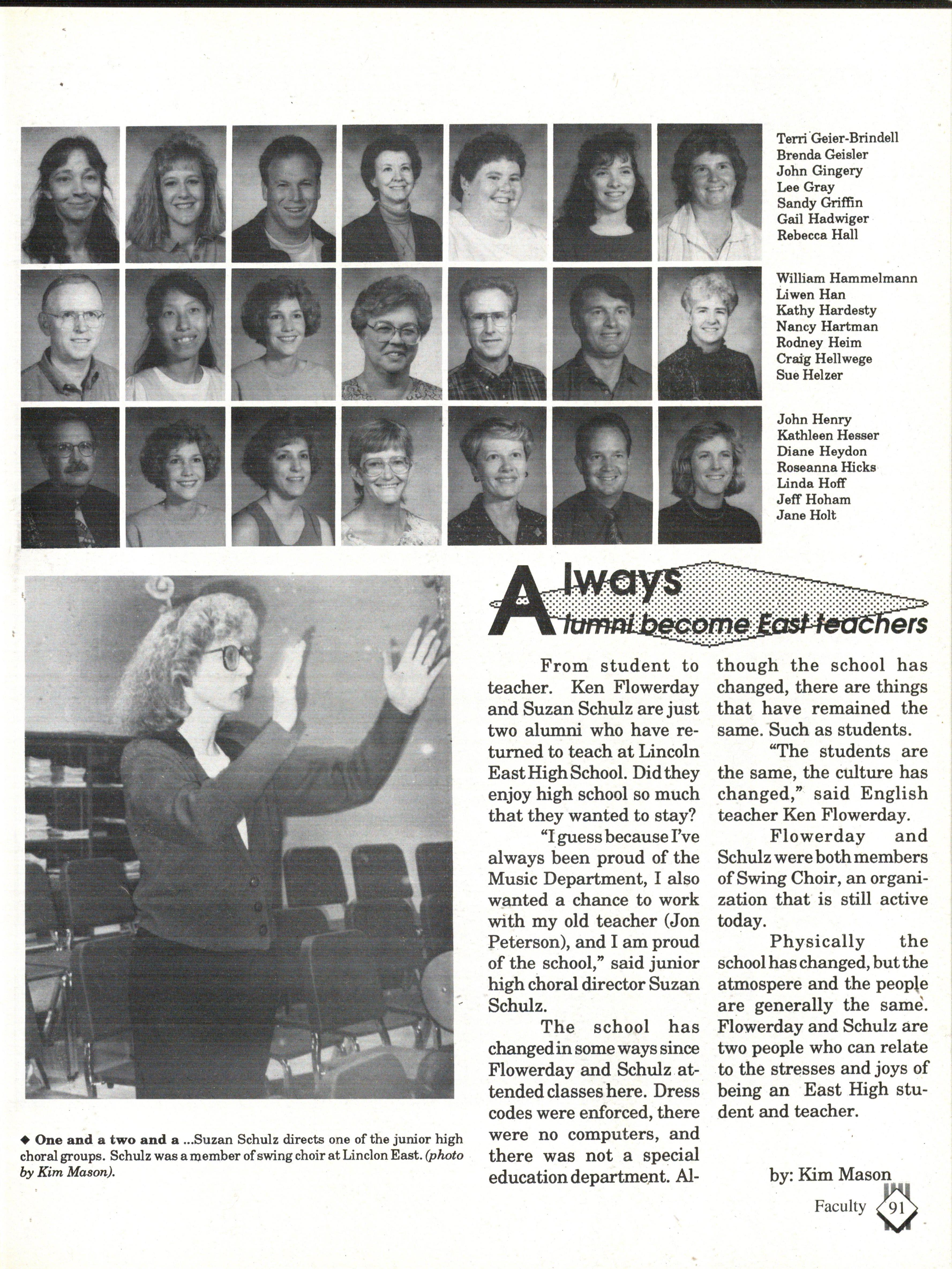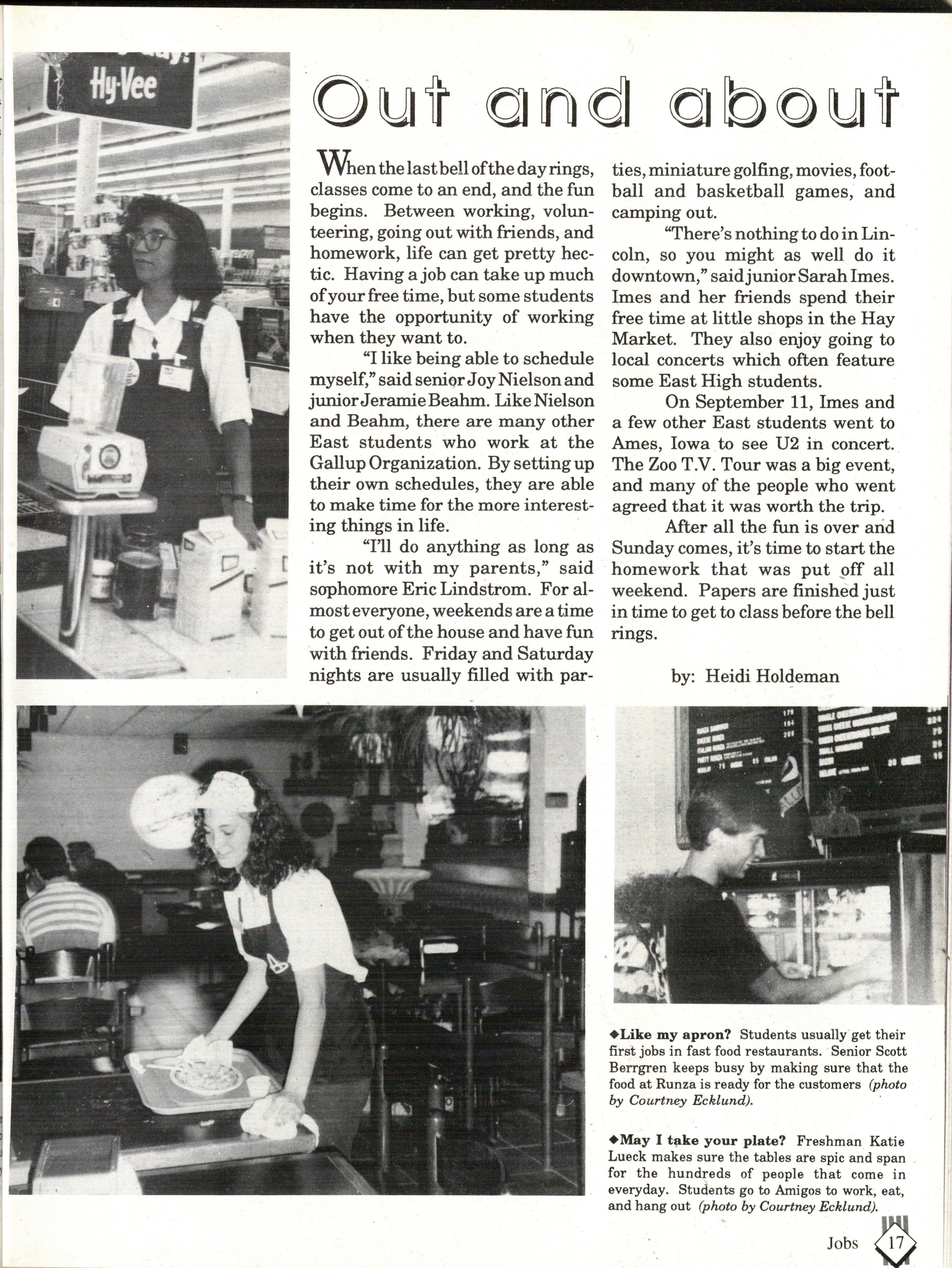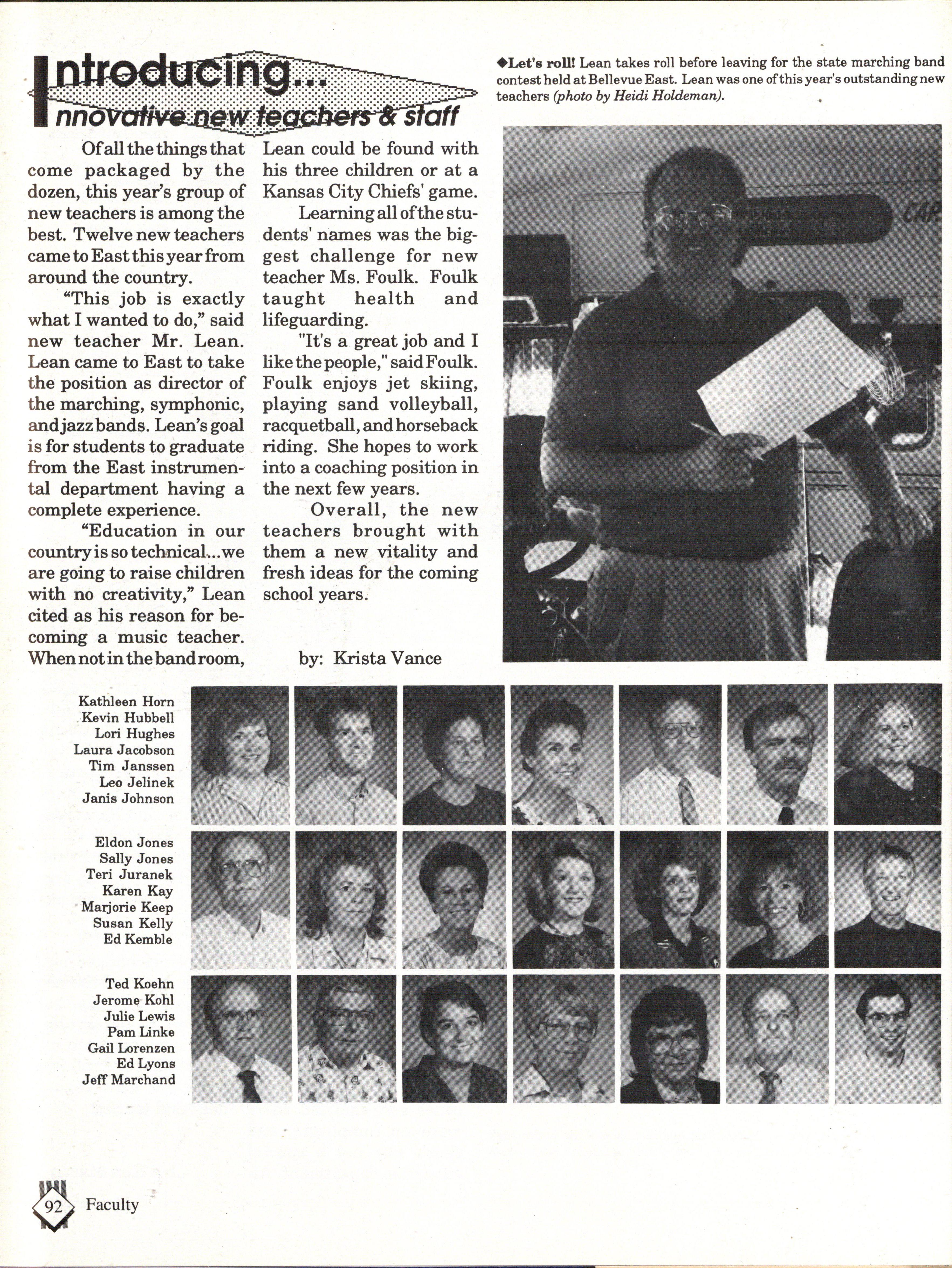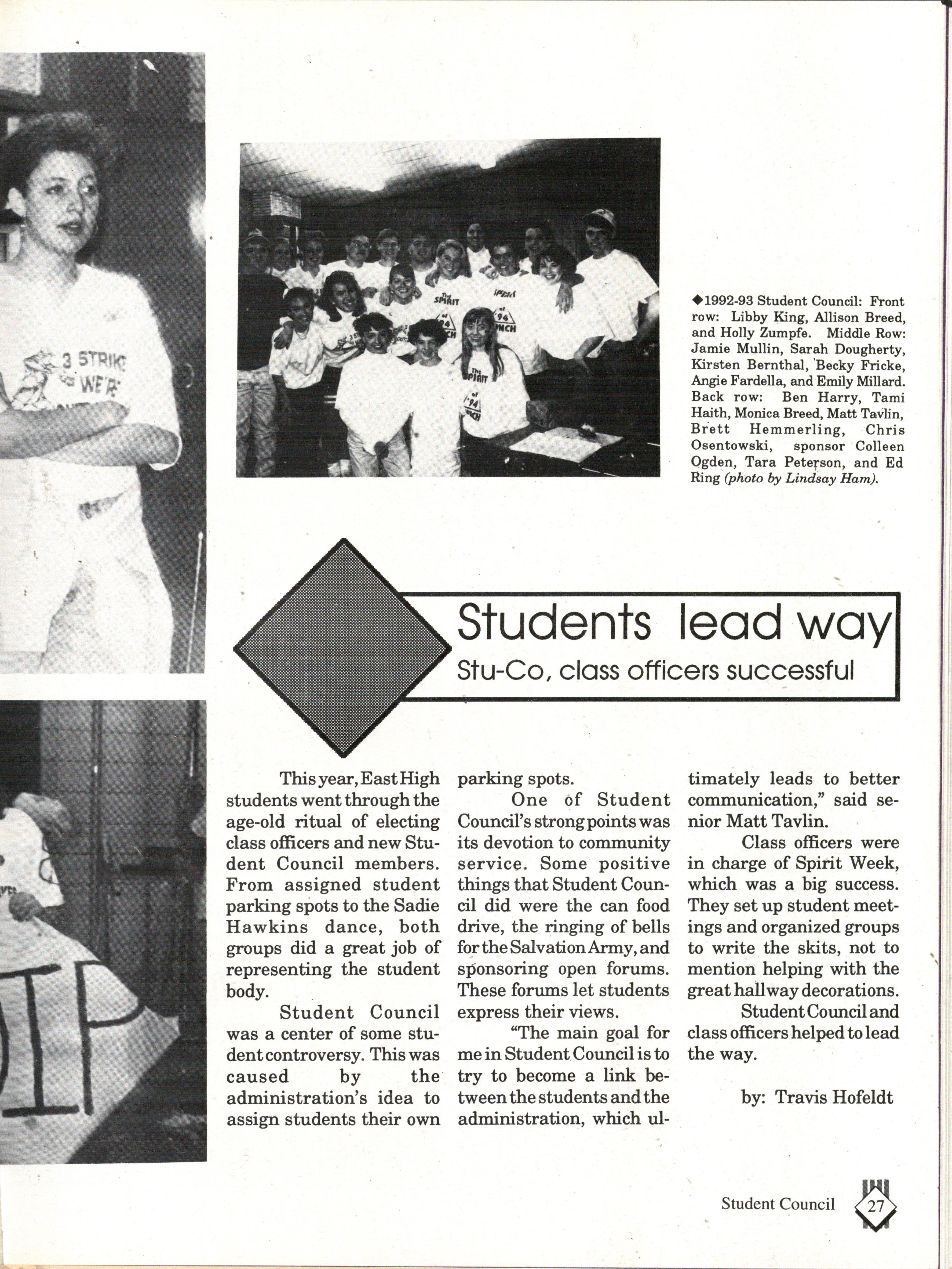 From the Inside Out was the theme of the 1992-1993 Lincoln East Epic. It was chosen because the staffwanted other schools to see what East was really like instead of just relying on the rumors. The 26th Epic was published by Walsworth Publishing 1 Company . of Marceline, Missouri who printed 1400 copies. The 234-page book included a spring supplement and a plastic cover. The package sold for $25 in the fall and $30 in the spring.