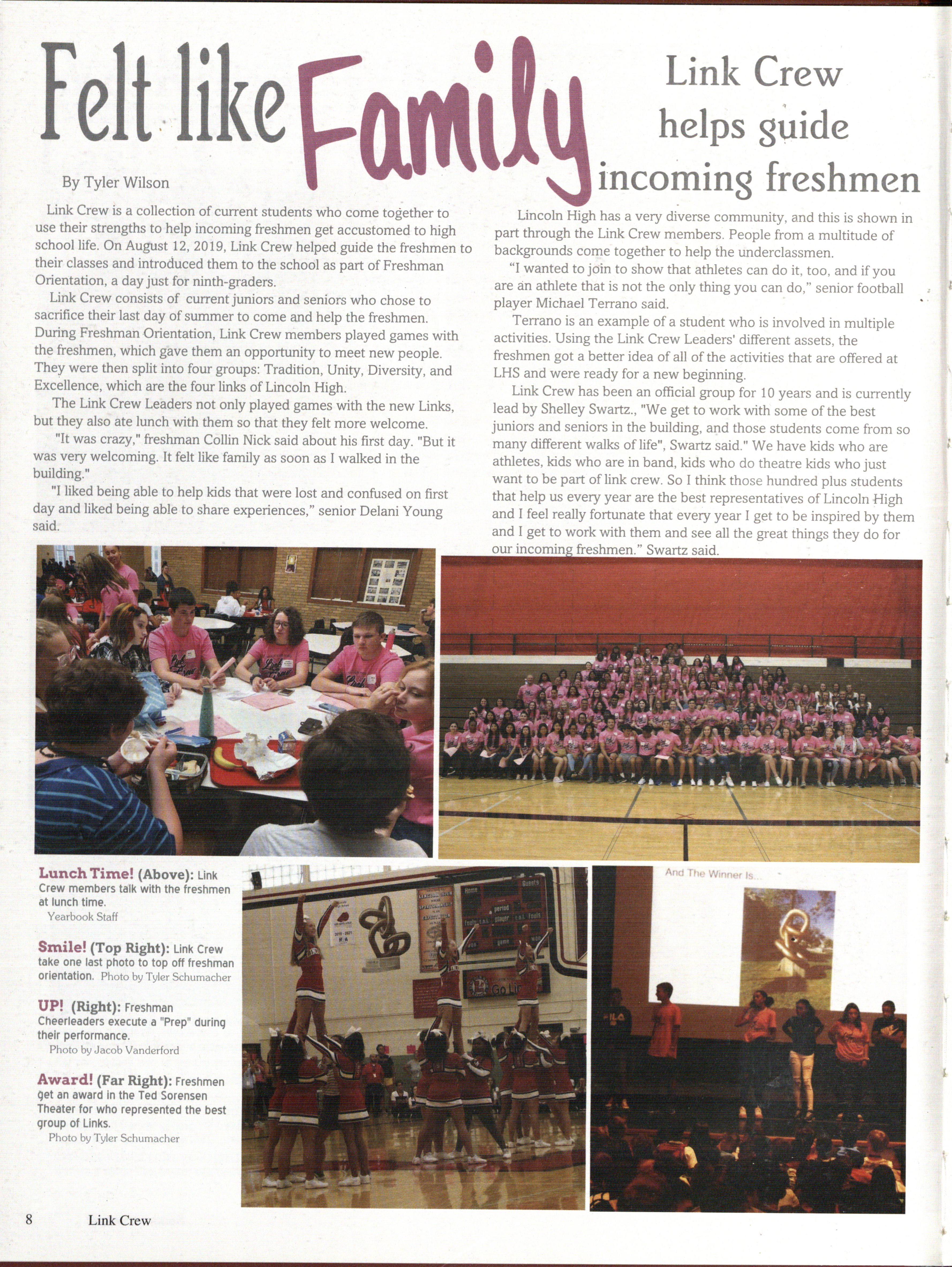 Link Crew consists of current juniors and seniors who chose to sacrifice their last day of summer to come and help the freshmen. During Freshman -Orientation, Link Crew members played games with the freshmen, which gave them an opportunity to meet new people. They were then split into four groups: Tradition, Unity, Diversity, and Excellence, which are the four links of Lincoln High.