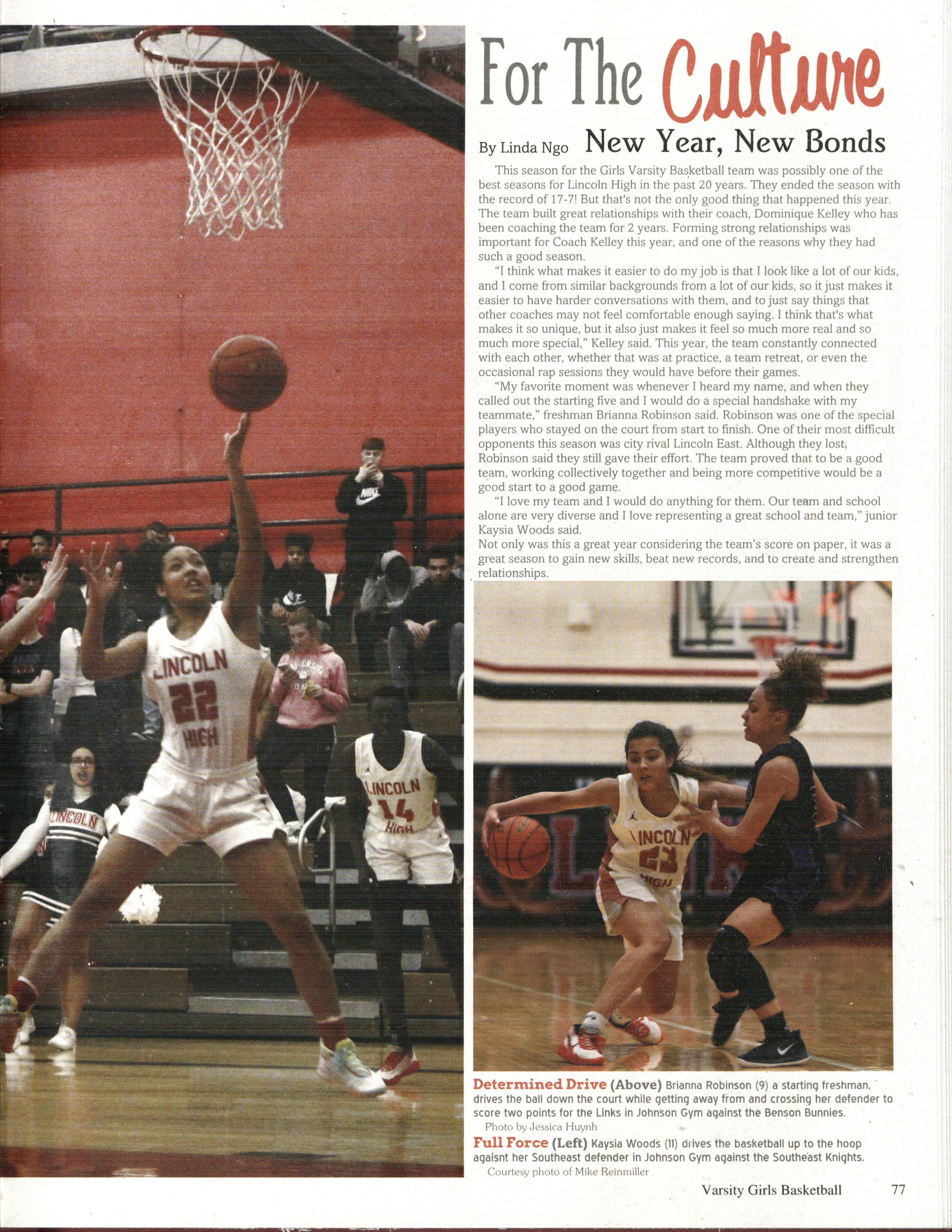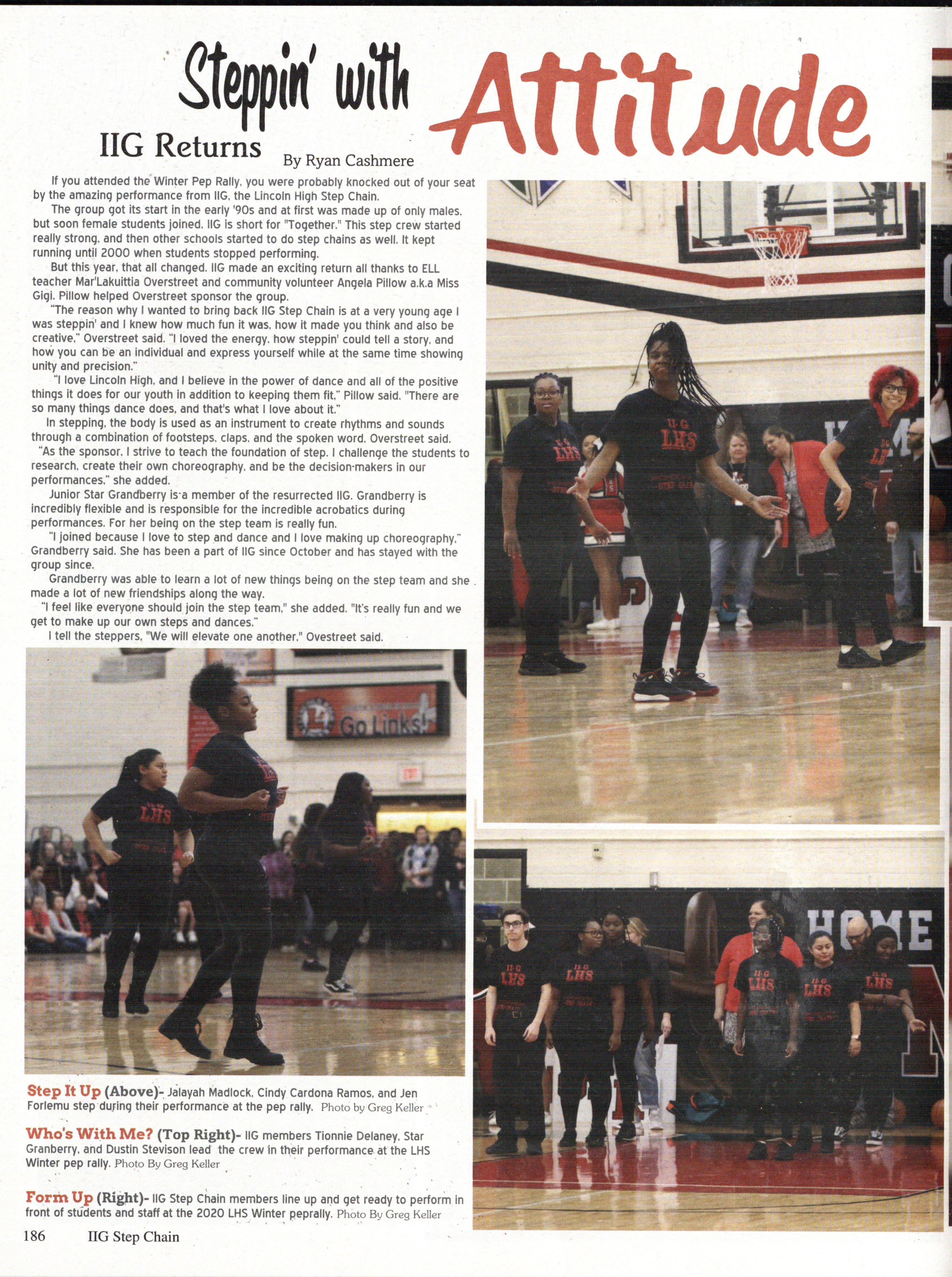 We Got Spirit (Opposite Page Top) The 2019-2020 Lincoln High Varsity Cheerleading Team fires the crowd up with a cheer.