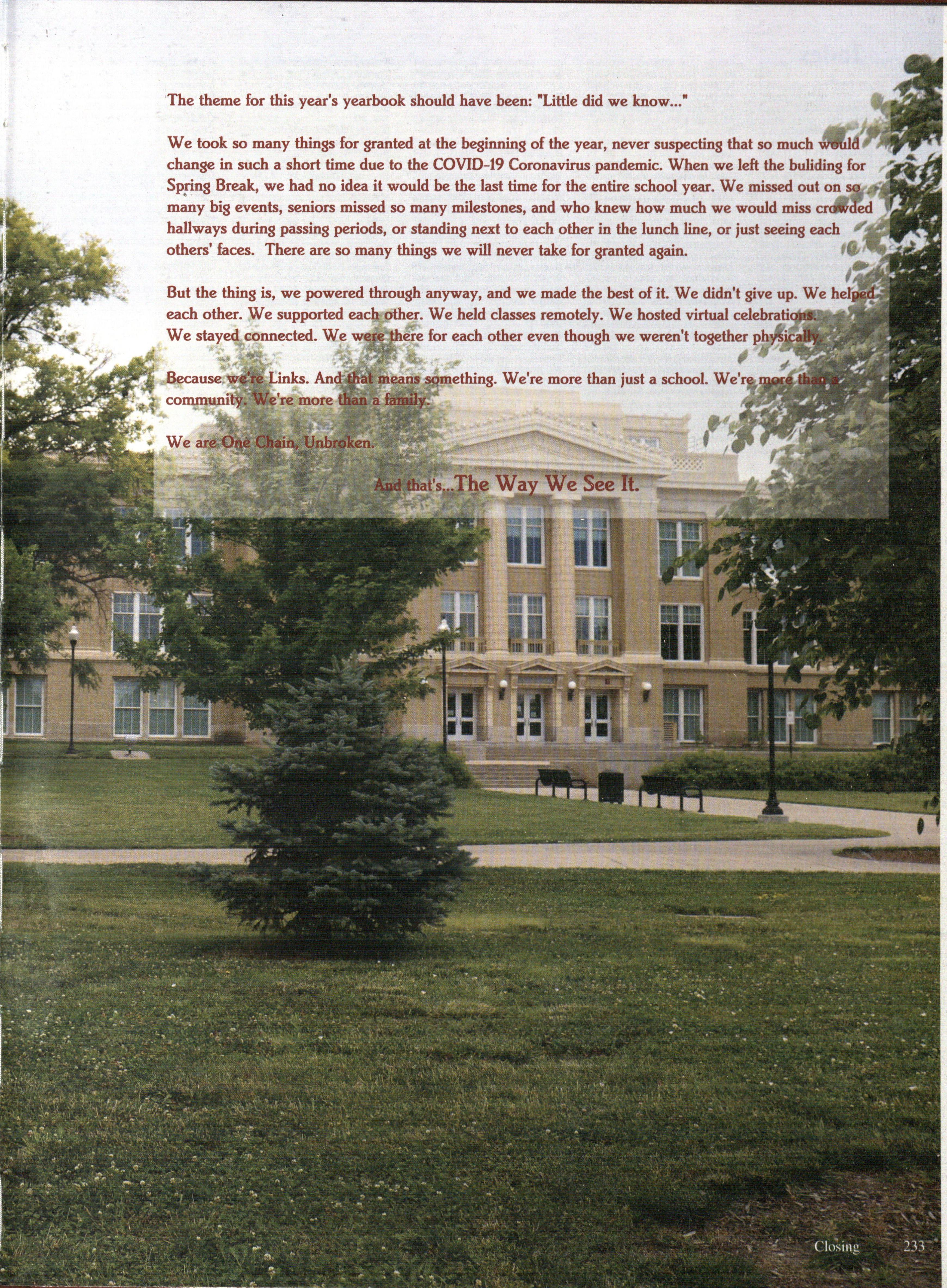 made to delay distributoin until the fall for safety reasons, we decided to use the extra time to change some of the spreads we had planned on and instead included coverage of the coronavirus situation and how students and staff dealt with the pandemic. We especially wanted to include photos of seniors since they missed out on so many milestones like Prom and Graduation. Many O' the spreads were done by students working remotely from home. Thanks to the dedicated people who kept on working up until the very end, you now have this historic book in your hands.