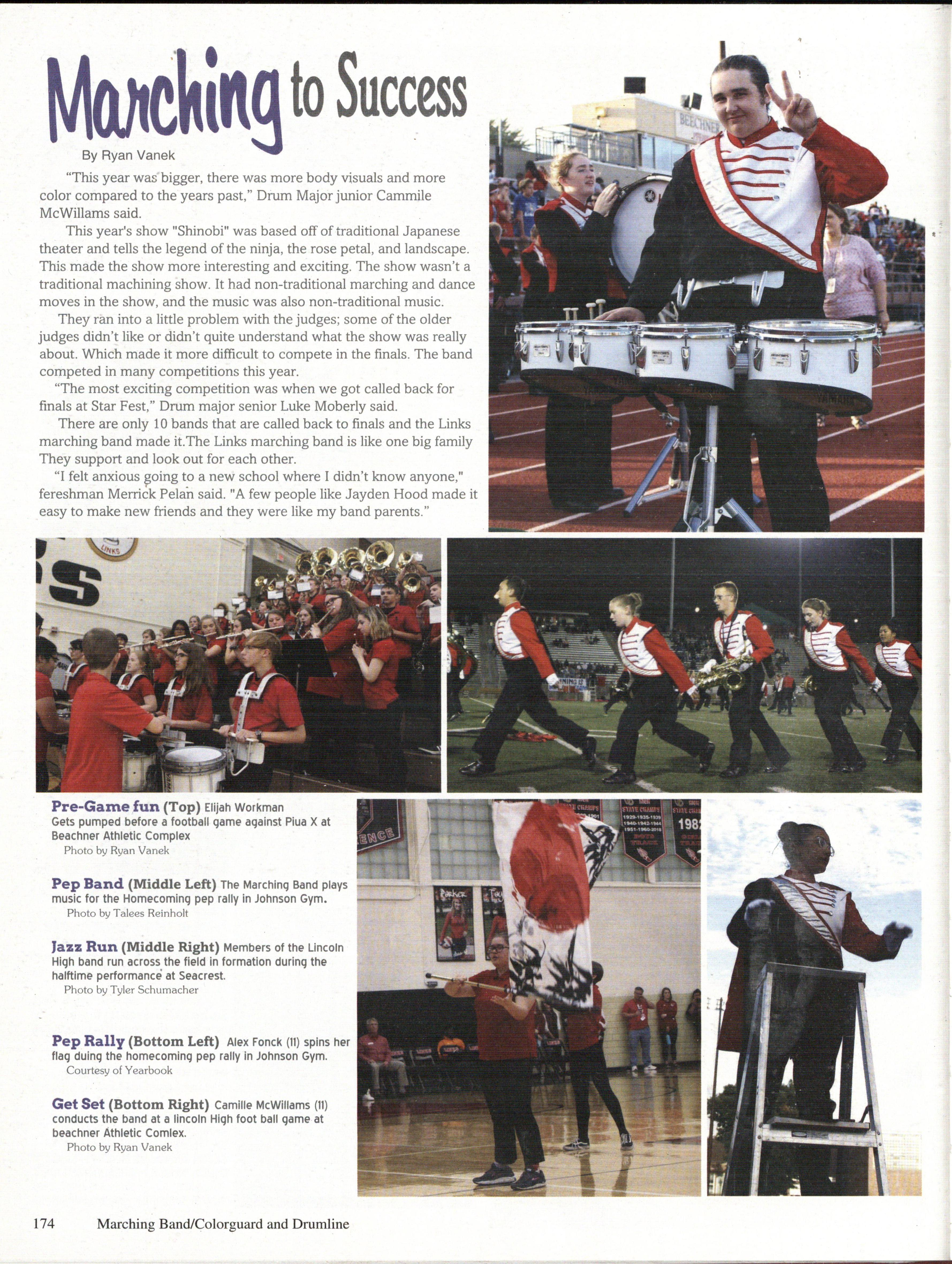 Got Silk? (Above) Lincoln High's Fall Color Guard strikes their ending pose of the performance. This year's marching band show theme was Japanese show music. hence color guard's fancy Japanese flags. •
