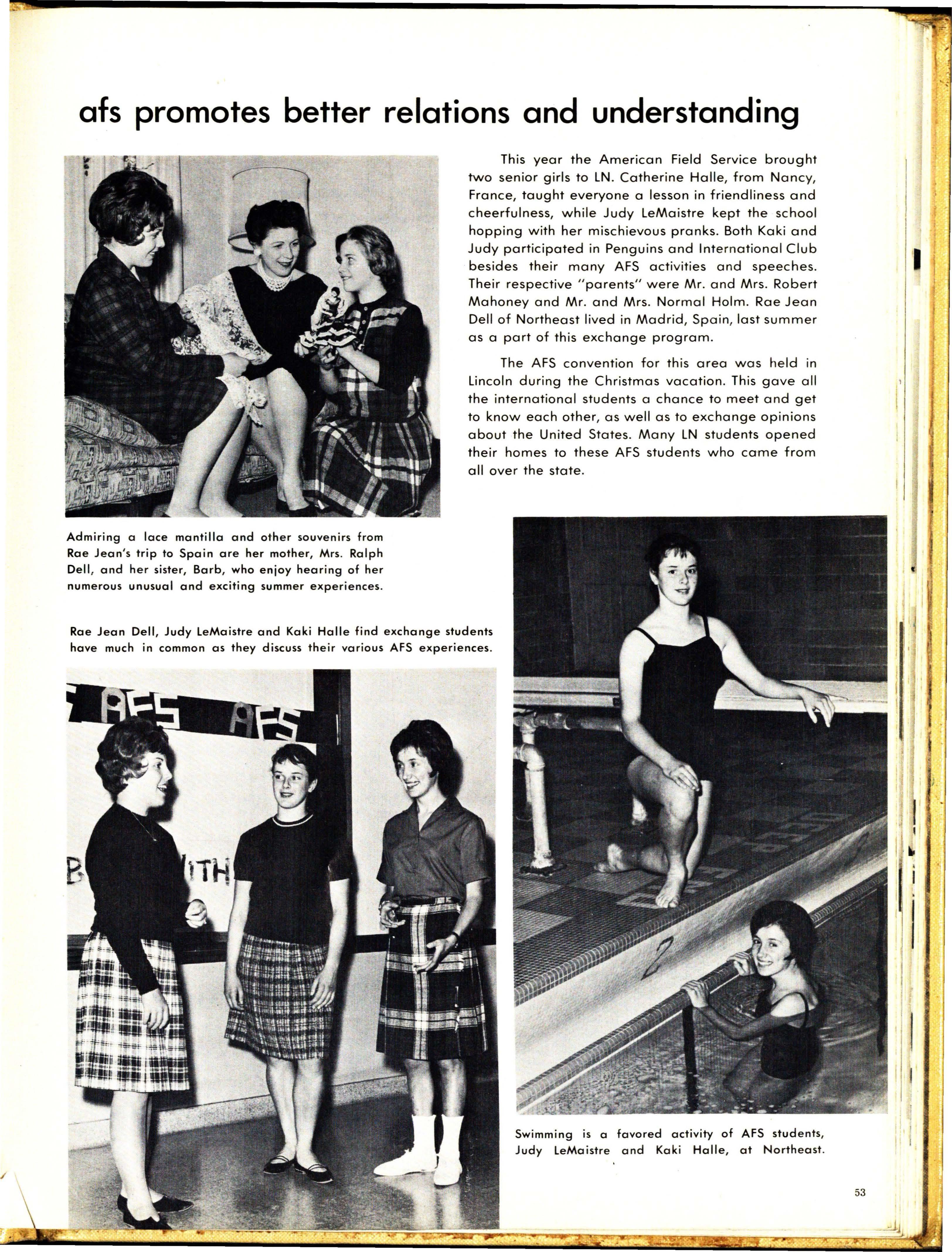 On the national-international level, Larry Johnson received a scholarship which enabled him to spend two weeks in New York City p9rticipating in an intensive Un i ted Nations study program. Lincoln Northeast students aided the American Field Service in the housing of forty -five international stl.J dents from twenty - two countries attending a regional convention in Lincoln.