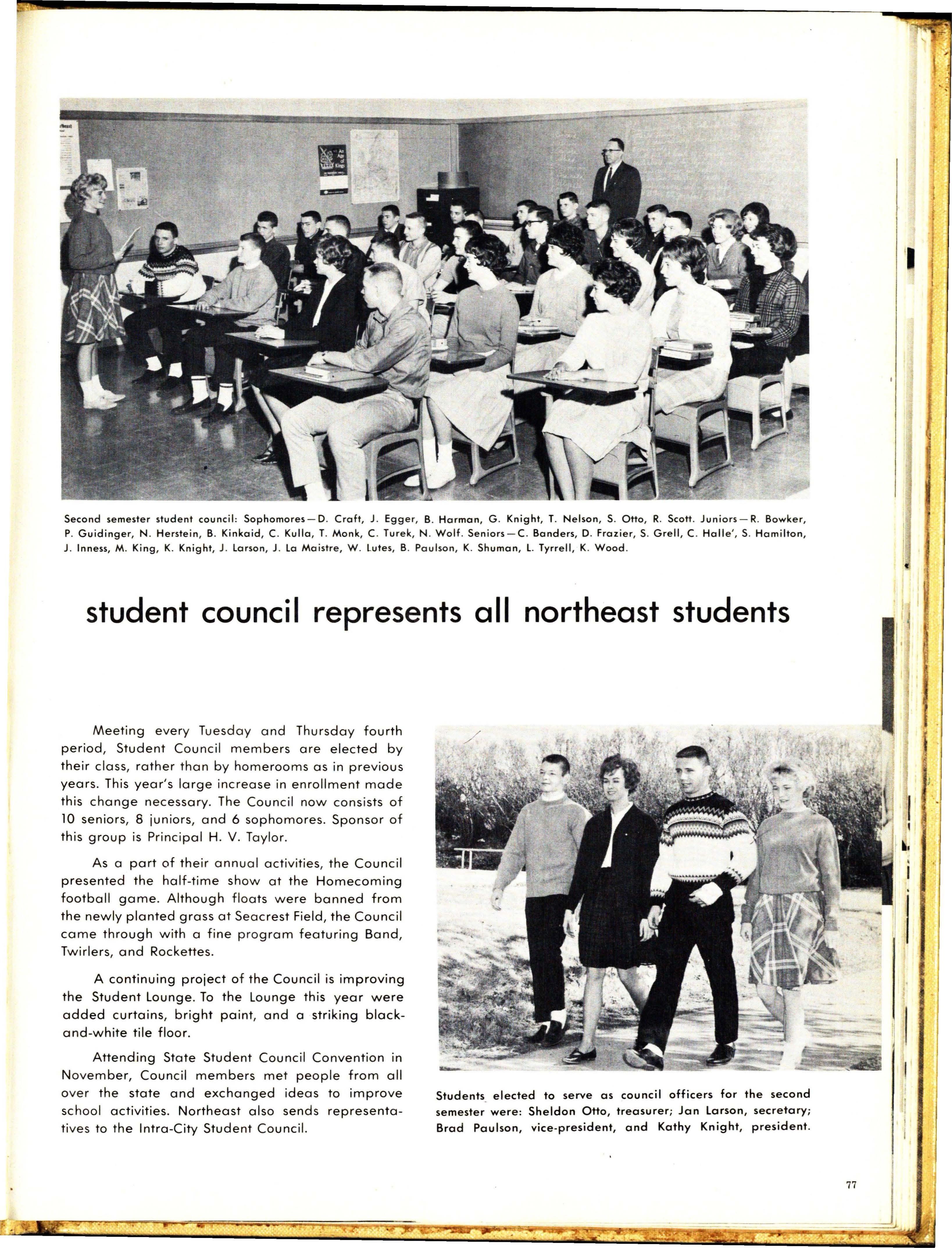 Making their presence felt on local and state levels, many Northeast students attended the Governor's Youth and Safety Conferences. To make the community aware of school ac ti vities, student correspondents reported regularly t o Lincoln newspapers. Students viewed government i n action through County Government Day, Girls ' State , Boys ' State, and the Hi-Y model legislature.