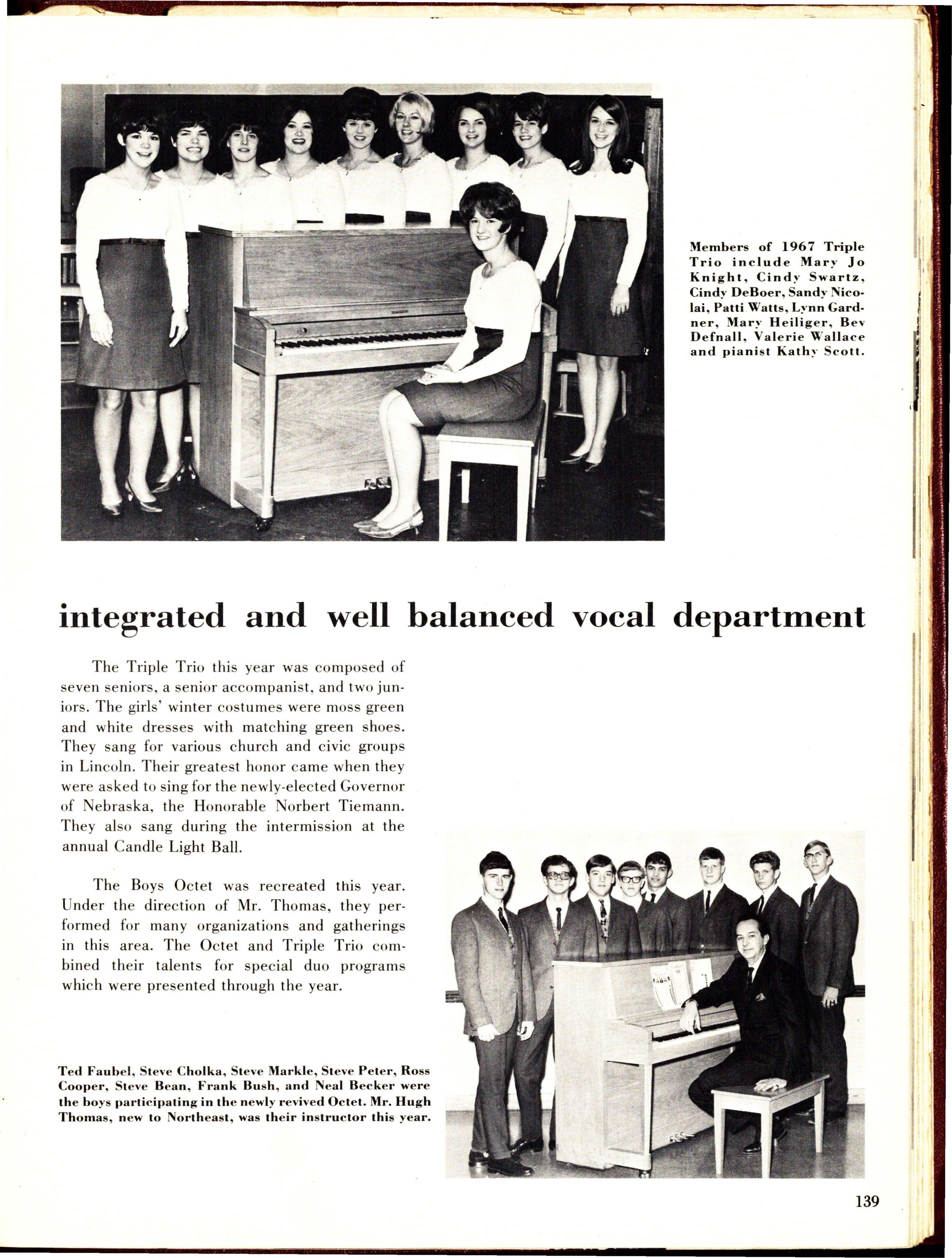There have been many changes this year in the vocal music department. A new teacher is Mr. Hugh Thomas. New risers have been installed in the vocal room and the choirs have new robes, paid for by last year's candy sale.