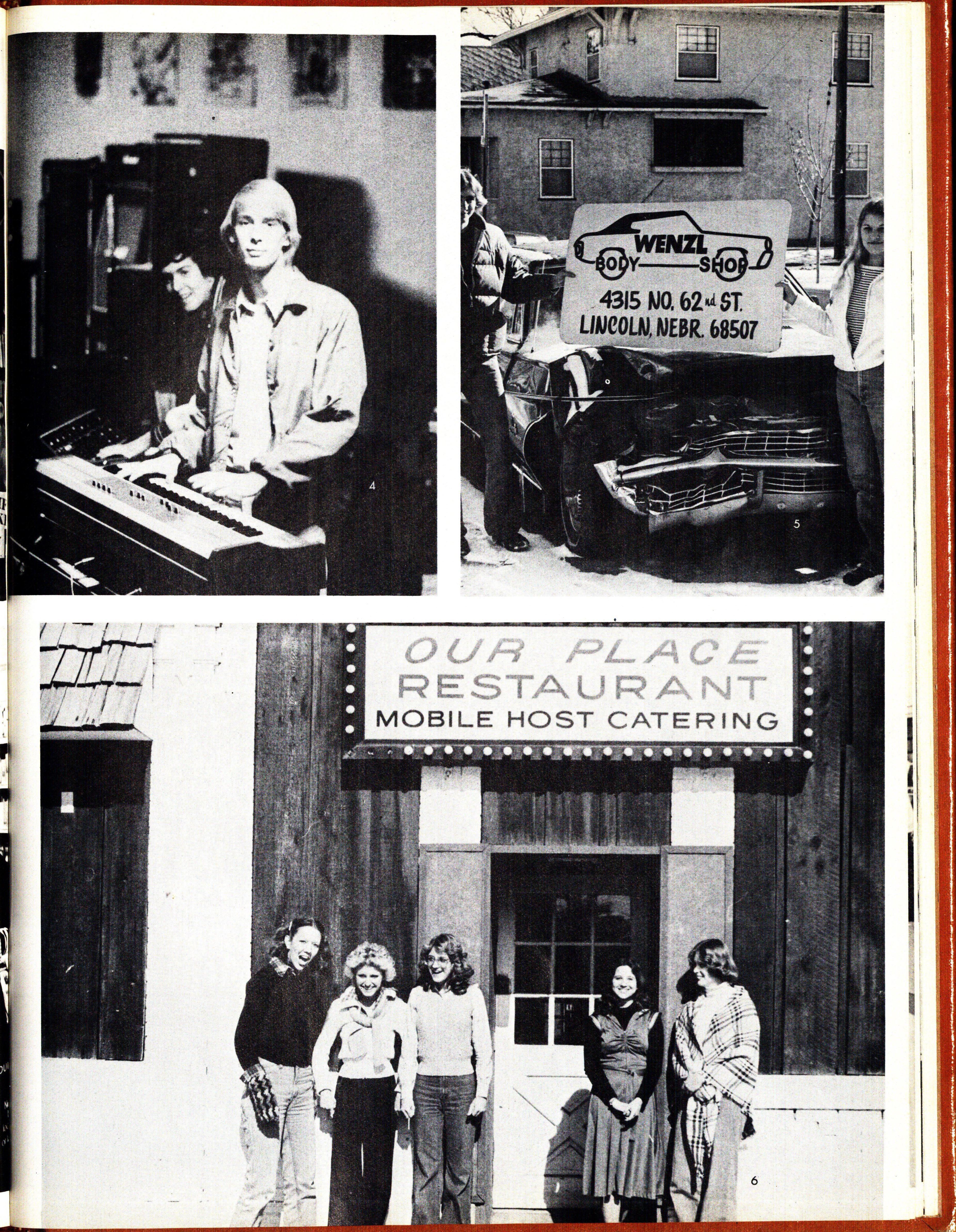 1. Dan H o age , Mike Ankeny, M i ke Stuefer, Denn i s Johnson , Dave Hoage , Greg Butts , Jim Barber and Gerald Swenson go to McCartney Service , 1440 No Cotner for the i r eng in e repa i rs 2. Bobbi Burback , Sandy Shadley and Lynn M u rray chose their class rings from Miller Jewelry , 6127 Havelock 3. Barb and Jim Mueksch get their prescriptions f i lled at Havelock Pharmacy, 6136 Havelock 4. Brenda Frey and Vicki Renner put their trust i n Ball Real Estate, 4444 " O ". 5. Hair Art Ltd. , 2441 No 48 styles Chuck Cra i g 's hair wh i le Carla Cover watches the progress.