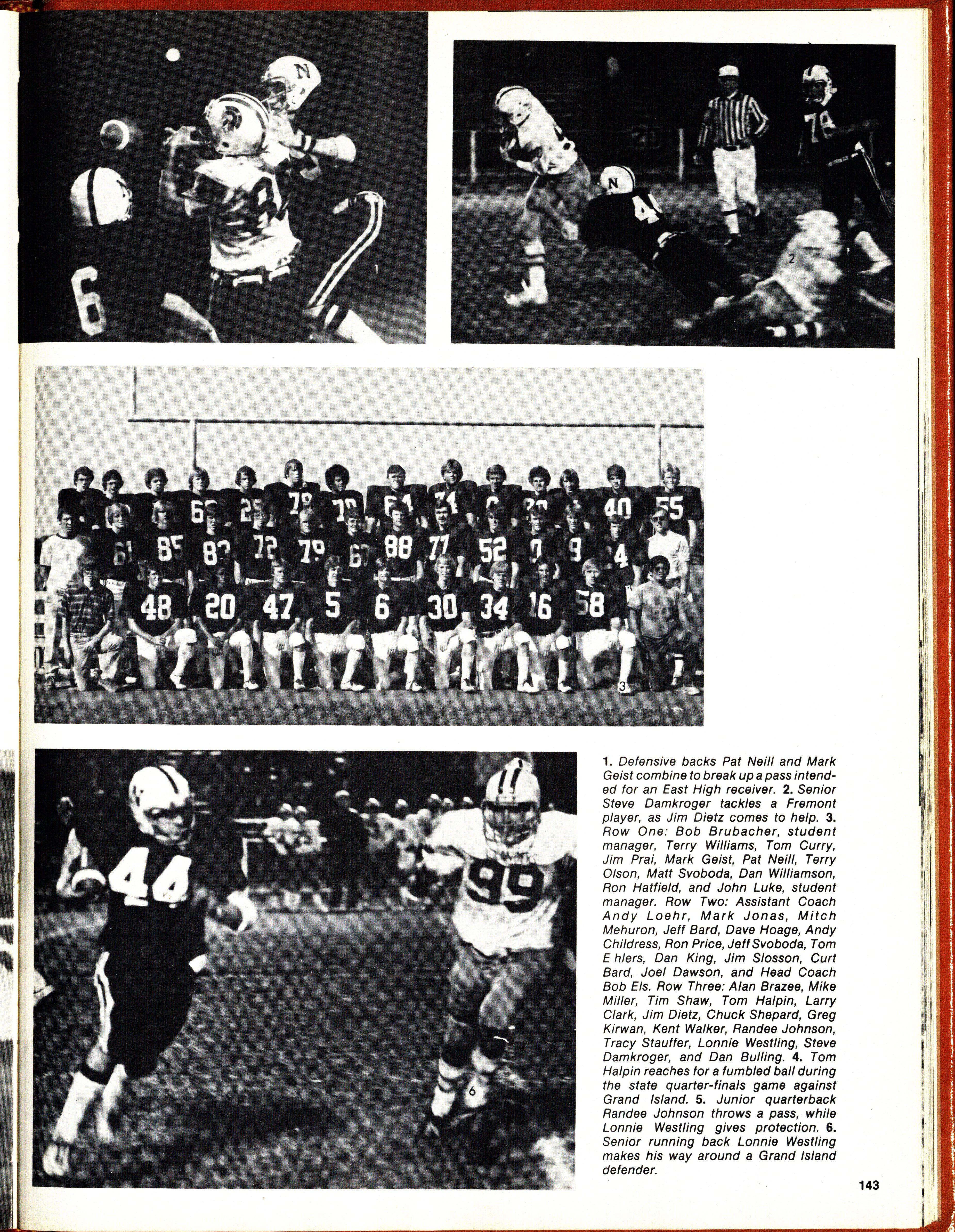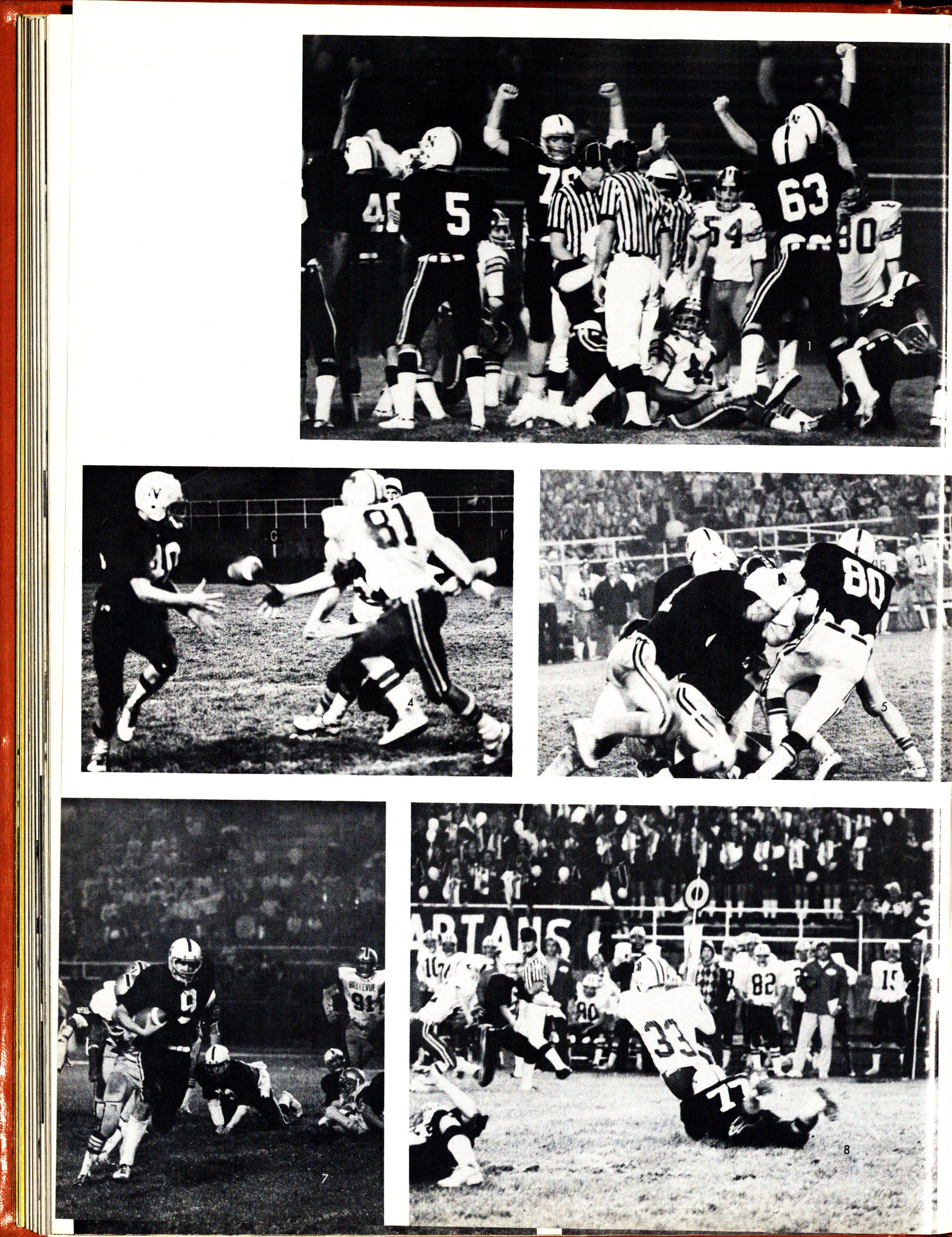 1. Coach McIntyre discusses strategy with Mike Ryan. 2. Russ Strauch controls his opponent 3. Front Row: Tim Koch , Mark Hawkins , Don Love, Mike Ryan , Dan Base , Greg Teichmeier , Steve Burns , Coach Bob Curtright. Back Row: Jeff Larchick , Tim Helms, Brad Hatt , Greg Kirwin , Russ Strauch ,. Jim Rall , Jeff Bachman , Ron Svehla , Coach John McIntyre 4. Heavyweight Greg Kirwin takes down his Beatrice competitor. 5. Brad Hatt concentrates on his next move 6. Tim Helms forces an opponent to the mat 7. Brad Hatt competes against a Grand Island wrestler. 8. Wrestling his way to the state title is Mike Ryan.