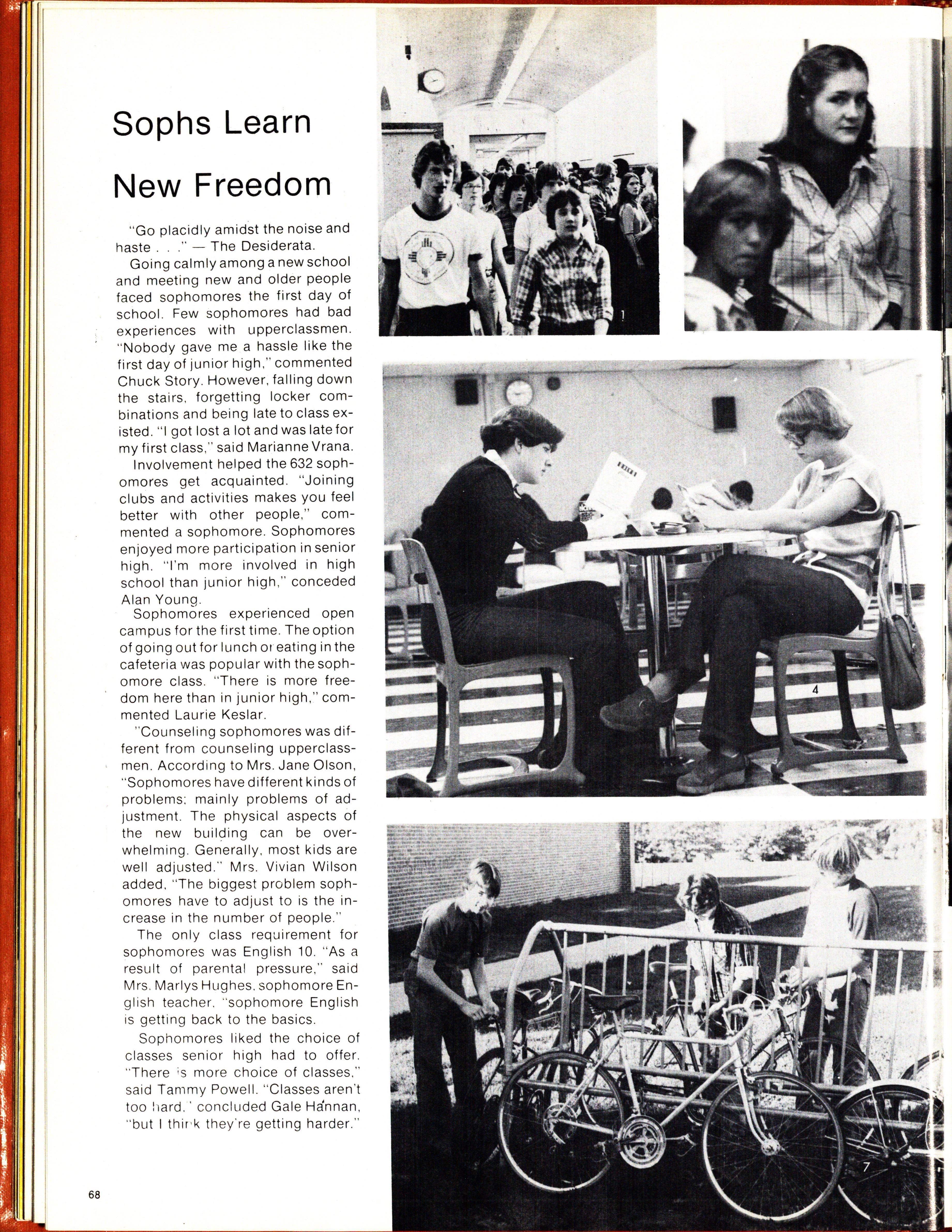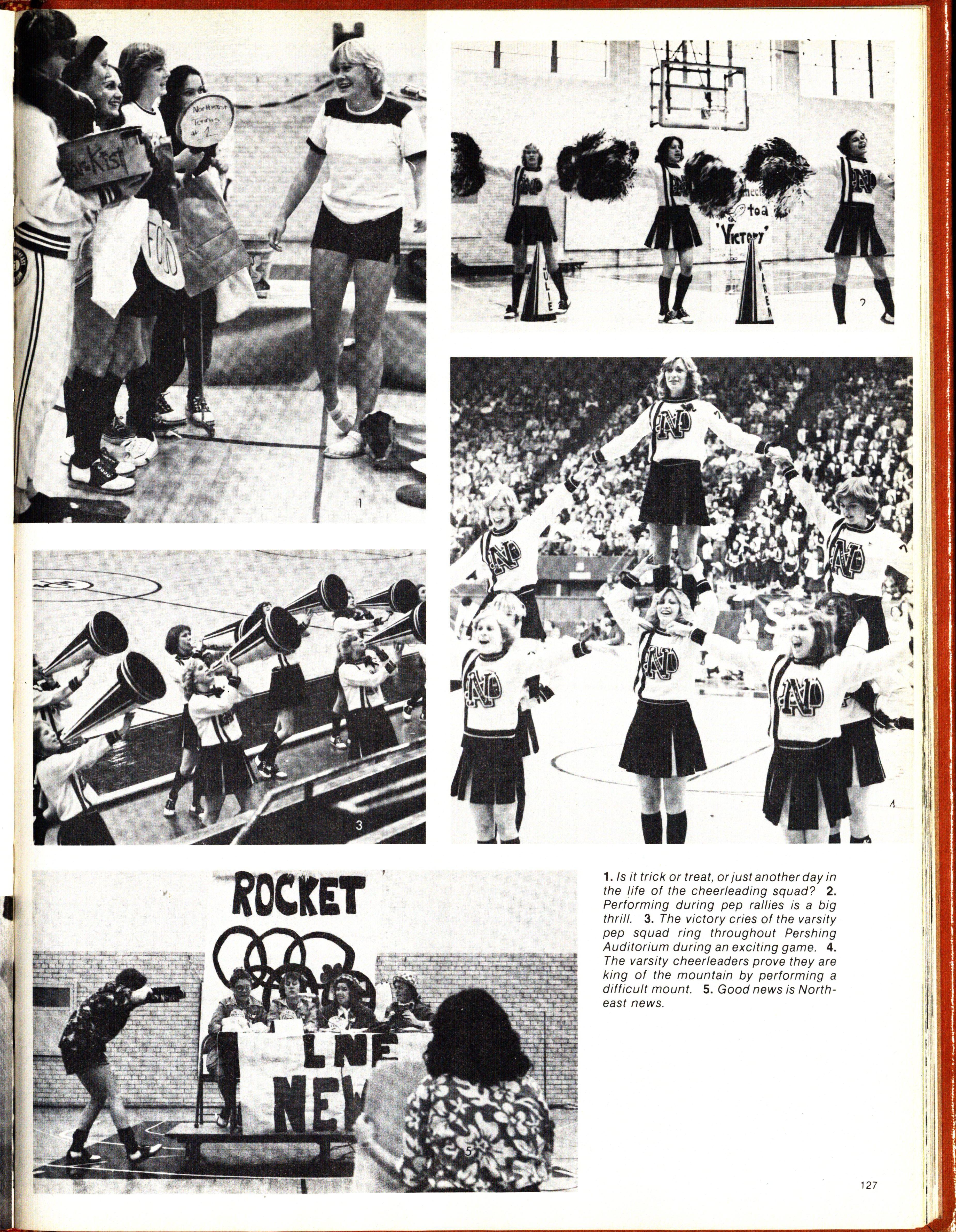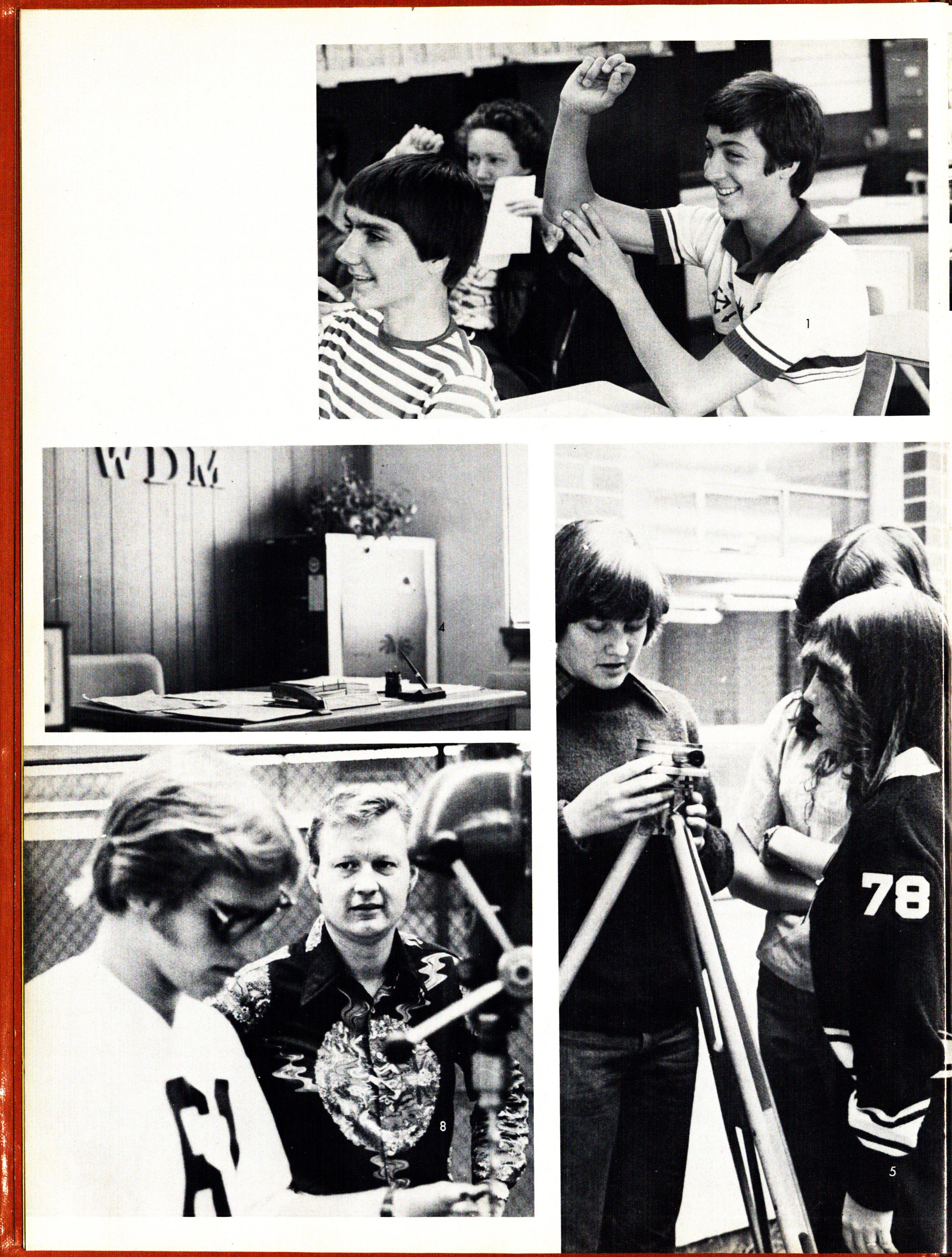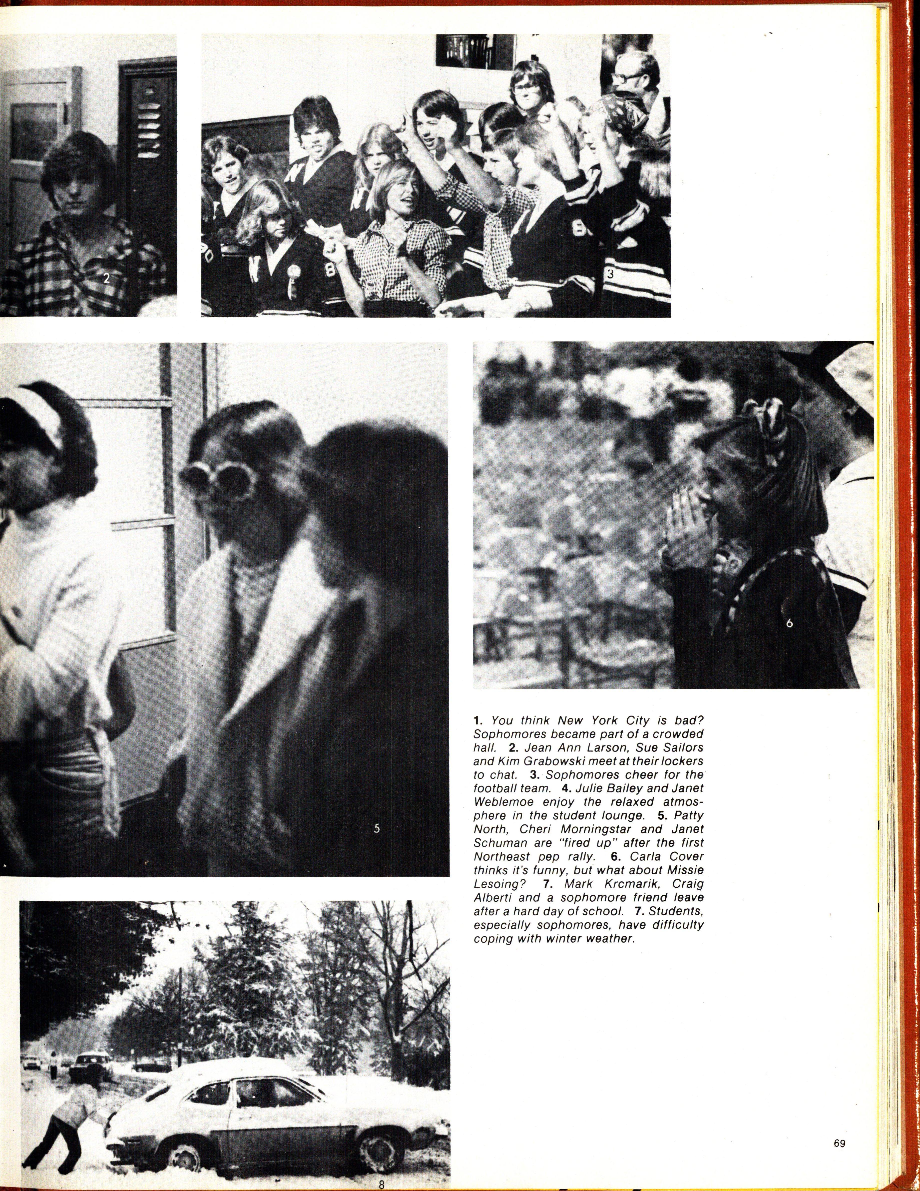 1. Movies such as Star Wars and Saturday Night Fever were highlights of conversation among Northeast students. 2. A favorite activity many students enjoy is listening to albums and tapes 3. Is it the school parking lot or Gearhead City? 4. Not everyone has four-wheel drive. Some enjoy the luxury of a two-wheel Continental