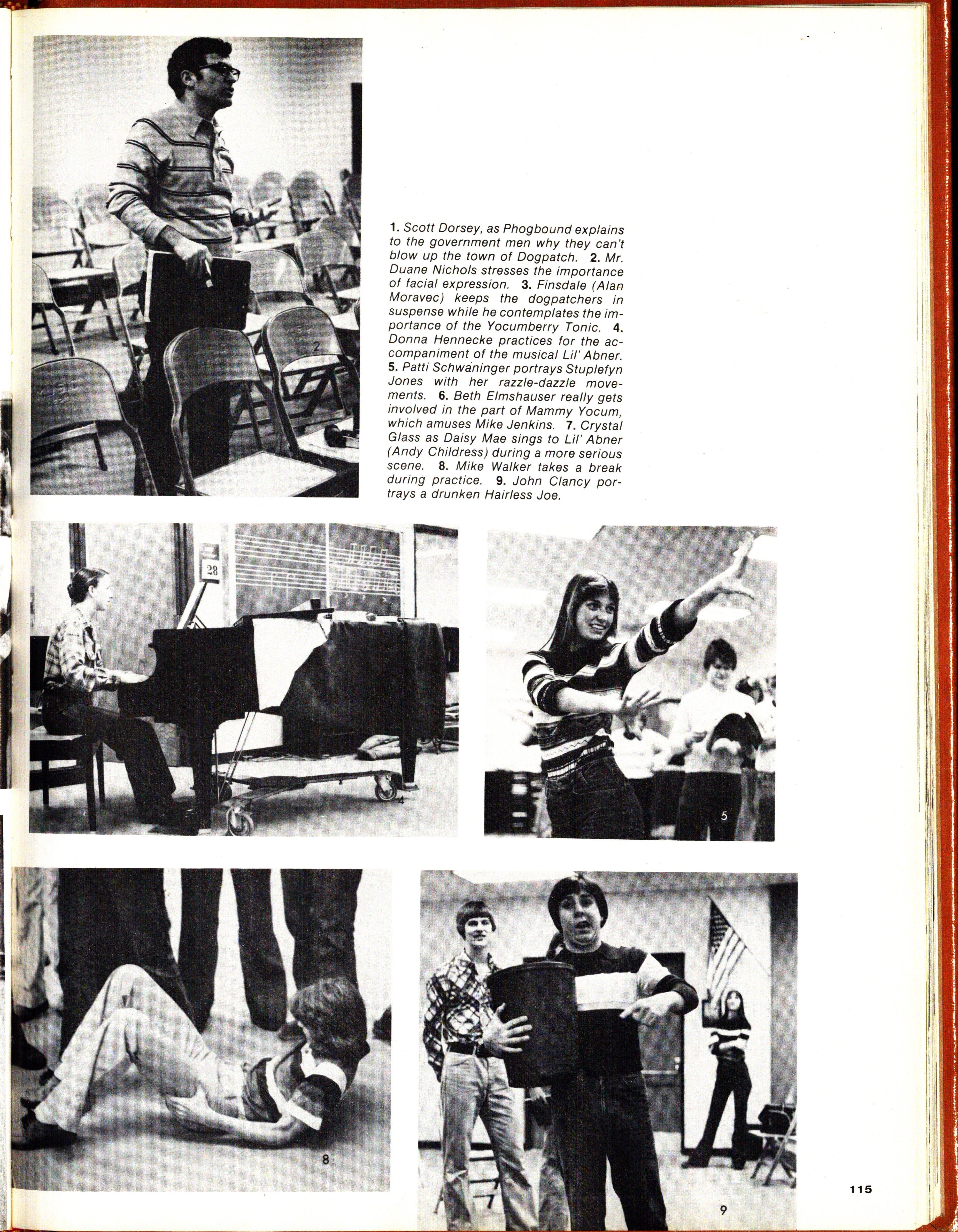 1. Mark Vanorsdall anxiously waits to answer a question. 2. Shana Cartwright contemplates an up-coming test. 3. Nancy Drewel , Mary West , and Diane Badberg work hard during a chemistry lab 4. A view of counselor Bill Maly ' s new office 5. Sheryl Elwood explains the •principles of surveying to Jody Woven 6. John Fech , Dave Williams , and Mike Hillis have time to smell the flowers in plant life class. 7. Sheri Peck is ready to eat during a life sports cookout. 8 Mark Jonas busily operates a drill press wh i le Mr. Mach observes 9. Orchestra practices towards perfection