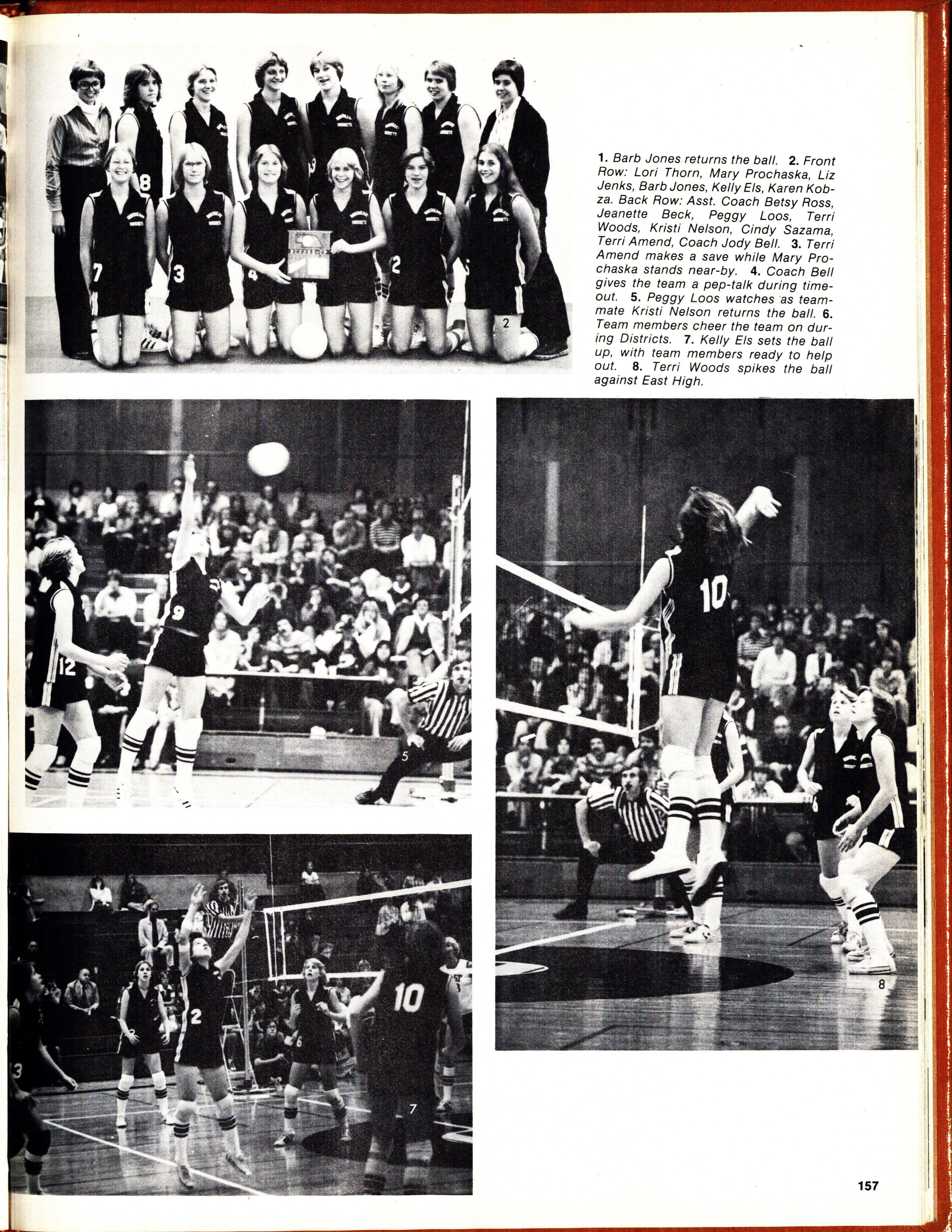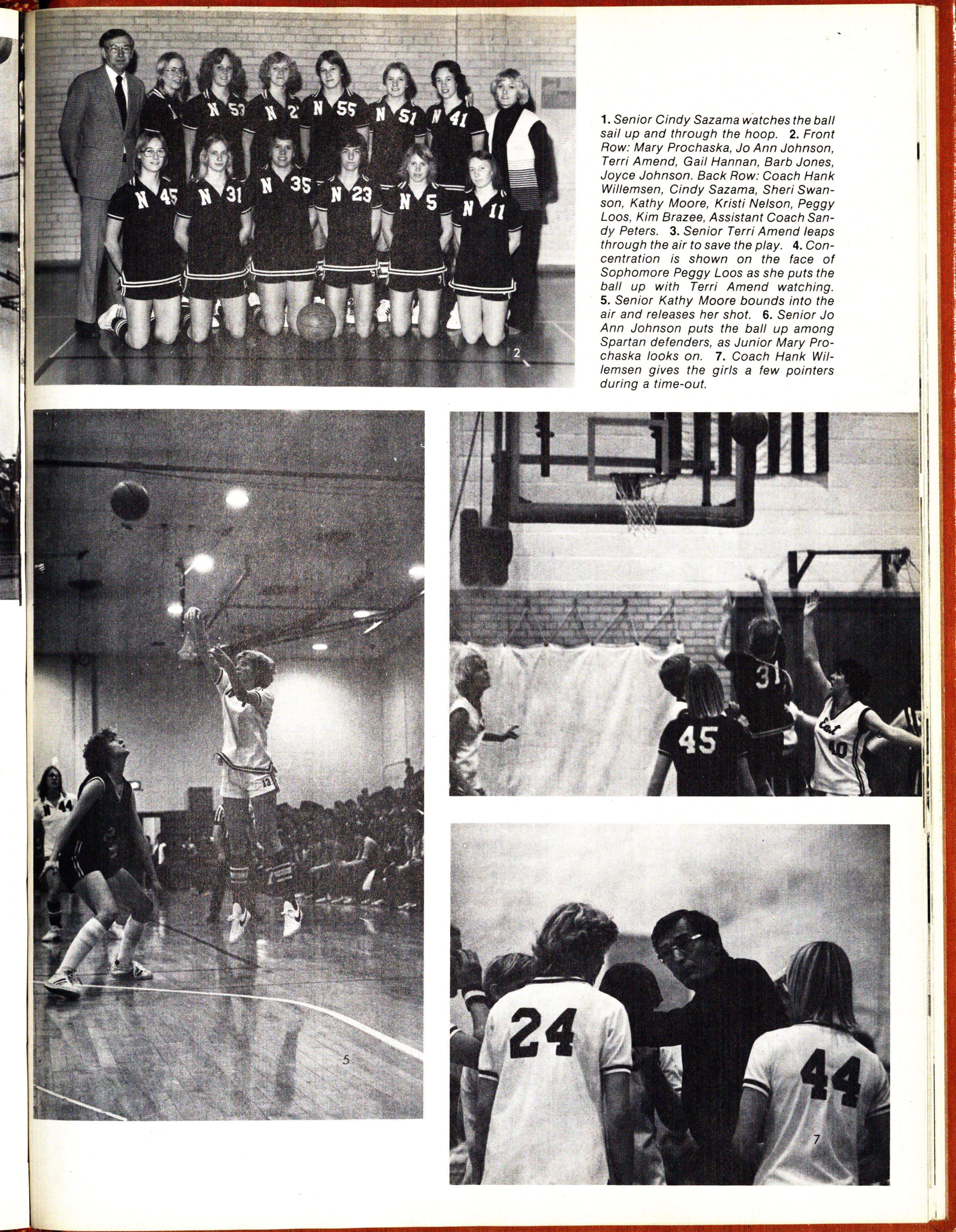 1. Senior Cindy Sazama watches the ball sail up and through the hoop 2. Front Row: Mary Prochaska , Jo Ann Johnson , Terri Amend, Gail Hannan , Barb Jones , Joyce Johnson Back Row: Coach Hank Willemsen , Cindy Sazama , Sheri Swanson , Kathy Moore , Kristi Nelson , Peggy Loos , Kim Brazee , Assistant Coach Sandy Peters. 3. Senior Terri Amend leaps through the air to save the play. 4. Concentration is shown on the face of Sophomore Peggy Loos as she puts the ball up with Terri Amend watching. 5. Senior Kathy Moore bounds into the air and releases her shot. 6. Senior Jo Ann Johnson puts the ball up among Spartan defenders , as Junior Mary Prochaska looks on 7. Coach Hank Willemsen gives the girls a few pointers during a time-out.