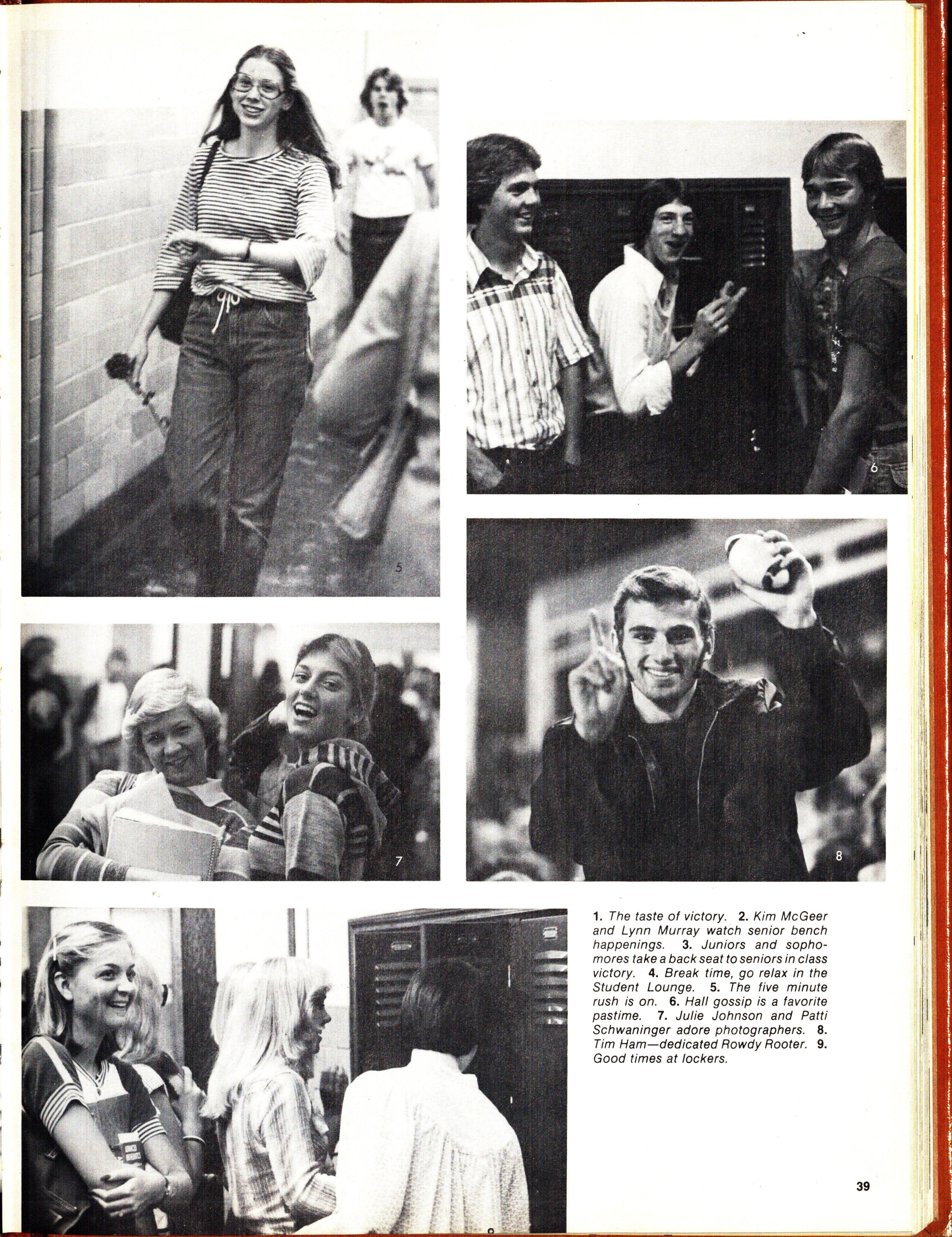 1. The taste of victory 2. Kim McGeer and Lynn Murray watch senior bench happenings 3. Juniors and sophomores take a back seat to seniors in class victory. 4. Break time, go relax in the Student Lounge 5. The five minute rush is on. 6. Hall gossip is a favorite pastime. 7. Julie Johnson and Patti Schwaninger adore photographers. 8. Tim Ham-dedicated Rowdy Rooter. 9. Good times at lockers