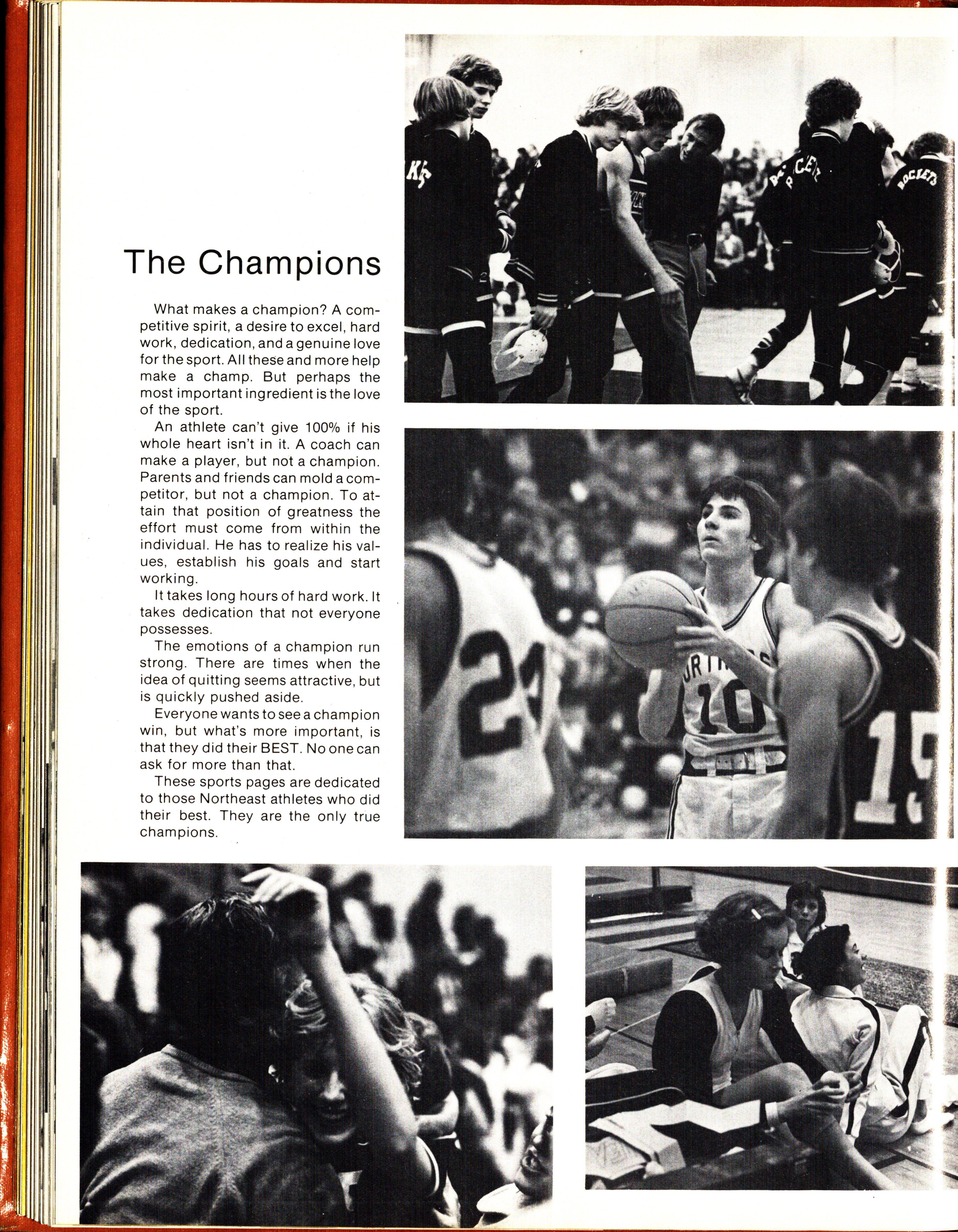 2. Front Row : Tim Donovan , Lyle Grafe/man , Mike Hohbein , Russ Hoover, J i m Prai, Joel Dawson , Scott Barnhill , Andy Childress. Back Row : Coach Ed Johnson , Tom Schroer, Randee Johnson , Jeff Svoboda , Chris Spreier , Mitch Mehuron , Cedric Payne , Jim Slosson , Don Poor 3. The final gun sounds , and Northeast beats Lincoln High 4. Shooting for the Rockets is Chris Spreier 5. Looking for an opening is Jim Slosson 6. Chris Spreier goes up for the rebound. 7. Cedric Payne prepares to shoot the ball 8. Jim Slosson shoots from the outside.