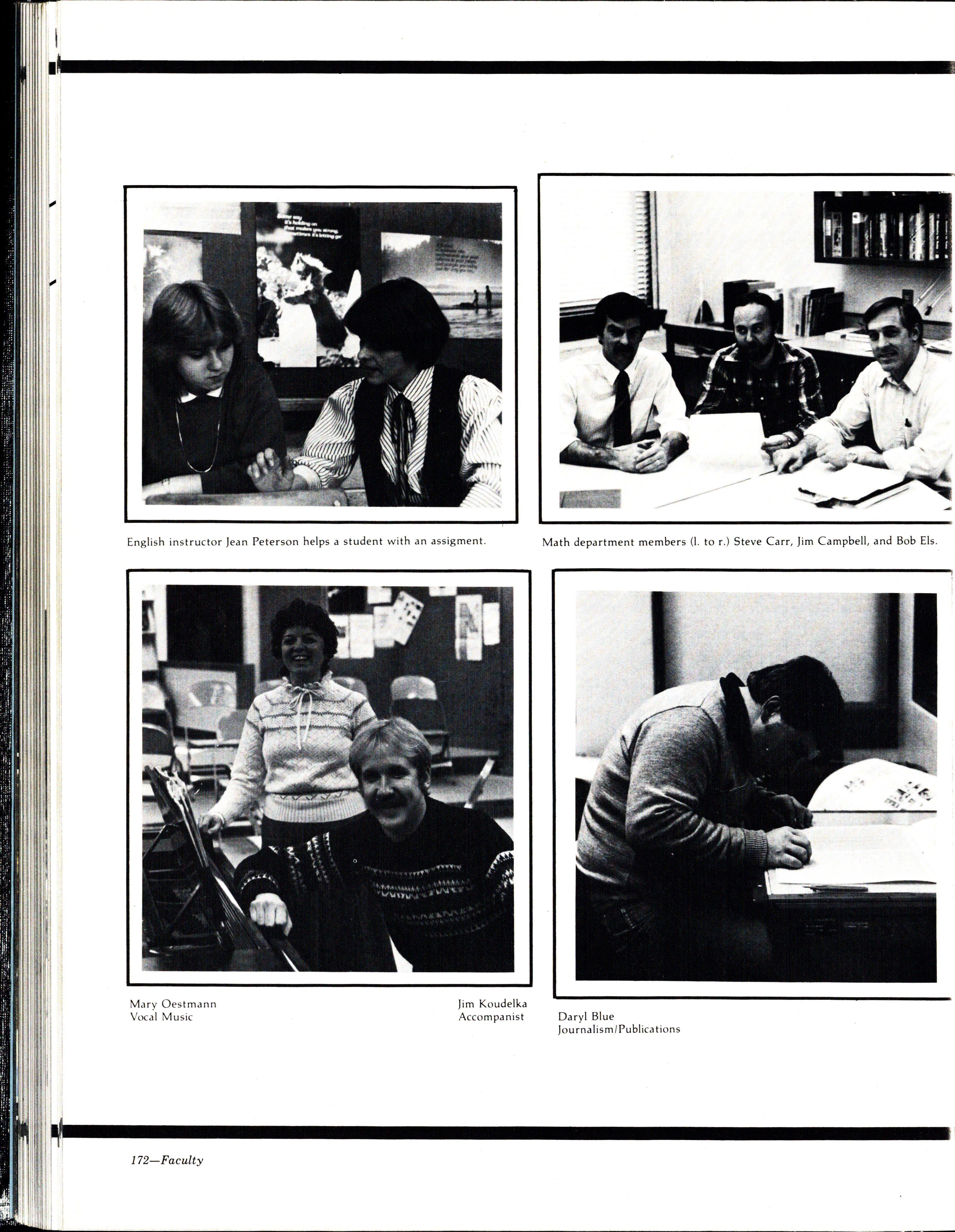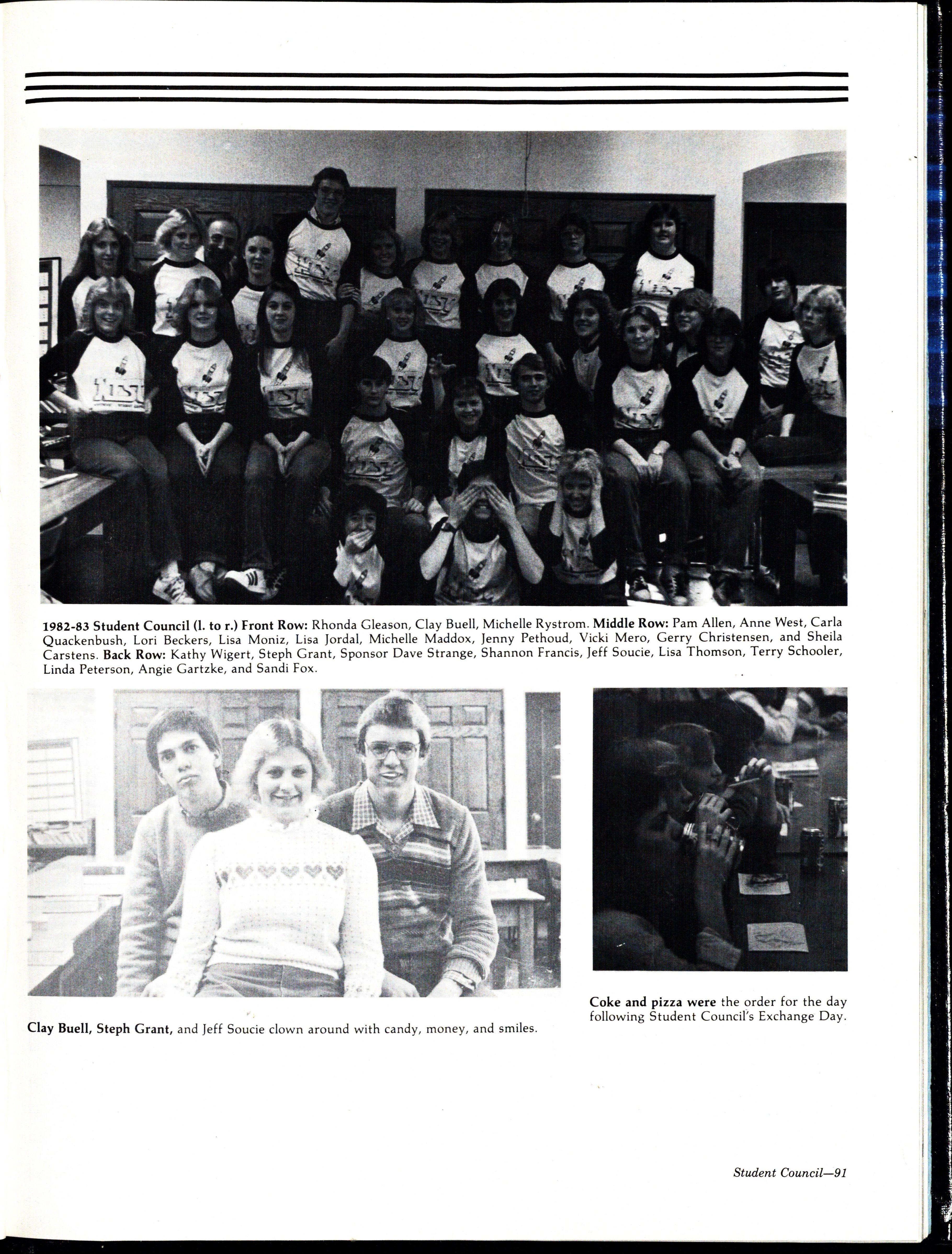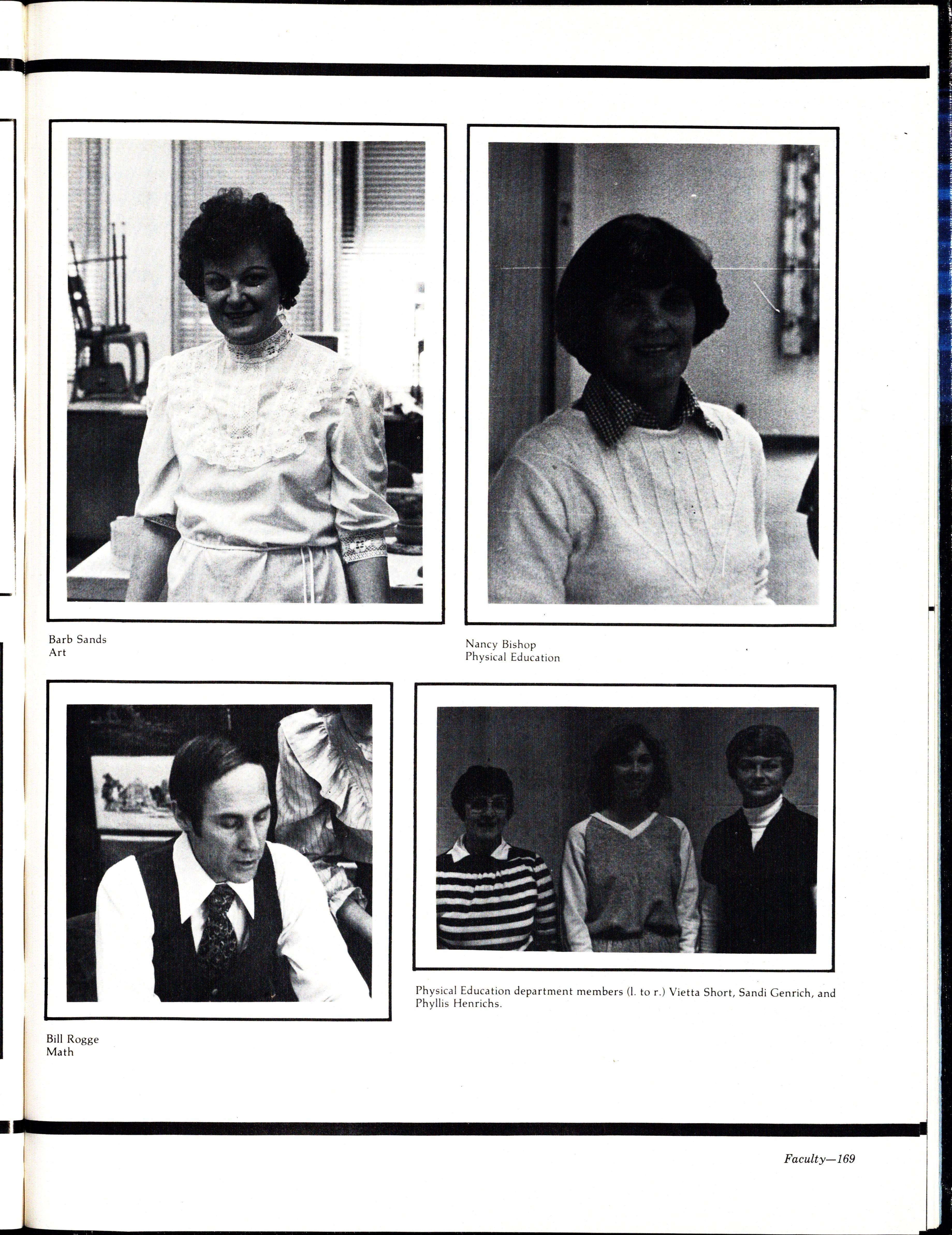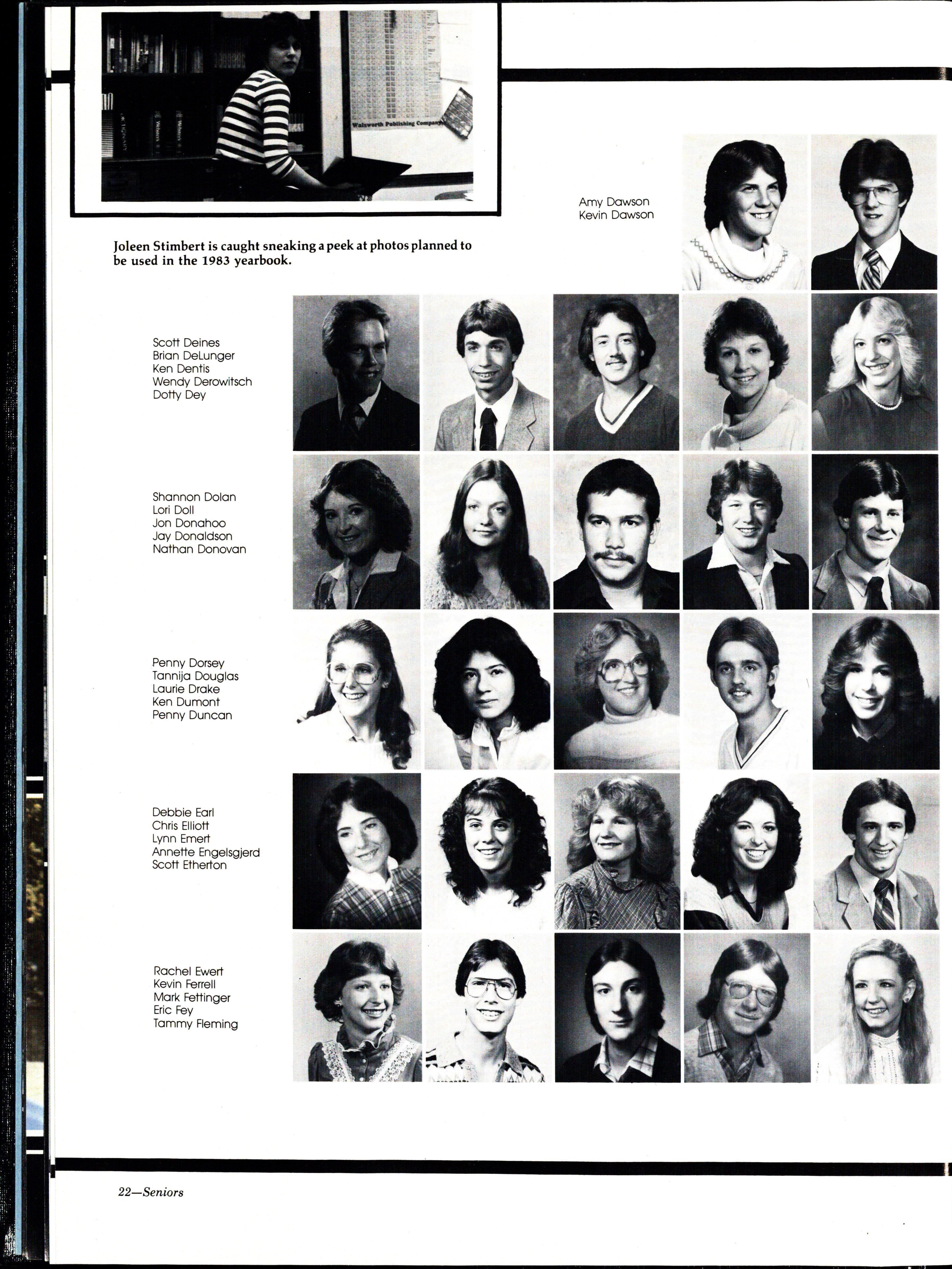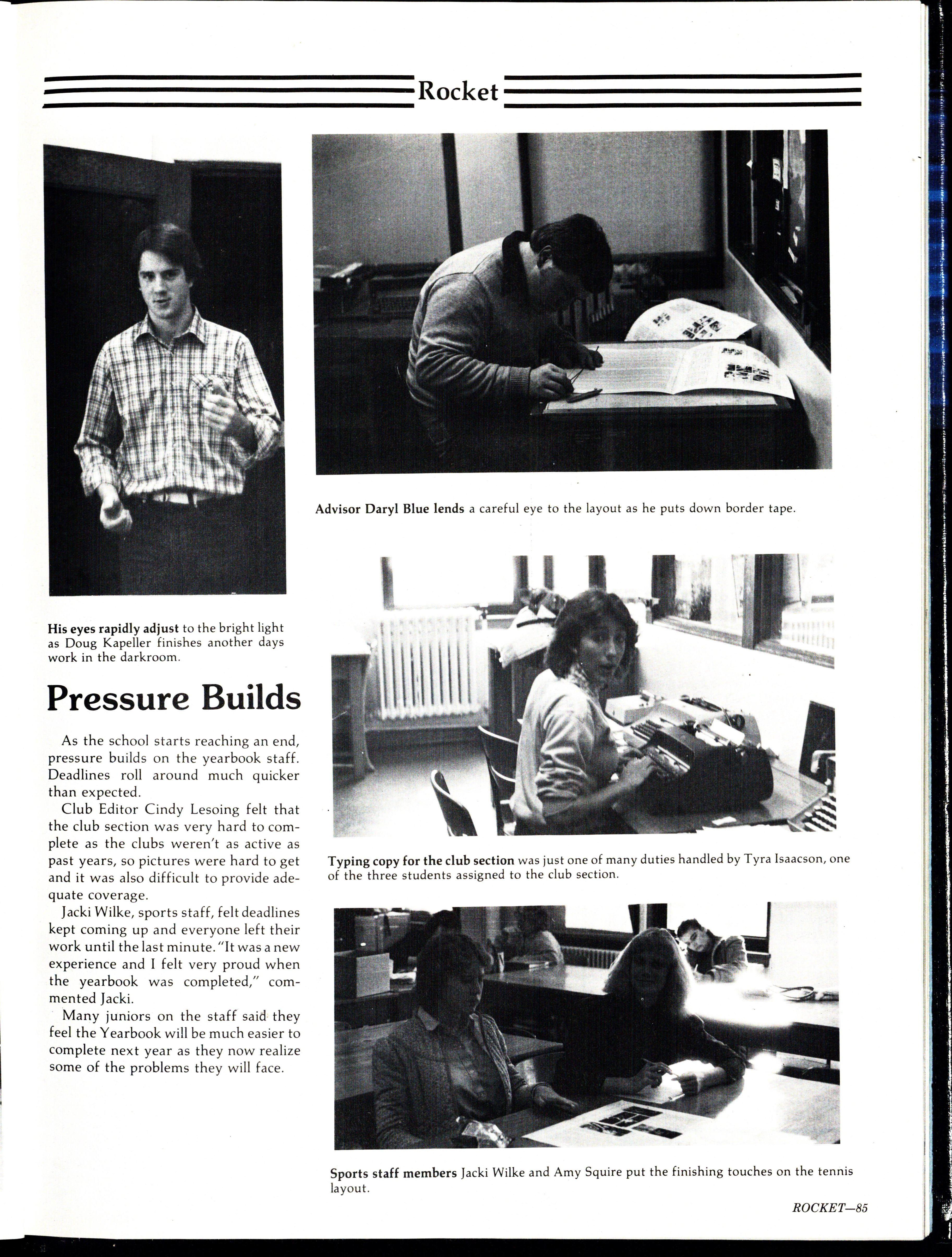 1983 ROCKET Staff (I. tor.) Back Row: Kyle Beals (Sports), Amy Kadavy (Clubs ), Lori Pickerel (Student Section Editor ), Rene Bomberger (Faculty Section Editor), Kathy Smith (Faculty). Third Row: Dawn Zoller (Students), Tammy Johnson (Ad Staff), Shawna Standley (Students) , and Cindy Lesoing (Clu b Section Edito r). Second Row: Steve Higgins (Photographer), Tyra Isaacson (Clu bs ), Doug Kapeller (Photographer-In-Chief), David Scott (Ad Staff) , and Amy Squire (Sports Editor) Front Row: Chris Fusco (Ad Staff), and Jacki Wilke (Sports). •