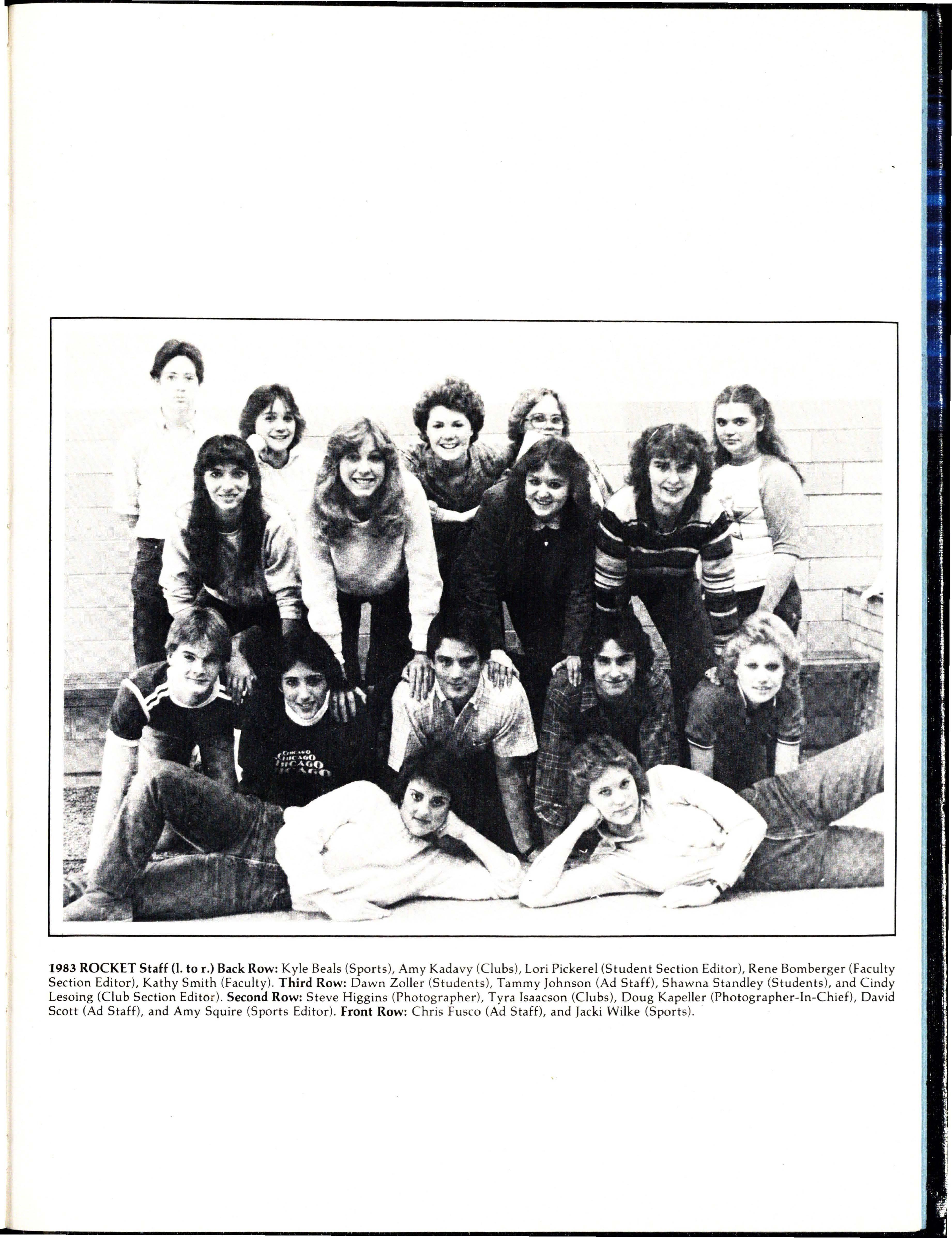 1983 ROCKET Staff (I. tor.) Back Row: Kyle Beals (Sports), Amy Kadavy (Clubs ), Lori Pickerel (Student Section Editor ), Rene Bomberger (Faculty Section Editor), Kathy Smith (Faculty). Third Row: Dawn Zoller (Students), Tammy Johnson (Ad Staff), Shawna Standley (Students) , and Cindy Lesoing (Clu b Section Edito r). Second Row: Steve Higgins (Photographer), Tyra Isaacson (Clu bs ), Doug Kapeller (Photographer-In-Chief), David Scott (Ad Staff) , and Amy Squire (Sports Editor) Front Row: Chris Fusco (Ad Staff), and Jacki Wilke (Sports). •