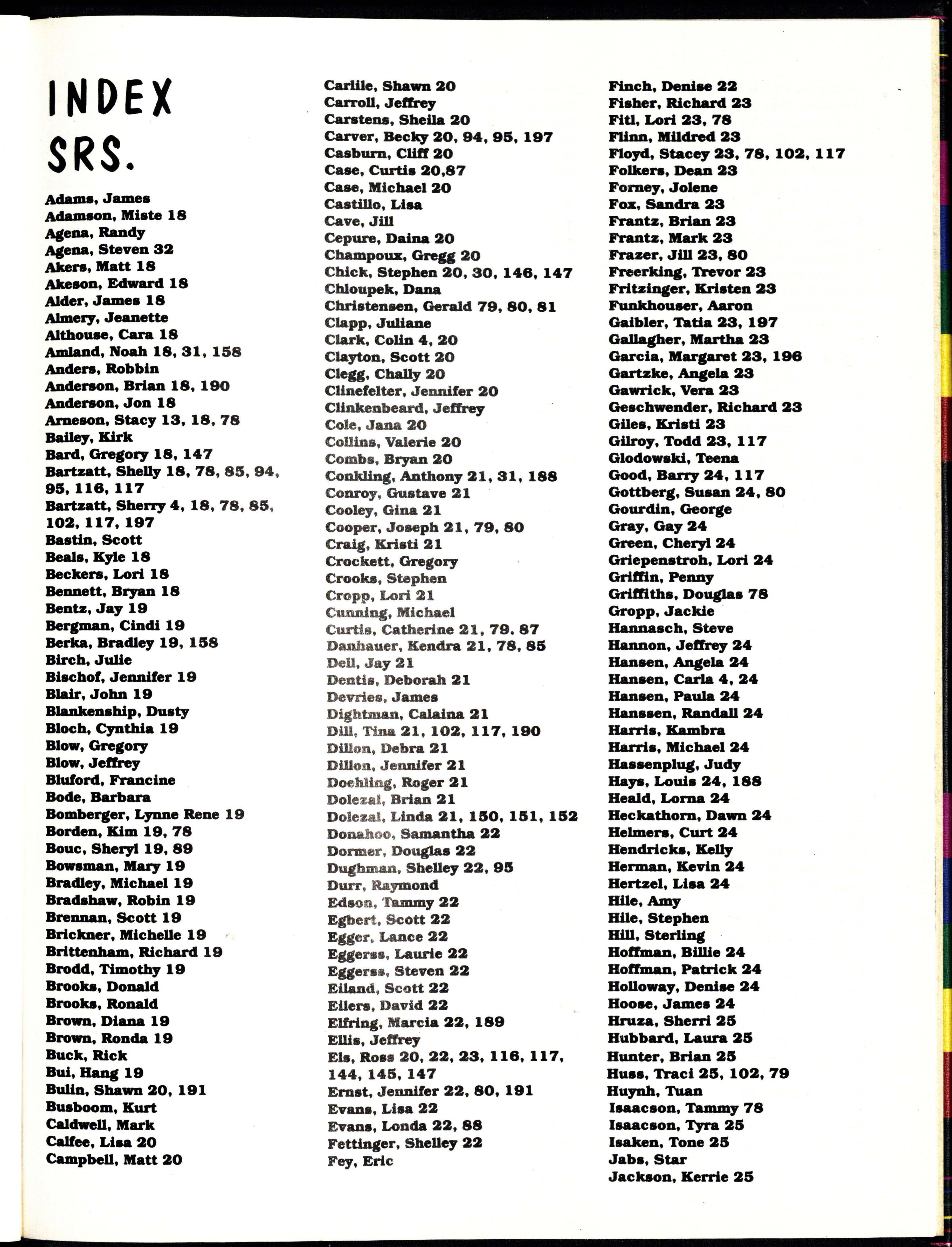 1-16 . . . . . . . . . . . . . . . . . . Opening 17-37 Seniors 38-49 Juniors 50-65 Sophomores 66- 1 25 The In Group 126- 14 1 . . . . . . . . . . The Enforcers 142- 185 . . . . . . . . The Lockerroom 186-197 Places To Go 198-205 Index 206-207 · Closing 208 Thanks