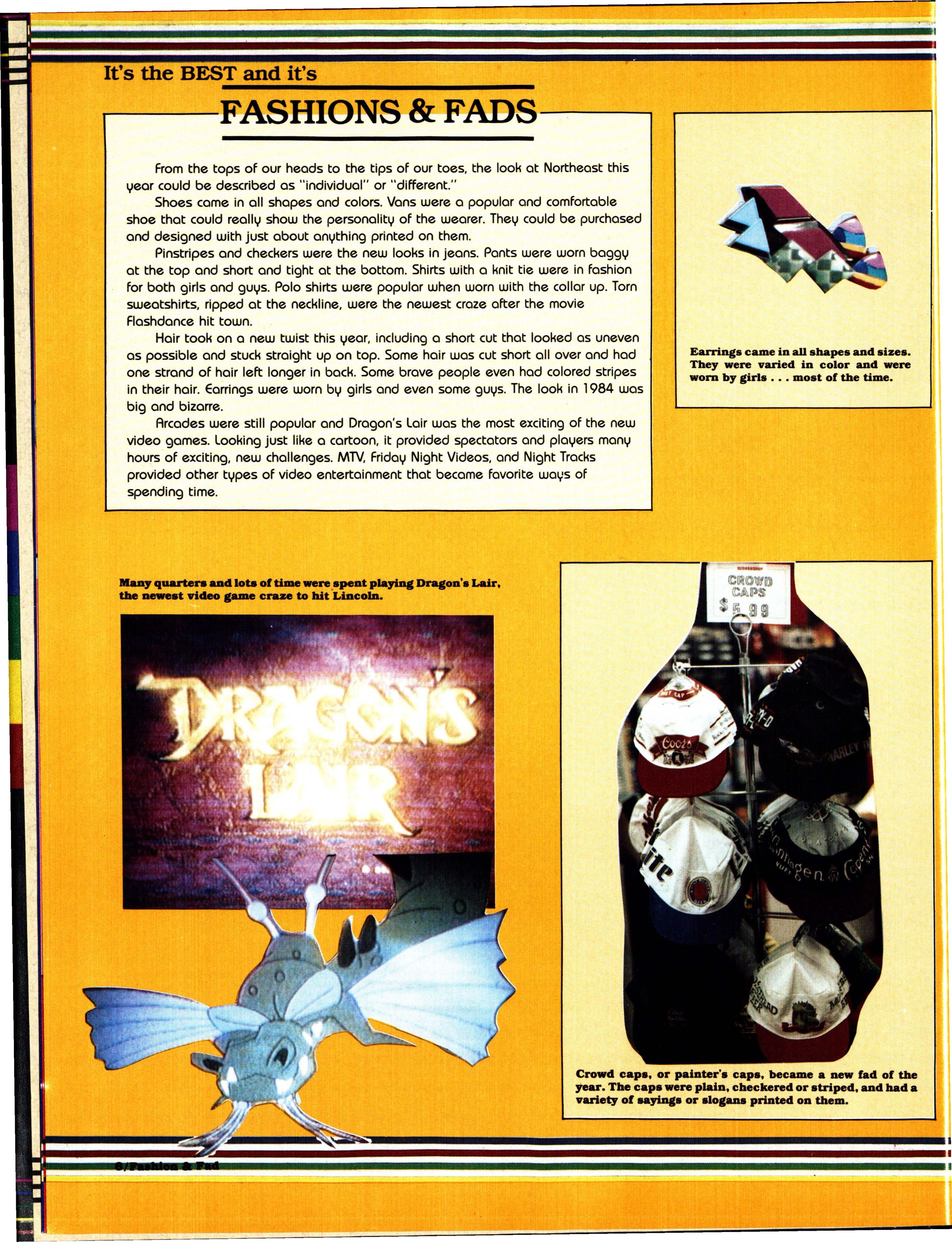 Hair took on a new twist this year, including a short cut that looked as uneven as possible and stuck straight up on top. Some hair was cut short all over and had one strand of hair left longer in back. Some brave people even had colored stripes in their hair. Earrings were worn by girls and even some guys. The look in 1984 was big and bizarre.